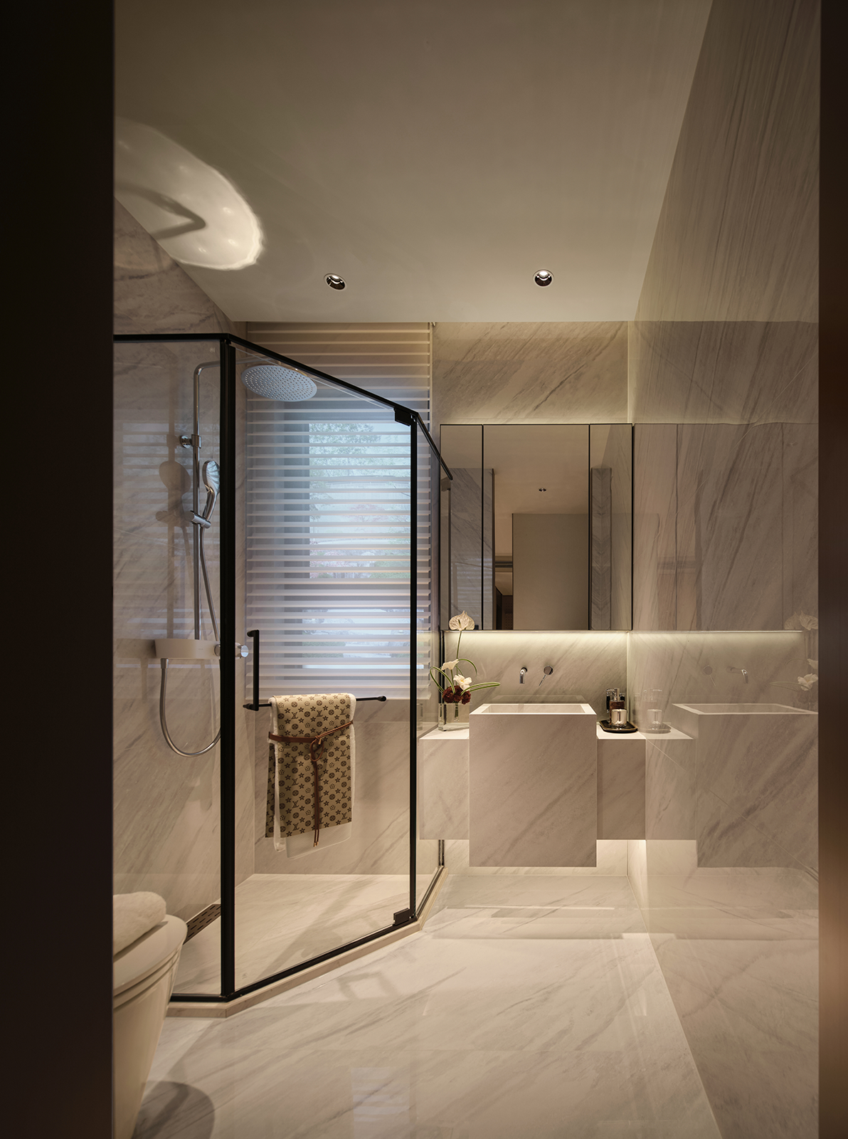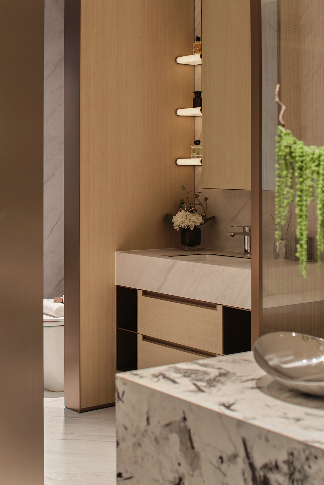 2. 耐久与低维护: 地面石材、墙板等主要材料均选择耐磨损、易清洁的表面处理,减少后期维护成本与资源消耗。白色大理石在卫浴空间的集中使用,通过标准化加工,减少了材料浪费。