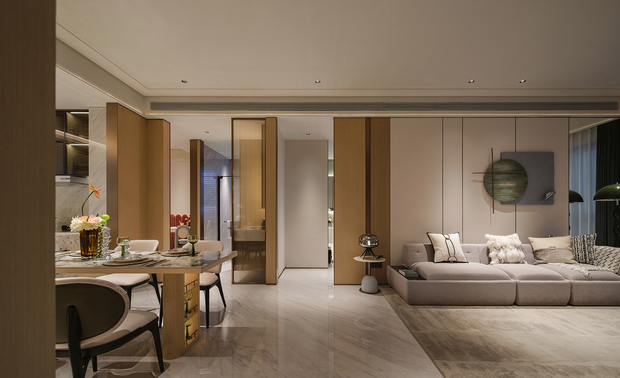 4. 美学价值呈现: 通过将黑白纹理石材等少量高辨识度材料用于关键节点(背景墙、餐台),形成记忆点,而大面积采用性价比更高的暖白墙板、浅色木纹等基础材料进行衬托,实现“小奢华、大简约”的选材智慧。 -
