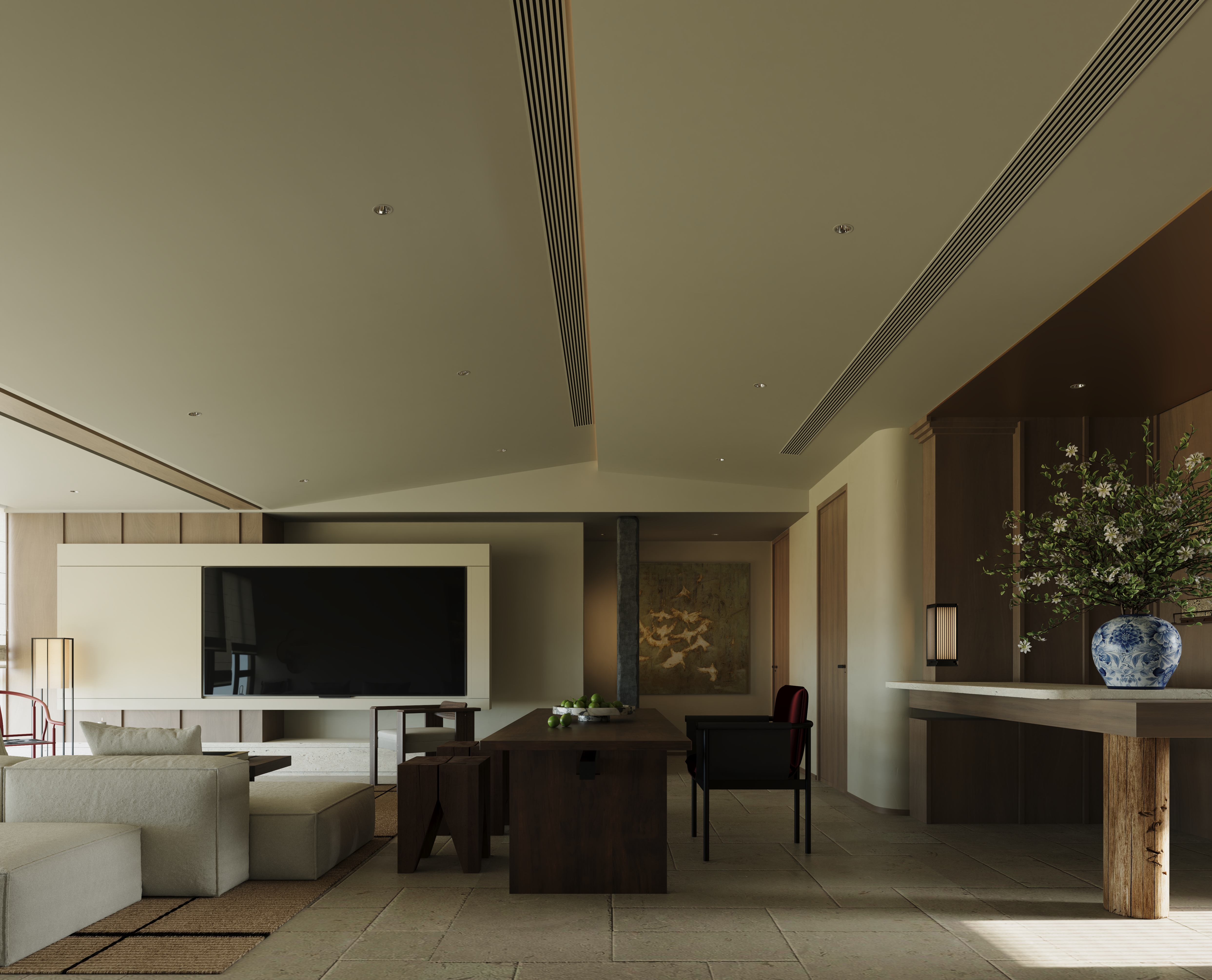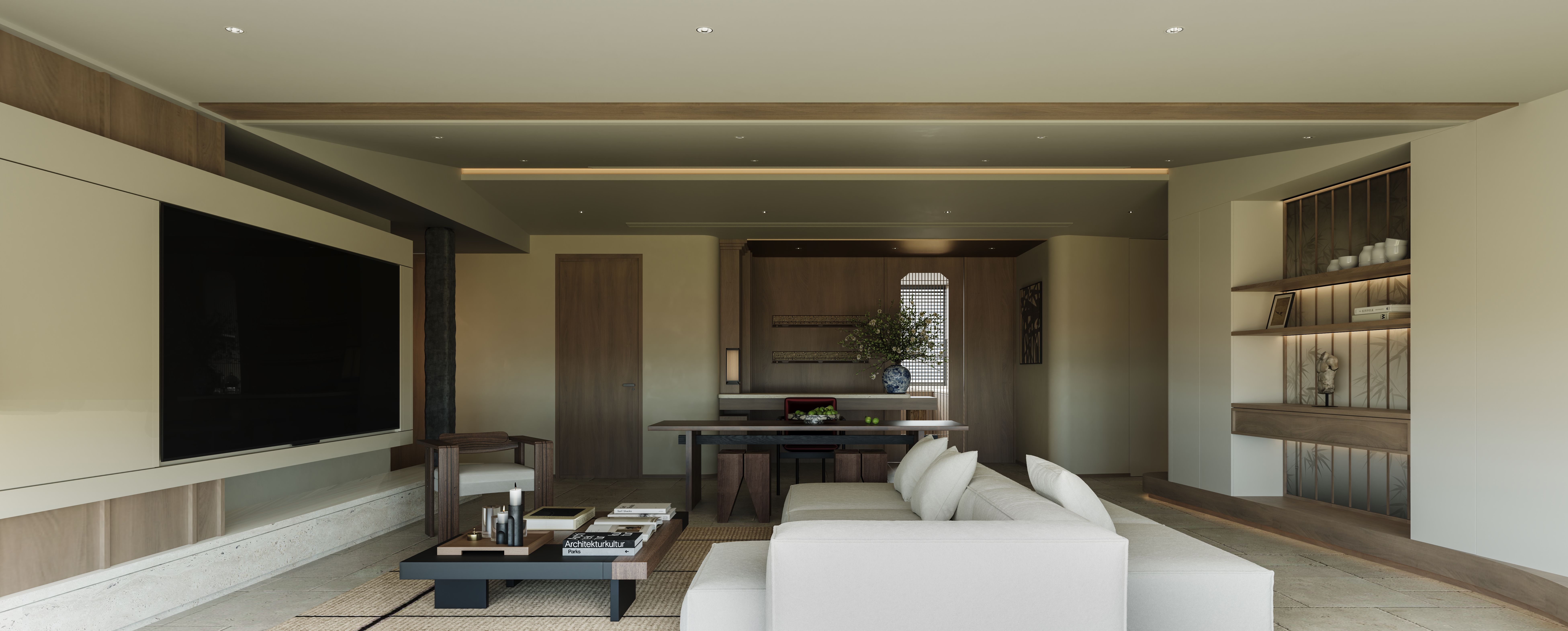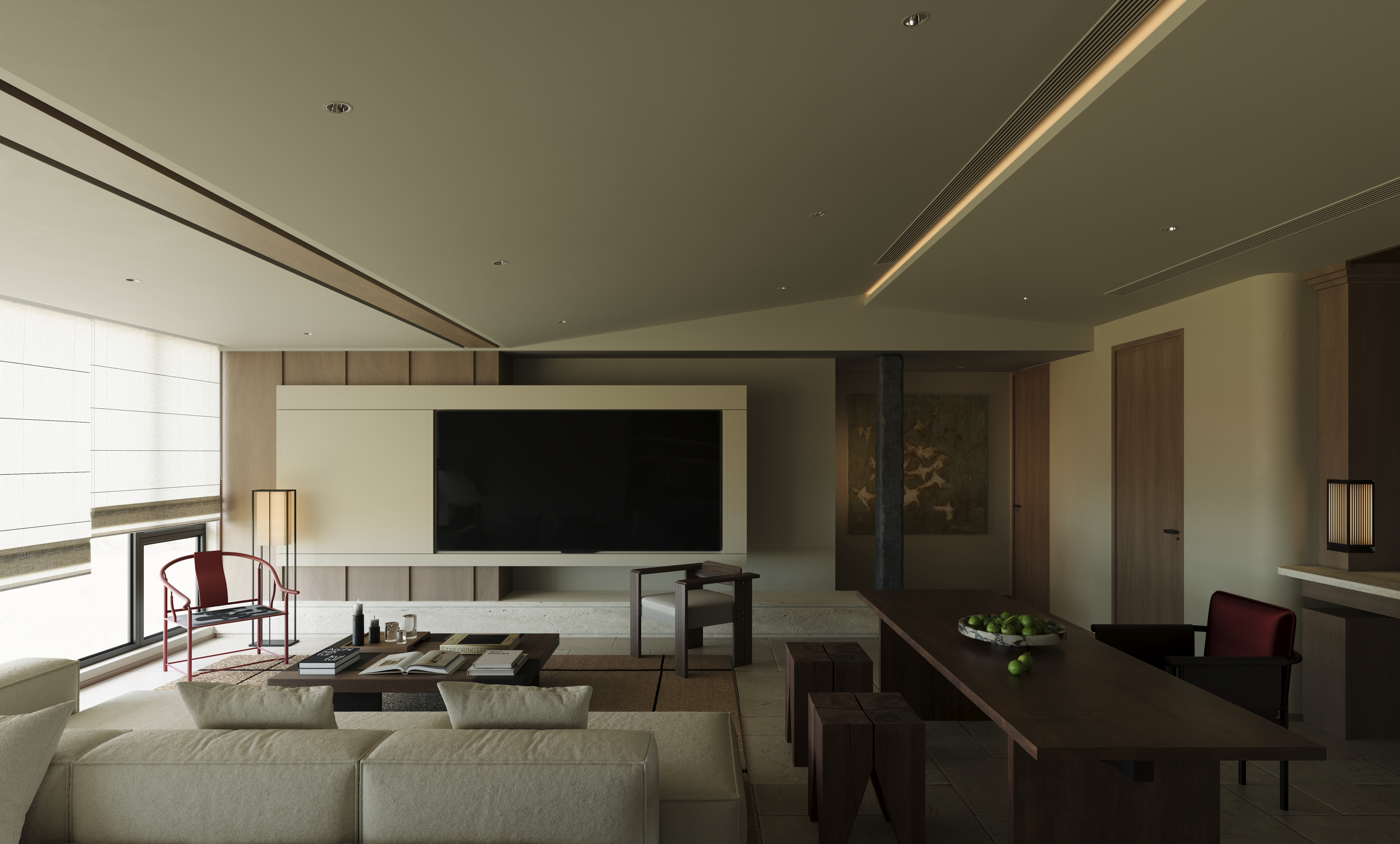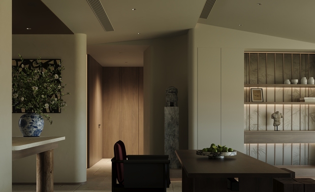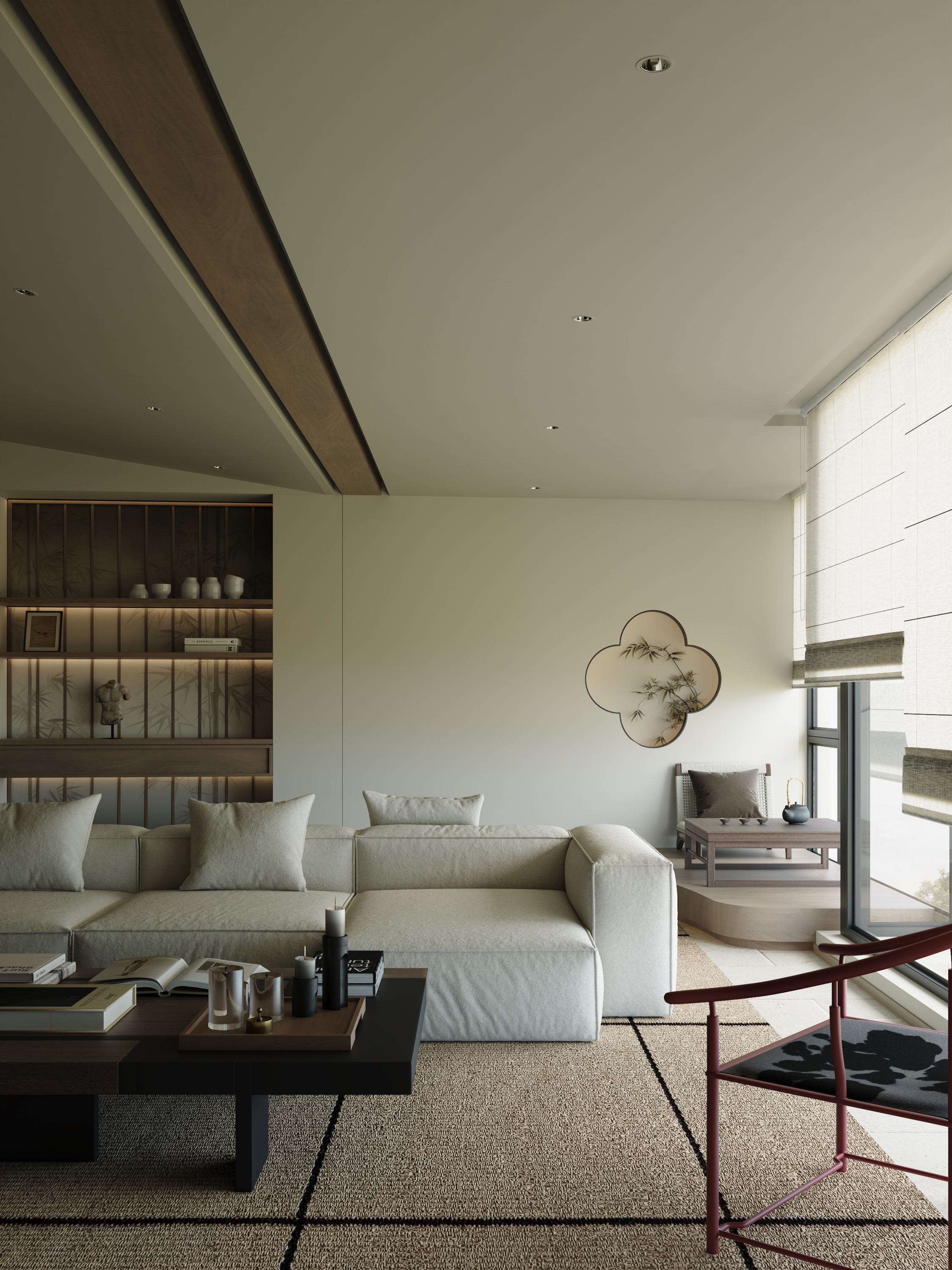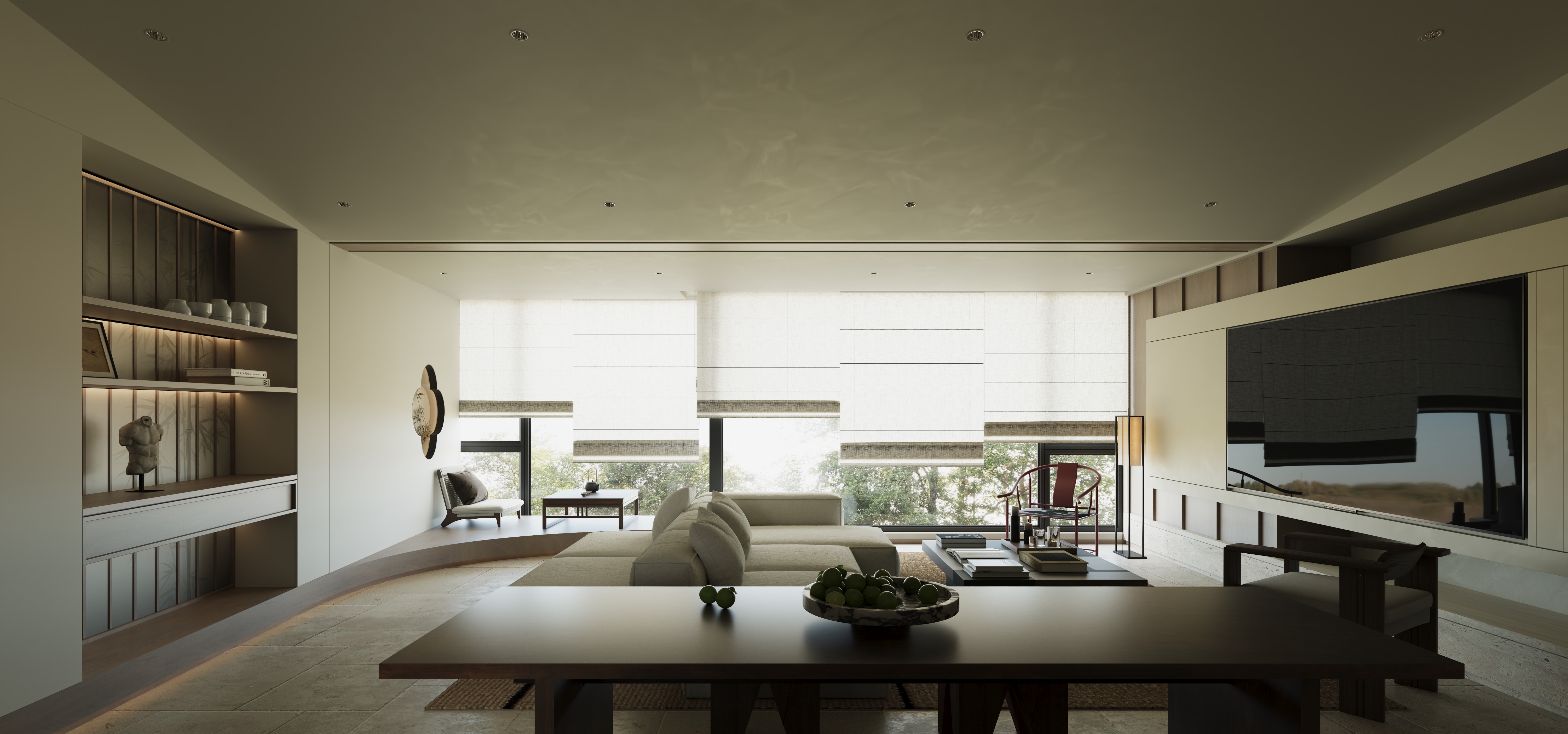 空间布局:客厅洄游动线的布局,小孩子可以放心撒欢,男主人喜欢的独处休闲空间也在风景最好的位置出现,一家5口人的理想居所