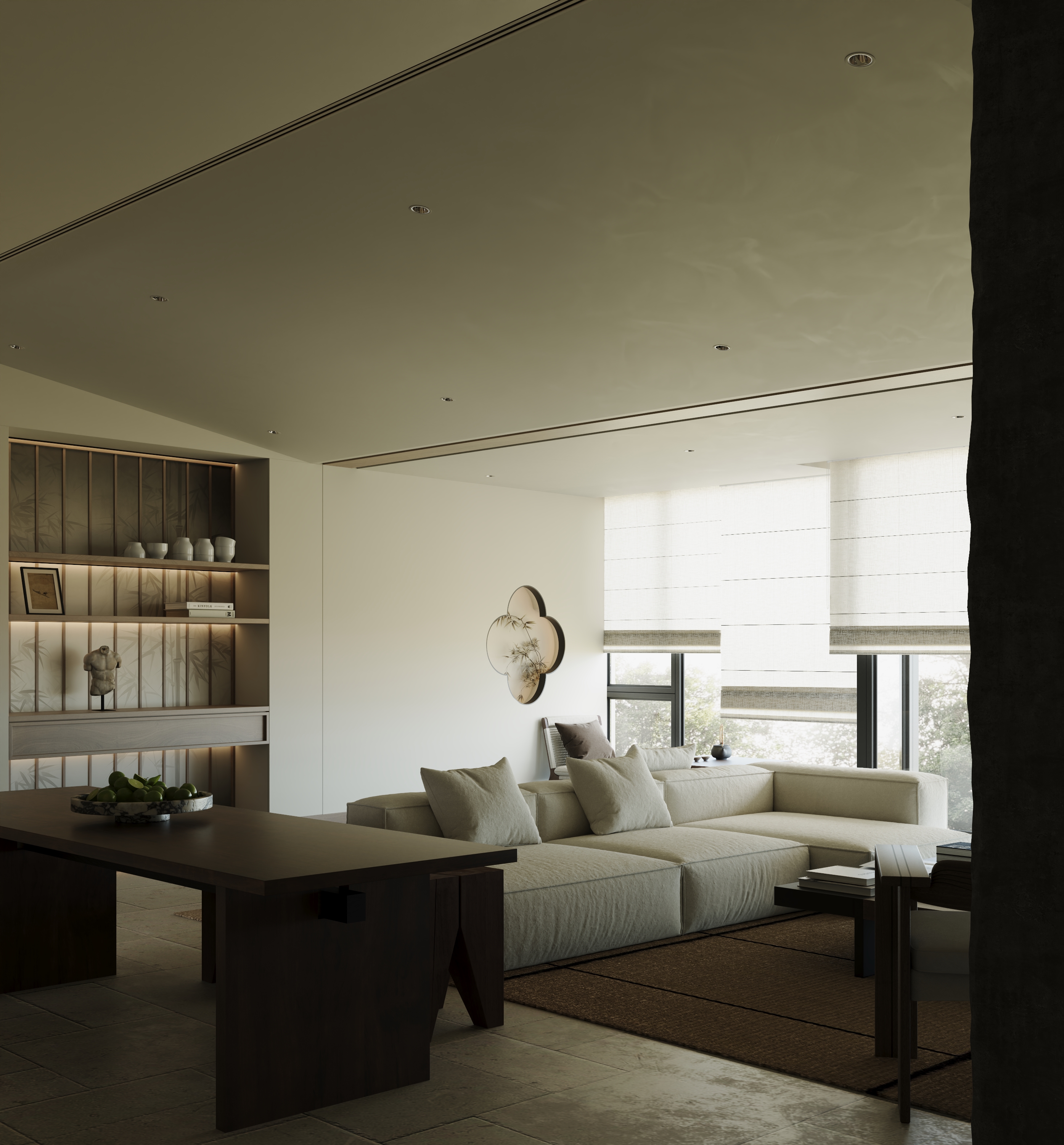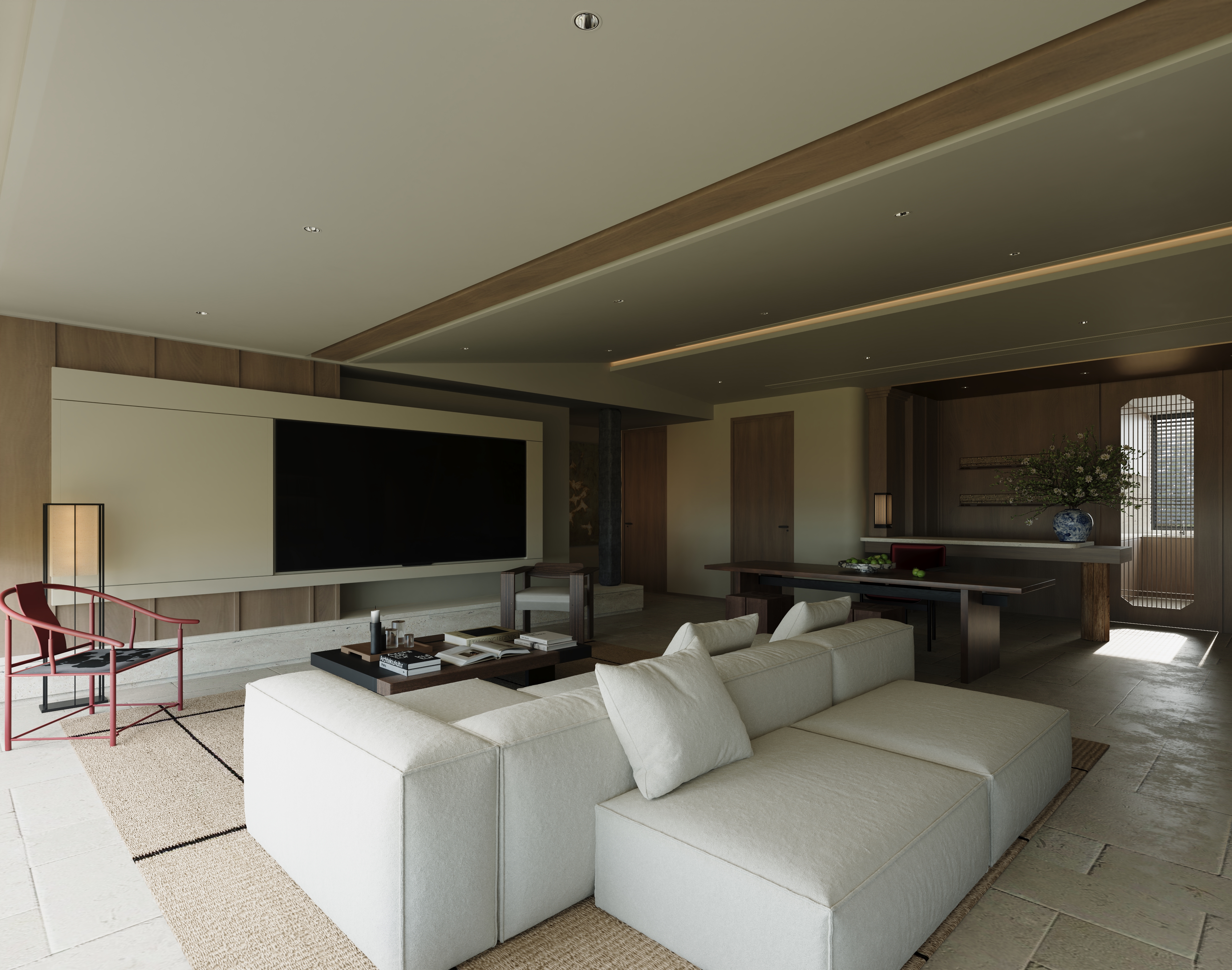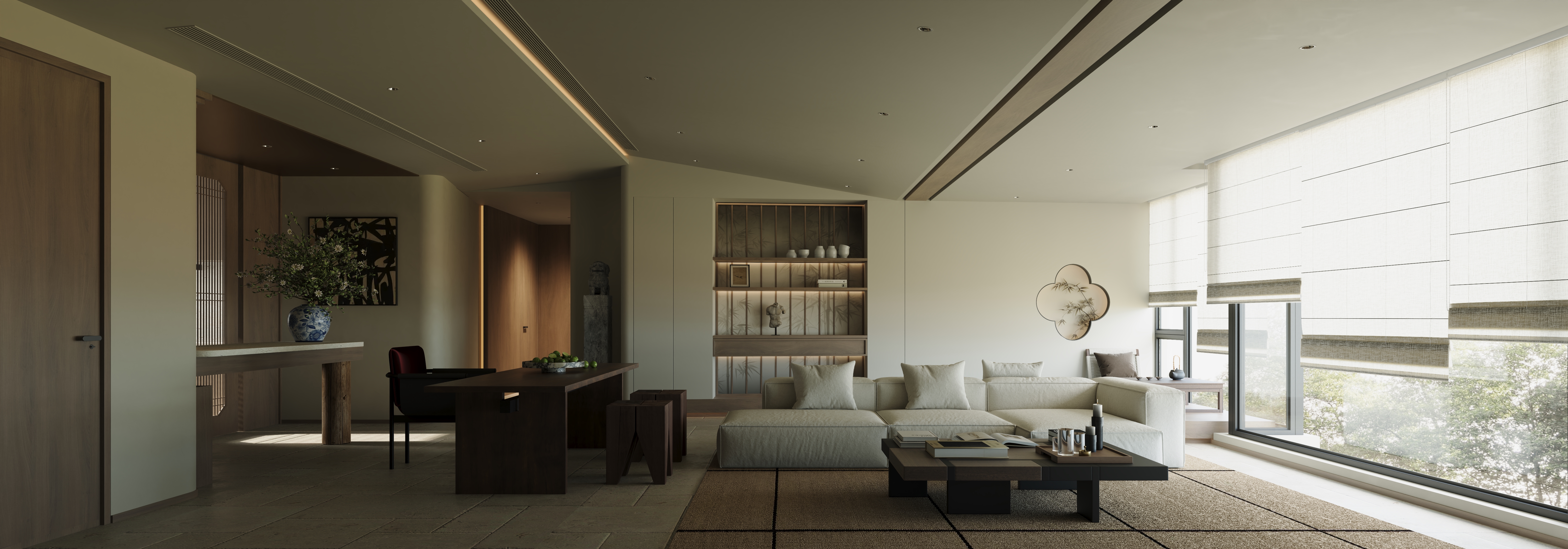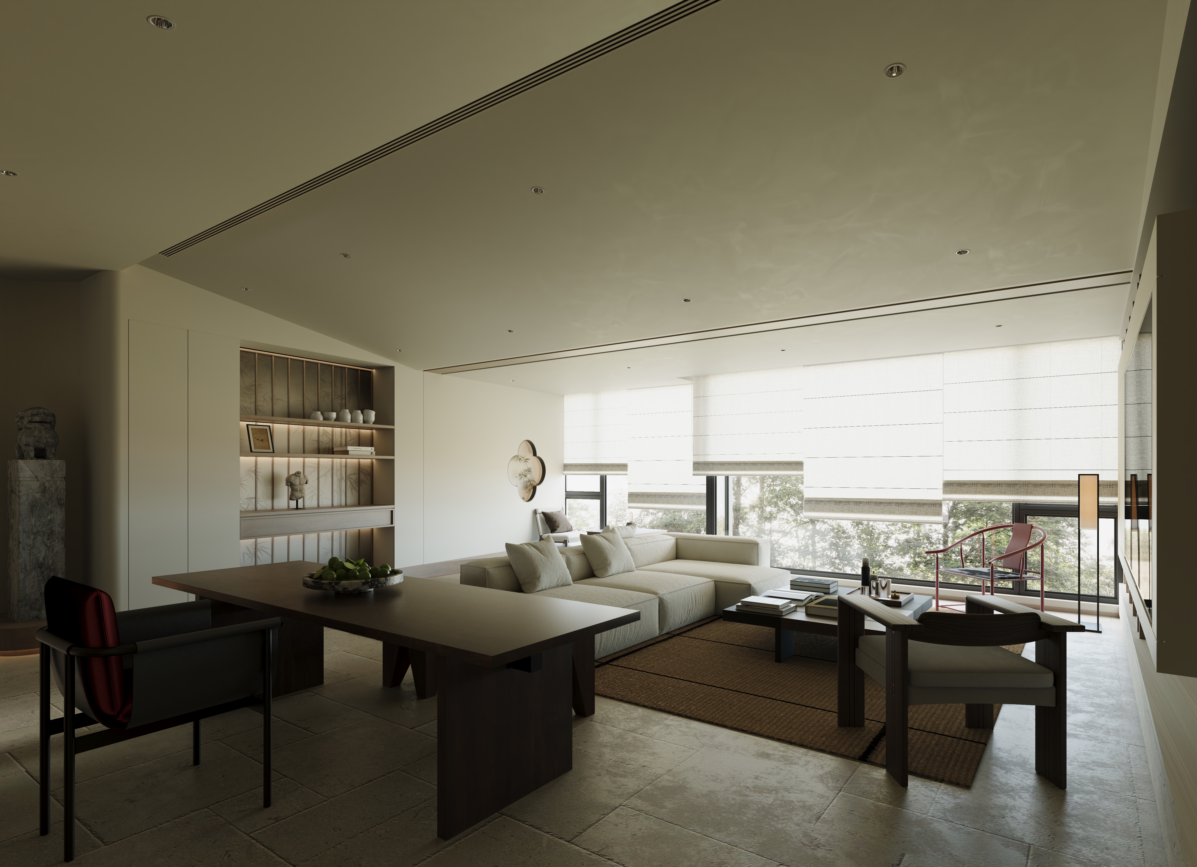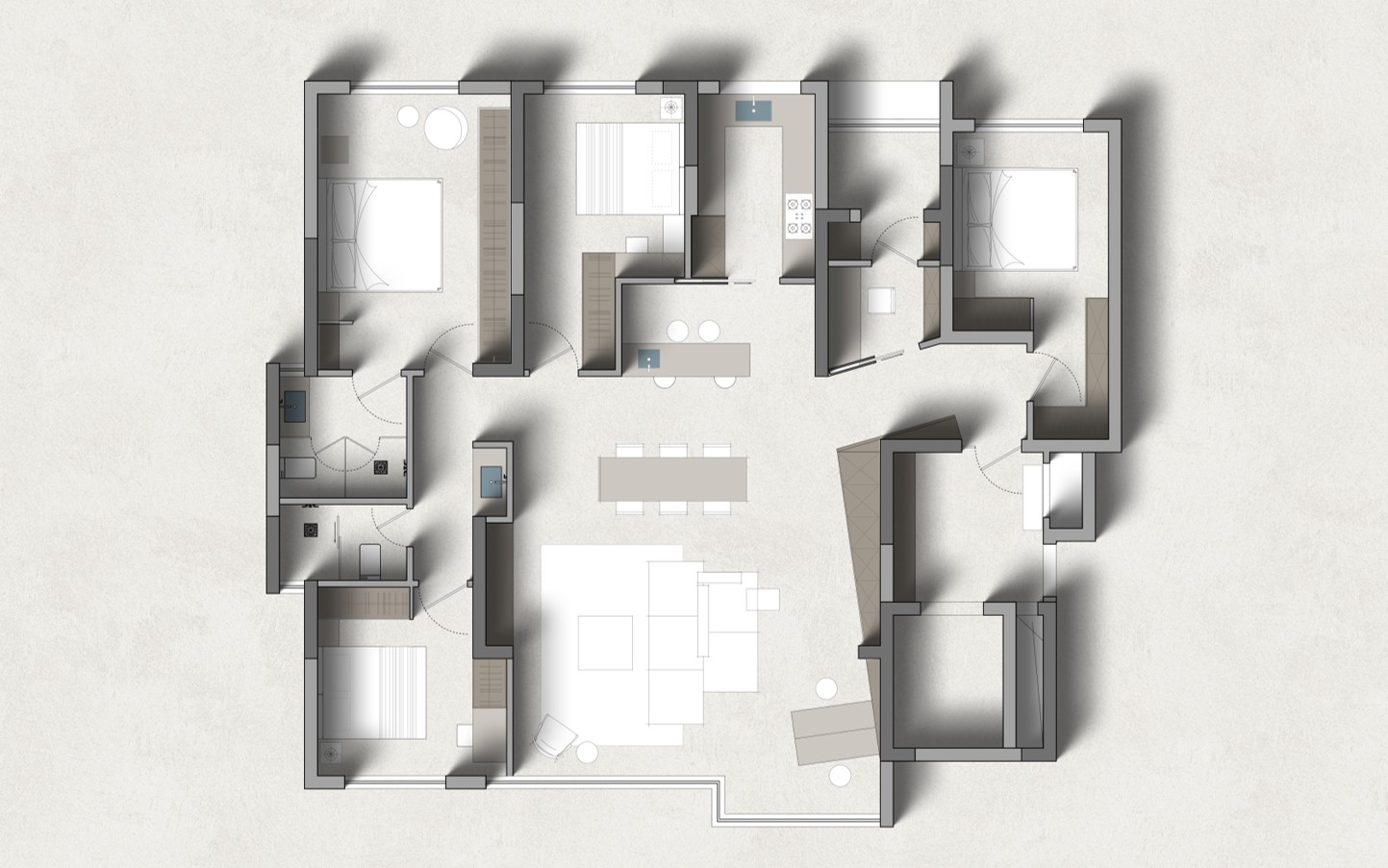 空间布局:客厅洄游动线的布局,小孩子可以放心撒欢,男主人喜欢的独处休闲空间也在风景最好的位置出现,一家5口人的理想居所