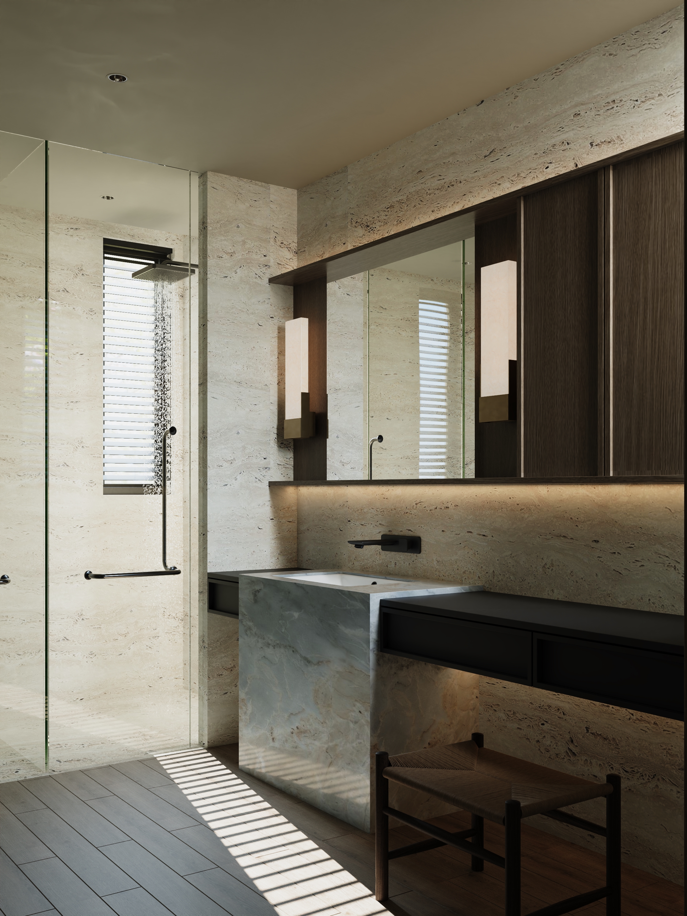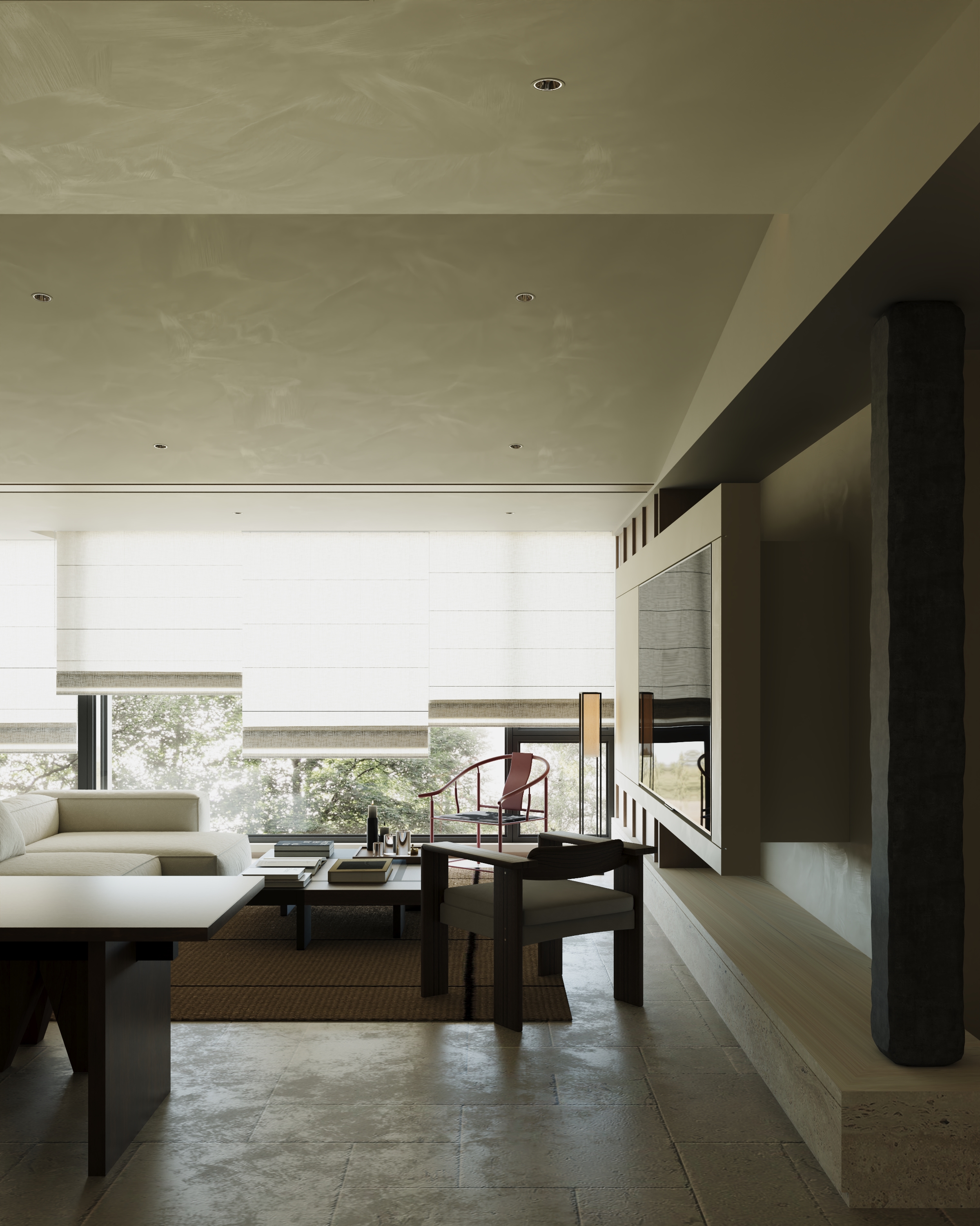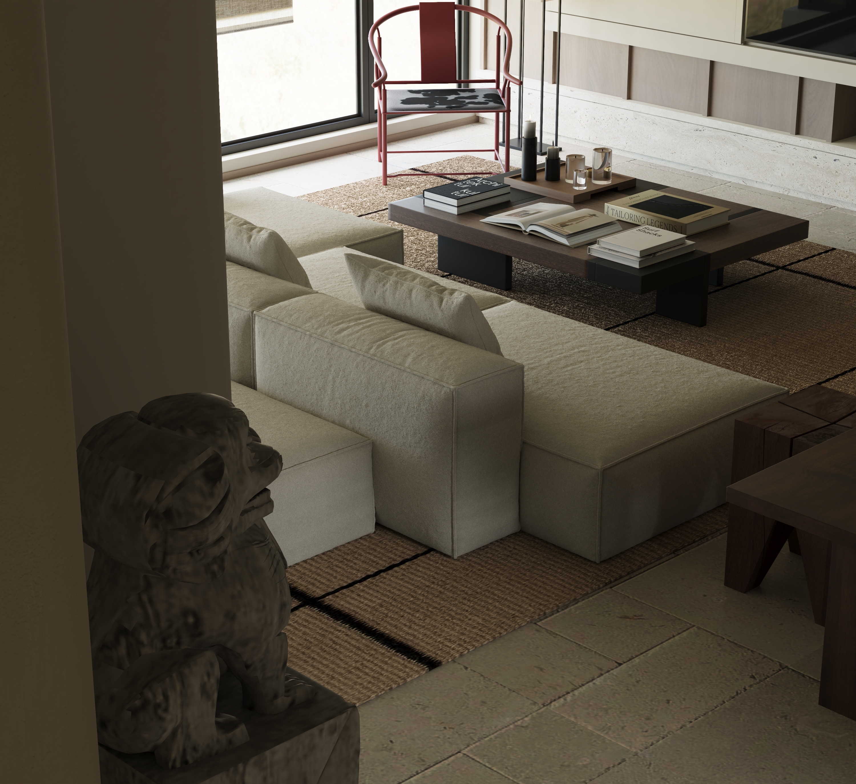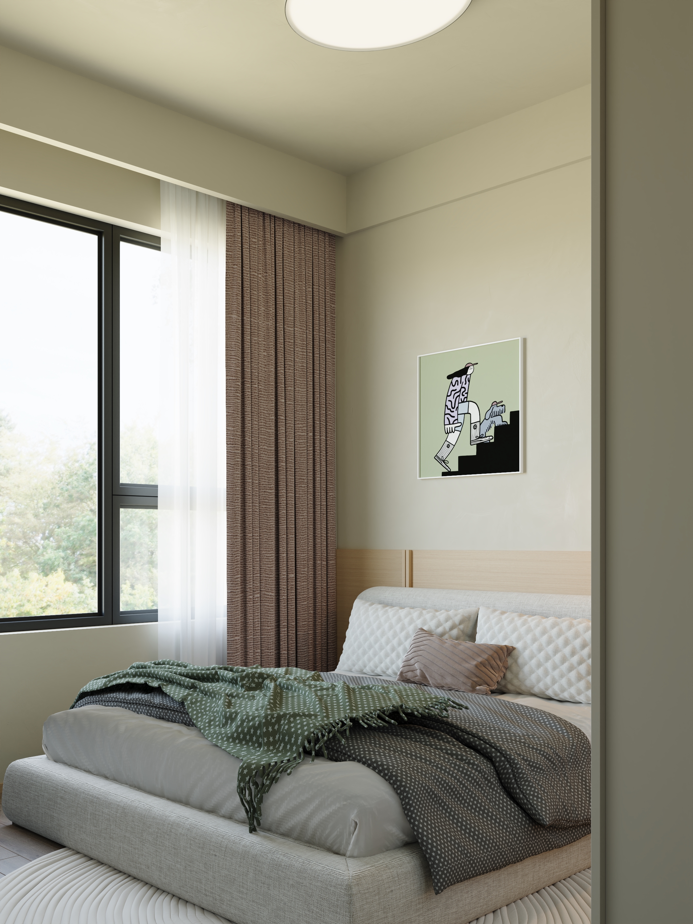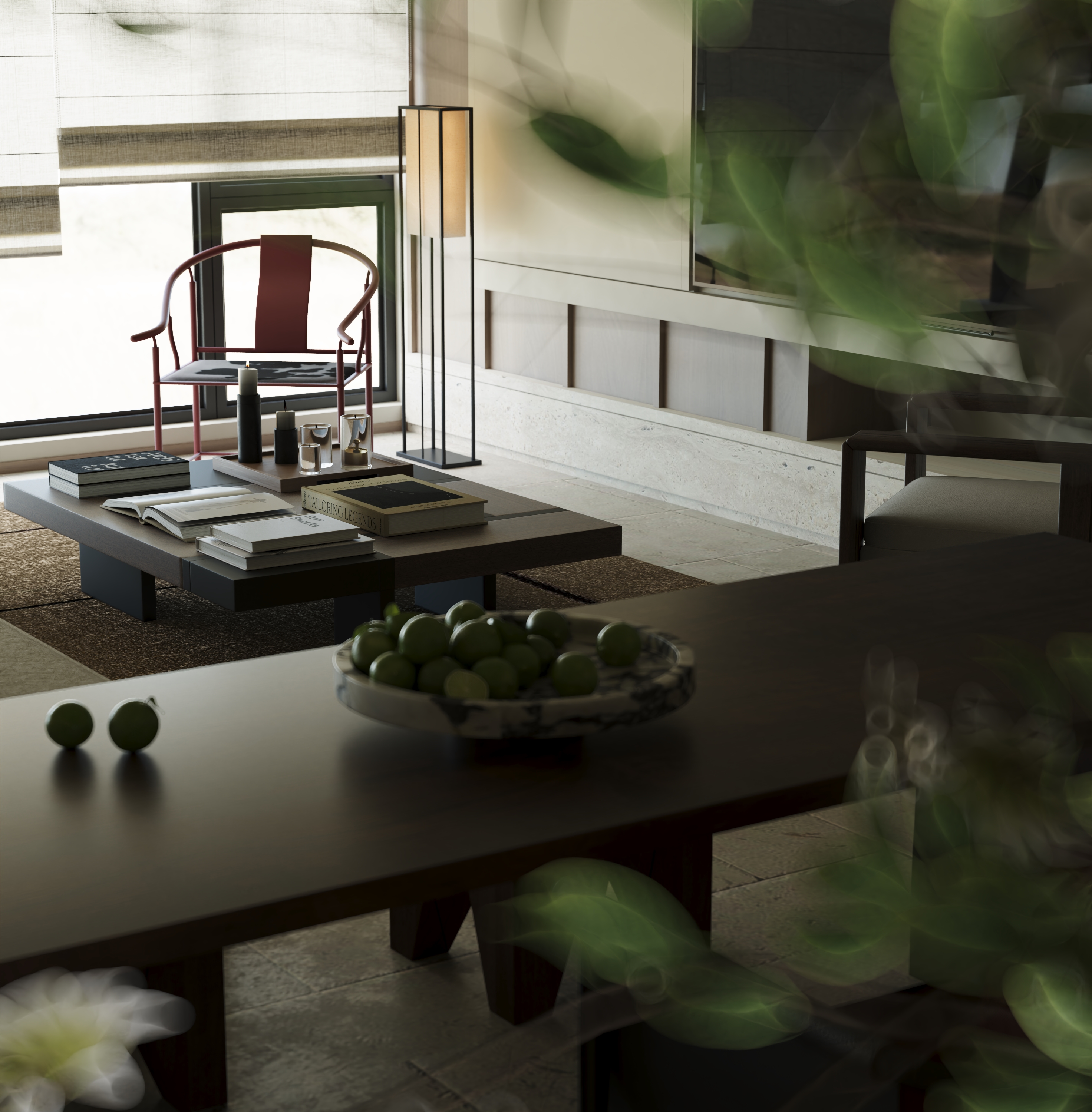 空间布局:客厅洄游动线的布局,小孩子可以放心撒欢,男主人喜欢的独处休闲空间也在风景最好的位置出现,一家5口人的理想居所