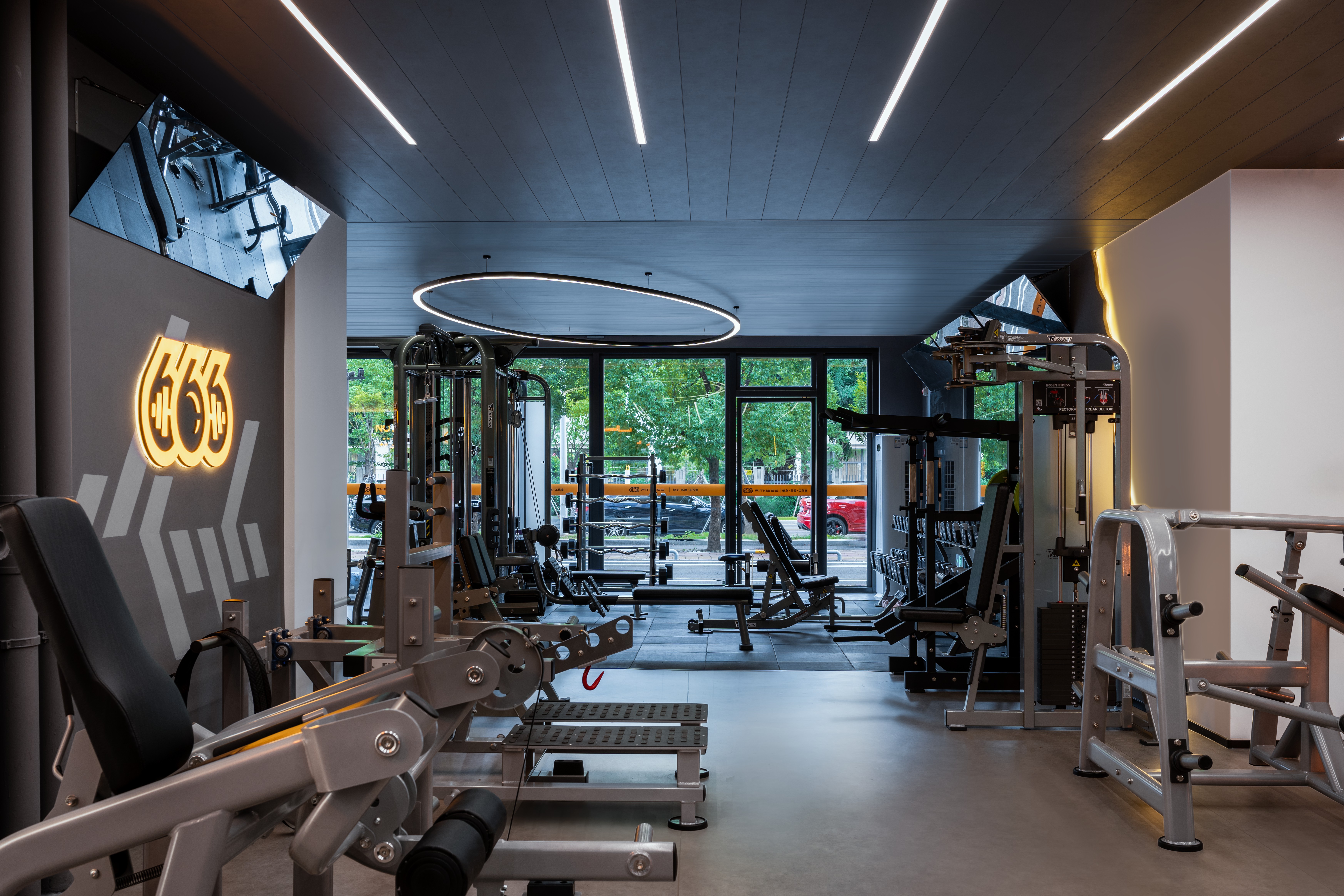 2. 有氧区临窗排布+墙镜延伸,拉伸区对窗观景,实现运动与室外环境联动,提升空间通透度