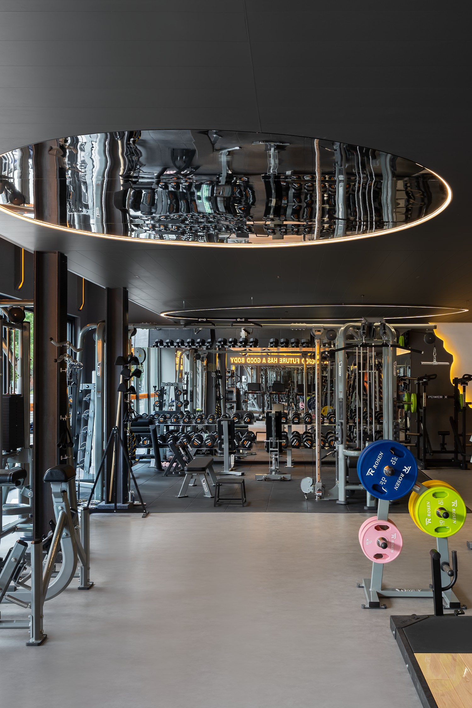 2. 功能化选材创新:普拉提室仿地胶木地板适配静谧需求,墙镜、镜面圆形装置兼顾空间延伸与视觉趣味,实用性与美观性结合