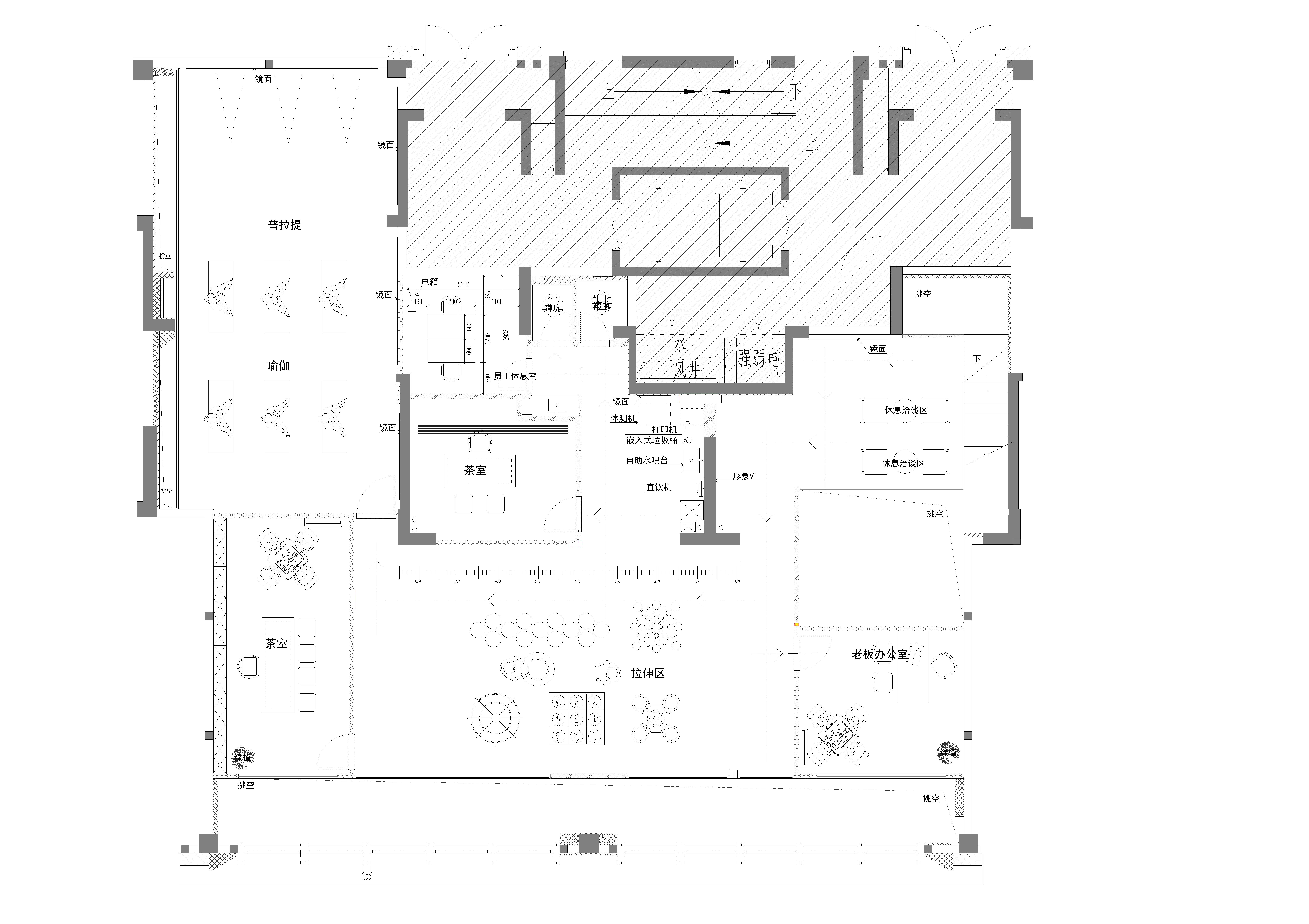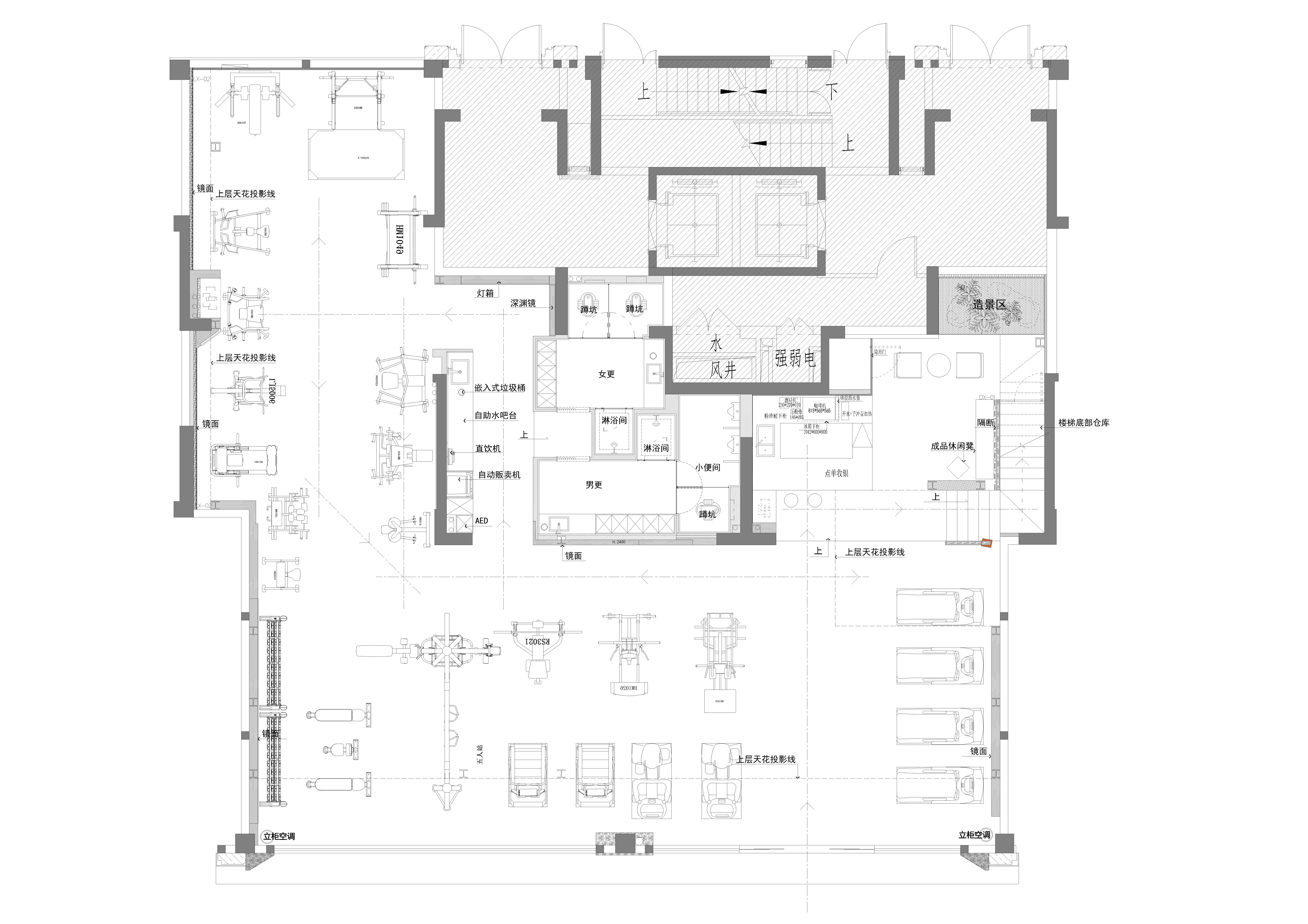 空间布局:1. 一层挑空结构营造开阔通透感,打破常规健身空间压抑感,各功能区视觉互通不割裂