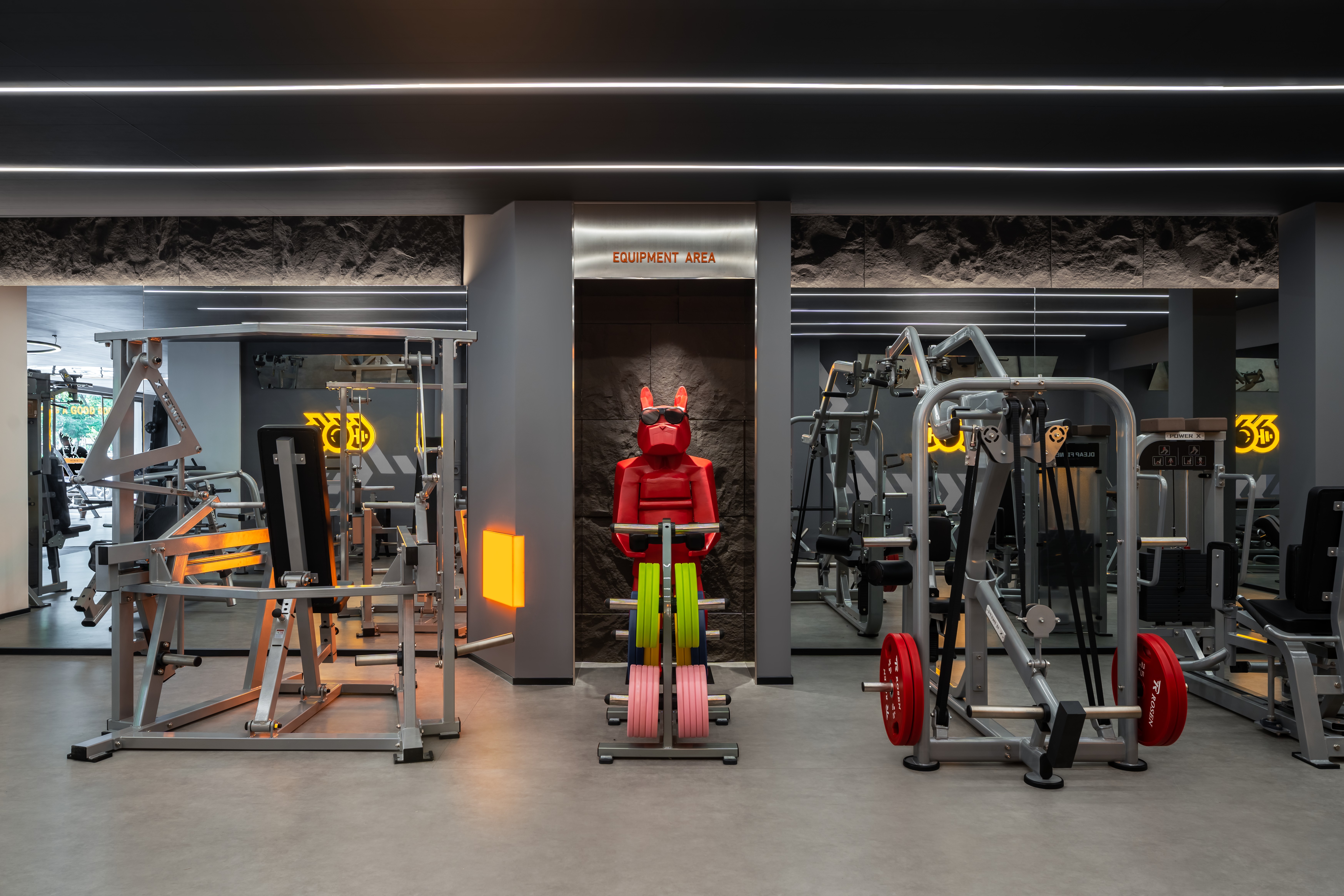 4. 以PU石皮背景墙+洗墙灯贯穿一层器械区与二层普拉提区,打造空间主轴,让整体布局更具连贯性