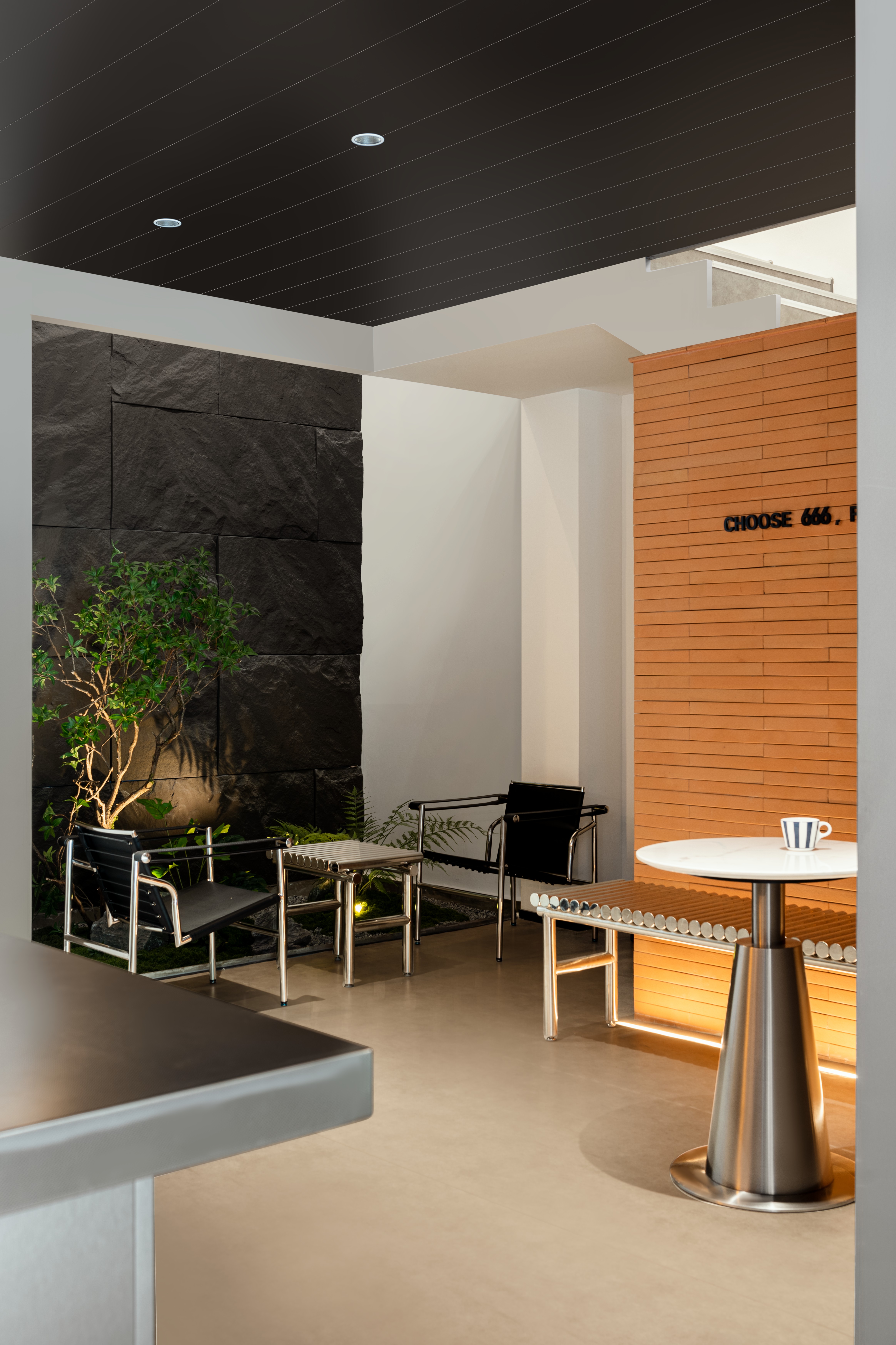 3. 红砖休息区、PU石皮背景墙与金属材质碰撞,动静场景结合,兼顾运动张力与休闲静谧感