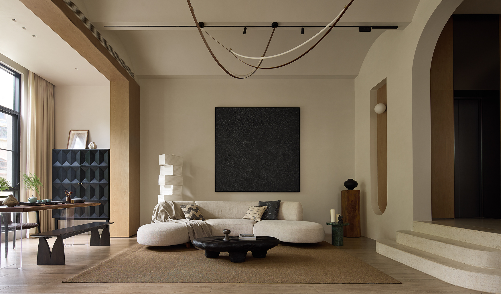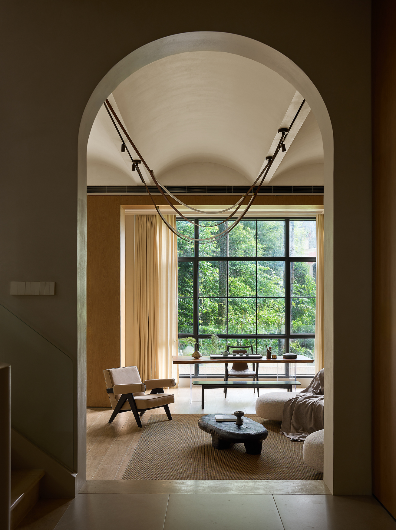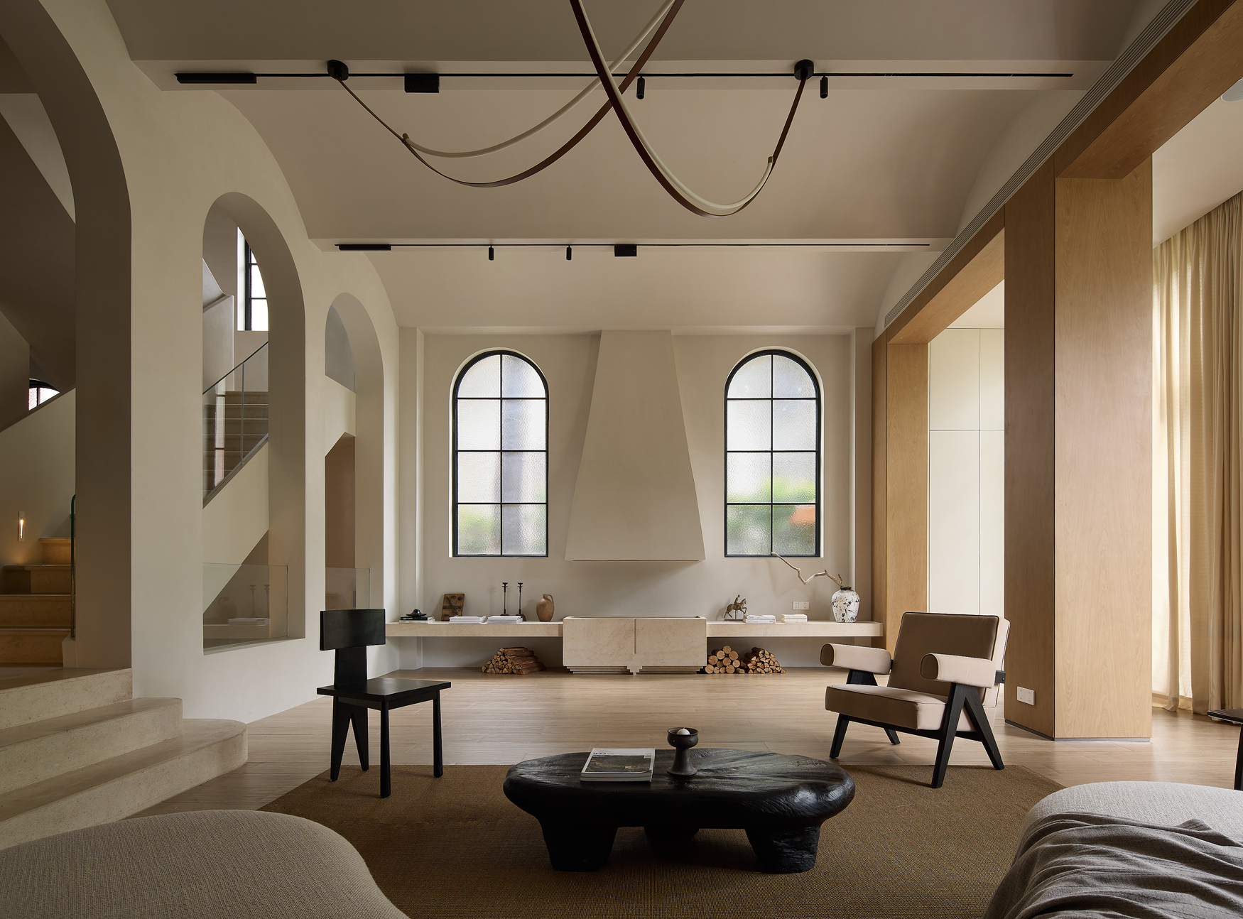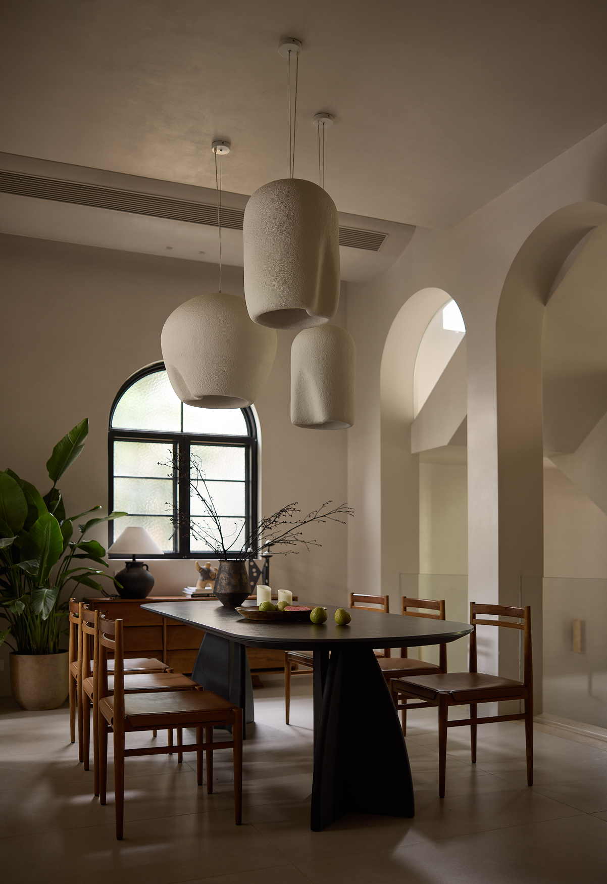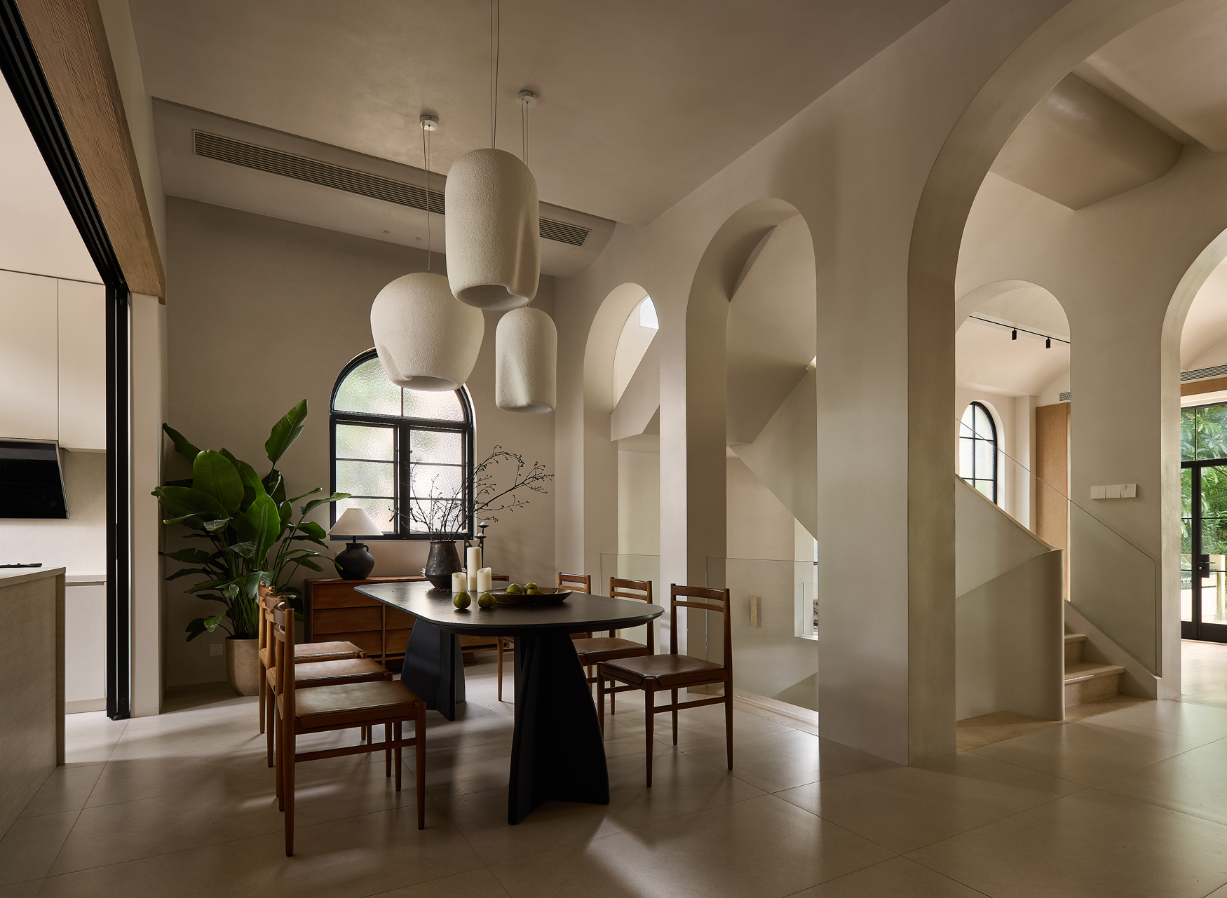 空间布局:素白拱门框景,将光线与建筑结构编织成画,粗粝纹理的吊灯悬于上空,原木餐椅围合餐桌,承载着三餐四季的烟火。
