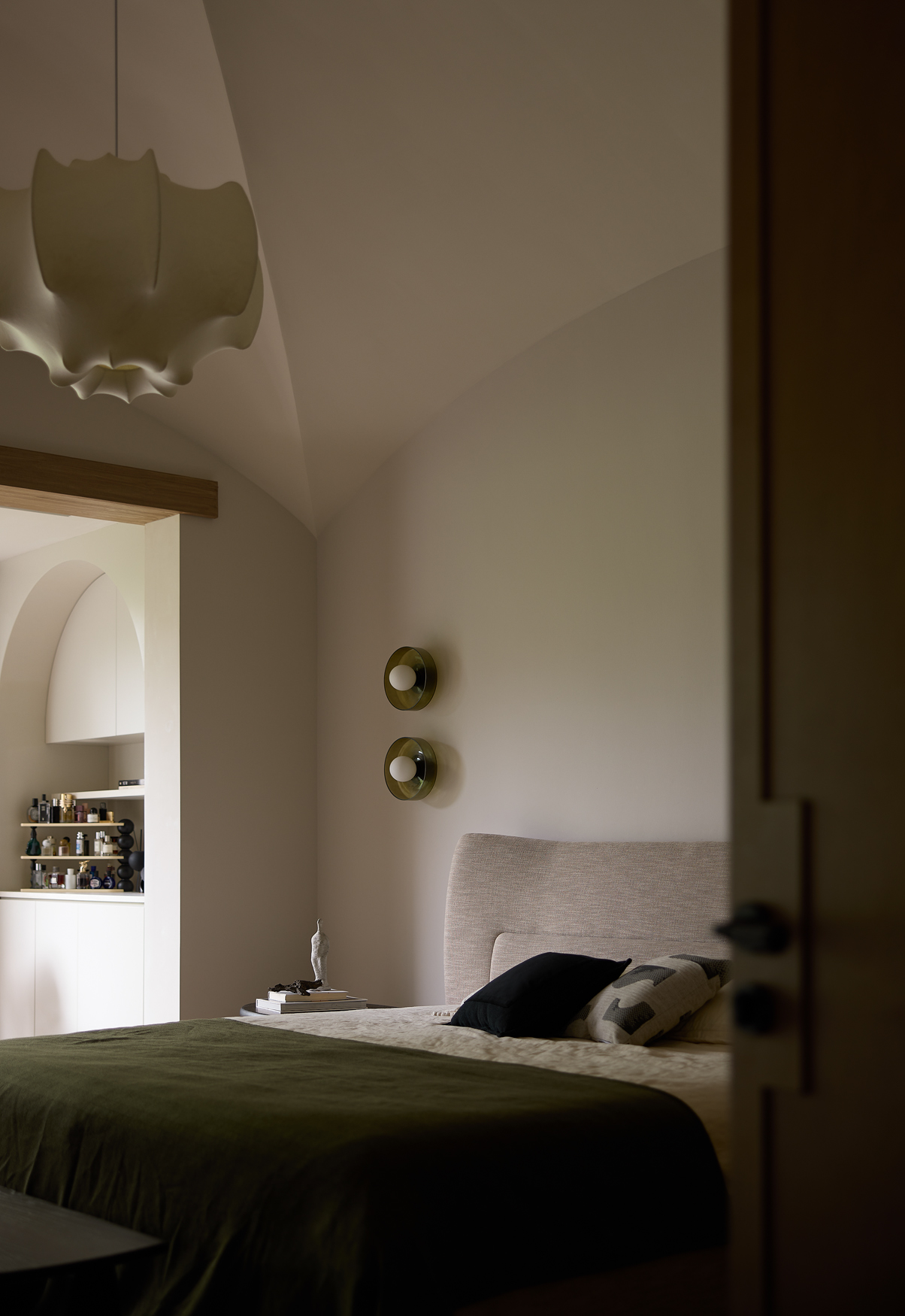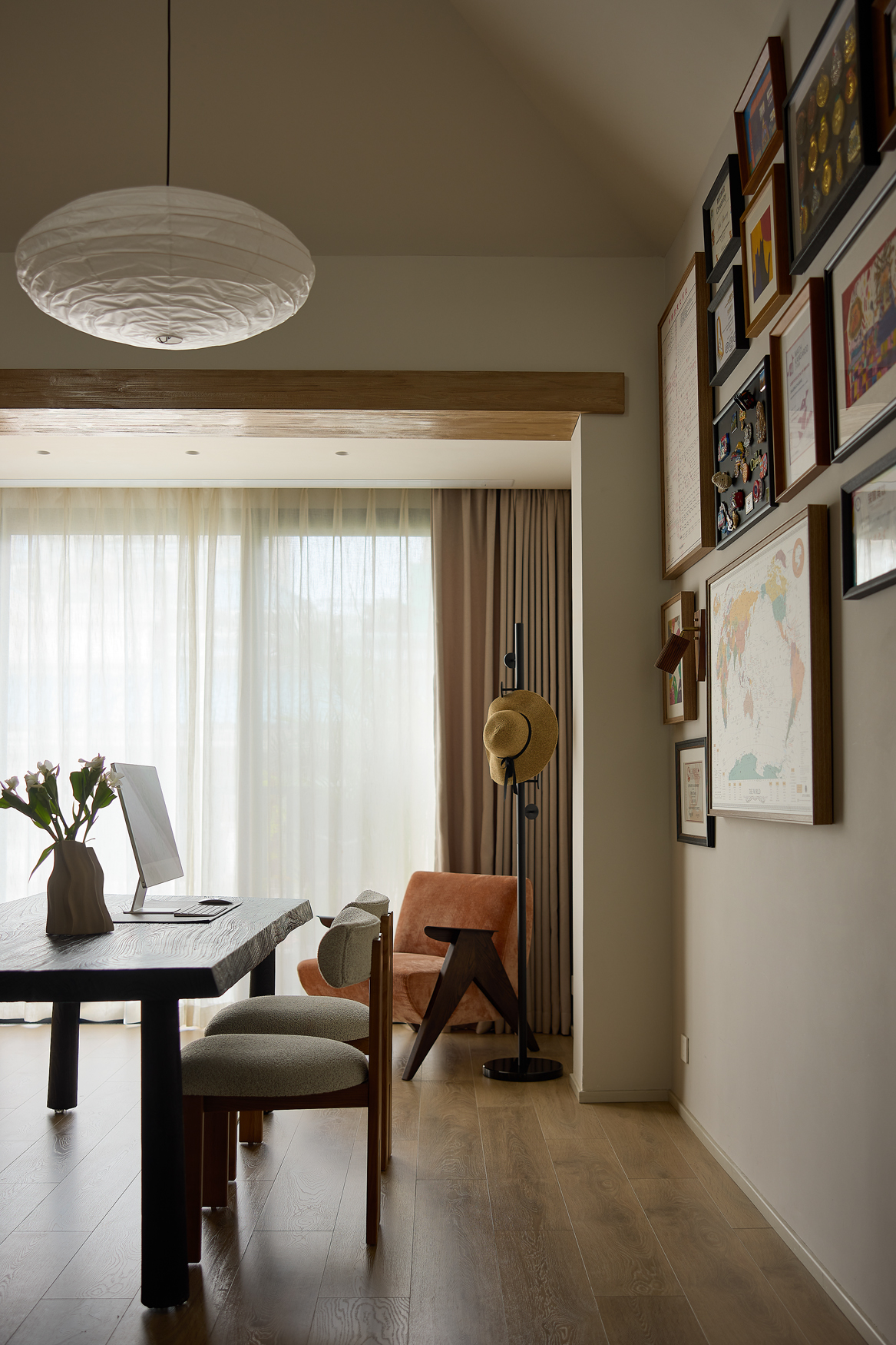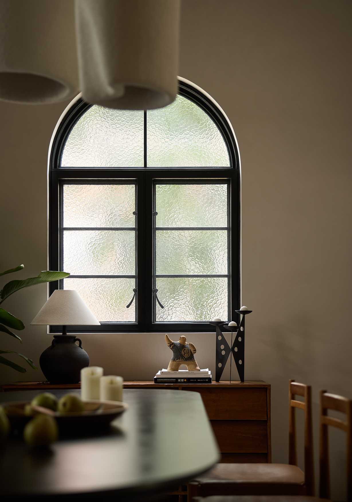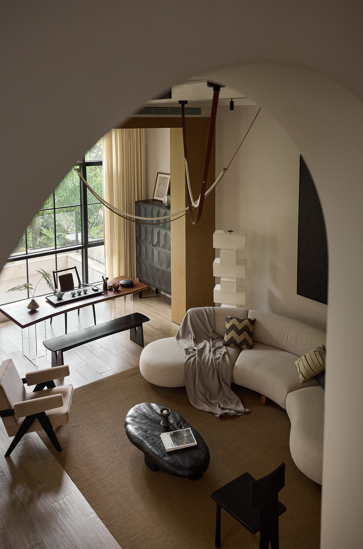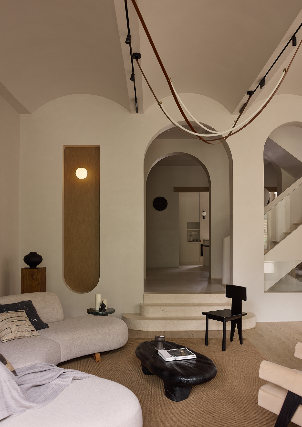 空间布局:素白拱门框景,将光线与建筑结构编织成画,粗粝纹理的吊灯悬于上空,原木餐椅围合餐桌,承载着三餐四季的烟火。