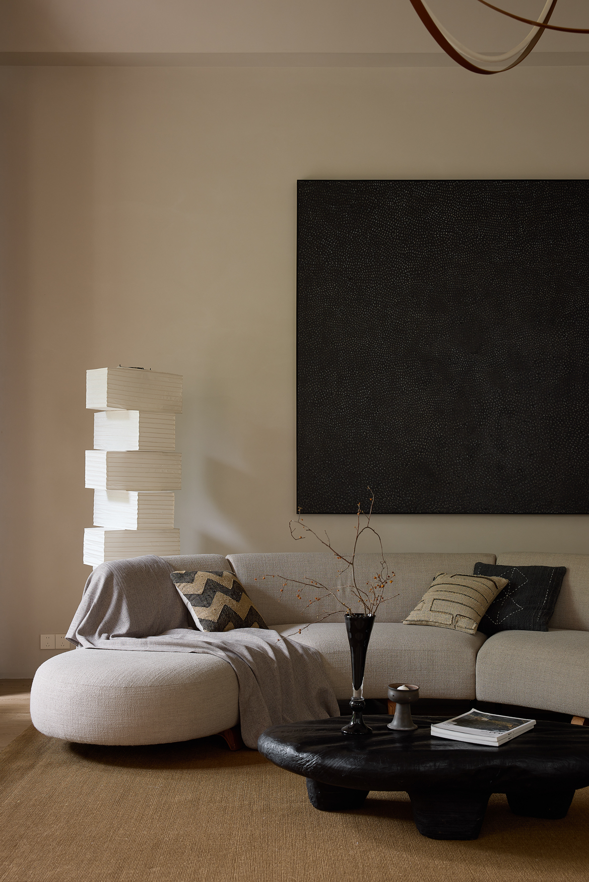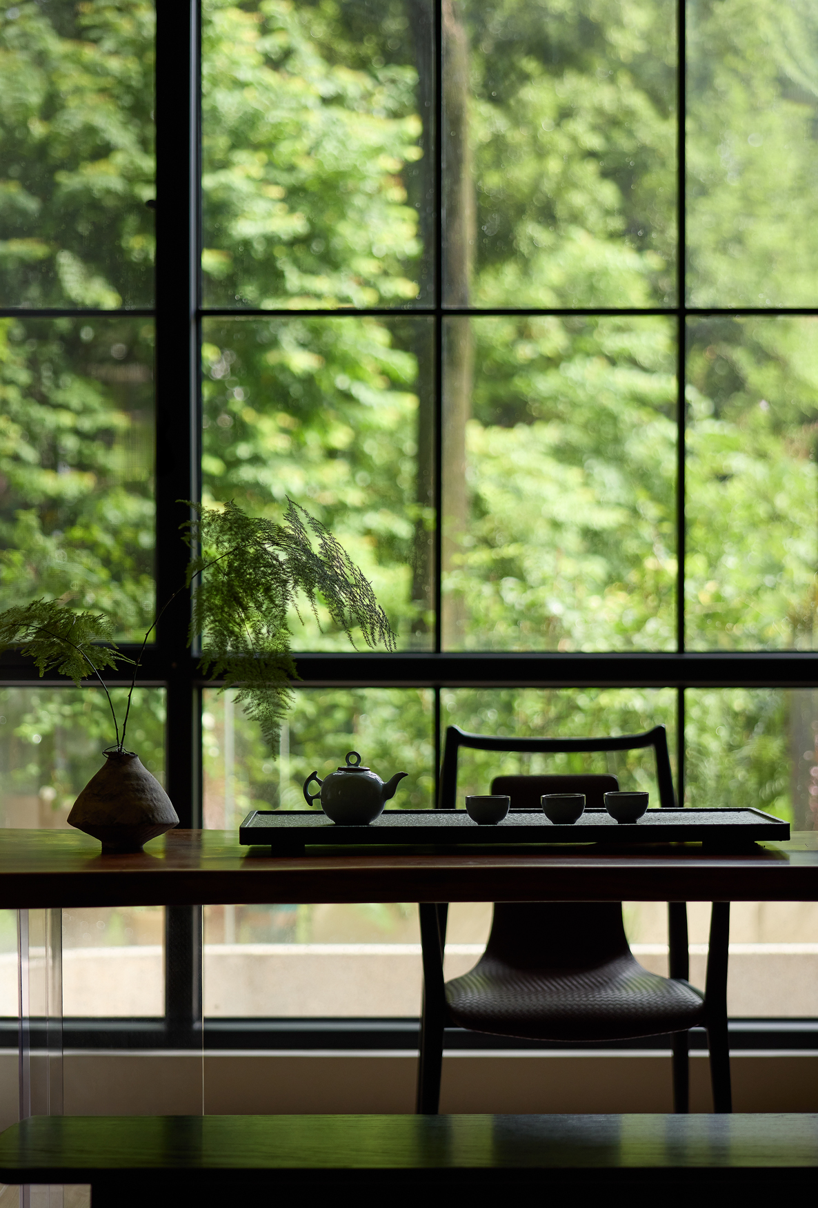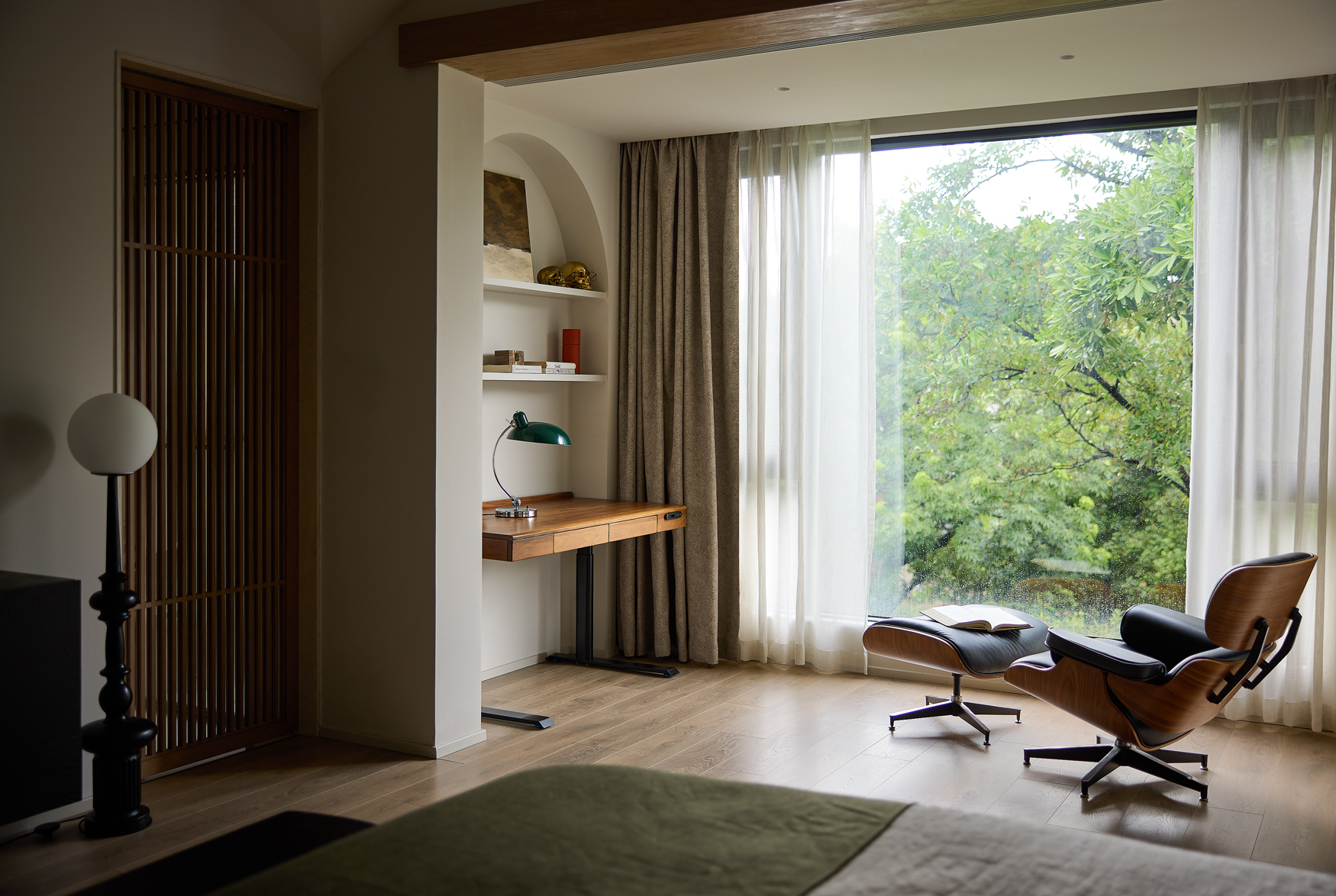 设计选材:舒适的座椅、造型独特的茶几,搭配窗边的置物长桌,窗外绿意映入,营造出宁静自然又充满质感的生活空间 。