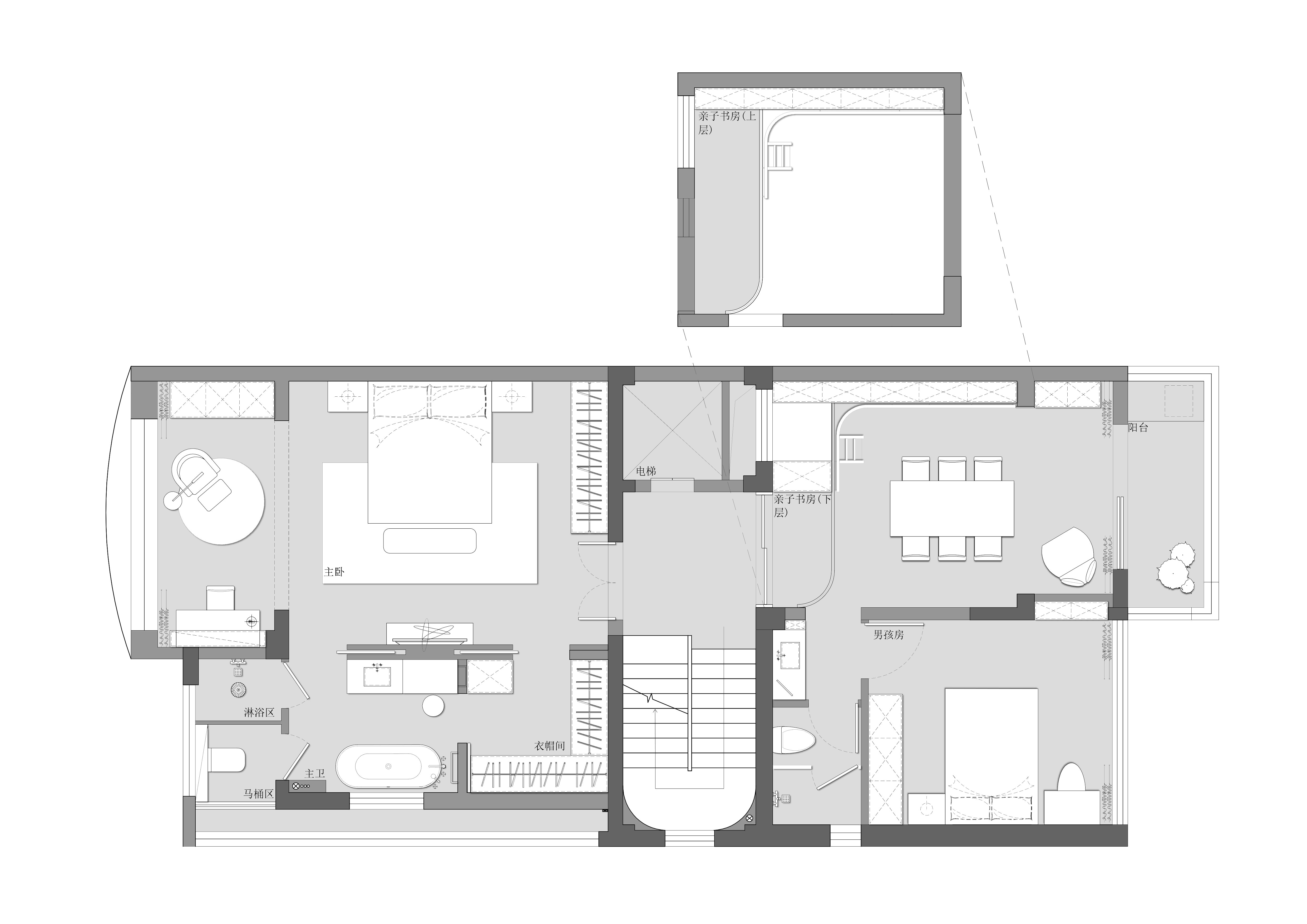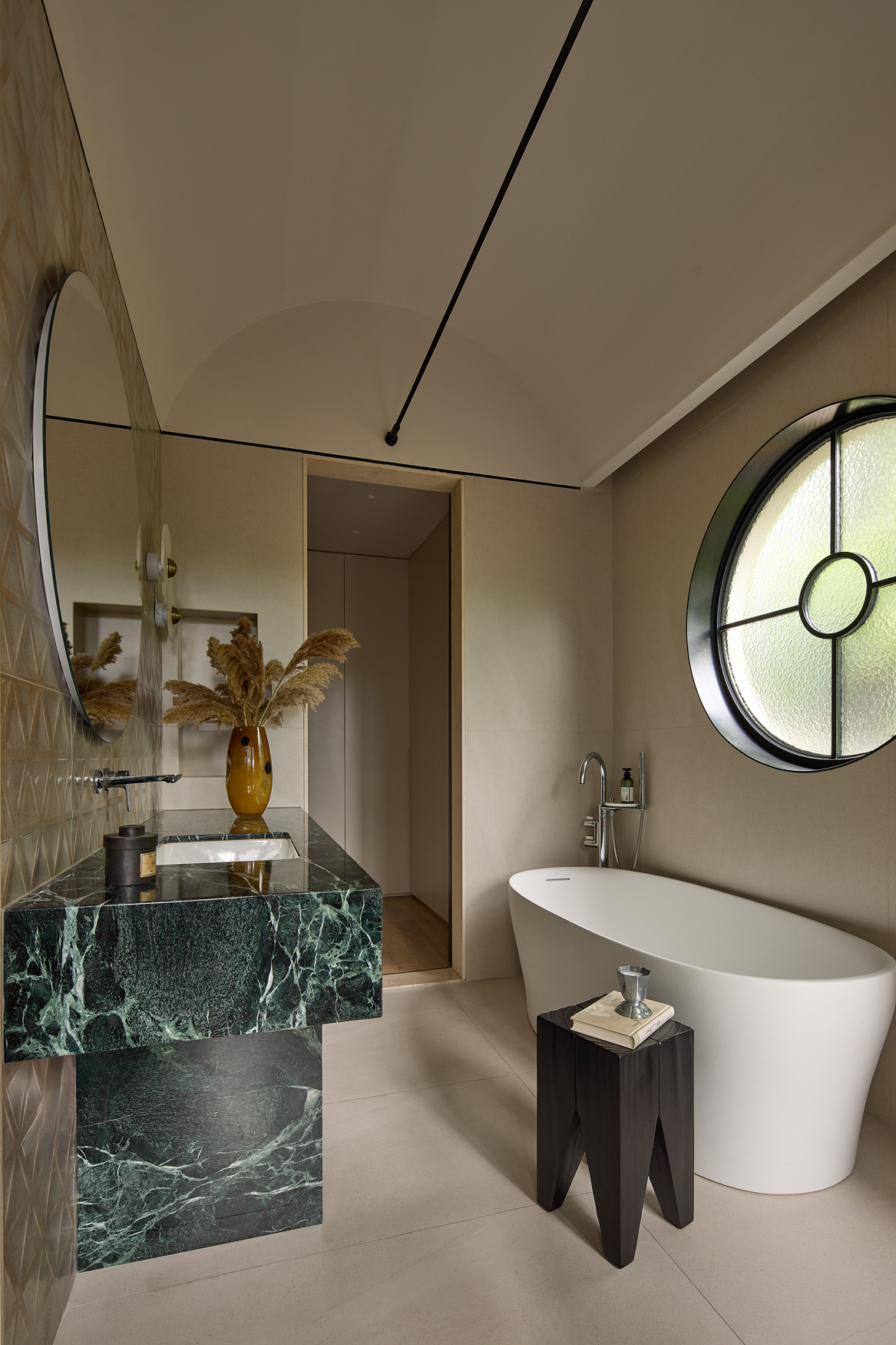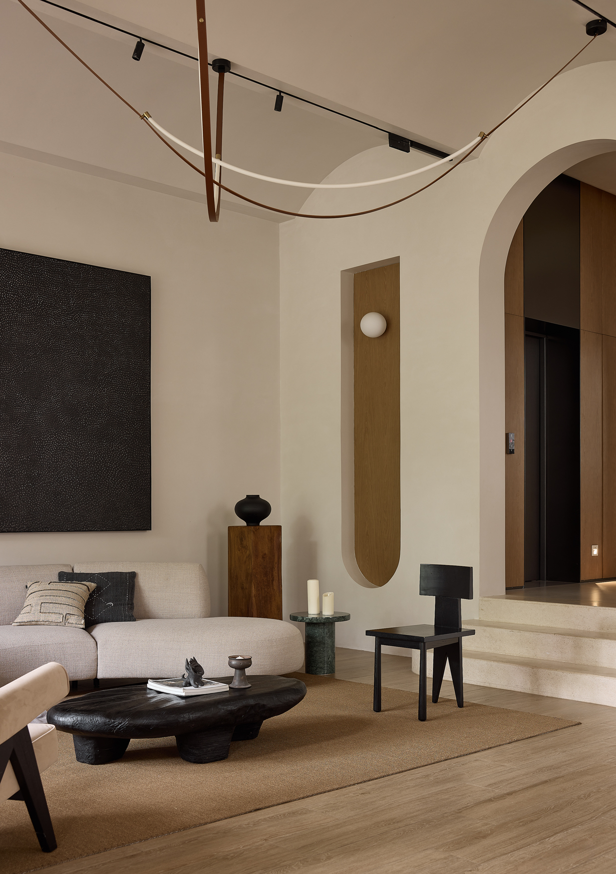 项目定位:本案是位于深圳的一套别墅设计,室内楼梯设计以拱形元素为核心,餐厅与客厅采用联动融合的设计理念,与顶部拱形天花线条形成巧妙呼应,达成空间语言的统一