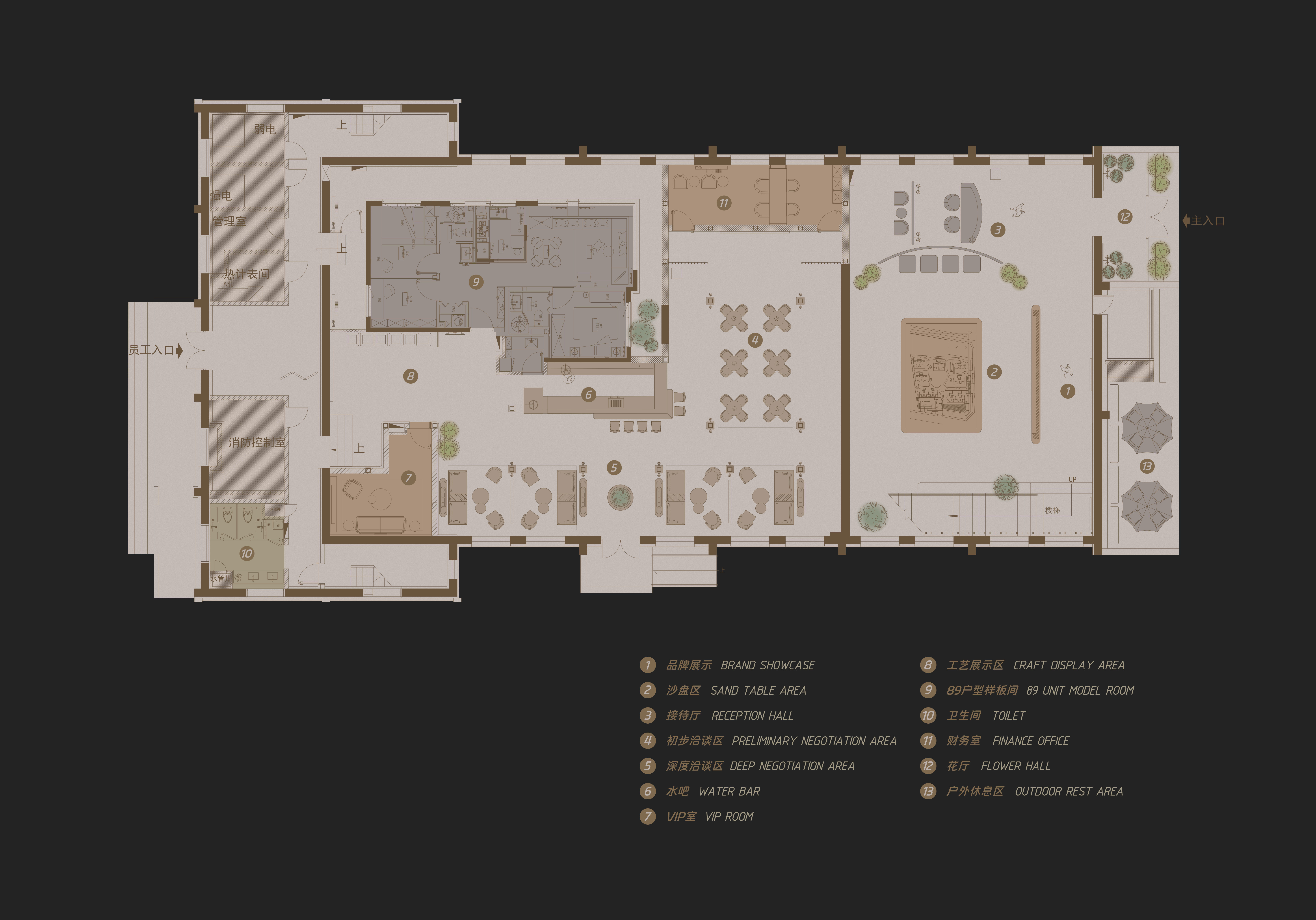 用户体验:投入使用后将为用户提供 “沉浸式 + 全场景” 的优质体验:外部依托生态公园与文化建筑,营造宁静舒适的观赏与到访环境;内部通过清晰的动线设计、温馨雅致的空间氛围,让用户在参观样板间、咨询洽谈过程中感受品质生活场景。独立卫生间、水吧区、VIP 洽谈区等配套空间满足用户多样化需求,品牌展示区与工法展示区则增强用户对项目的信任度,整体实现 “参观 - 体验 - 沟通” 的无缝衔接,为用户带来舒适、专业且富有质感的营销服务体验。