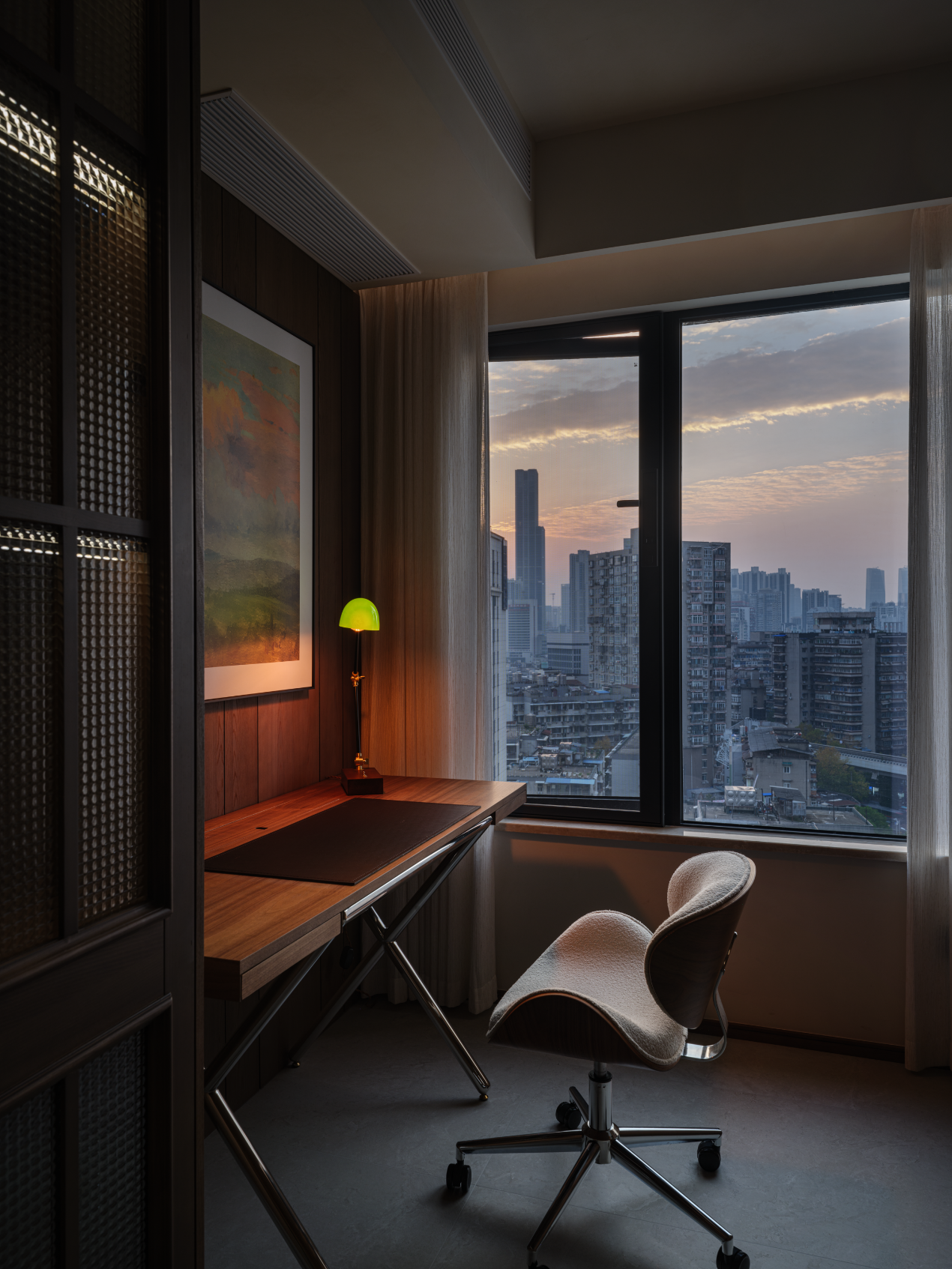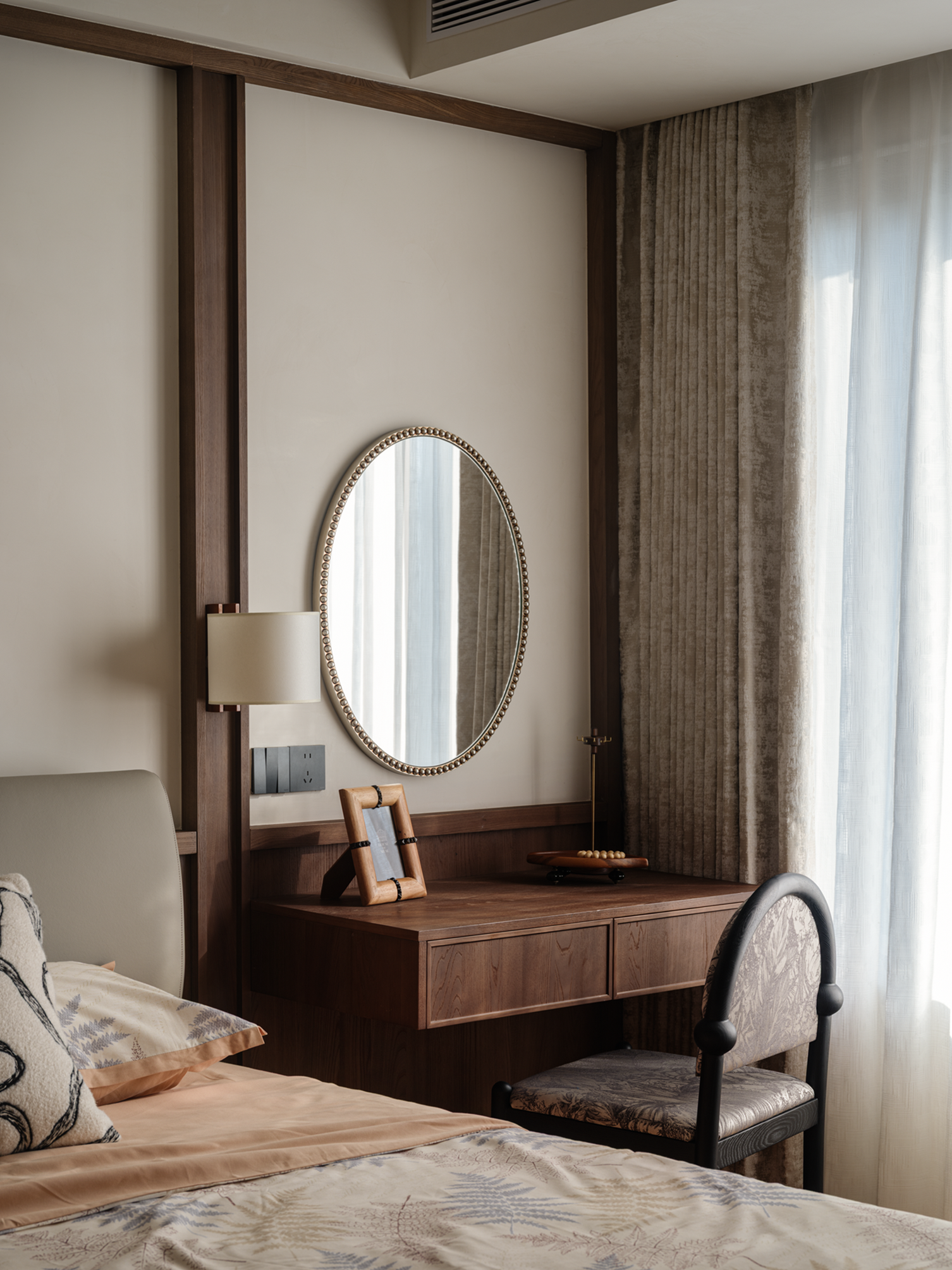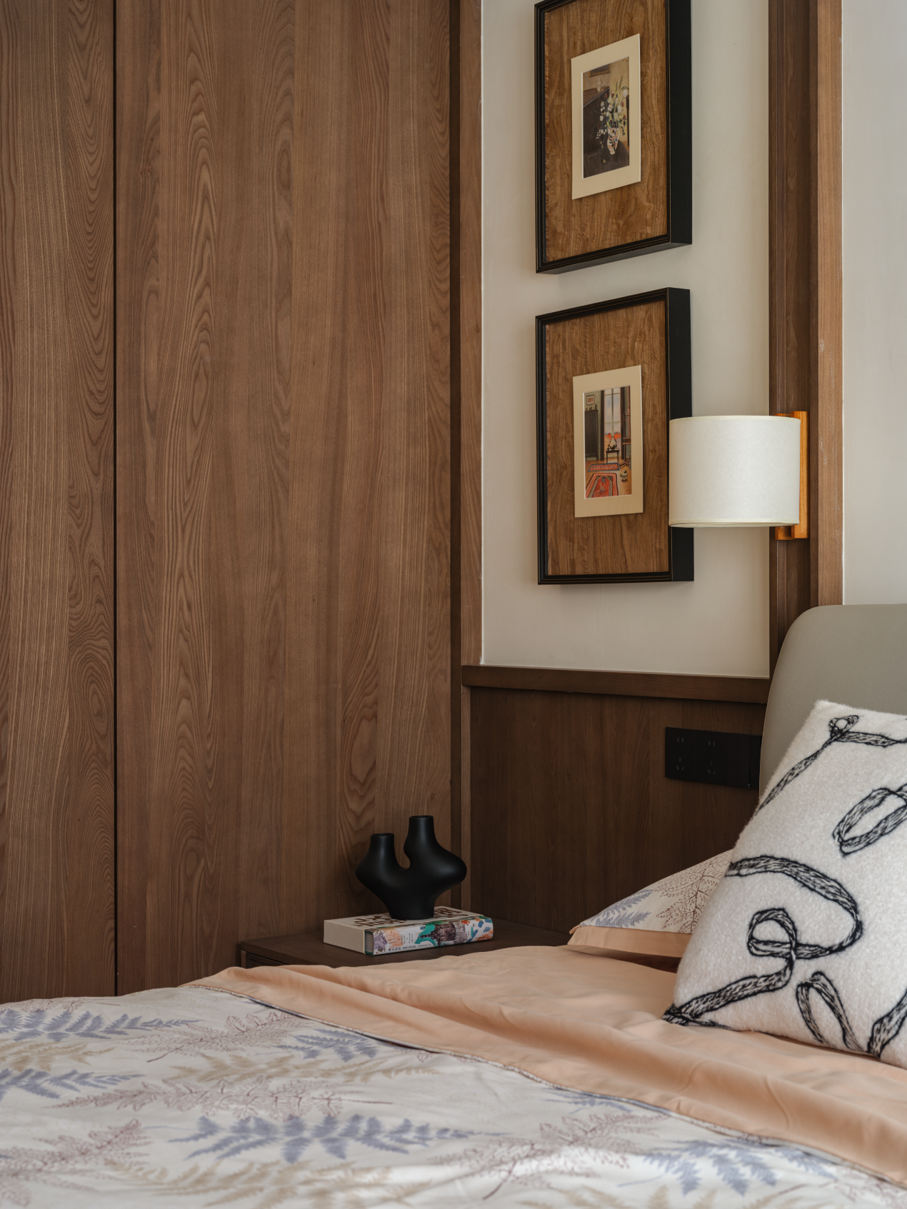 卧室:治愈系的私享谧境 白日至短,未来方长。主卧的设计,从色彩、材质到细微感知,皆沉潜为契合居者心性的温厚底色。空间延续了公共区域的木质基调,通过一门到顶的柜体与延展式墙板的一体化设计,以利落细腻的线条勾勒出生活的叙事。每一次不经意的触抚,木质的温润便透过指尖悄然传递,仿佛一把握在手心的、通往安顿与宁静的钥匙。
