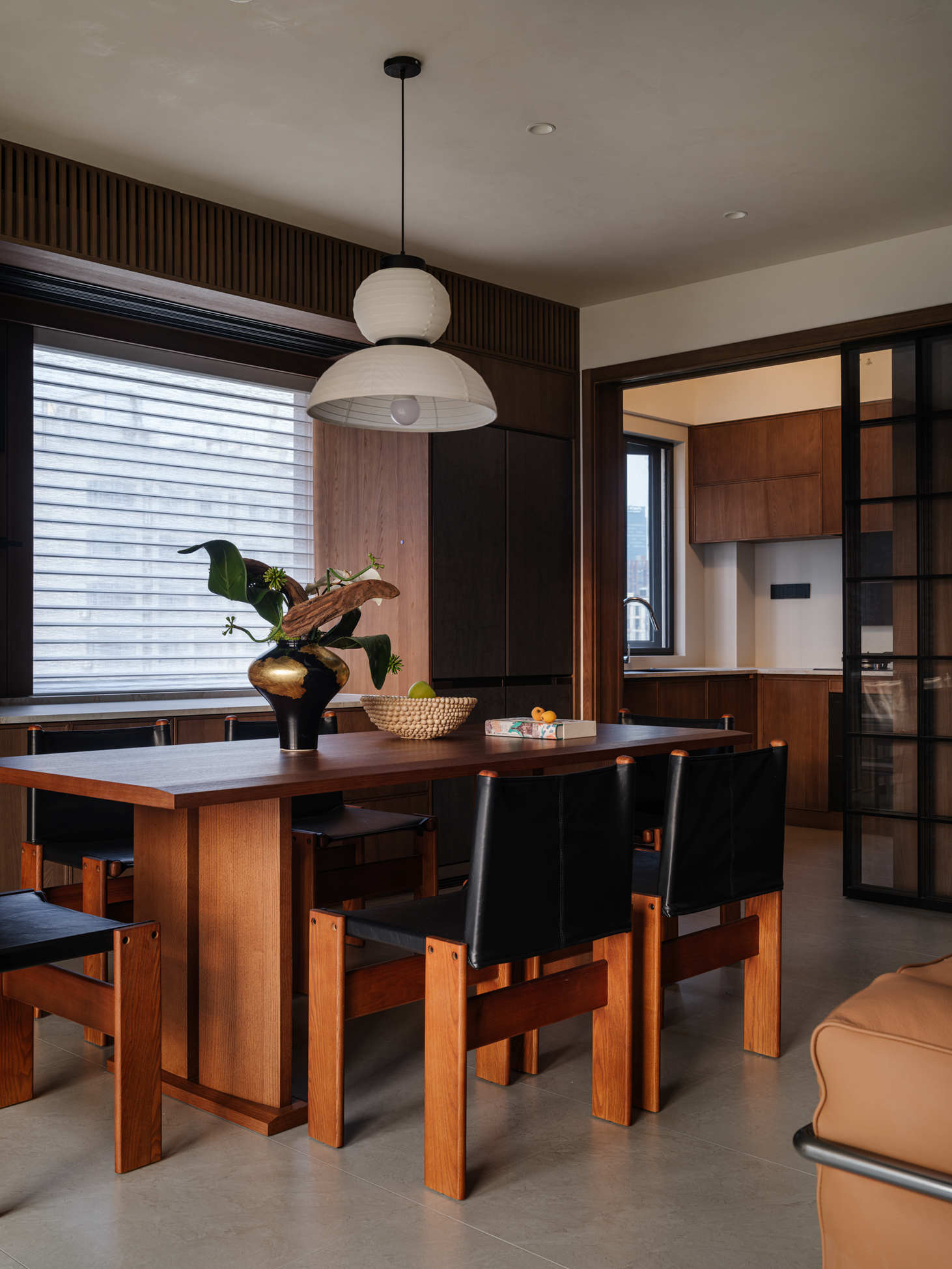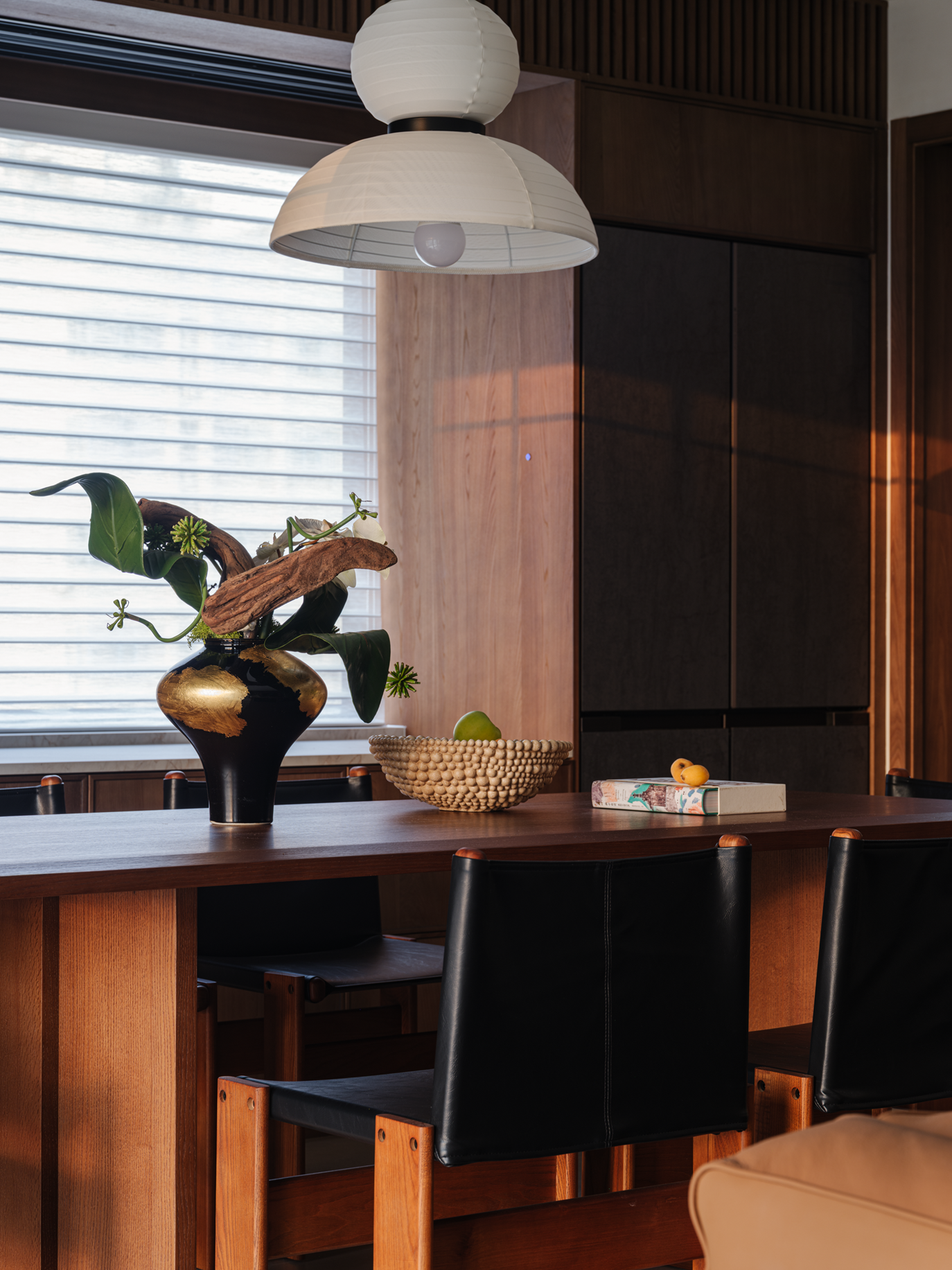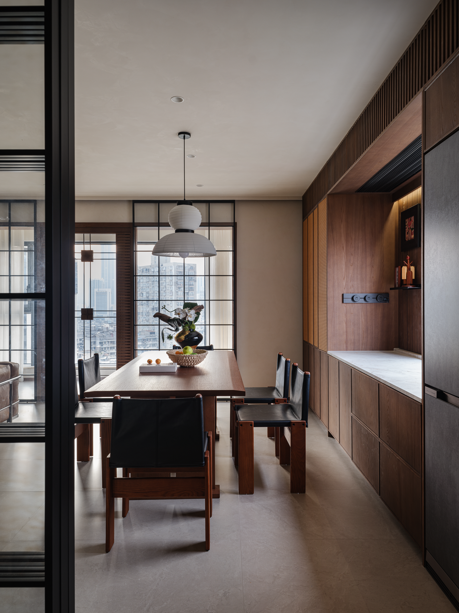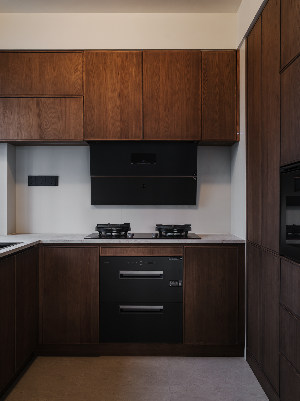 厨房:可开可合的烟火叙事 一道联动门,为厨房创造了两种场景:准备餐食时,它是隔绝油烟的清晰边界;平日门展开时,它便完全融入餐厅的开放场域。为了延伸有限的操作面积,餐厅一侧定制了一排西厨柜,让备餐、烘焙与日常饮水功能变得从容而连续。 空间整体覆以温润的胡桃木基调,木质肌理犹如一杯手冲咖啡般令人放松,营造出细腻而富有温度的生活底色