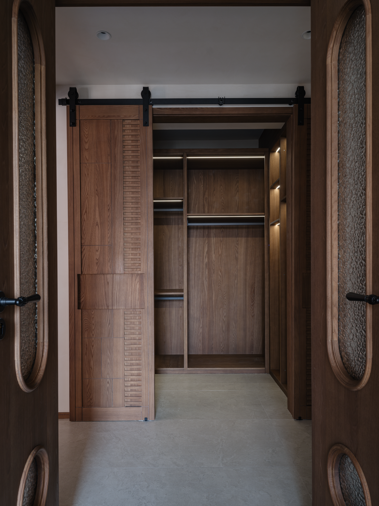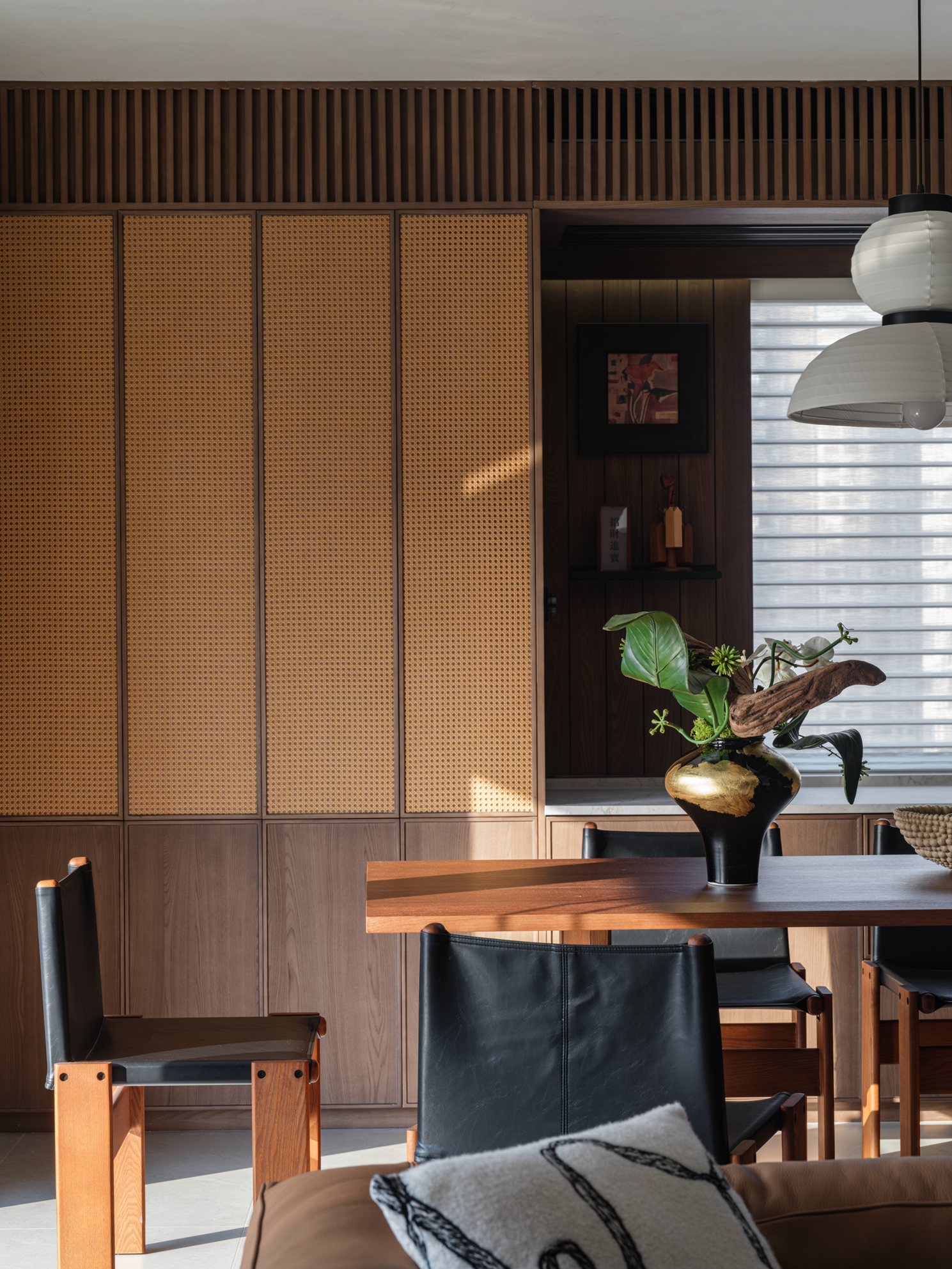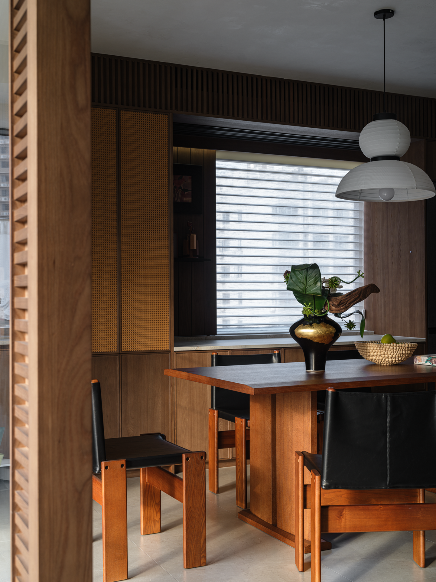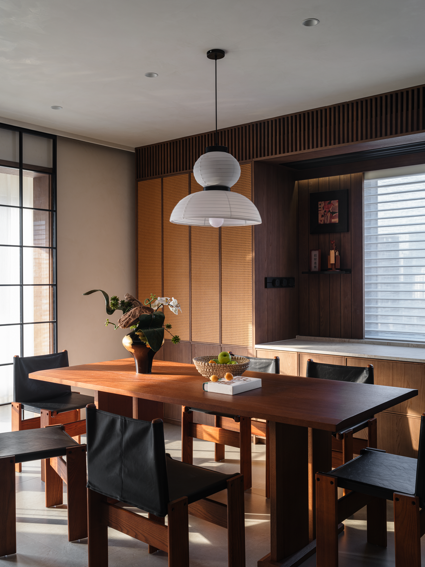 厨房:可开可合的烟火叙事 一道联动门,为厨房创造了两种场景:准备餐食时,它是隔绝油烟的清晰边界;平日门展开时,它便完全融入餐厅的开放场域。为了延伸有限的操作面积,餐厅一侧定制了一排西厨柜,让备餐、烘焙与日常饮水功能变得从容而连续。 空间整体覆以温润的胡桃木基调,木质肌理犹如一杯手冲咖啡般令人放松,营造出细腻而富有温度的生活底色