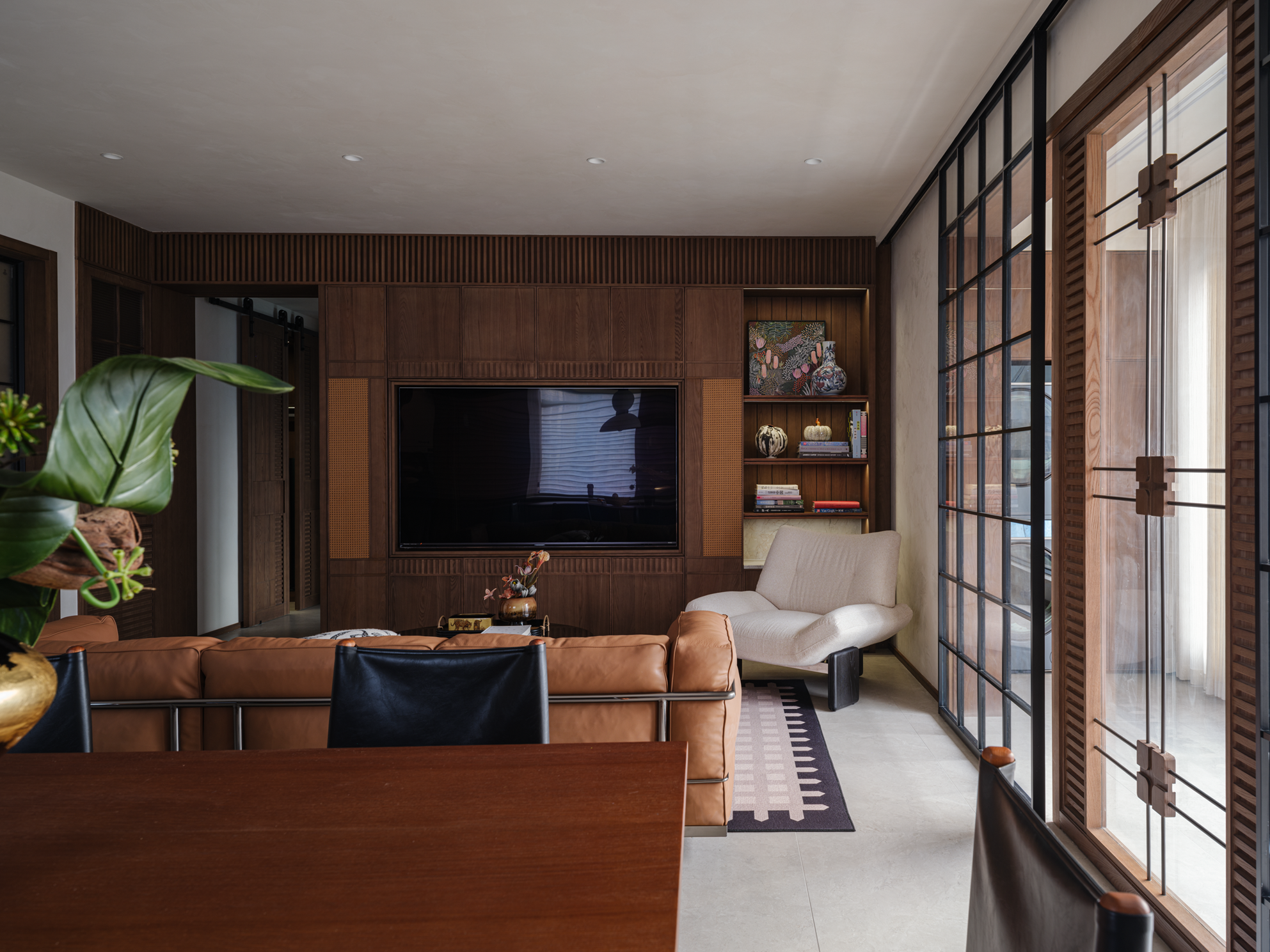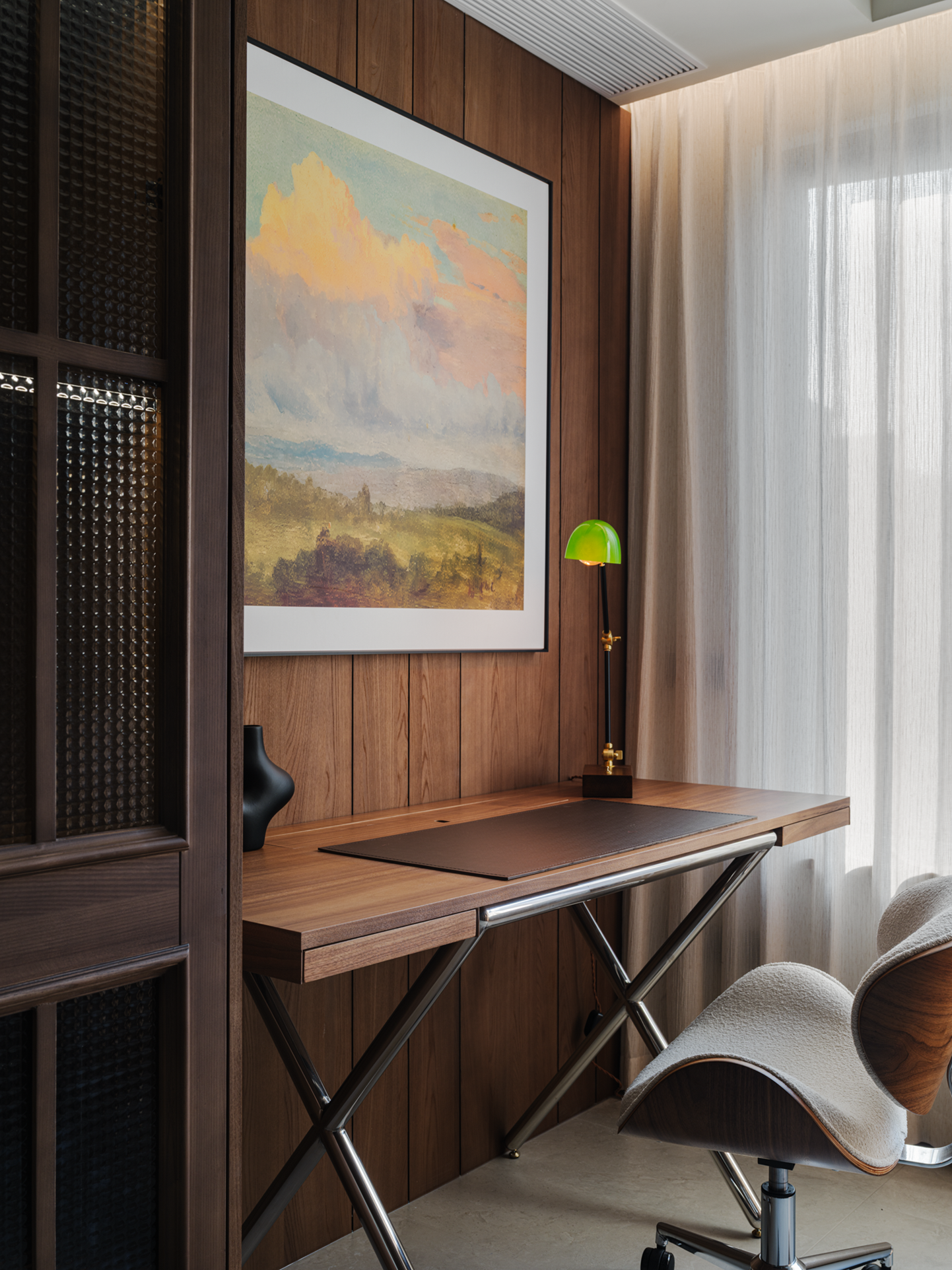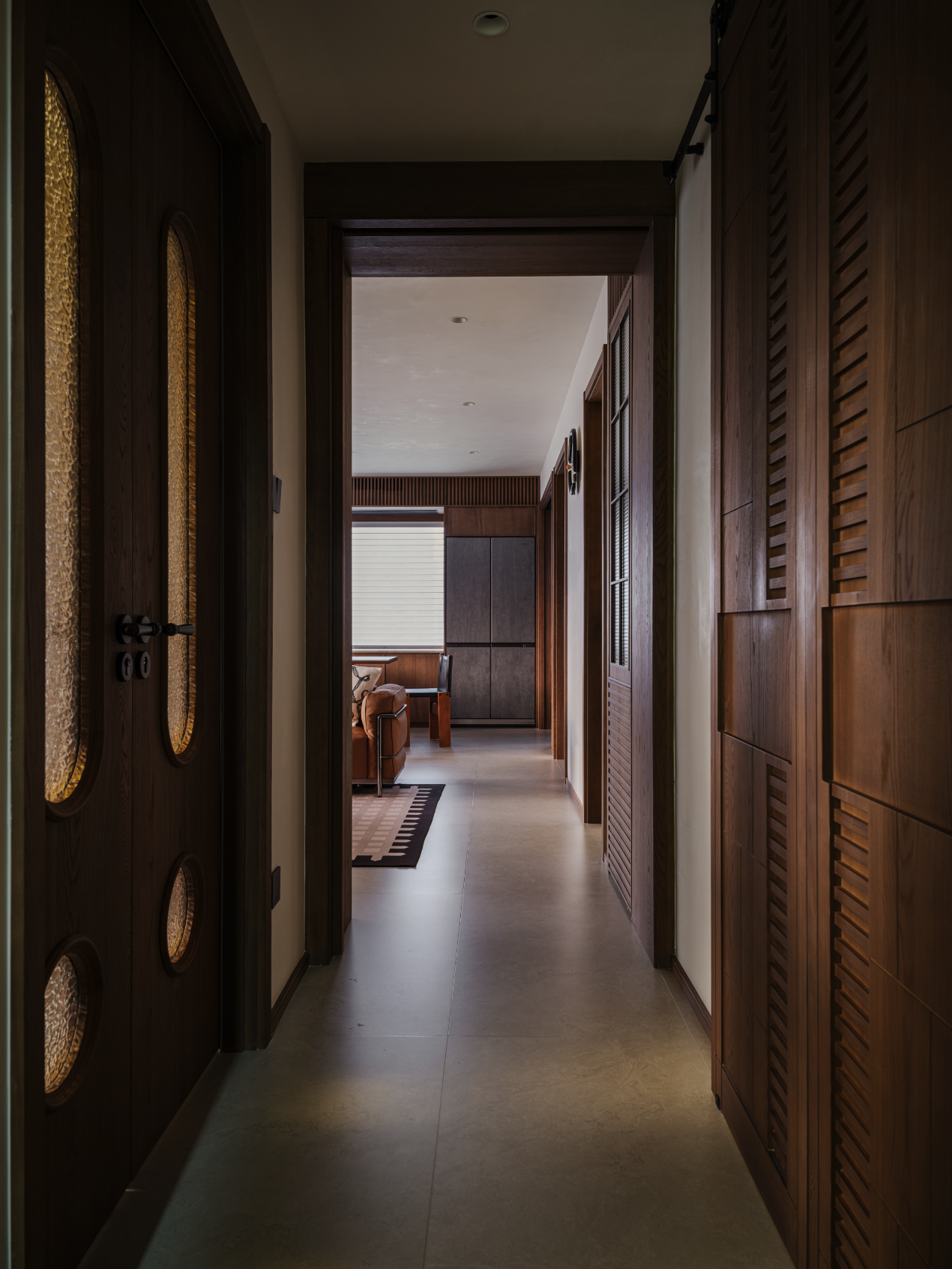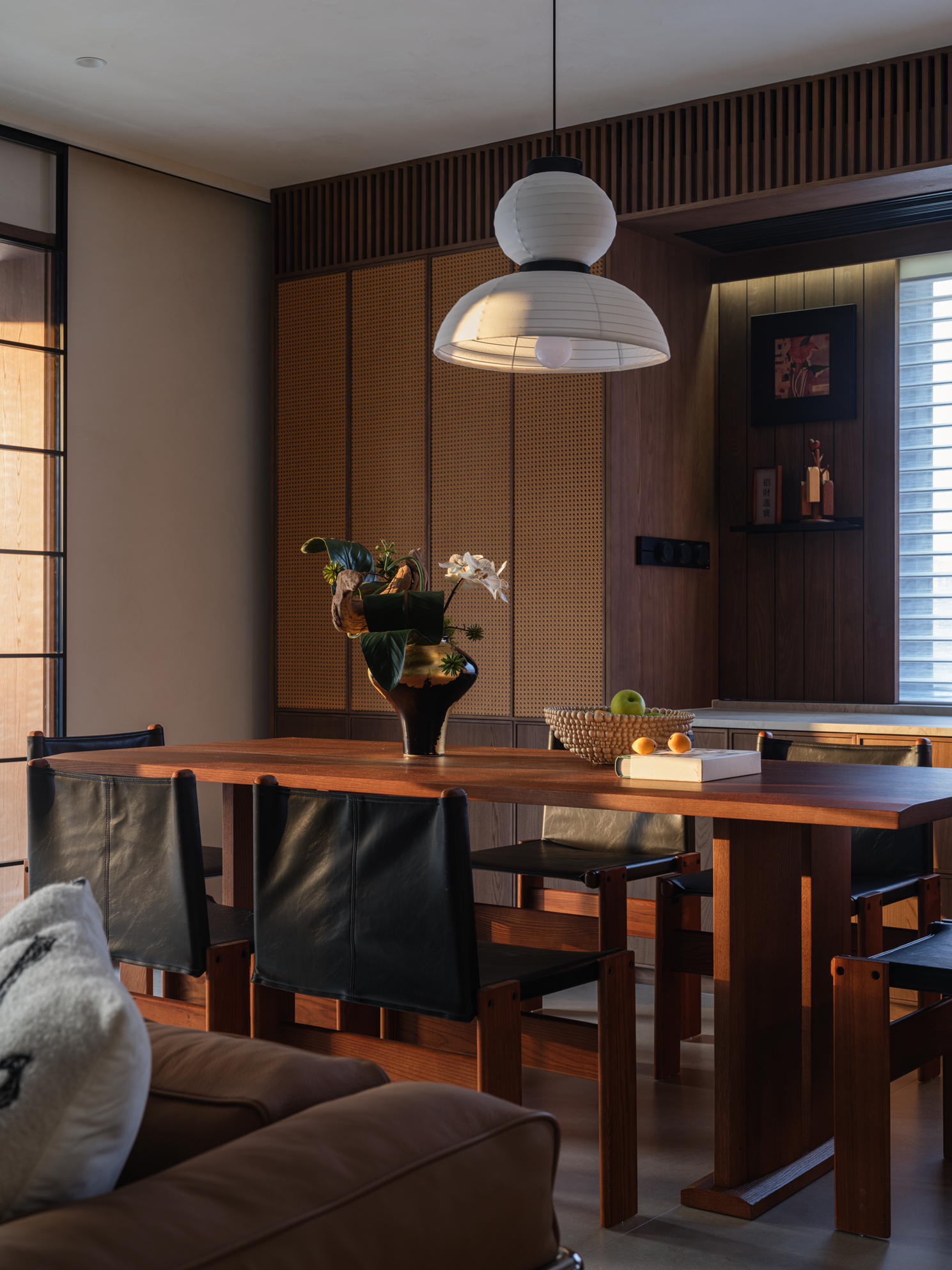 厨房:可开可合的烟火叙事 一道联动门,为厨房创造了两种场景:准备餐食时,它是隔绝油烟的清晰边界;平日门展开时,它便完全融入餐厅的开放场域。为了延伸有限的操作面积,餐厅一侧定制了一排西厨柜,让备餐、烘焙与日常饮水功能变得从容而连续。 空间整体覆以温润的胡桃木基调,木质肌理犹如一杯手冲咖啡般令人放松,营造出细腻而富有温度的生活底色