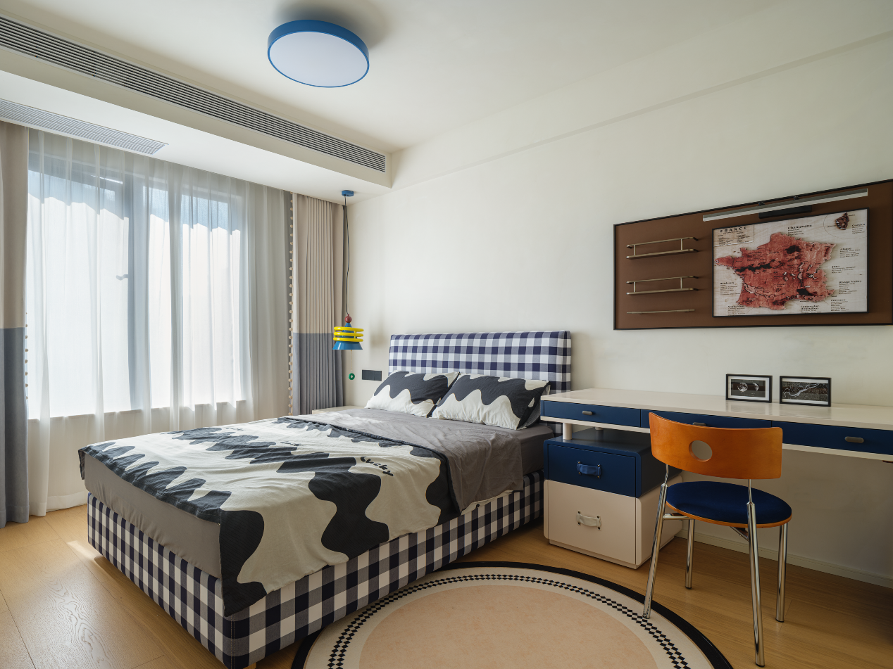 儿童房:想象力的秘密基地 儿童房的设计转向轻盈与明朗。蓝白色为主调,营造出通透而富有朝气的场域氛围。世界地图装置、床头灯饰等元素,不着痕迹地构建出一个专属于他的秘密基地。在这里,日常与幻想没有边界,空间本身即是可供想象力任意生长的“私人星球”。