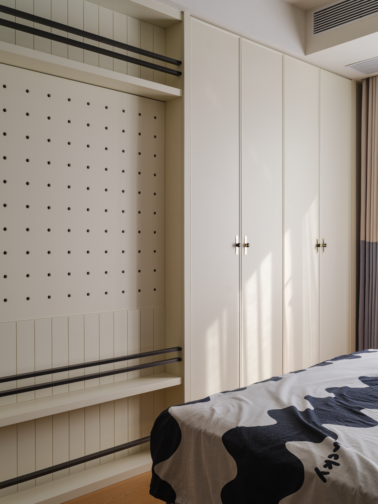 儿童房与多功能房之间利用嵌入式薄柜收纳打印机及生活杂物。床尾衣柜和洞洞板墙面结合设计,形成了一个可灵活调节、随时应对成长变化的展示与储物界面。功能与形式在此轻盈交织,让实用亦成为一种静默的美学。