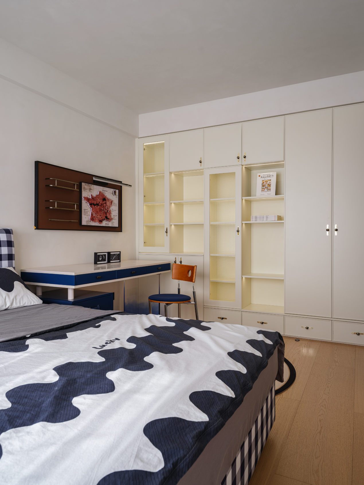 儿童房收纳柜的设计根据实际的生活习惯和空间规划而定,所有门扇的开启轨迹均精准计算,确保在书桌原位不动的前提下,日常收纳流畅无忧。设计以隐形的智慧守护孩子的专注时光,让秩序与自由在开合间轻盈共生。