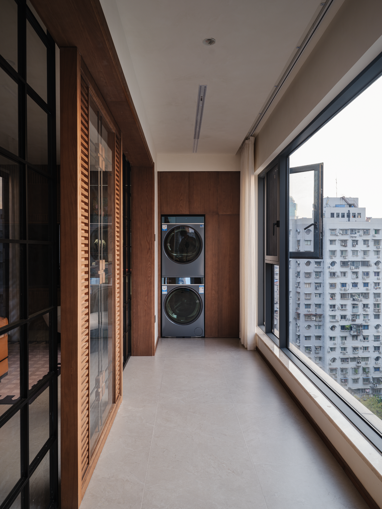 阳台:颜值与实用并存的功能空间 生活阳台,是兼顾家政与晾晒的复合型空间,并通过增设一道通透的玻璃隔断门,赋予其清晰的边界与调节能力。最终,实用与克制在此达成平衡,让琐碎日常亦能被温和承载。