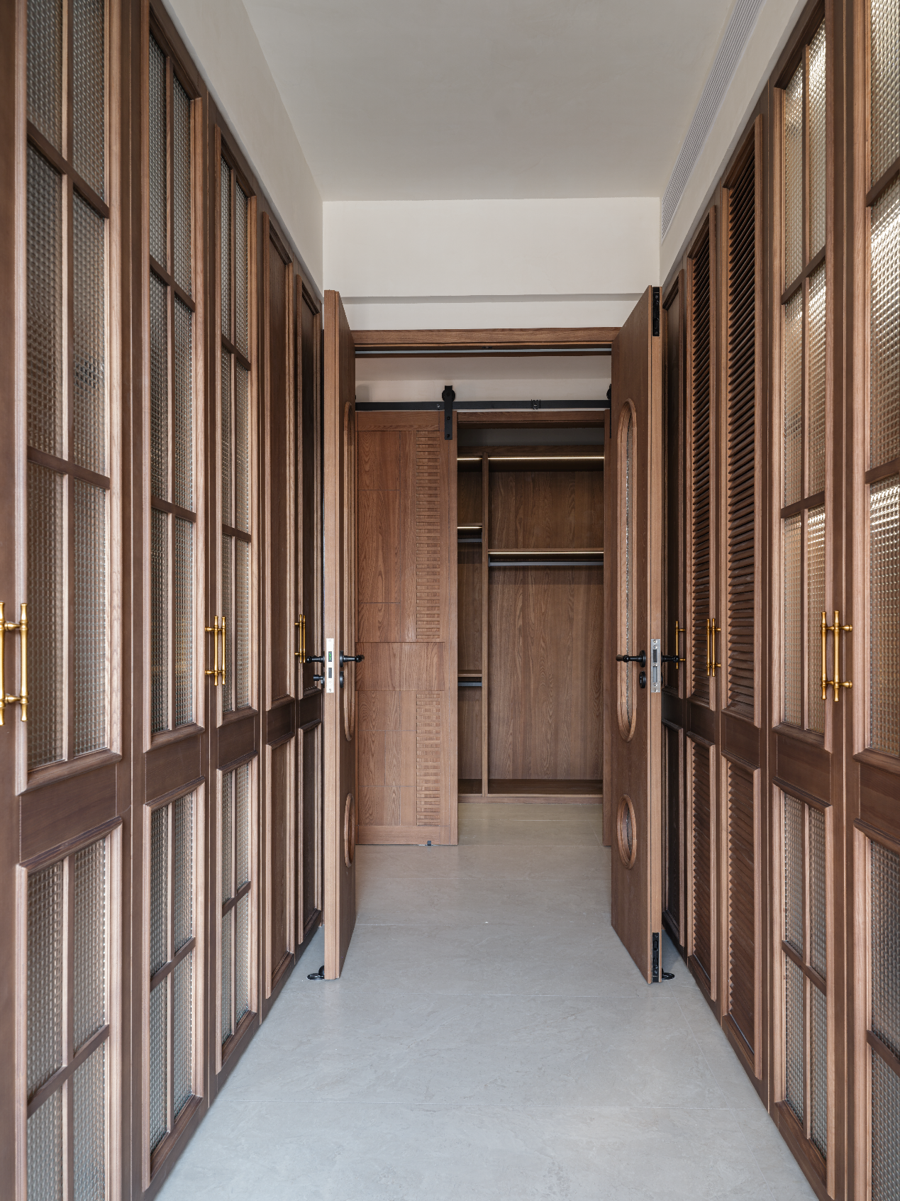 衣帽间:奢雅的生活底色 卧室与衣帽间之间,则凭借一道双面收纳墙体,一举解决卧室与衣帽间的收纳需求,木质的温润与玻璃的通透交融,达成空间的高效整合与纯粹表达。深棕色作为空间基调,连贯而沉静,为家奠定下富有质感且安稳的视觉底色。