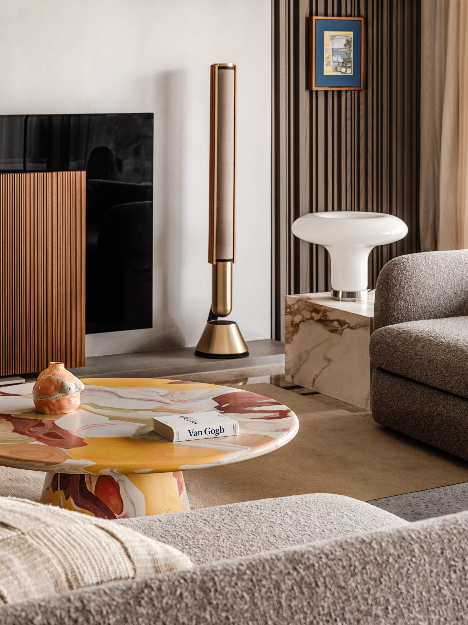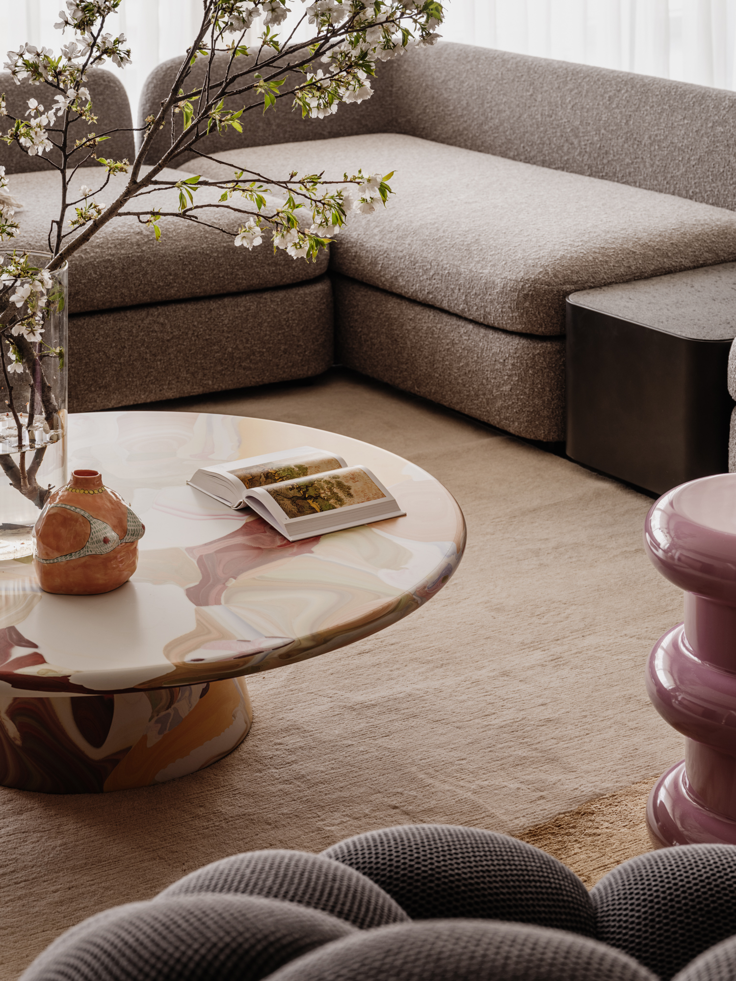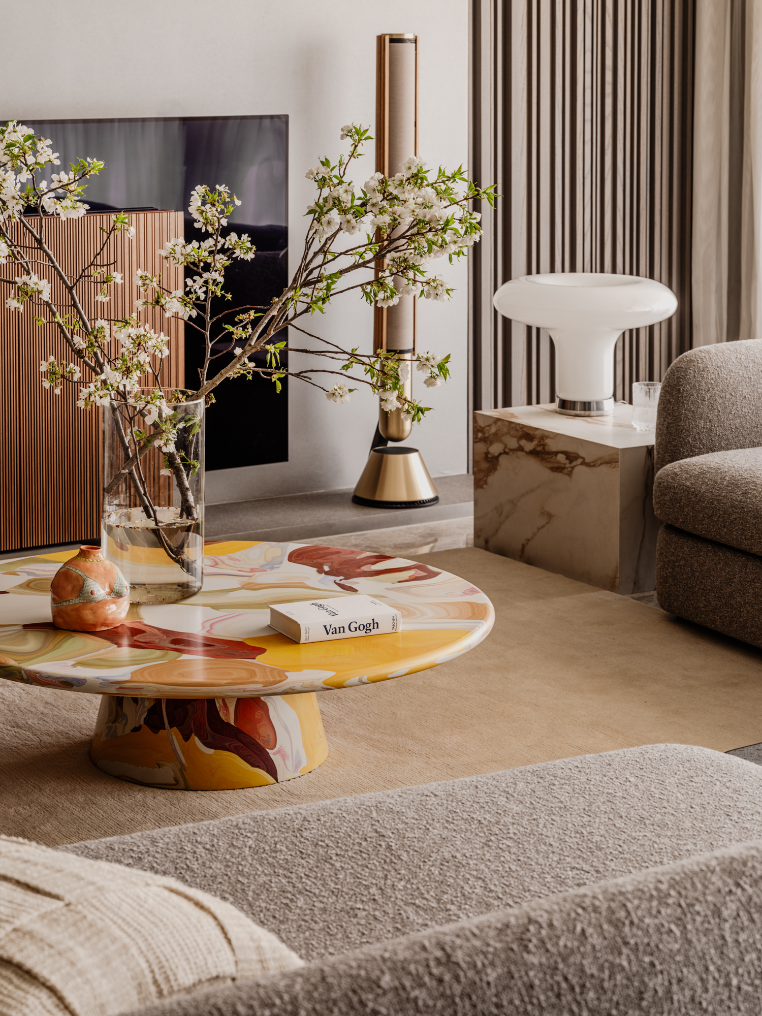 设计选材:艺术漆搭配浅灰色饰面,使空间更显年轻时尚。地面石材的独特纹理,与顶面呼应的质感漆相得益彰