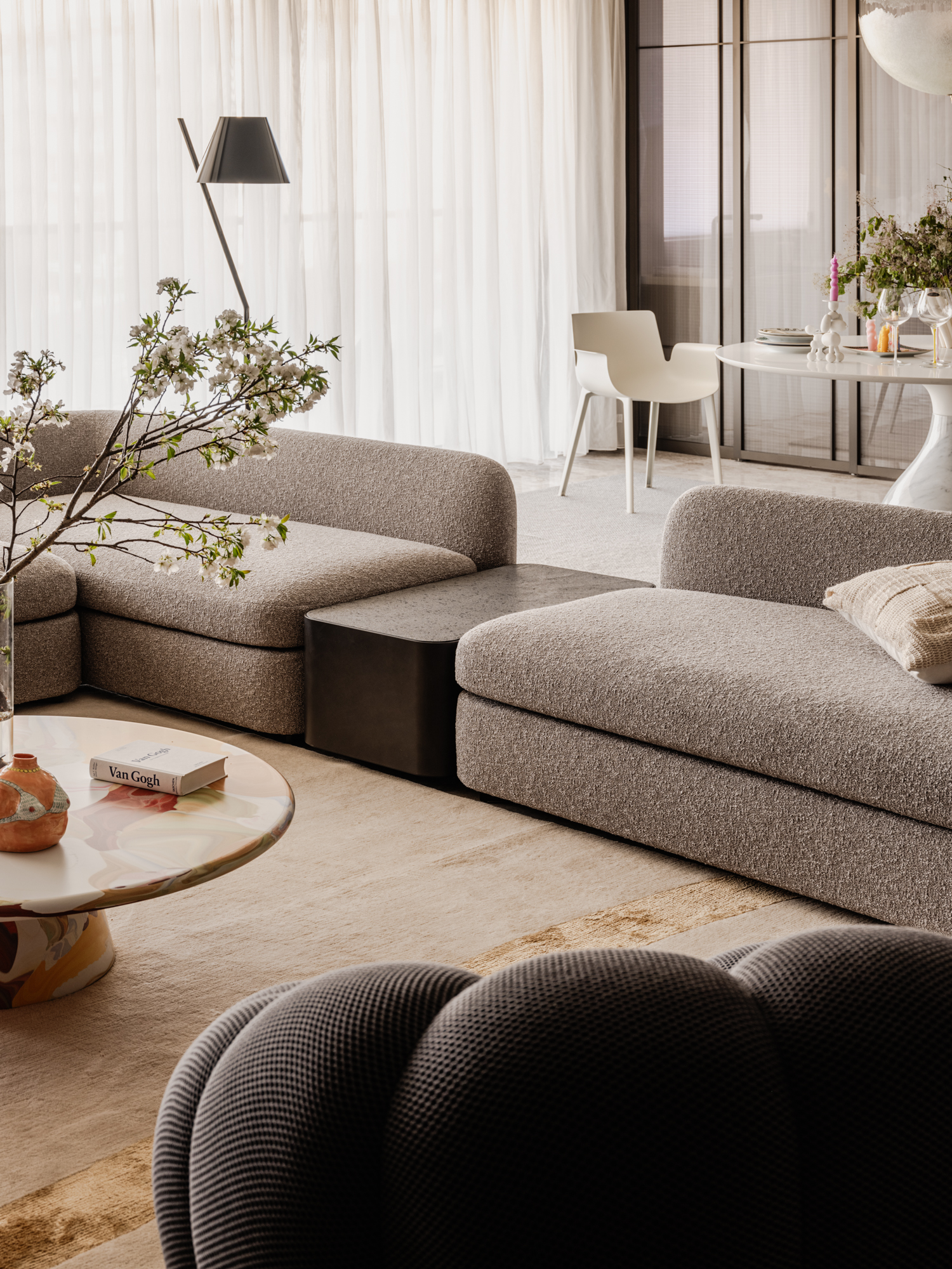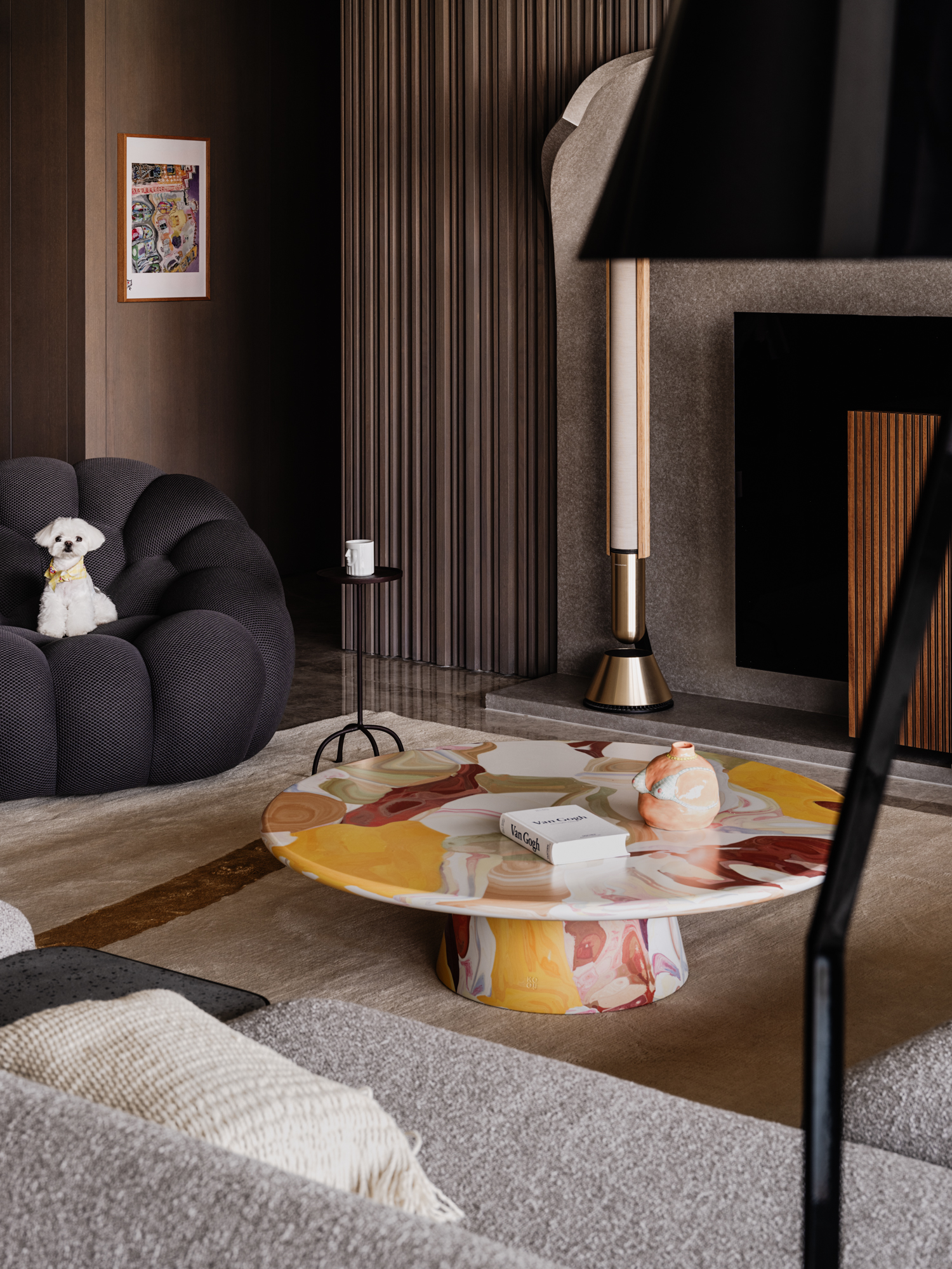 空间意境:客厅以素净灰色为主调,通过材质与光影重构层次感。拆除原始深色装饰,采用艺术漆与浅灰饰面,搭配石材地面与顶面质感漆,优化出风口并增设灯带,营造温馨氛围。