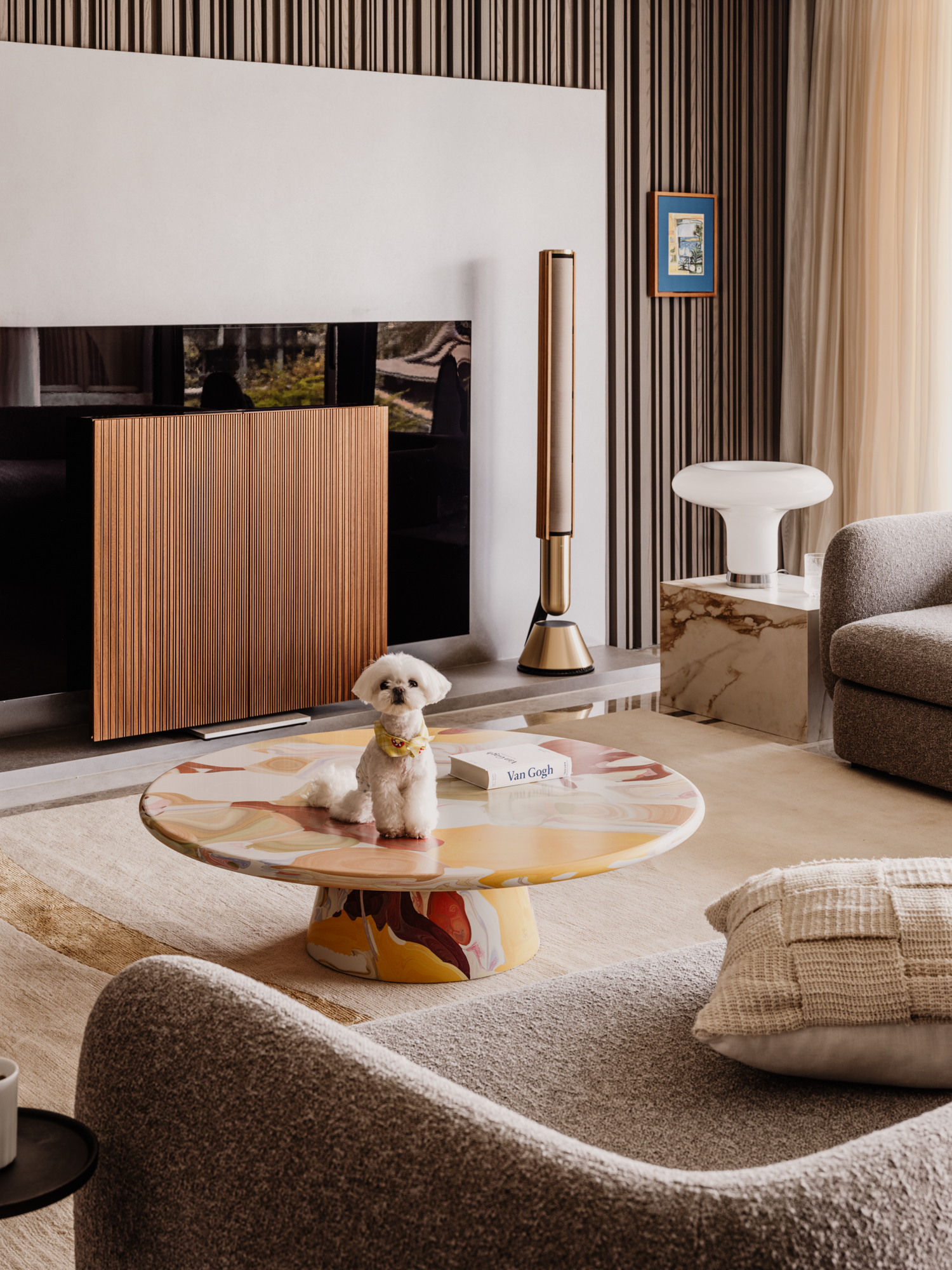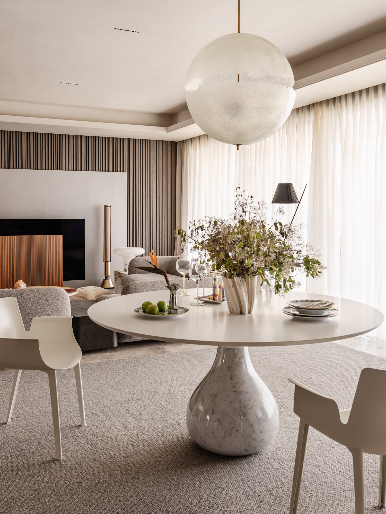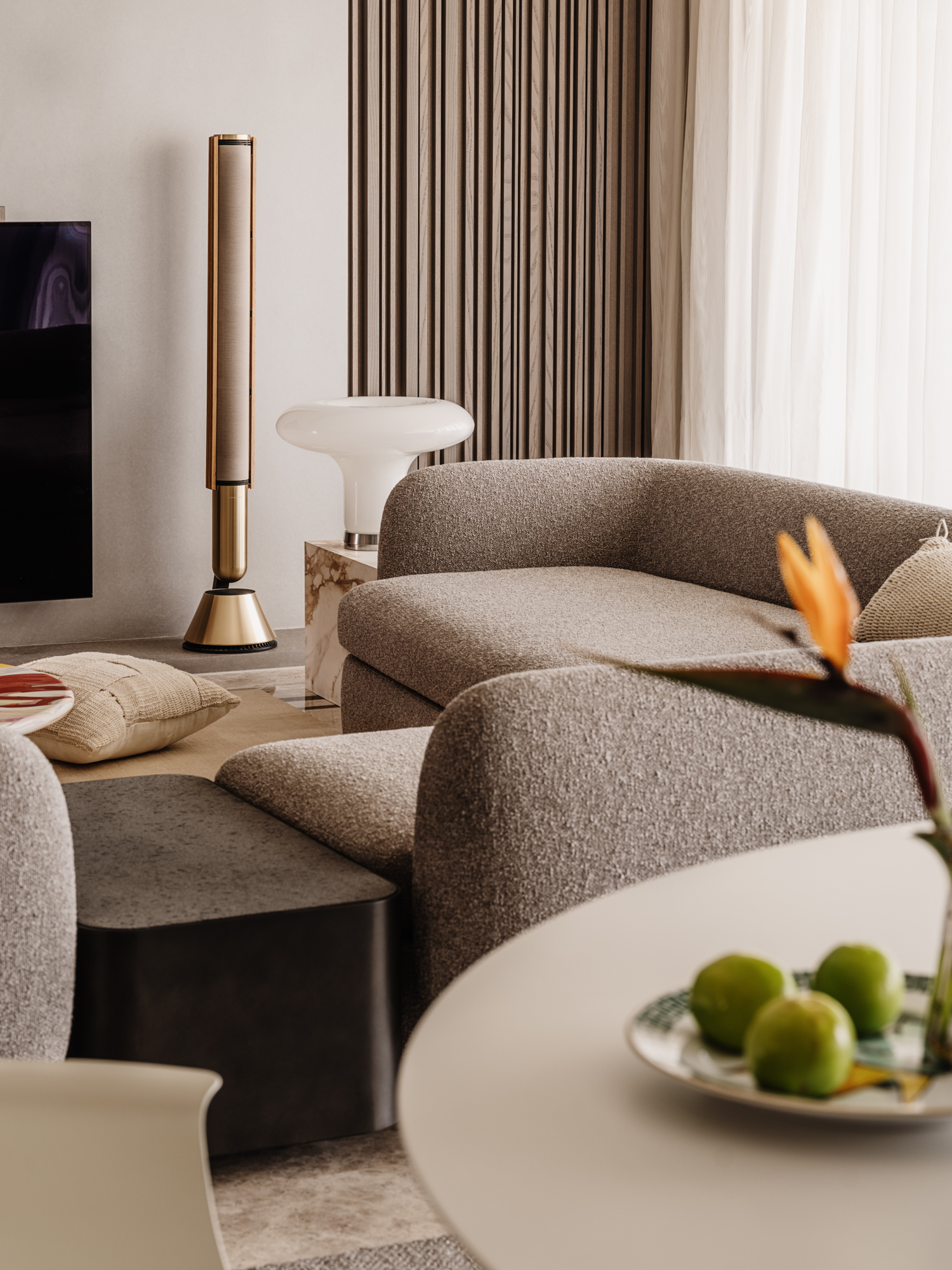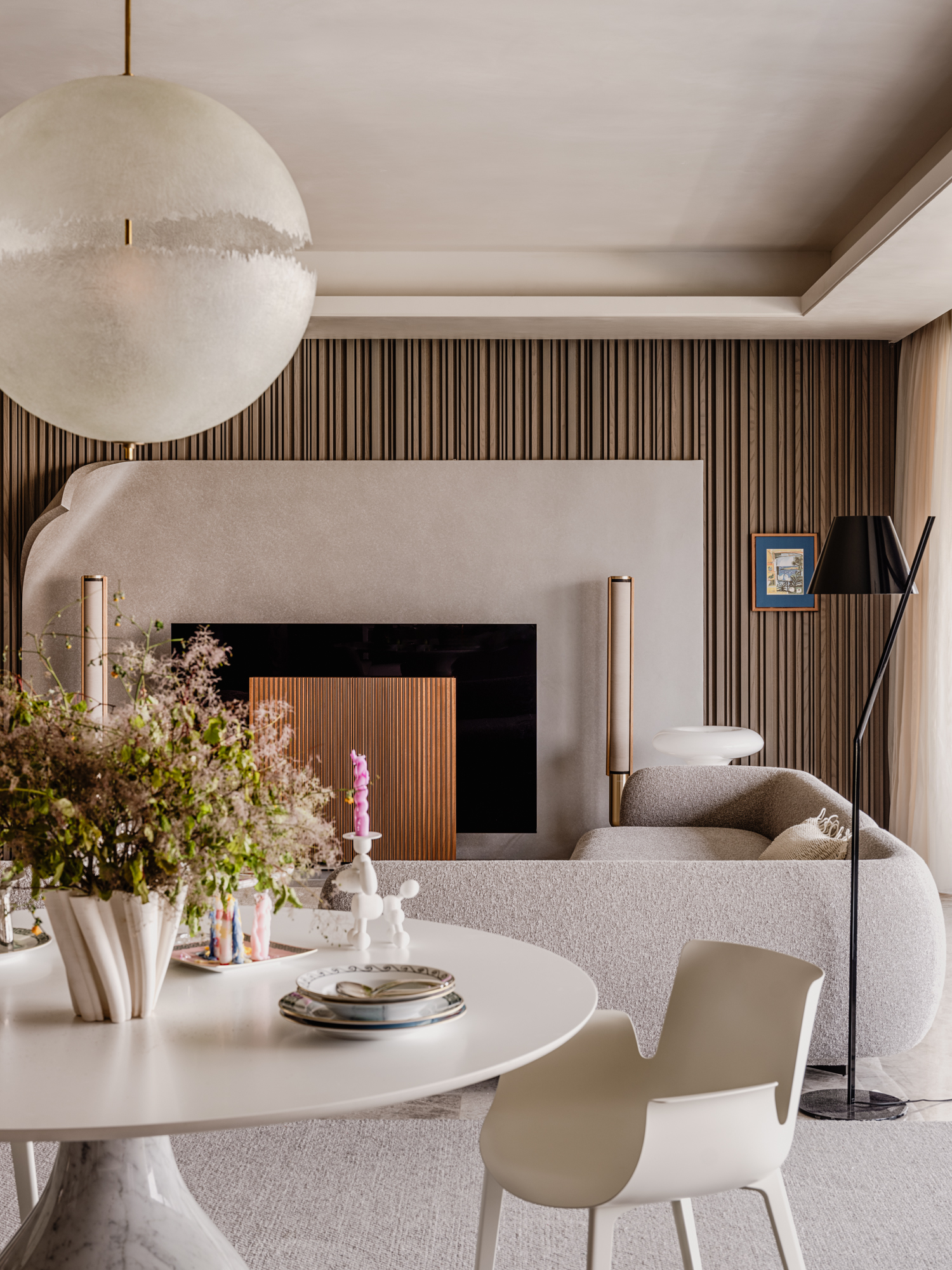 餐厨一体化设计:厨房强化隐蔽收纳保障整洁,餐厅以精致软装彰显美学,诠释“美与美食不可辜负”的理念。走道木饰面搭配灯光,延伸视觉并实现客餐厅自然过渡。