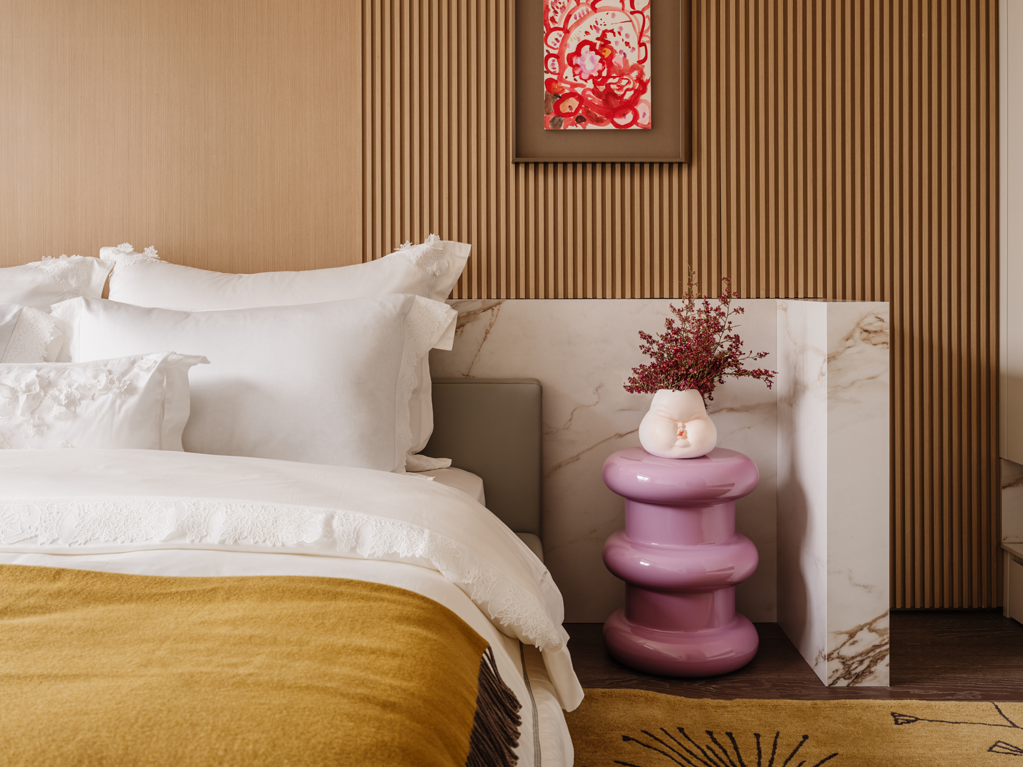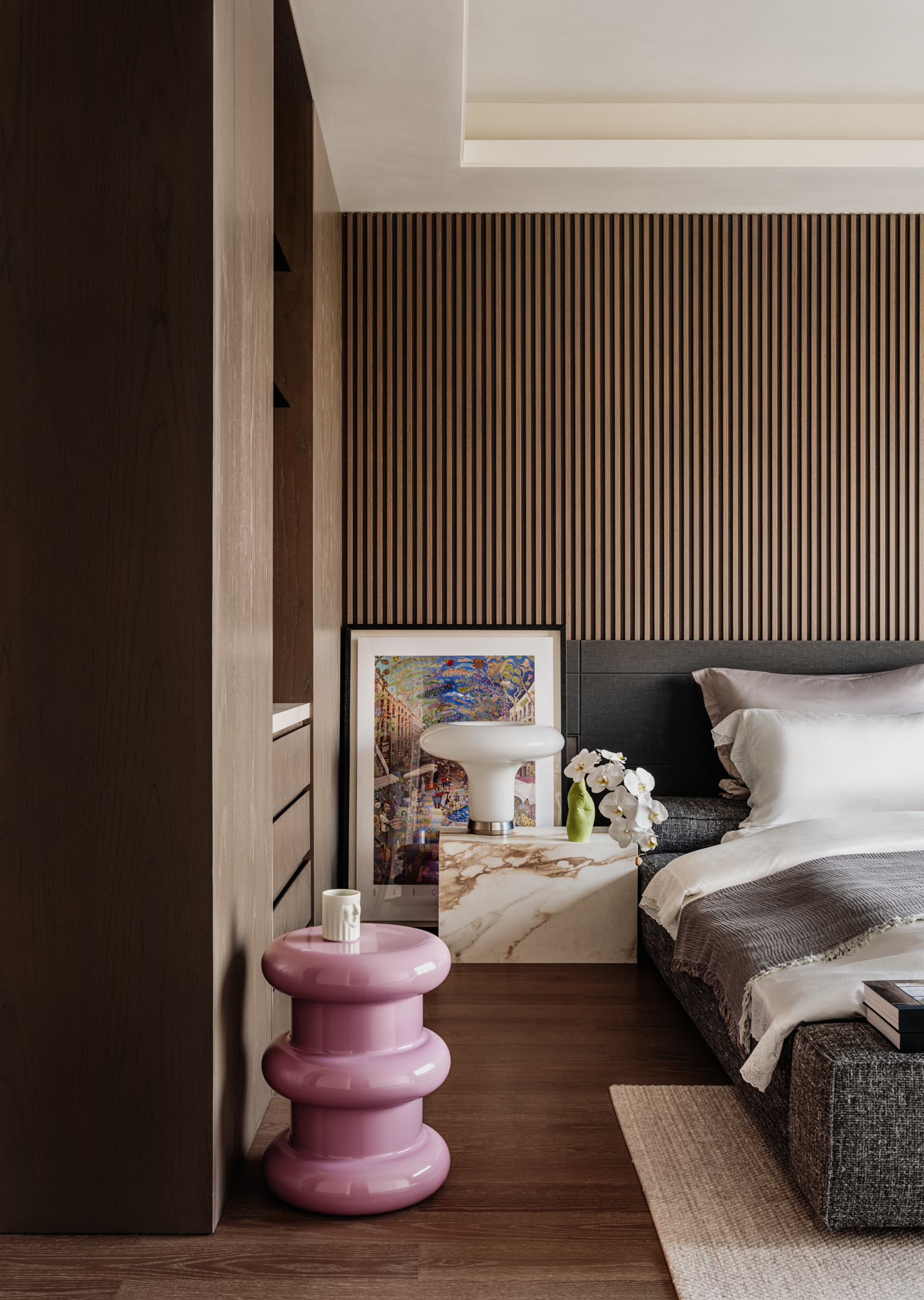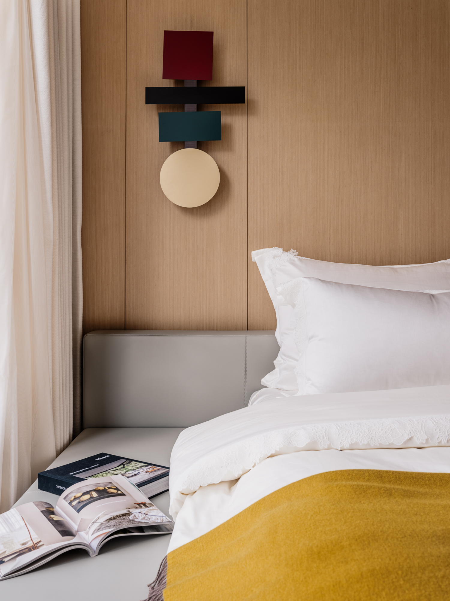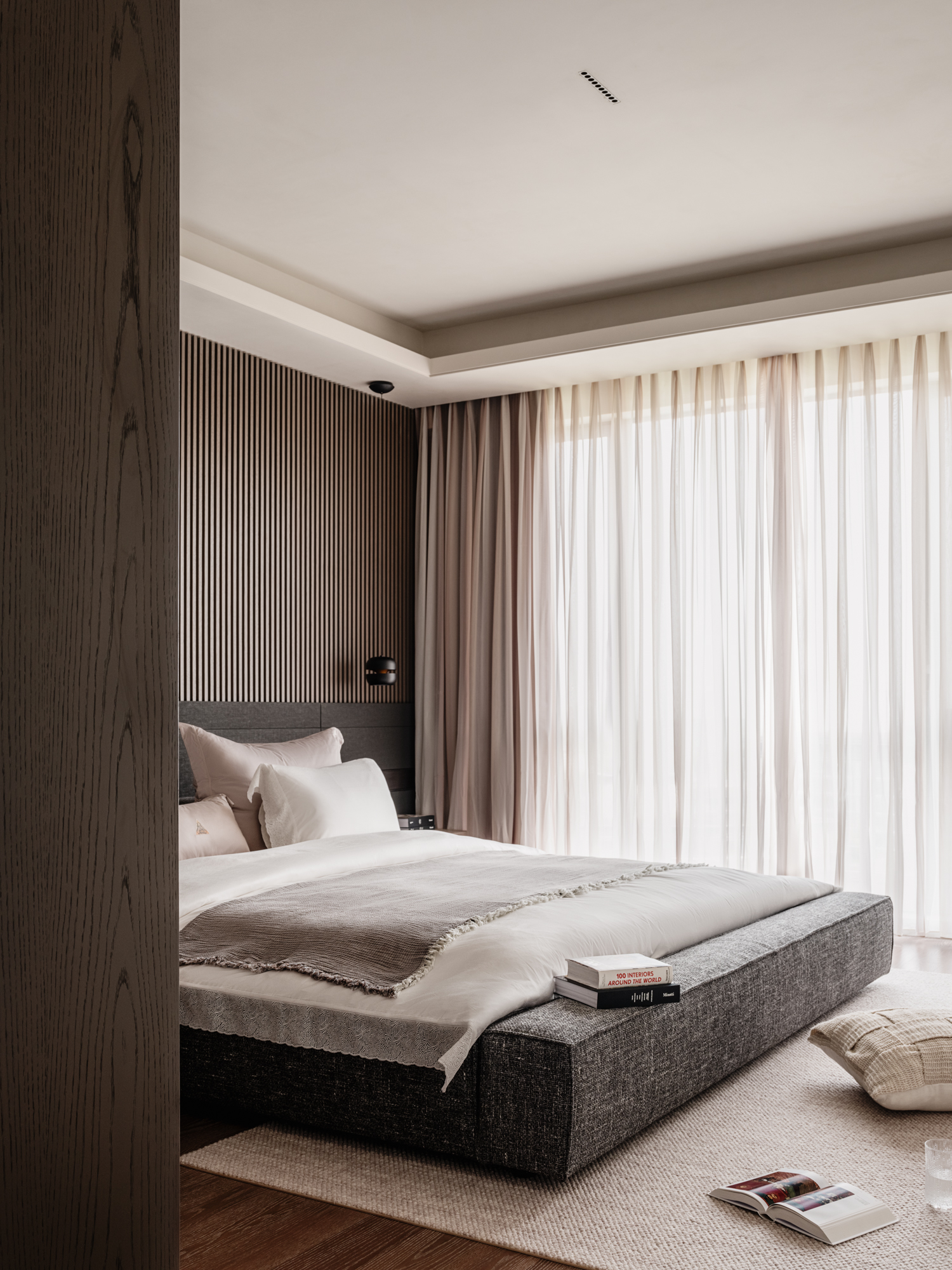 女儿房以简洁线条勾勒轮廓,光影沿入户衣帽间、地台、床体延伸至窗边壁灯,打造放松私密空间,关照居住者情感需求。