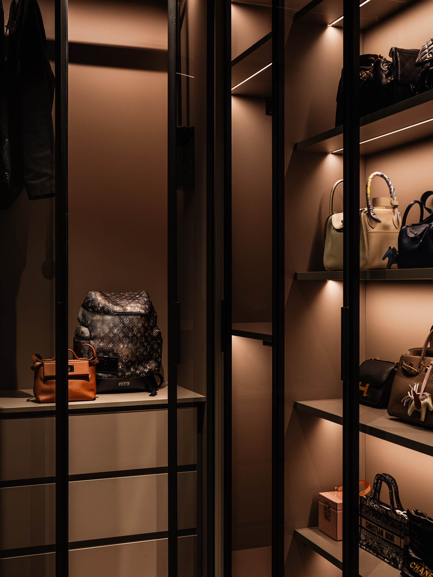 主卧套房微调墙体优化衣帽间动线,全屋统一色调材质,借原木、灰色与灯光营造静谧氛围。男女主人独立衣帽间采用黑橡木、开放置物架与深色玻璃,尽显深邃内敛气质。