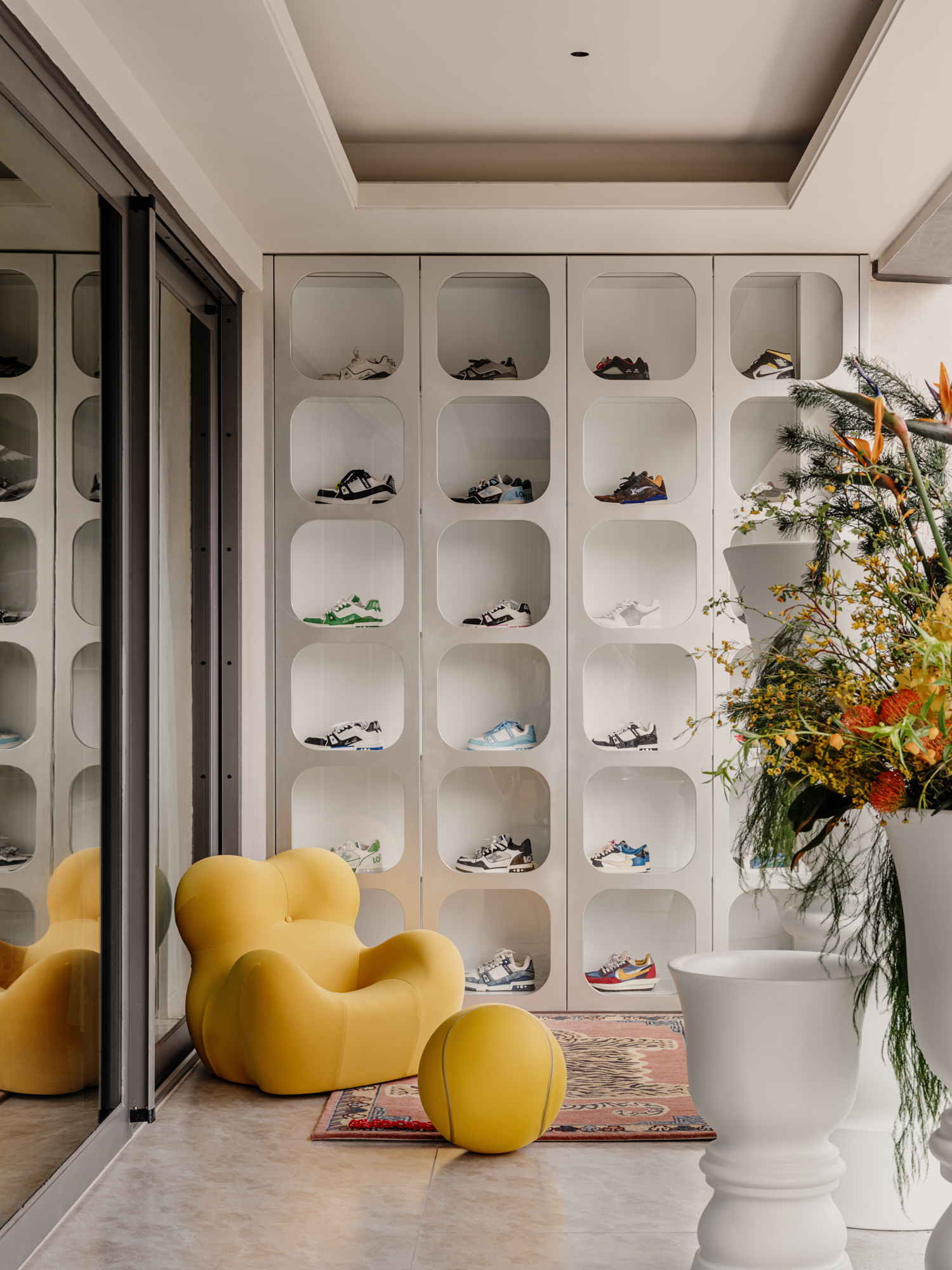 阳台保留并改造为健身与收藏展示复合空间,作为室内外自然纽带。大面积落地窗可赏圆弧花台与湖景,打破传统精装房阳台功能局限。