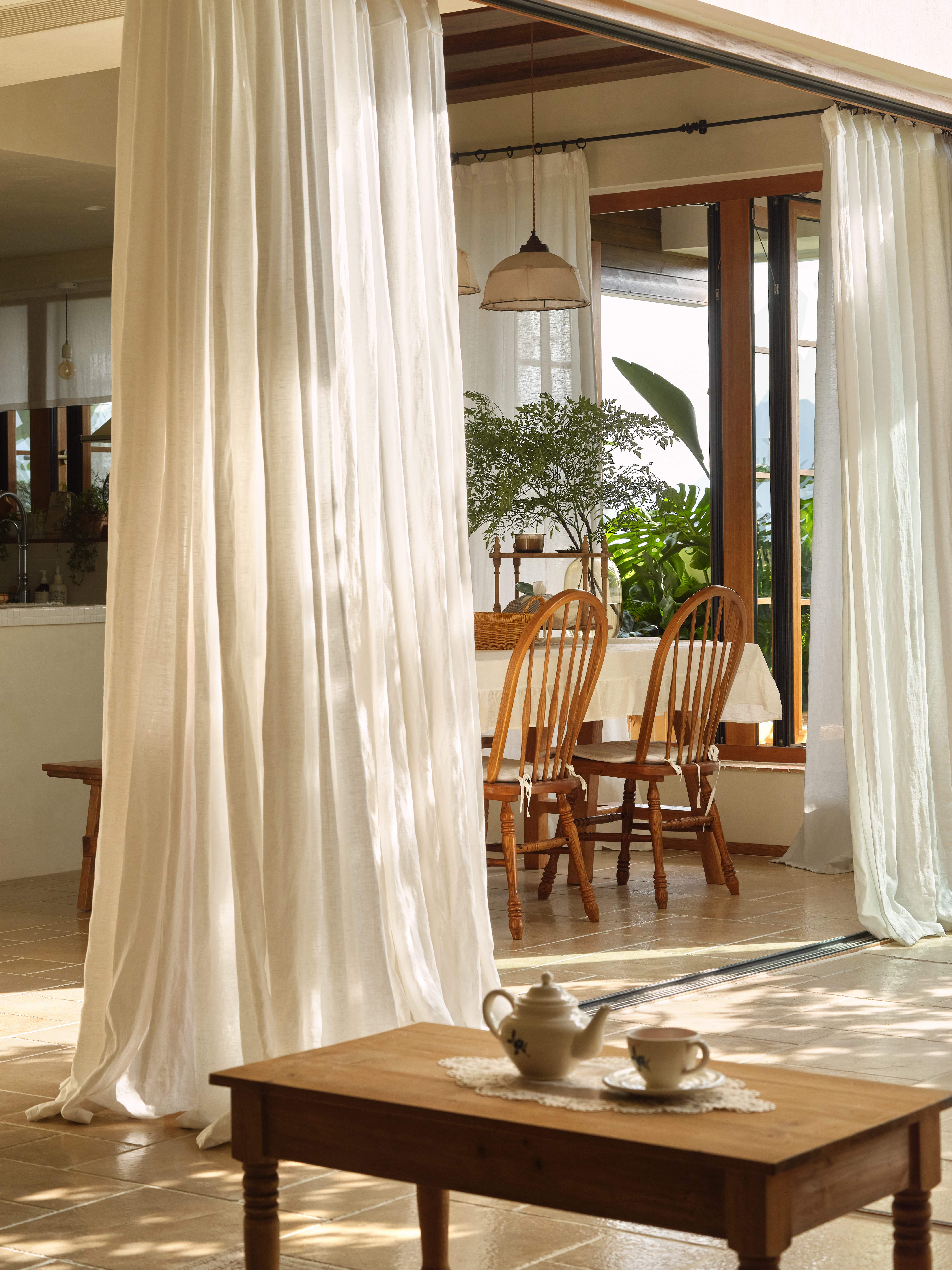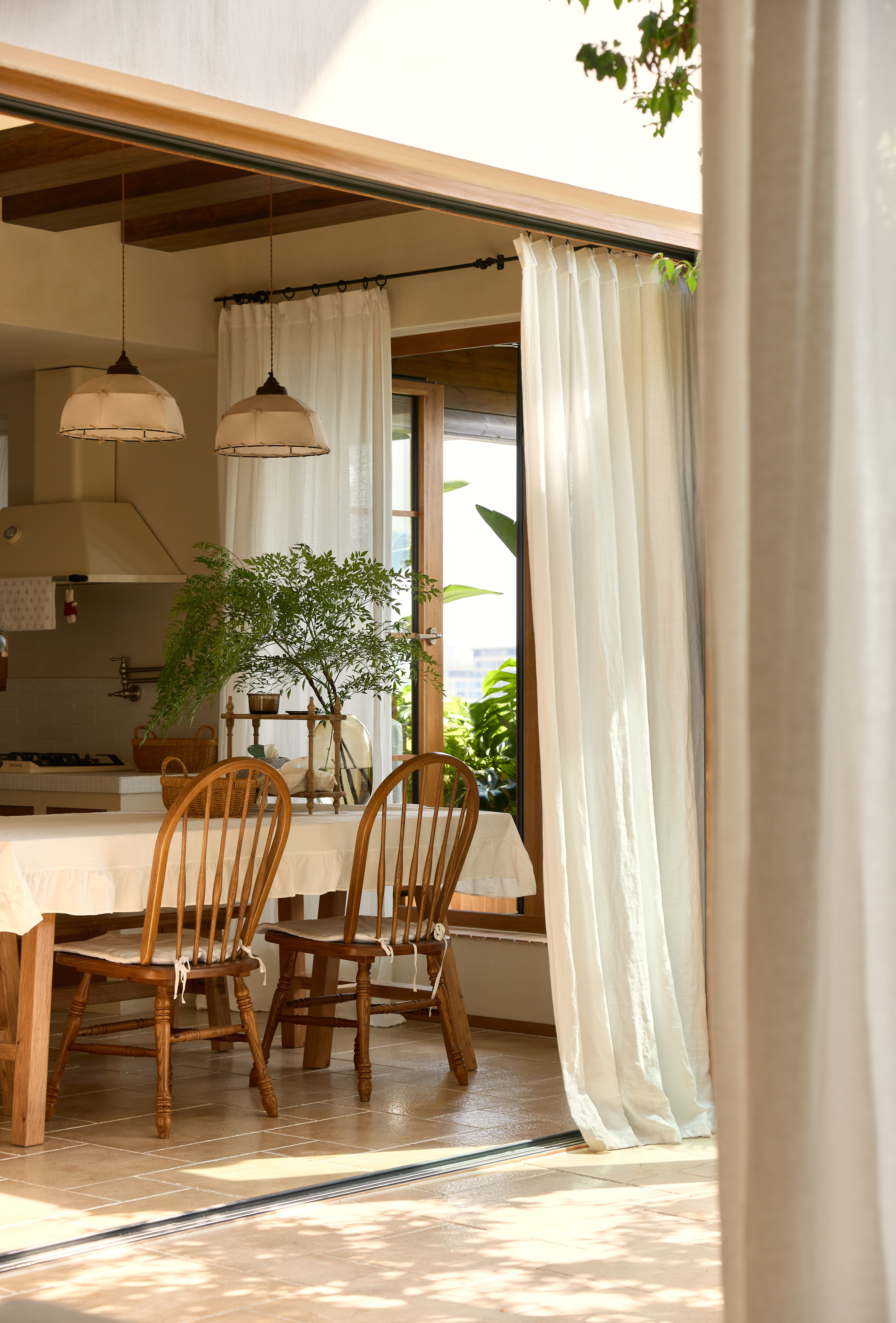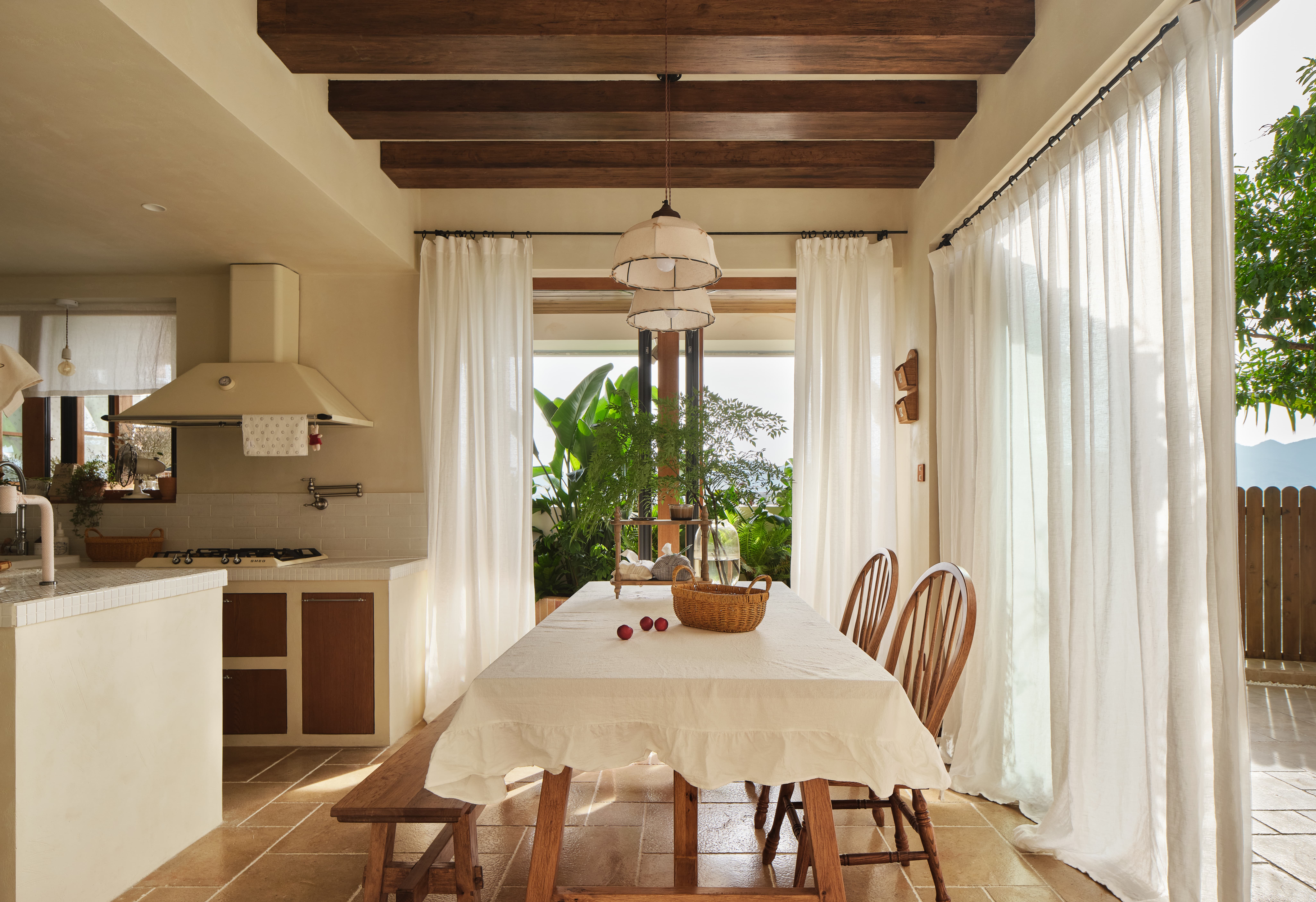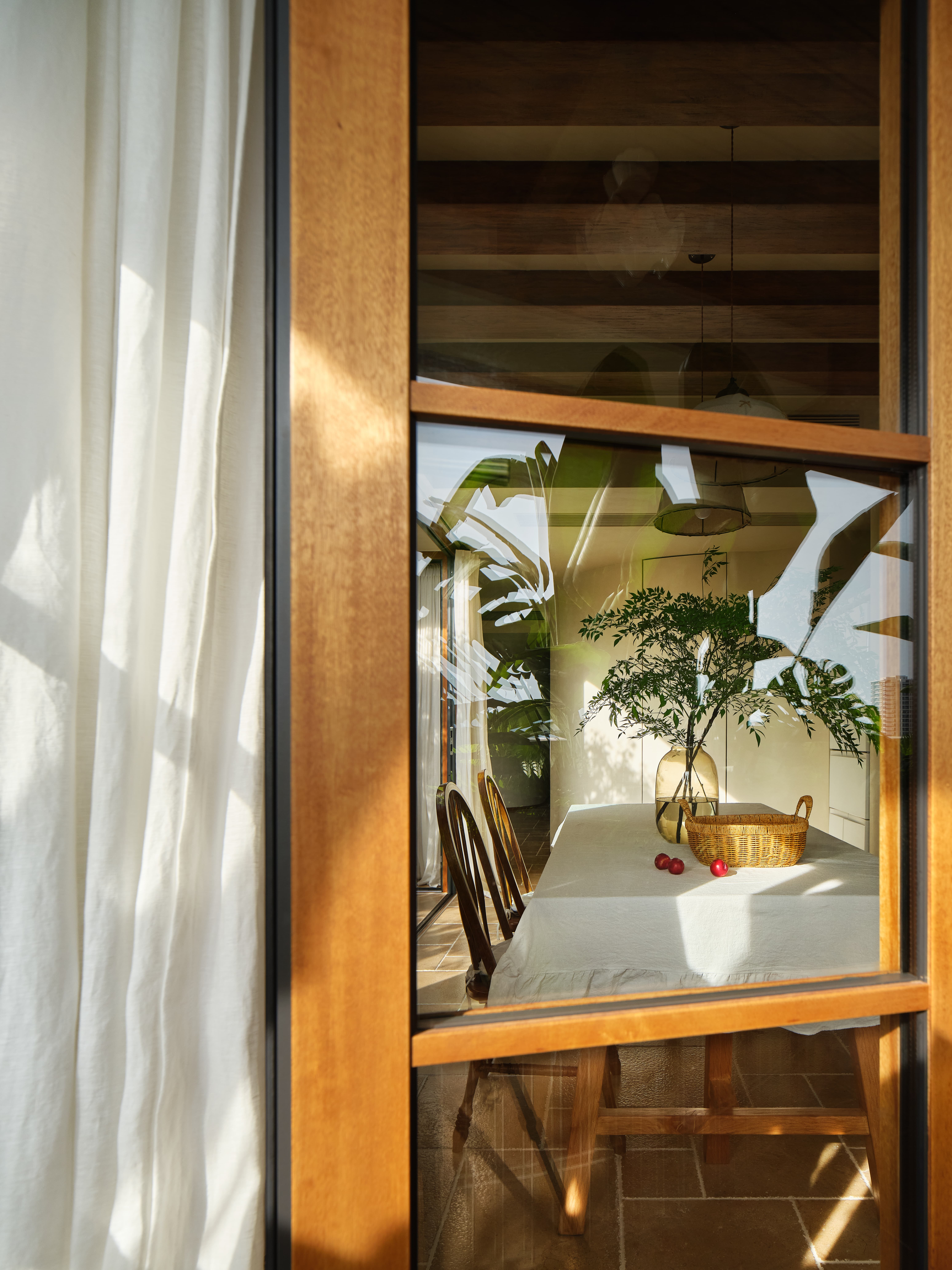 餐厅是家里最浪漫的剧场。当折叠玻璃门完全推开时,室内外的界限被温柔打破,庭院的风裹挟着石榴花的芬芳款款而来,餐桌仿佛就摆在树冠之下。初夏的傍晚,一家三口在这里享用晚餐,抬头便能看见石榴树新生的嫩叶在暮色中轻轻摇曳;冬天的早晨,阳光穿过疏朗的枝桠,在咖啡杯里投下细碎的金色光点,为早餐增添一份自然的调味。