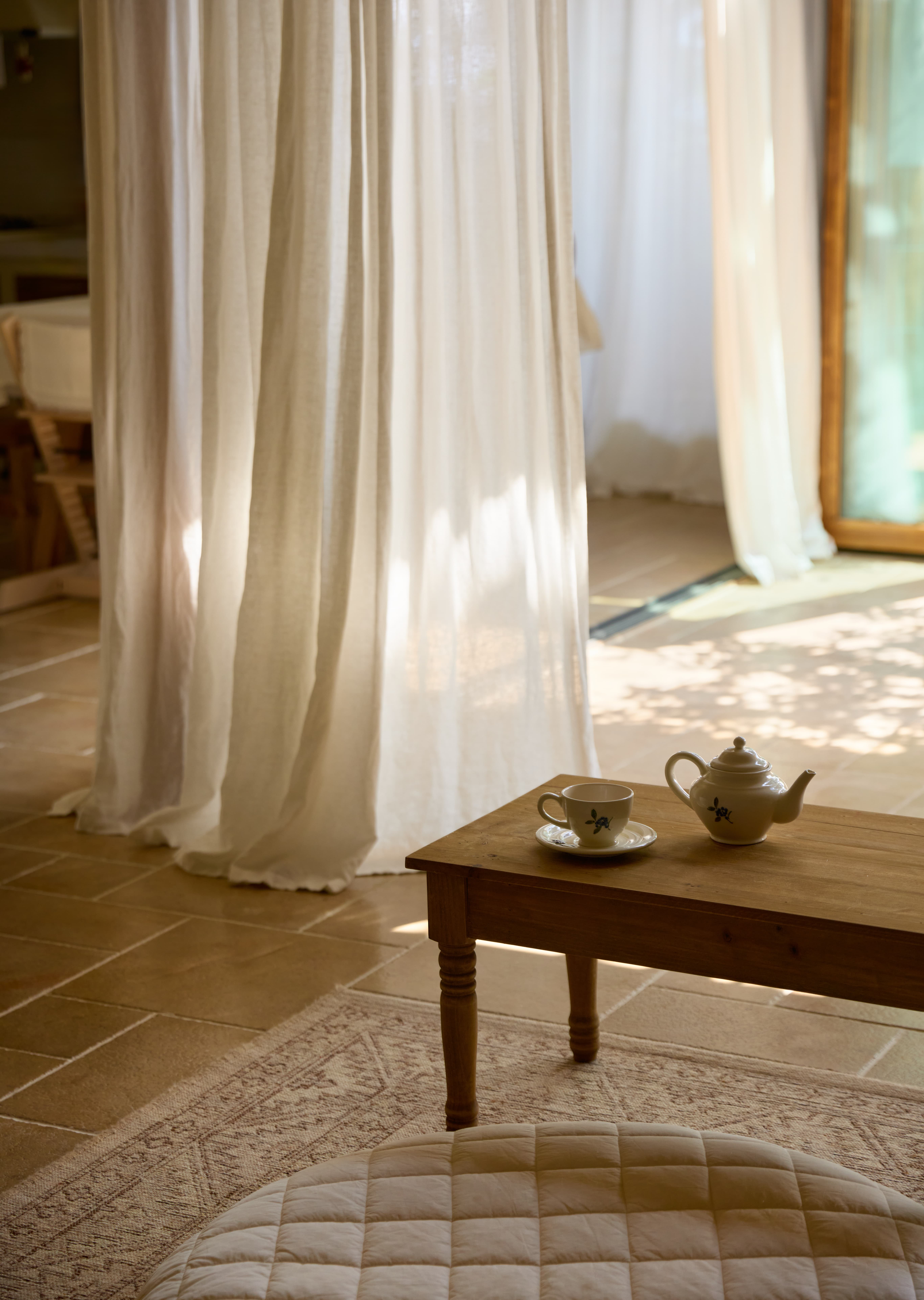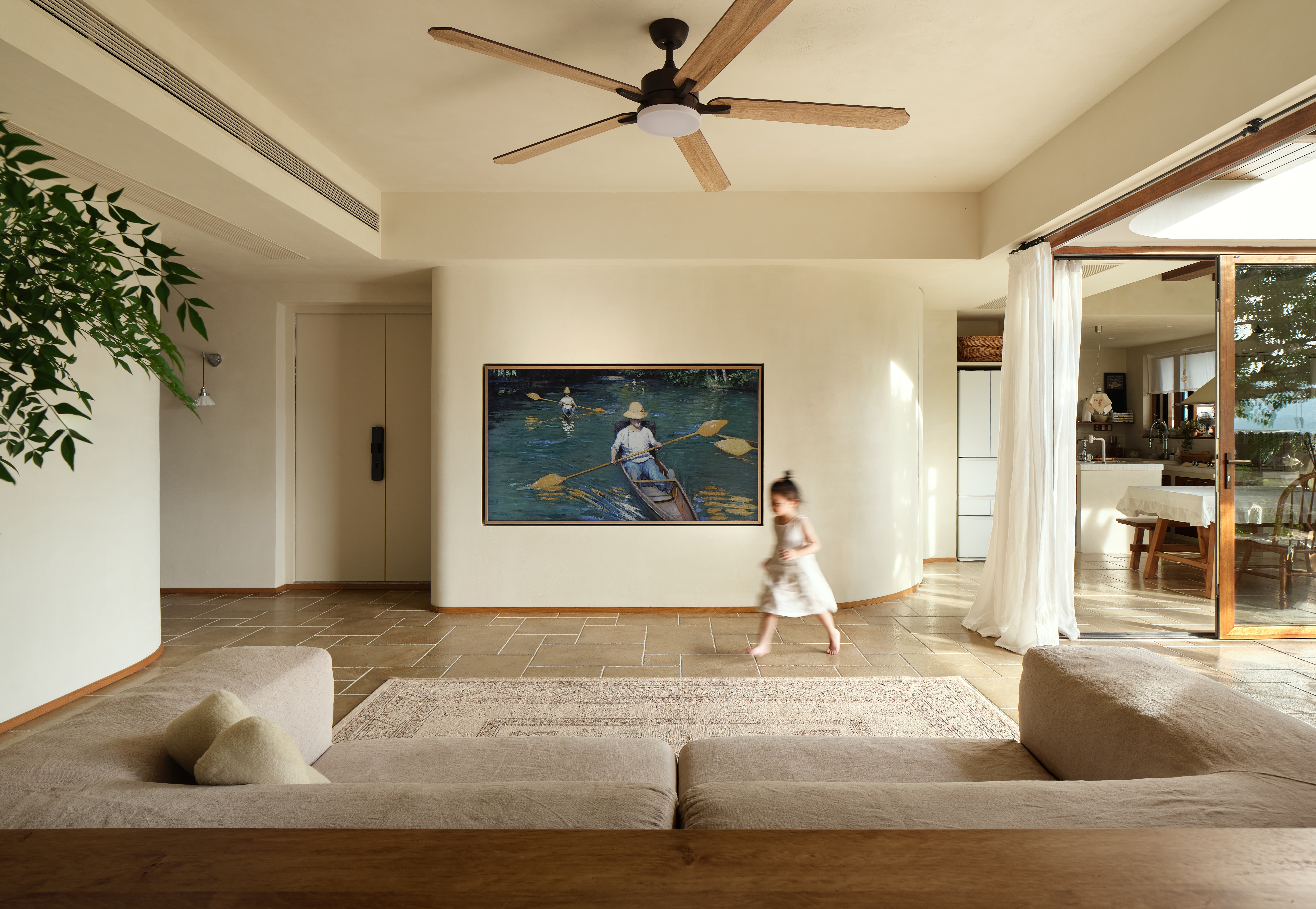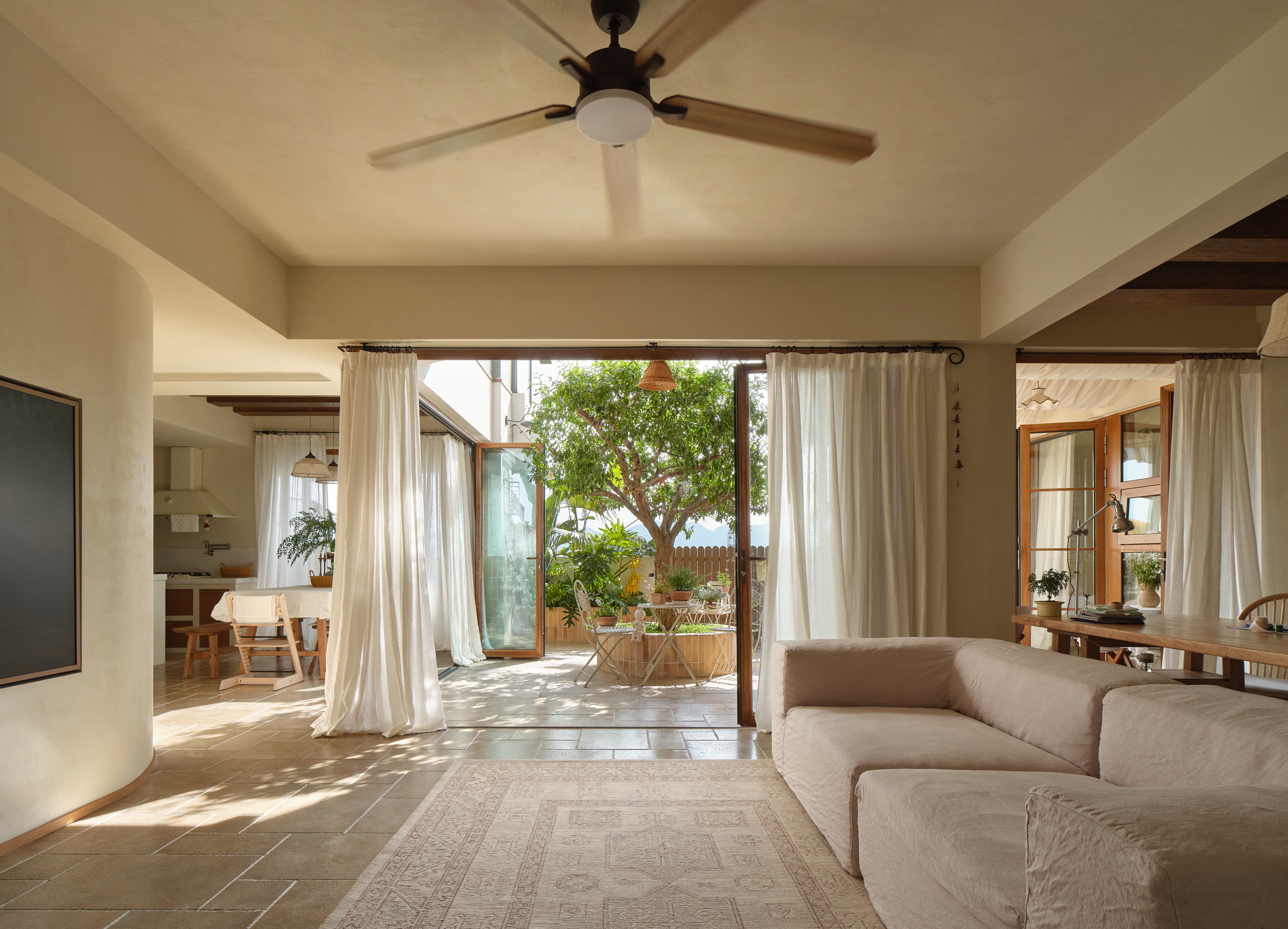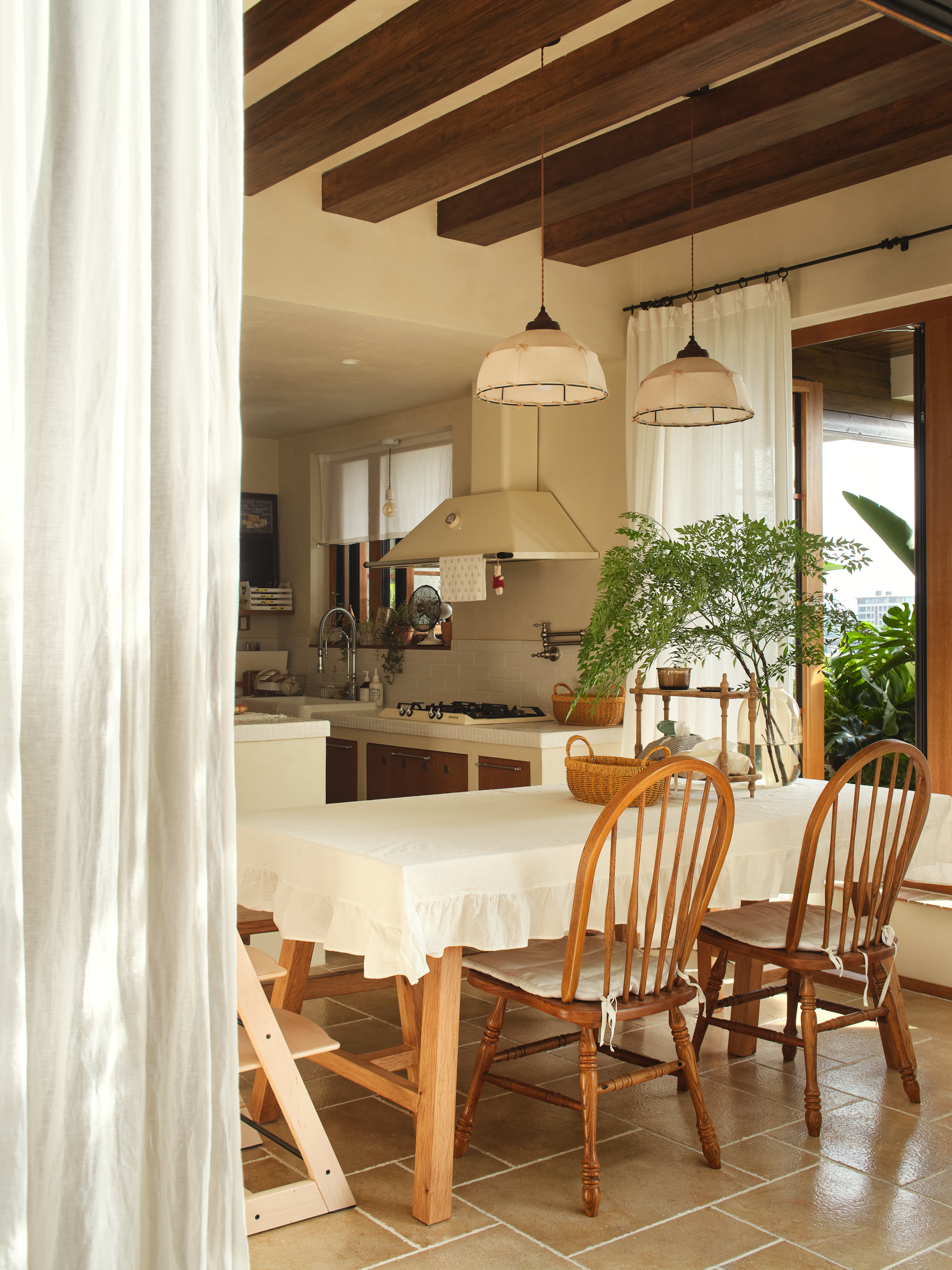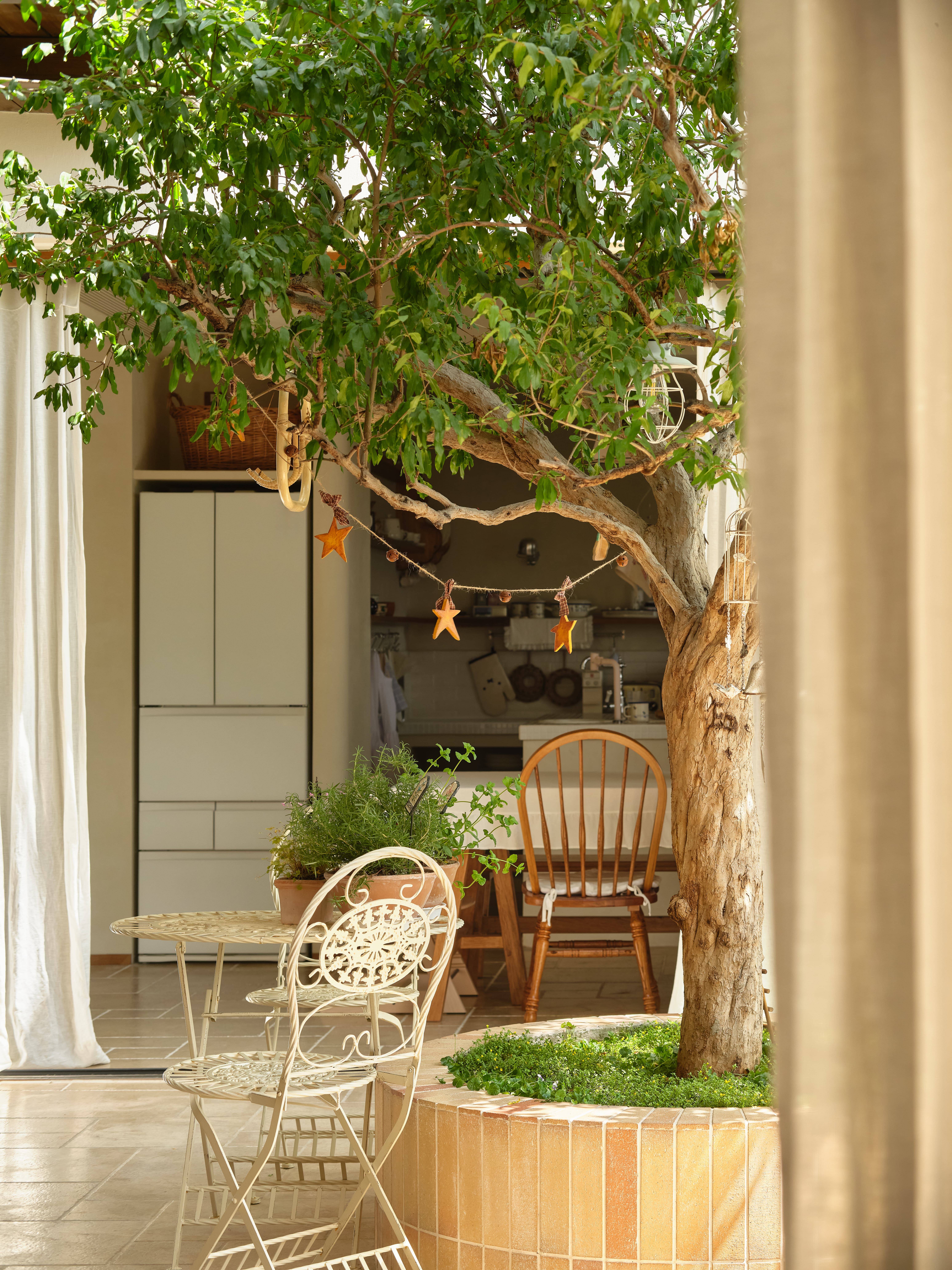 餐厅是家里最浪漫的剧场。当折叠玻璃门完全推开时,室内外的界限被温柔打破,庭院的风裹挟着石榴花的芬芳款款而来,餐桌仿佛就摆在树冠之下。初夏的傍晚,一家三口在这里享用晚餐,抬头便能看见石榴树新生的嫩叶在暮色中轻轻摇曳;冬天的早晨,阳光穿过疏朗的枝桠,在咖啡杯里投下细碎的金色光点,为早餐增添一份自然的调味。
