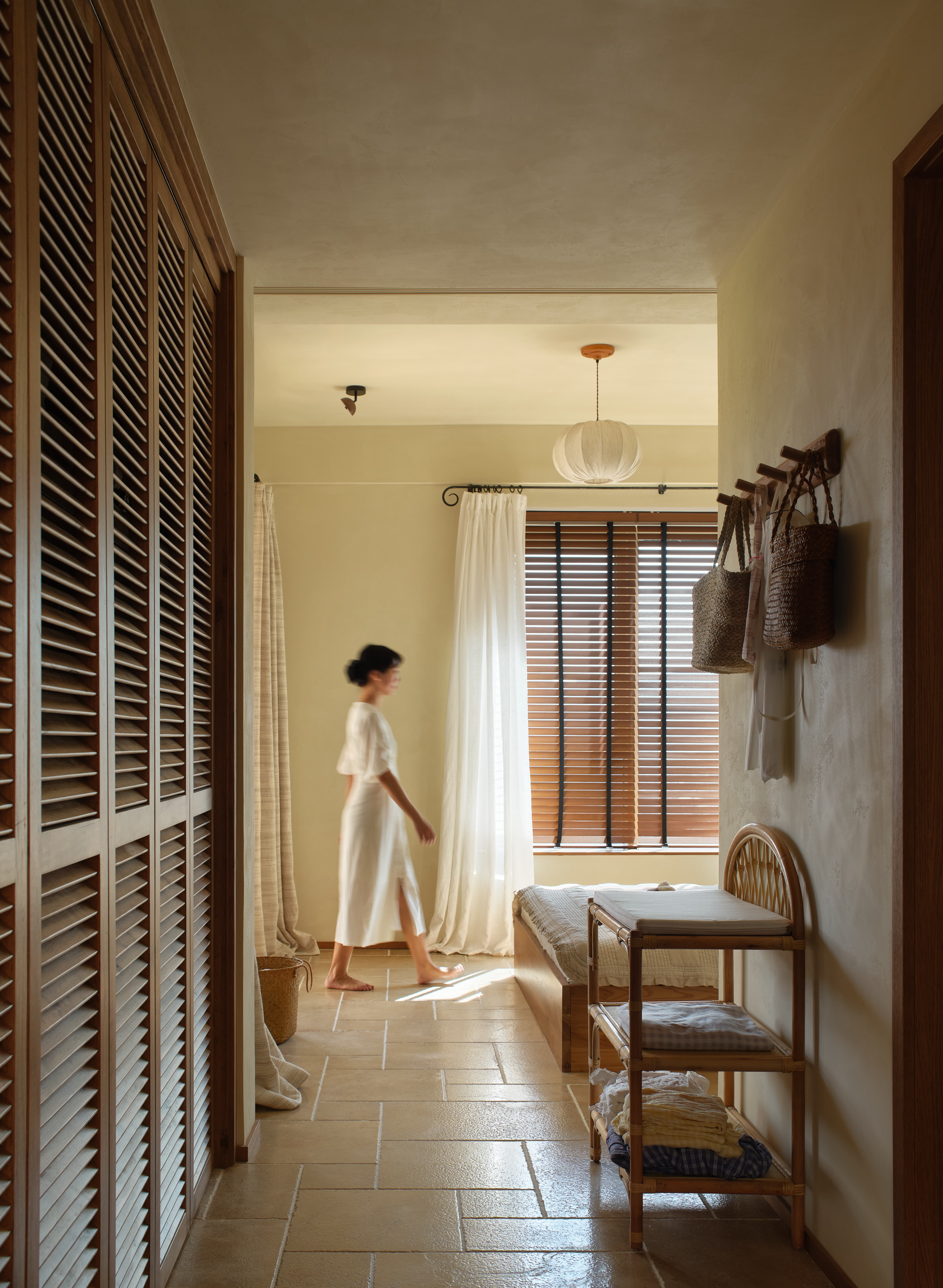 推开双扇木门,是一条宽阔的过道,左侧的衣柜收纳着四季的衣物,也收纳着夫妻俩的日常。主卧的床正对着花园,每天清晨,第一缕阳光都会透过石榴树的枝叶将苏醒的问候送入房间。玻璃门外的庭院里,一张铁艺长椅静静守候,夜晚时分,躺在这里可以看见星光穿过树叶的缝隙,像散落的钻石缀满夜空。这条精心设计的回游动线,宛如一条温柔的时光隧道,将私密空间与自然美景完美串联。