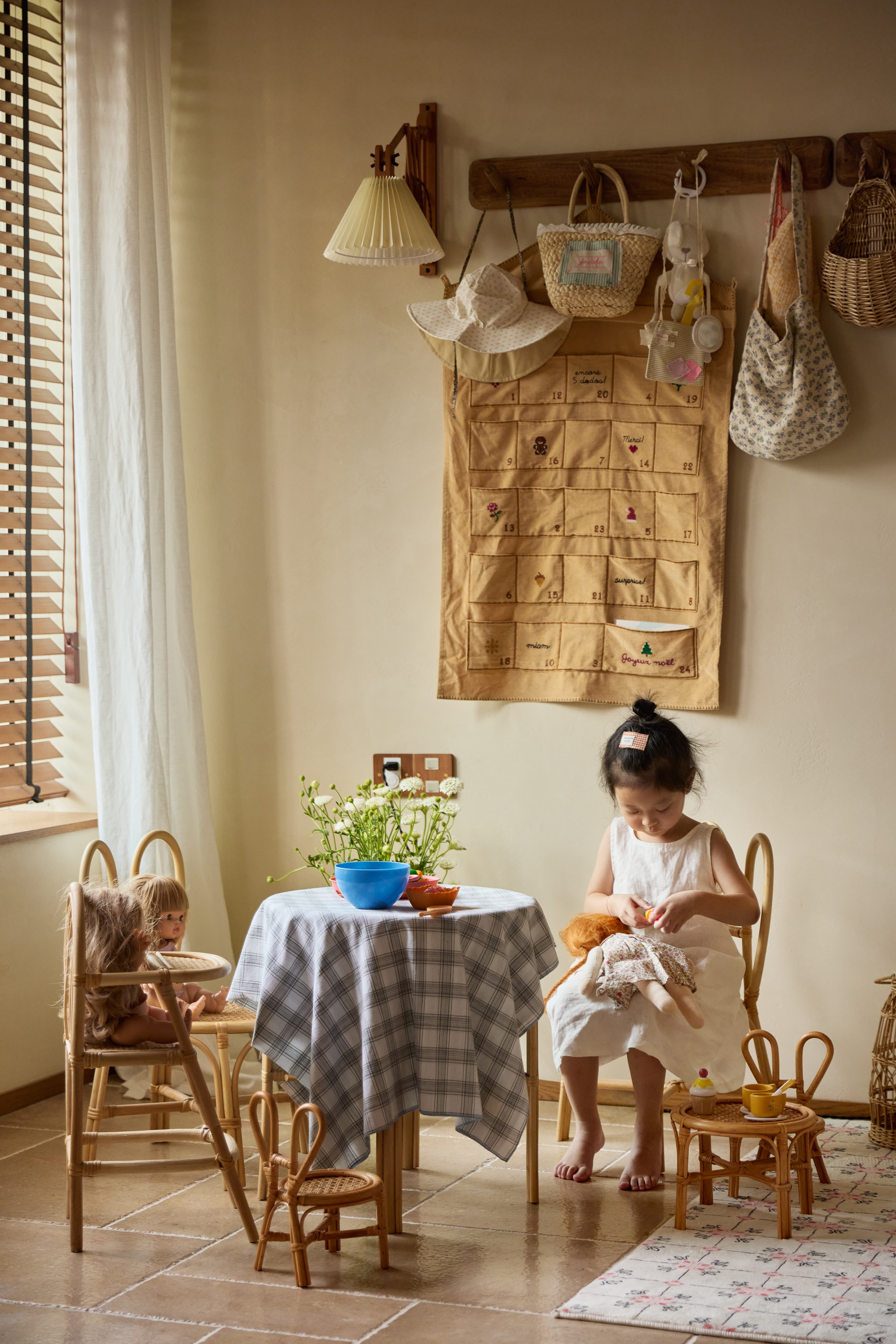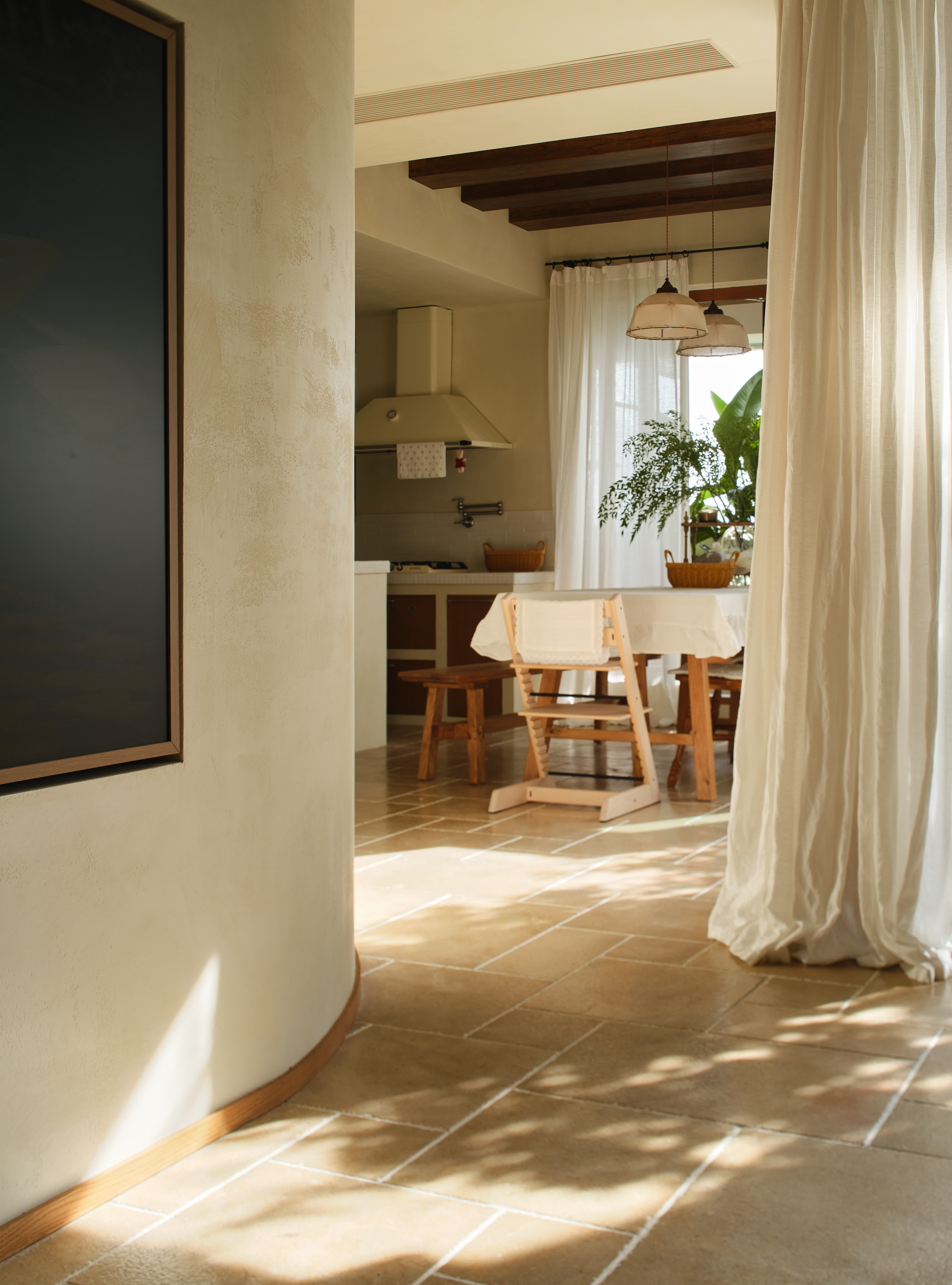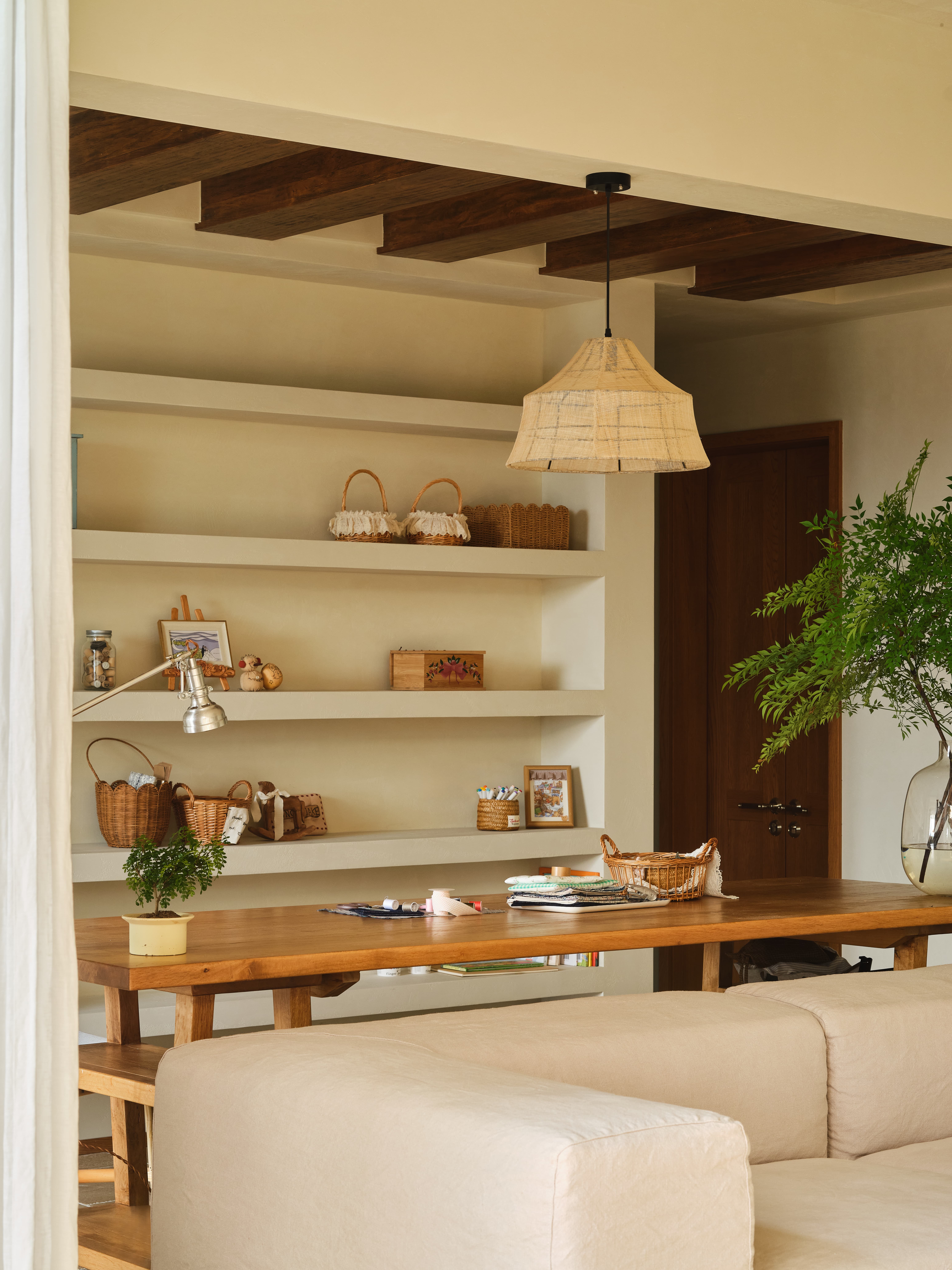 客厅不只是一家人相聚的地方,更是一本摊开的家庭相册。一整面通顶的书墙,下层摆满女儿的童话绘本和彩色积木,上层陈列着女主人从世界各地淘来的礼物以及自己的手工作品。宽大的原木长桌,既是女主人伏案工作的地方,也是母女俩做手工的画布。西面的阳光穿过石榴树的枝桠,在客厅墙上投下斑驳的树影,宛如一场光影的芭蕾。