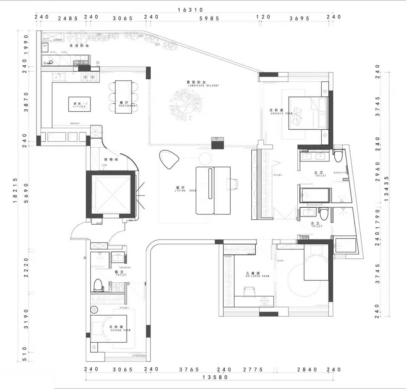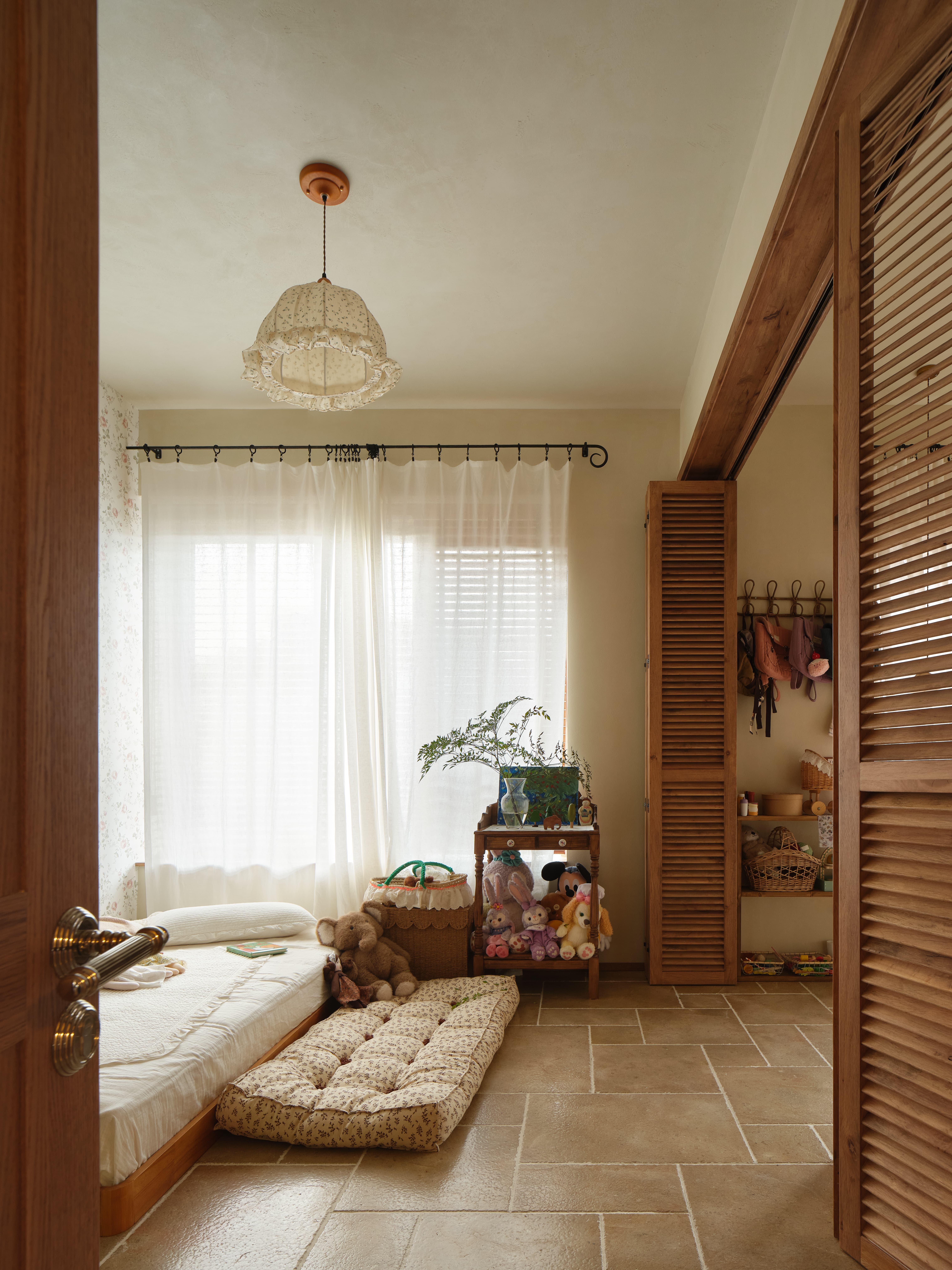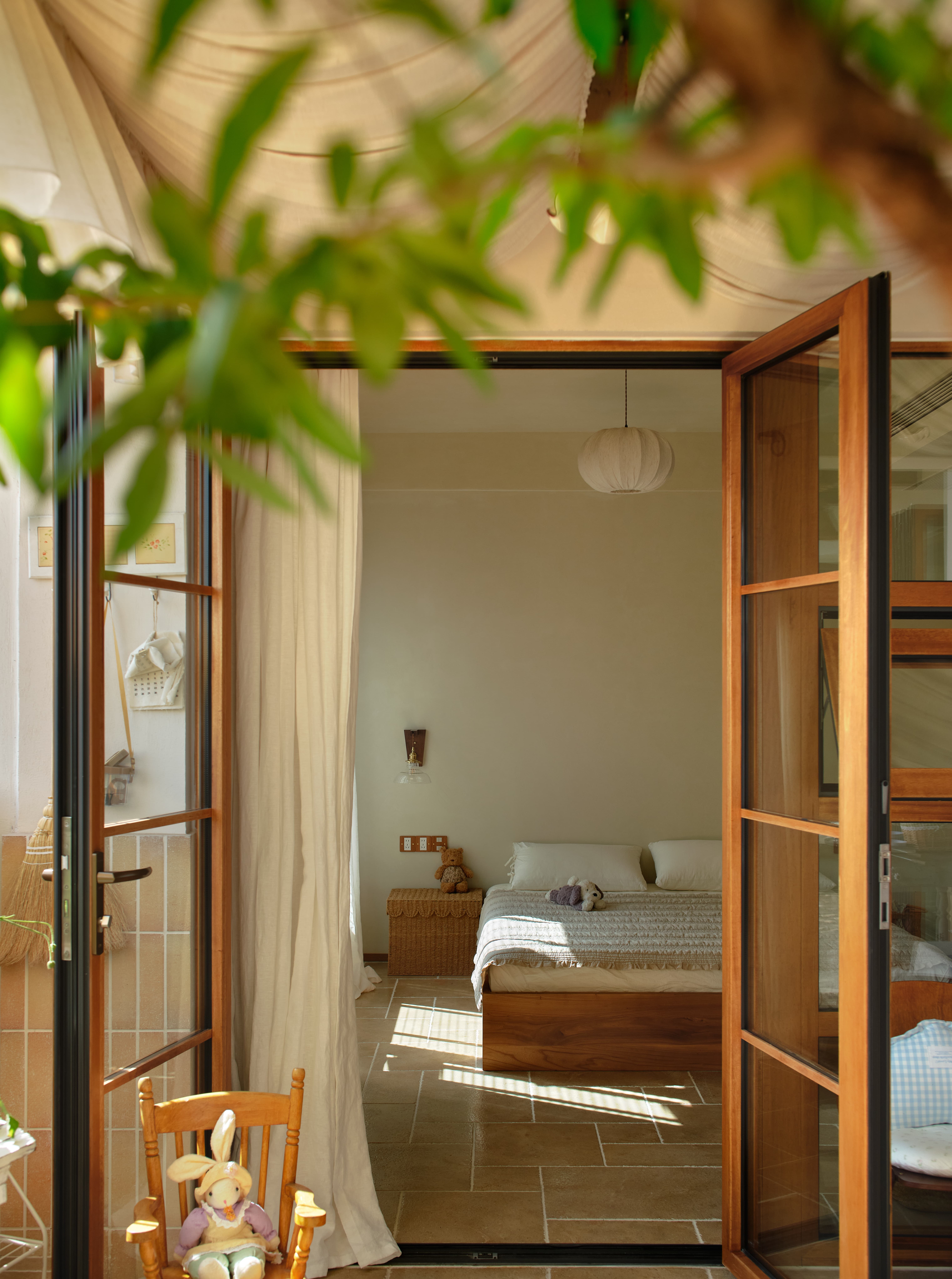 女儿的天地被分成两半——一边是睡眠的港湾,低矮的木床上堆着各种毛绒玩具;另一边是想象力的游乐场,地上散落着彩笔和拼图。两个房间以折叠木门连接,开合之间创造不同的空间体验,就像一本立体故事书,随着小主人的成长不断翻新篇章。石榴树:家的记忆锚点 -