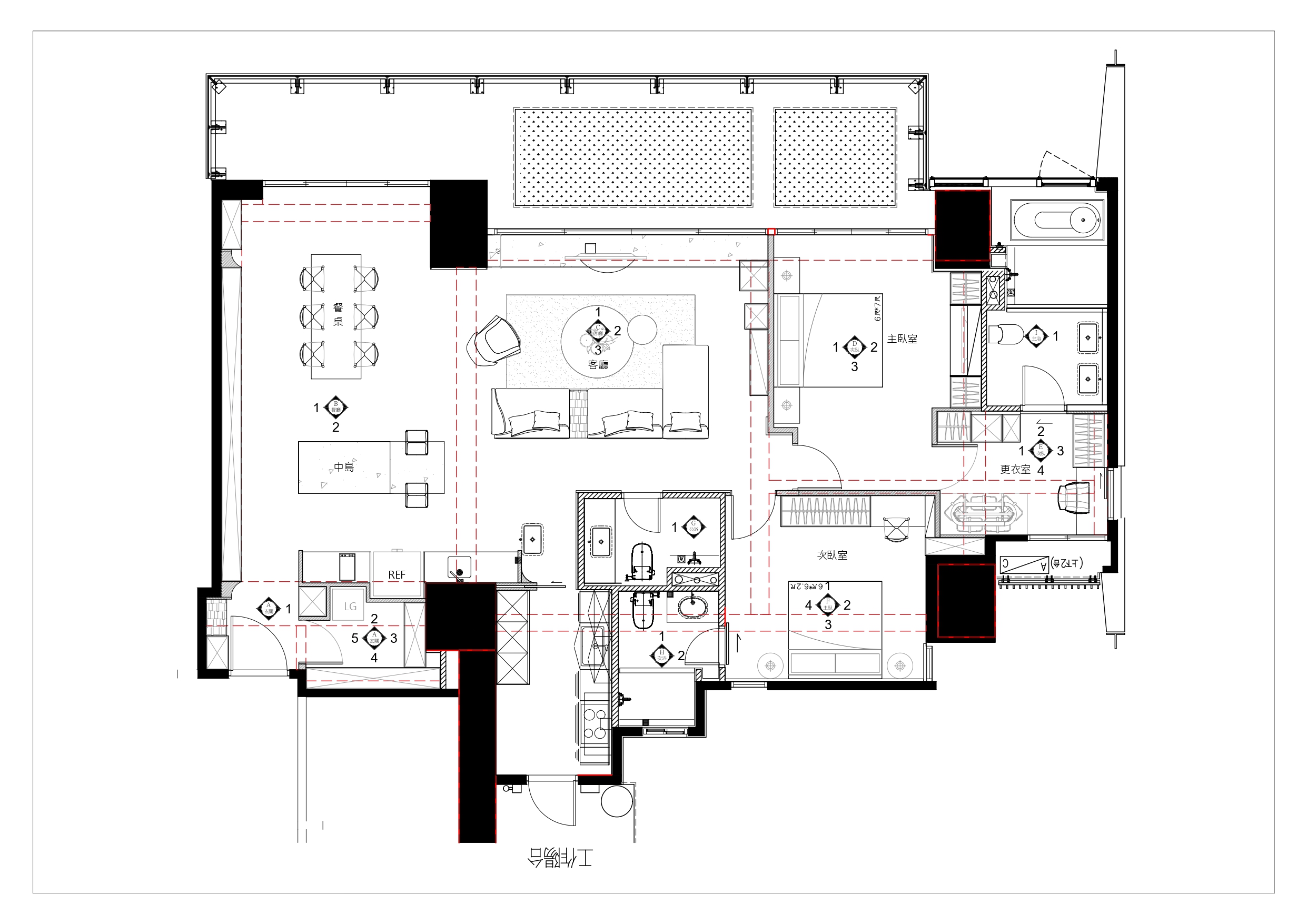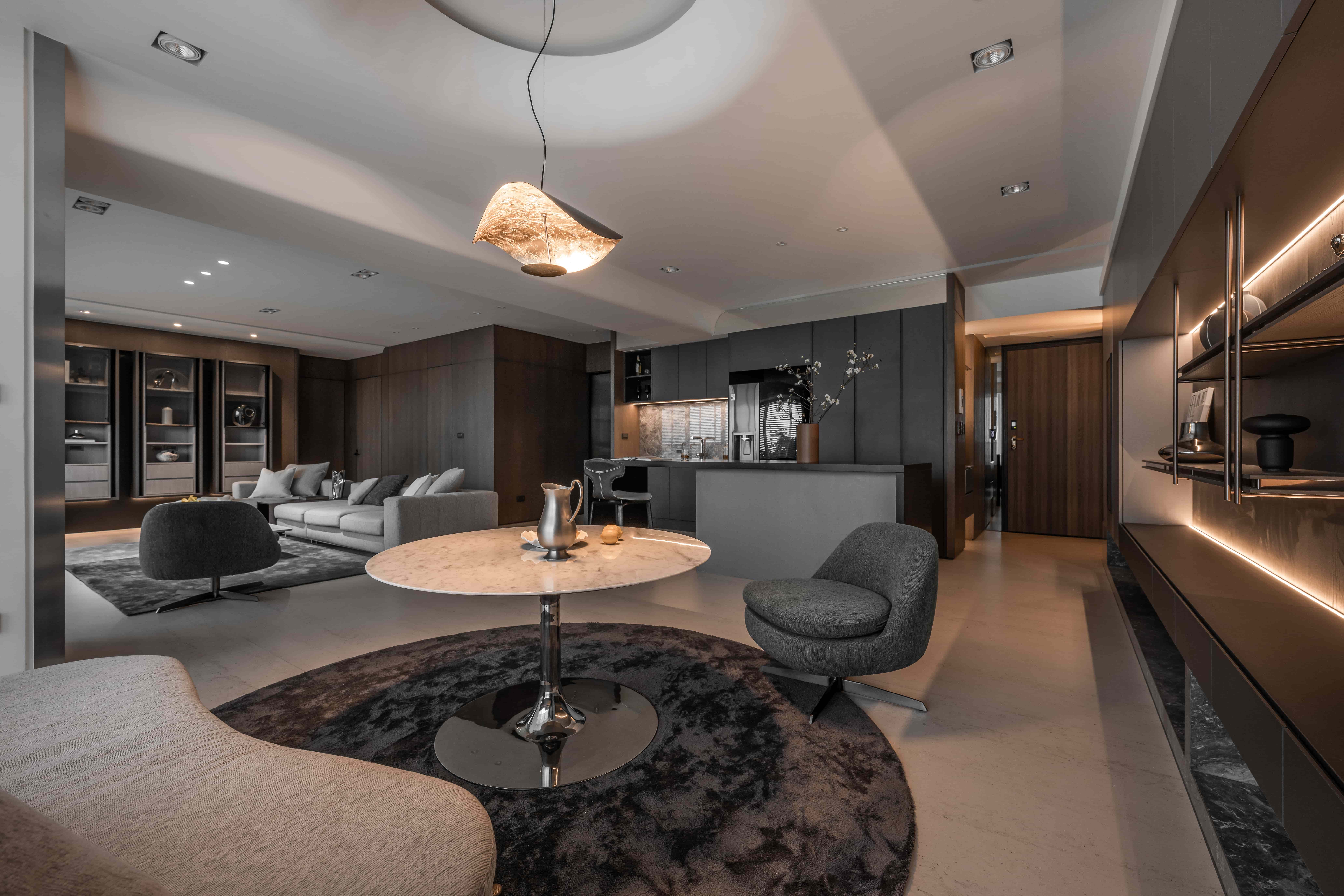 空间布局:佈局上大膽打破了住宅常見的區域框架,實現了空間的「自由呼吸」。我們決然摒棄了傳統以電視牆為中心的客廳格局,將空間的主權重新賦予窗外的港灣景致,改以一座具備高度穿透感的造型櫃體定義中軸。這座櫃體巧妙地區分了客餐廳的功能領域,卻保留了視覺的深度與空氣的流動性。這種開放式的軸線規劃,連結了採 Lounge 形式設計的開放式餐廚區,無方向性的中島配置消弭了社交邊界,讓備餐、品茗與對話自然融合。整體動線沿著生活節奏自如延伸,不僅優化了空間坪效,更大幅提升了當代居住者對自由、開放社交場域的需求。