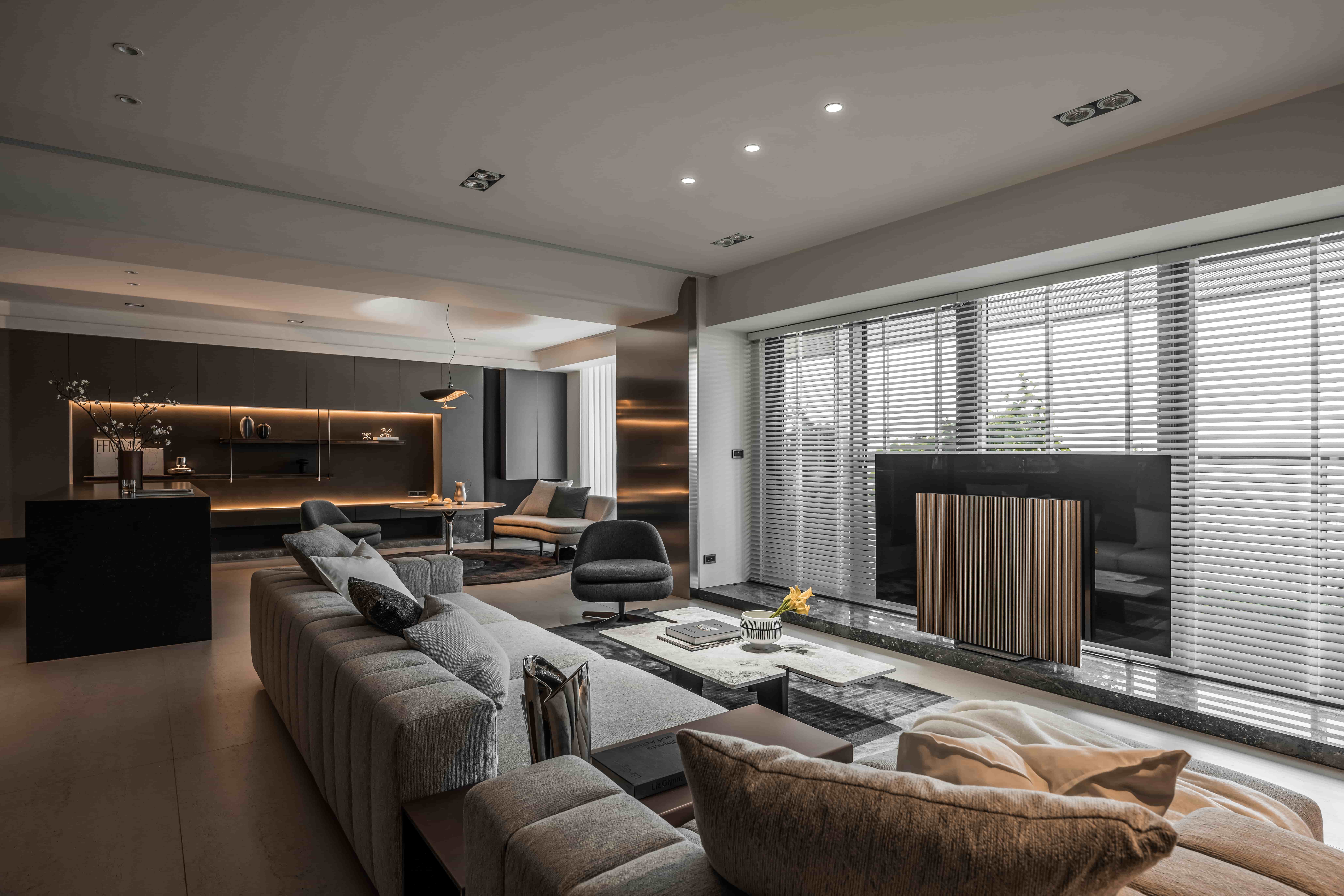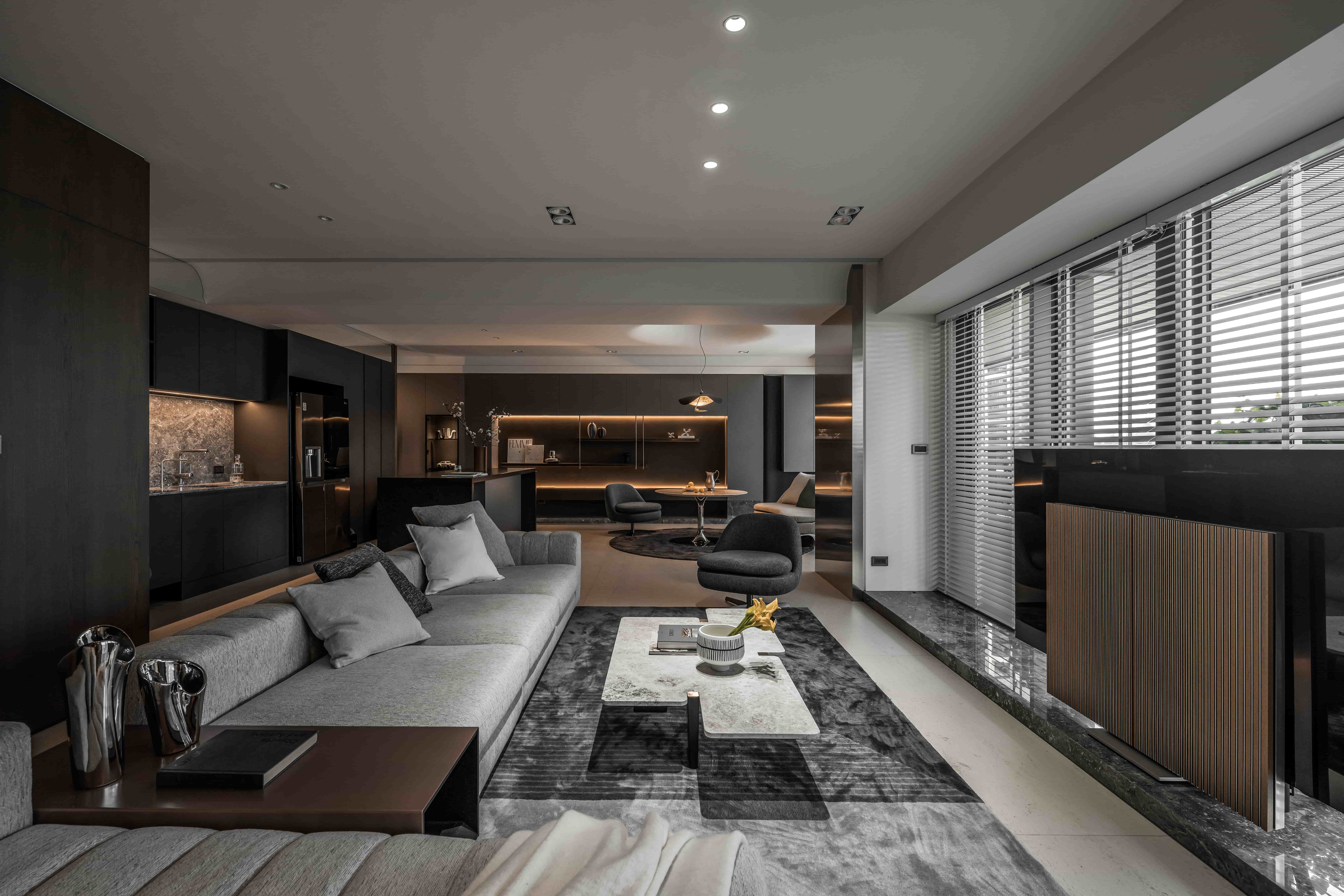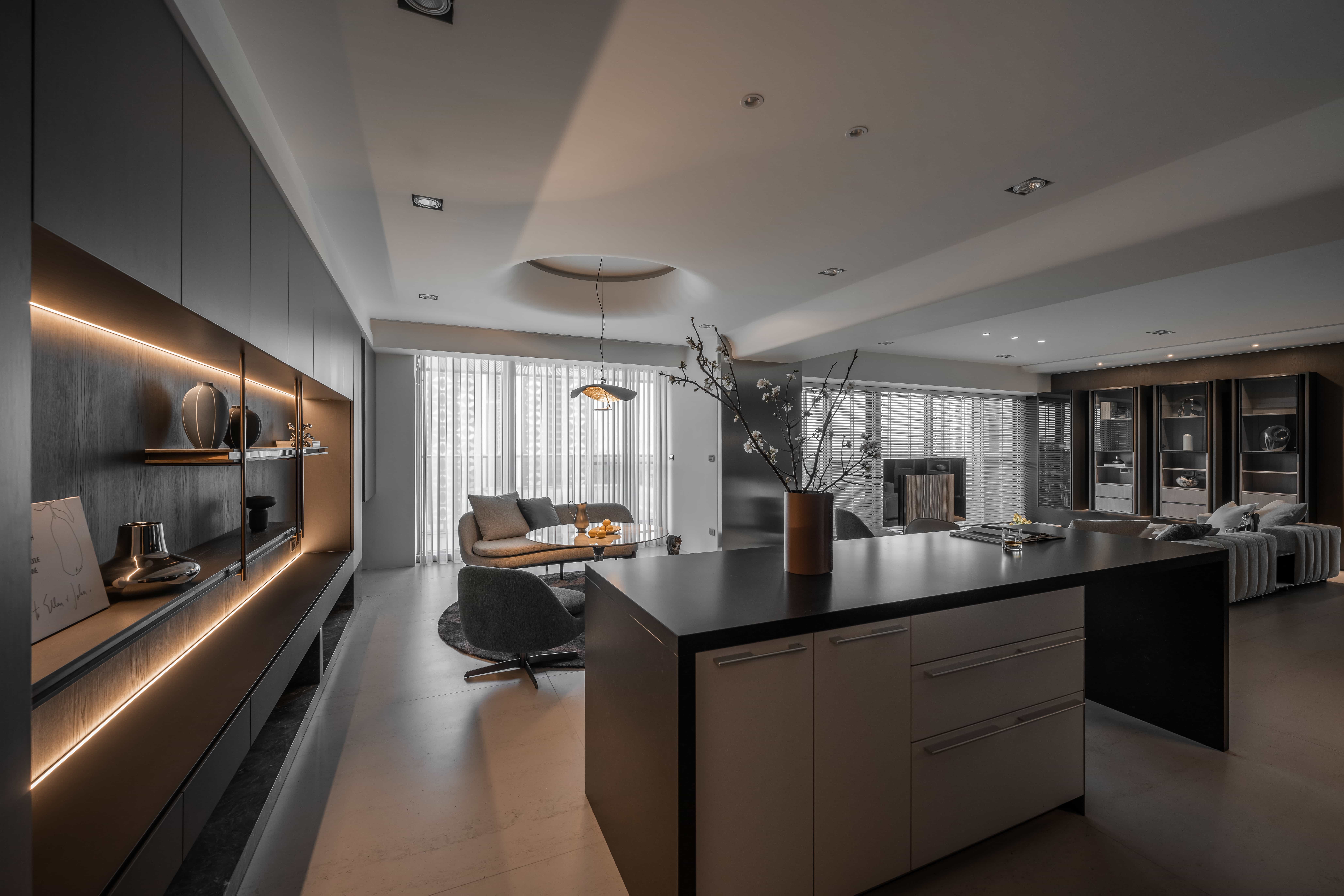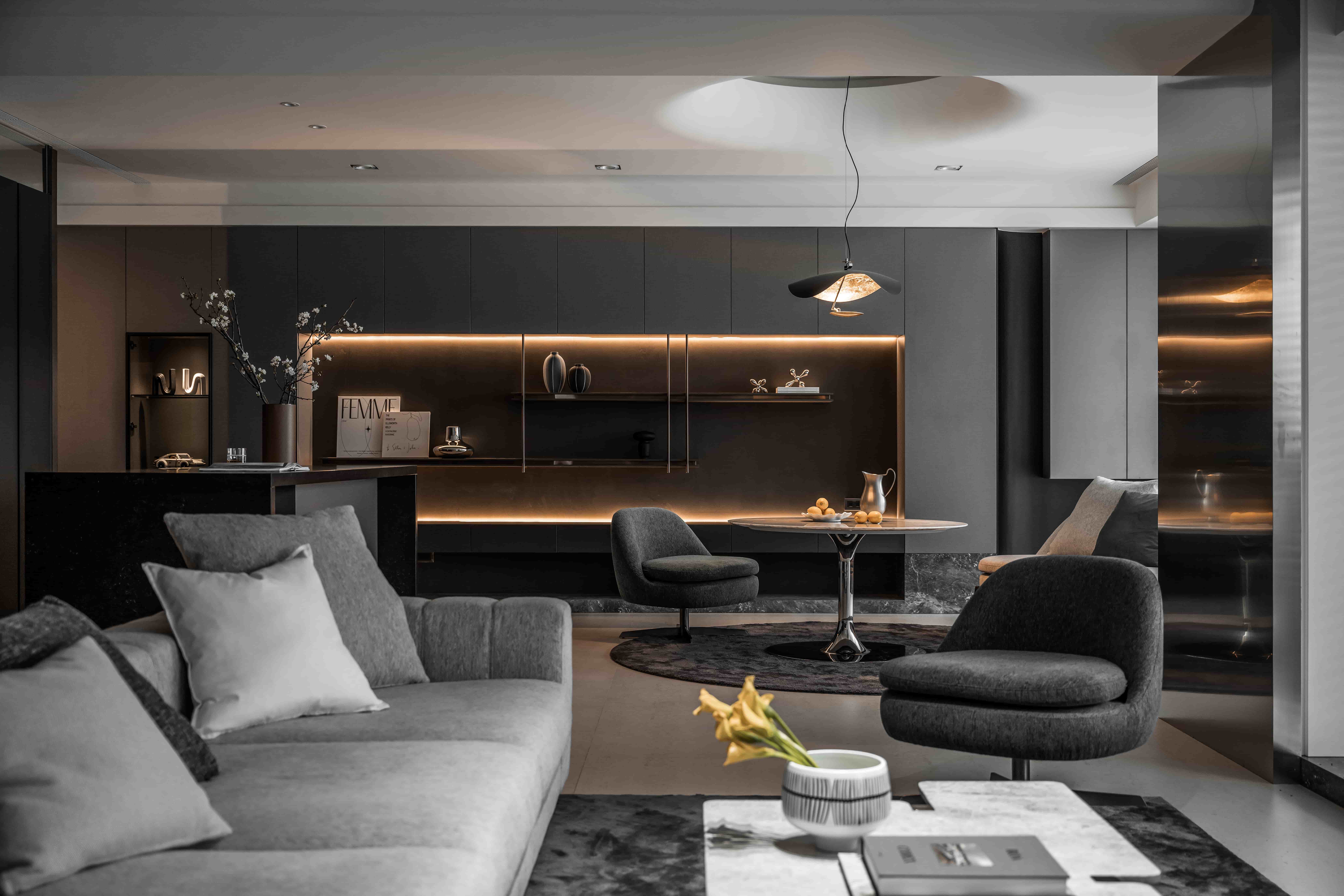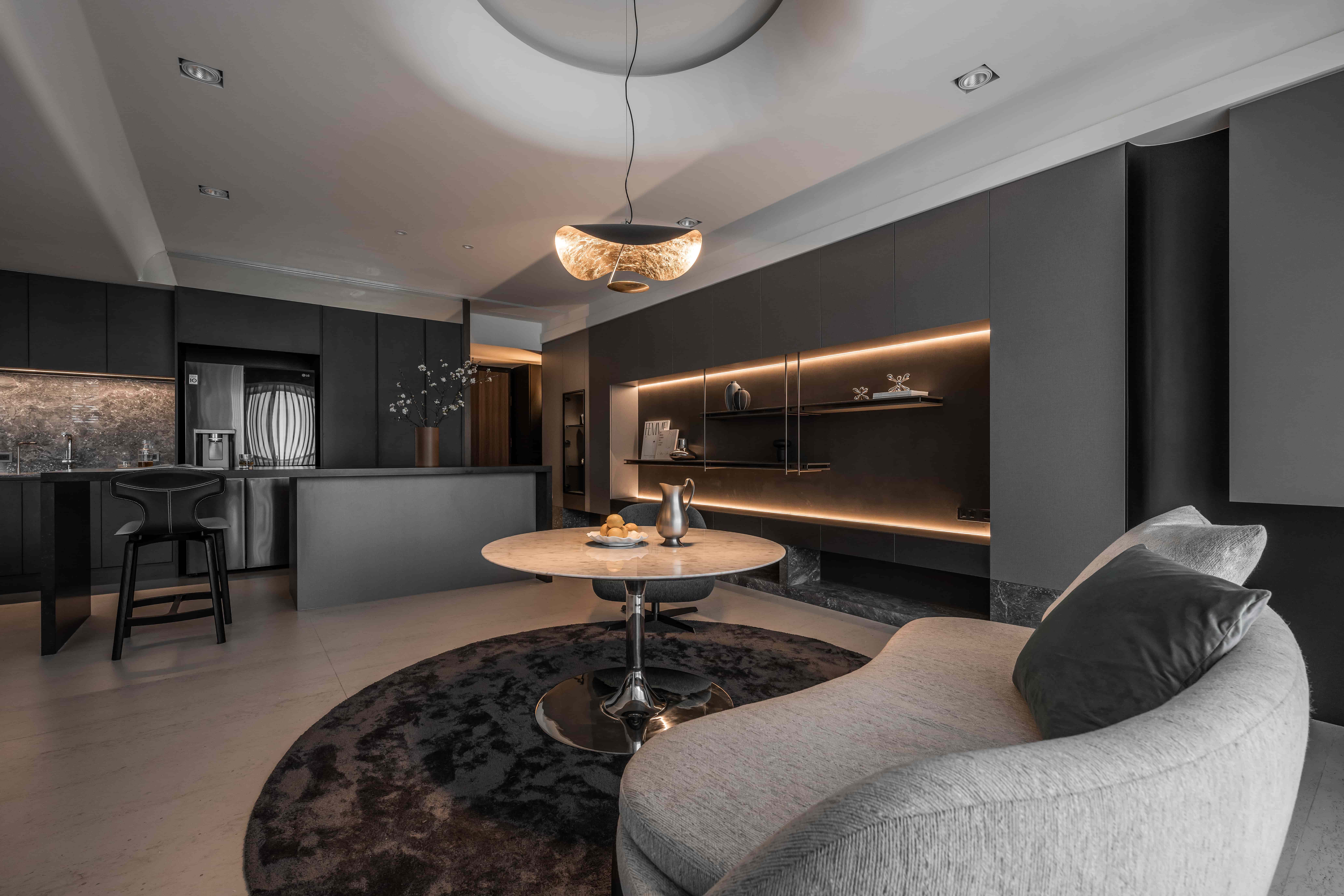 用户体验:本案精準對位現代都會菁英的生活型態,大膽捨棄傳統三房格局,將空間優化為兩房並整合出極大化的開放式客廳與中島餐廚區,不僅消弭了場域邊界,更為居者創造出一處具備「癮奢 Lounge」氛圍的社交核心,滿足業主對高質感聚會與居家放鬆的雙重渴望。