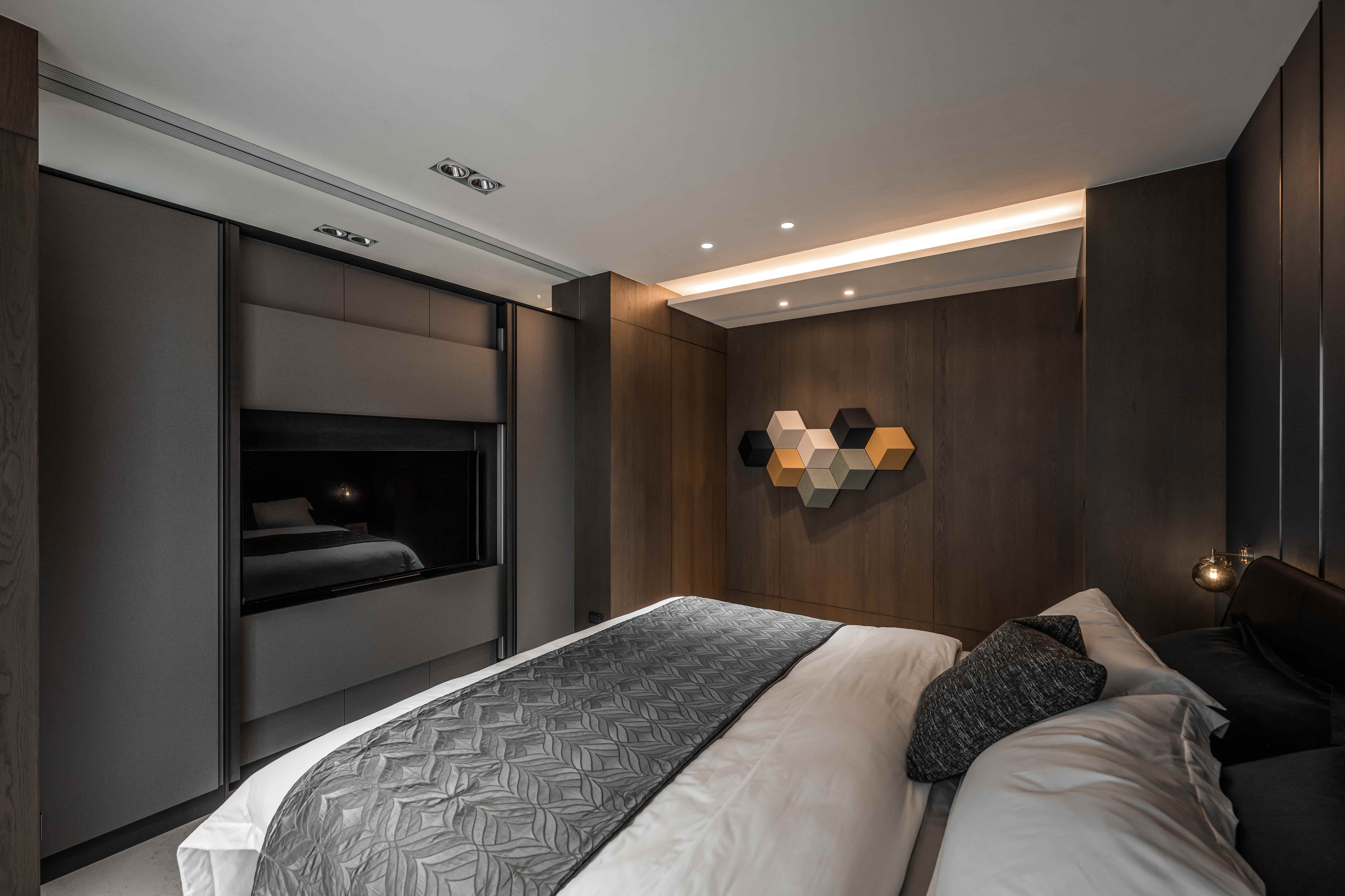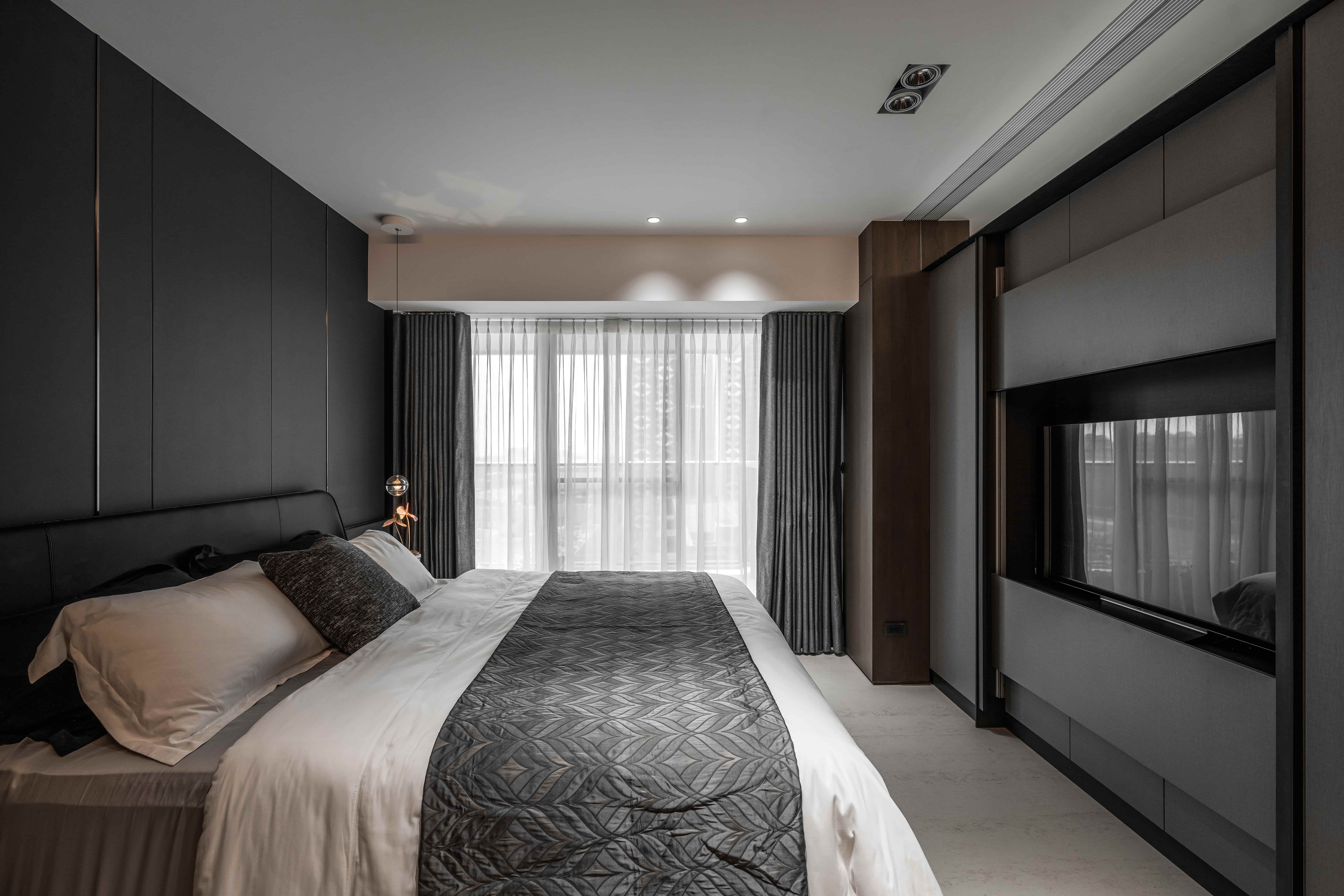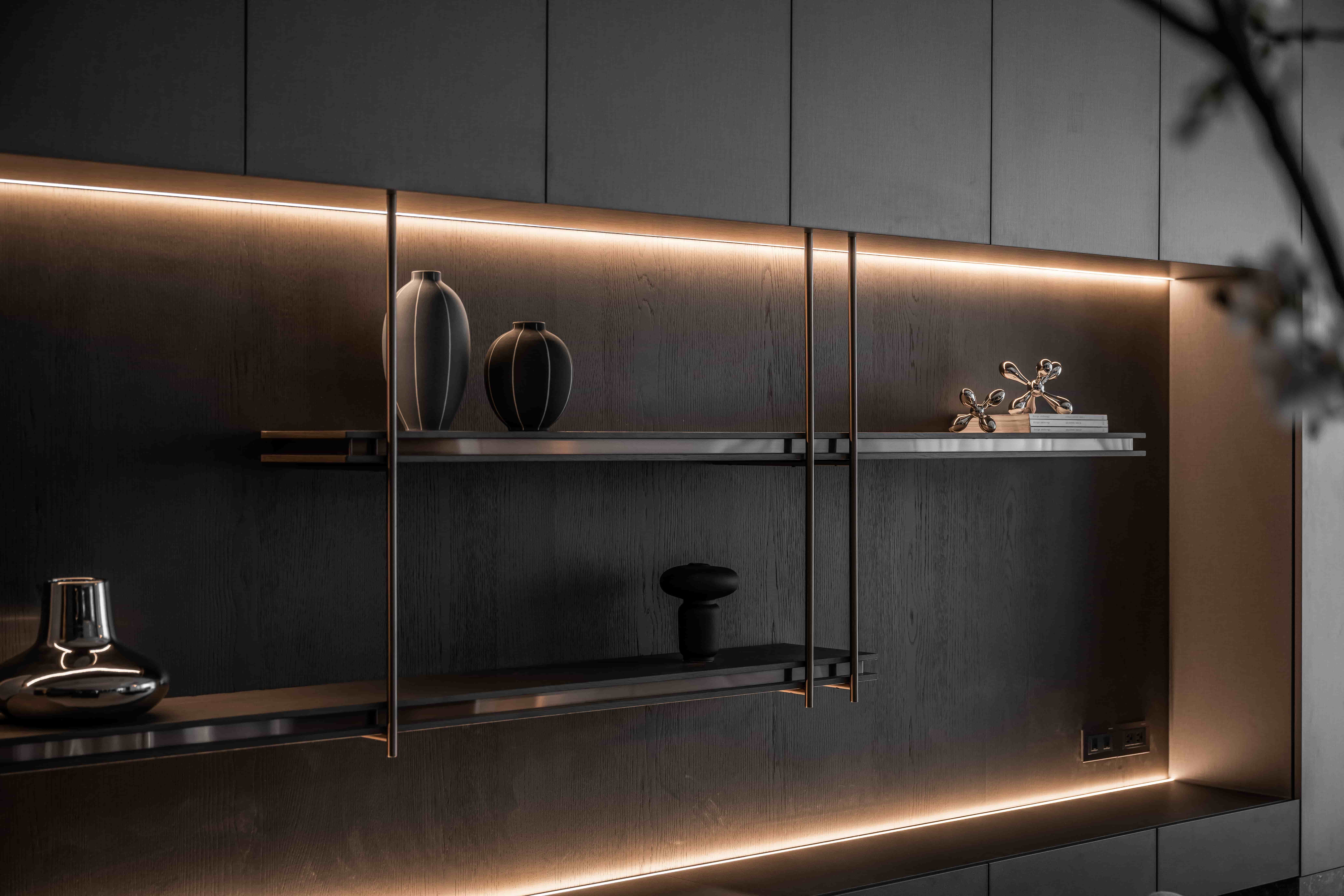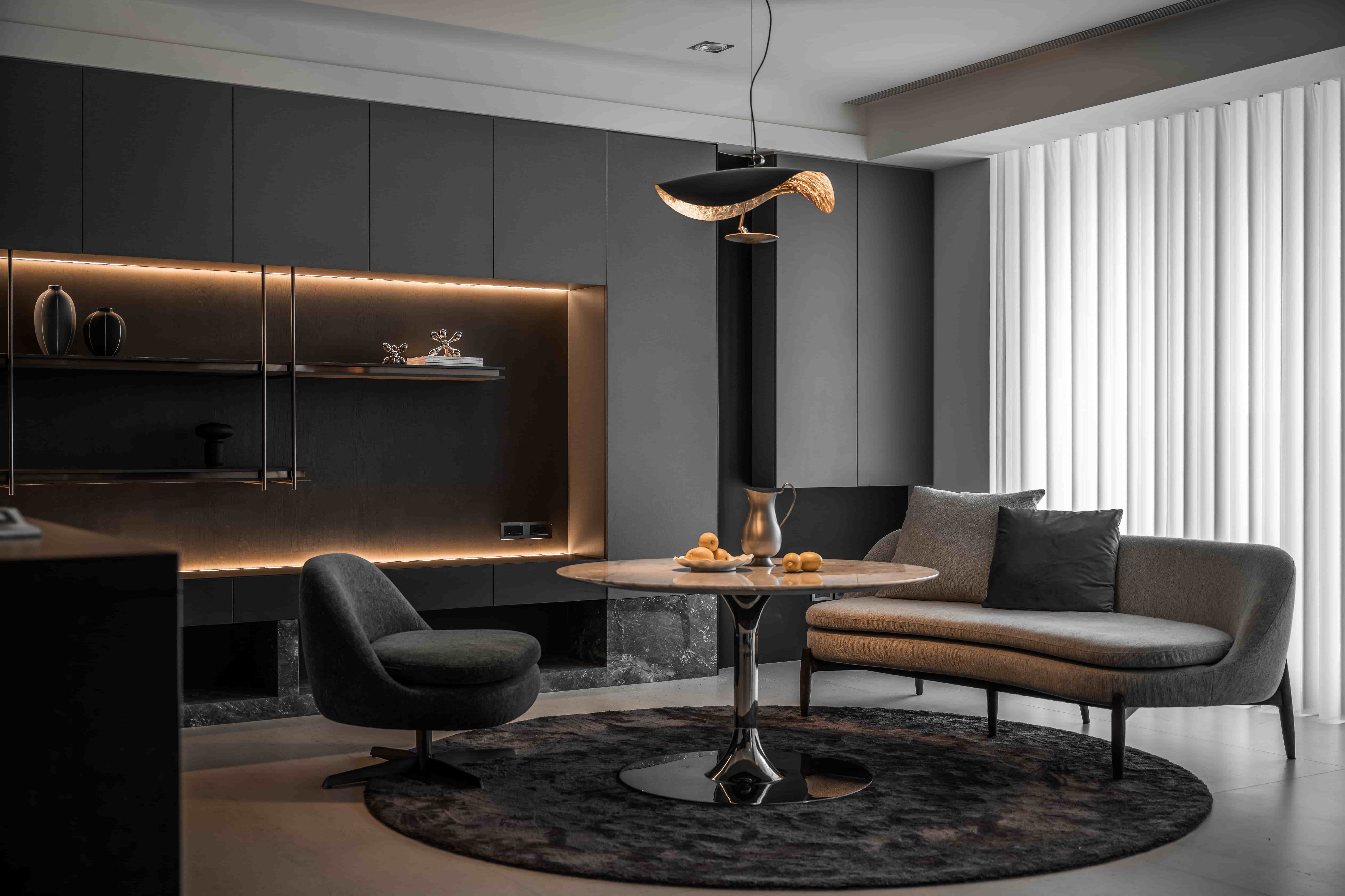 设计选材:作品追求的是一種「柔中帶剛」的感官質感,透過選材的精準度體現設計的經濟價值。我們巧妙揉合冷冽的鍍鈦金屬、自然紋理的大理石與溫潤的鋼刷木皮,在墨色調中層層堆疊出細膩的異材質質感。這種選材策略深植於「長效設計」的理念,優先選擇具備高度耐久性、抗老化且易於維護的天然材料,有效降低了長期持有成本與未來翻新的資源耗損。同時,結合精準的智能間接照明系統與自然採光導引,大幅減少對高耗能裝飾燈具的依賴,在構築極致美學空間的同時,亦實踐了對環保低碳與經濟效益的雙重承諾。