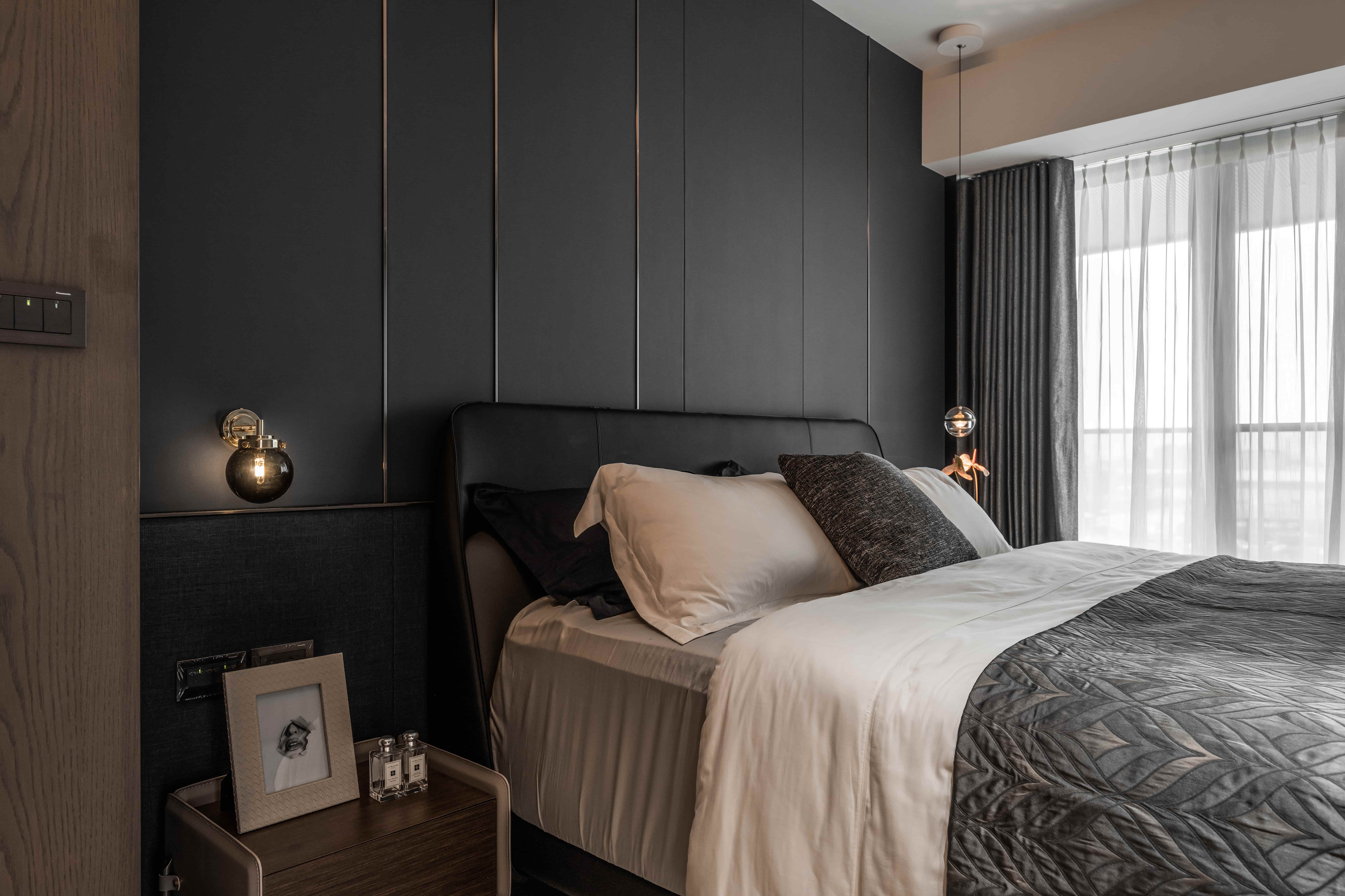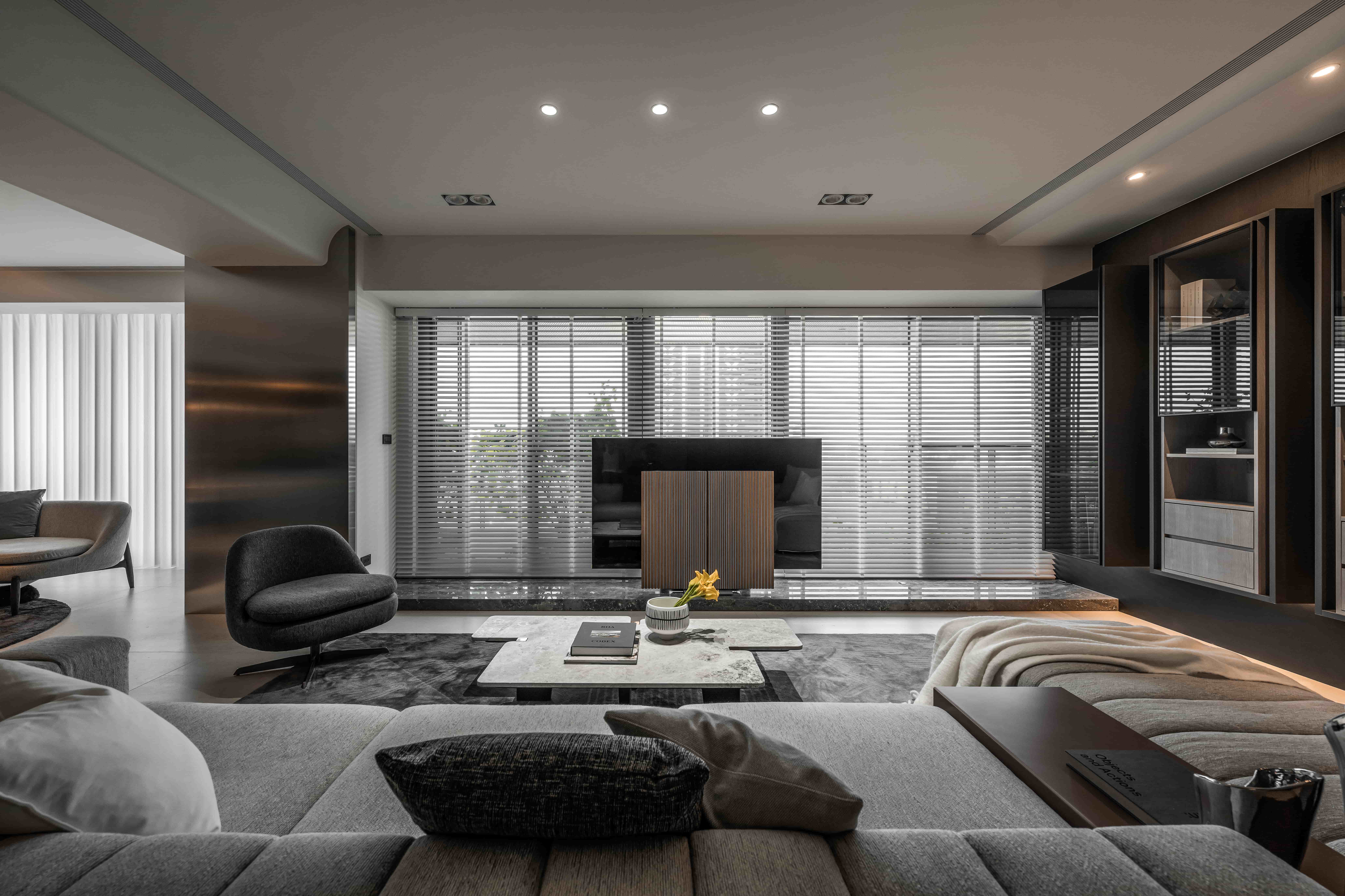 空间意境:對「墨影」與「海藍」的動態掌控,讓環境不再是靜止的背景。當夕陽無聲融於黑夜,海港餘暉透過細膩的百葉窗櫺篩落入室,室內的墨灰色階與窗外的自然風光在邊界處匯合,形成一幅流動的藝術畫卷。我們摒棄了傳統室內設計對人工裝飾的執著,改以光影作為主要的空間畫筆。透過異材質表面對光的反射與漫射,室內場景隨時序推移展現出豐富的表情,從清晨的素雅人文到夜晚如精品 Lounge 般的微醺奢華,成功營造出一種「由外而內,引景入室」的沉浸式生活劇場。