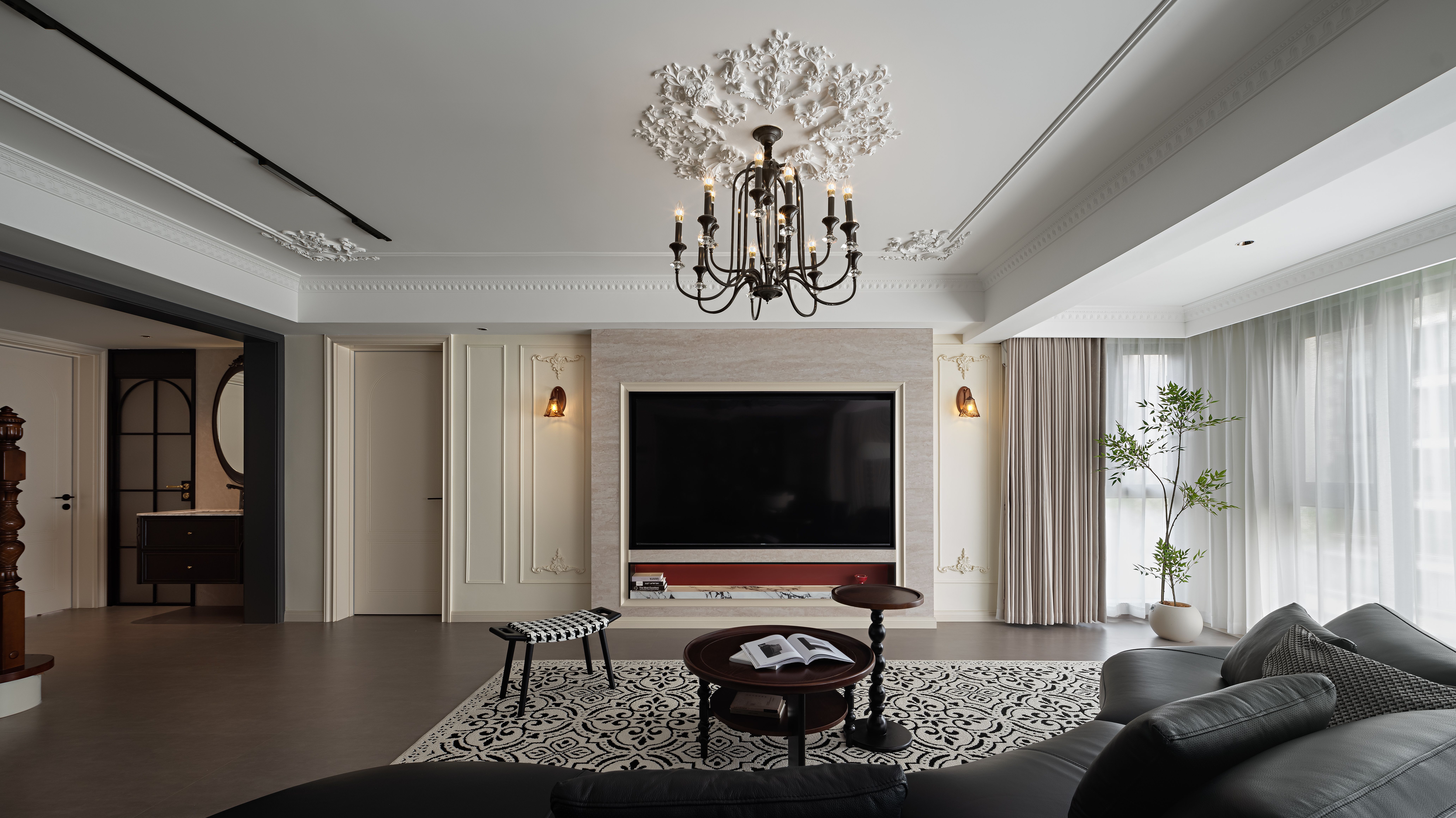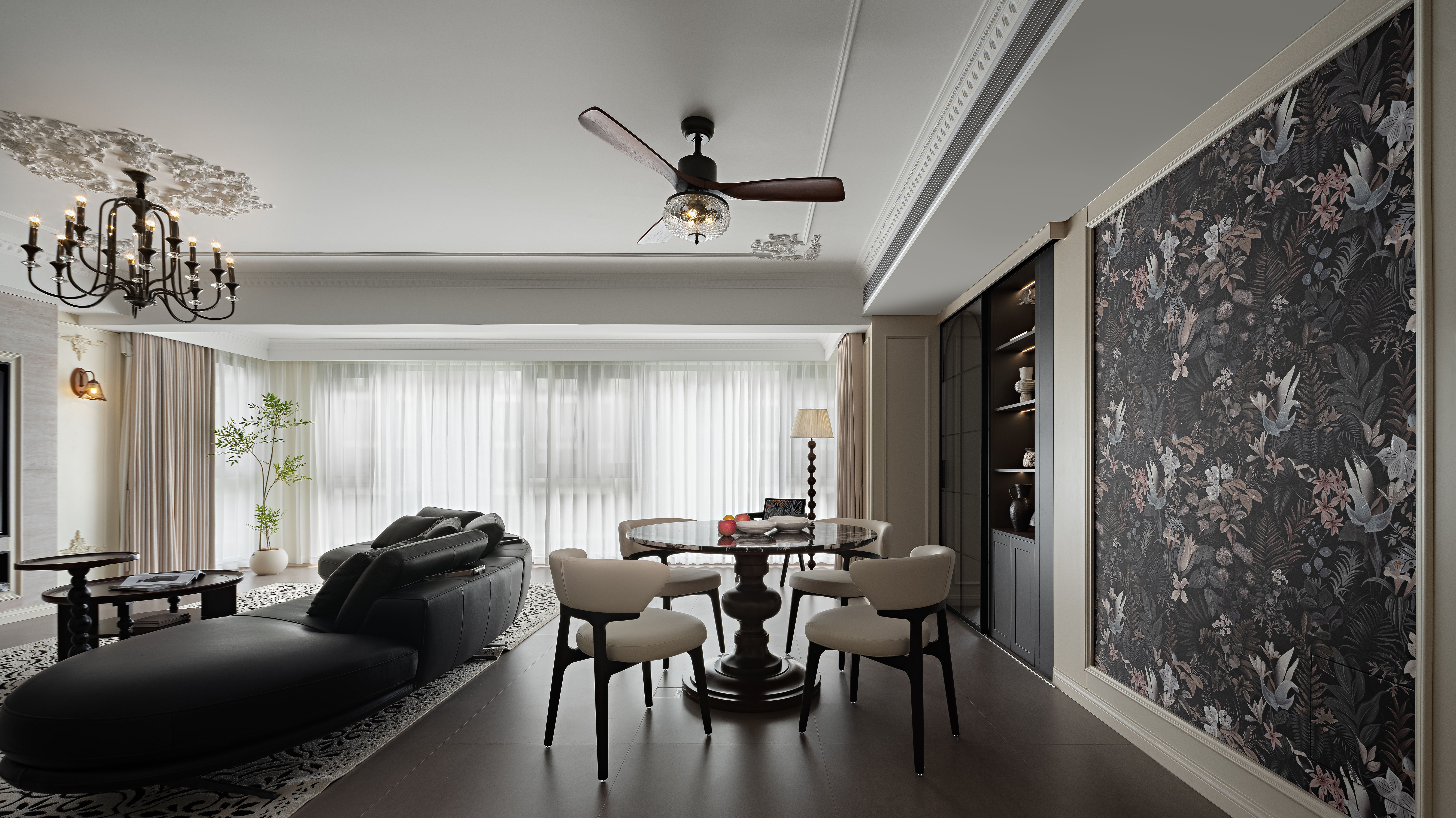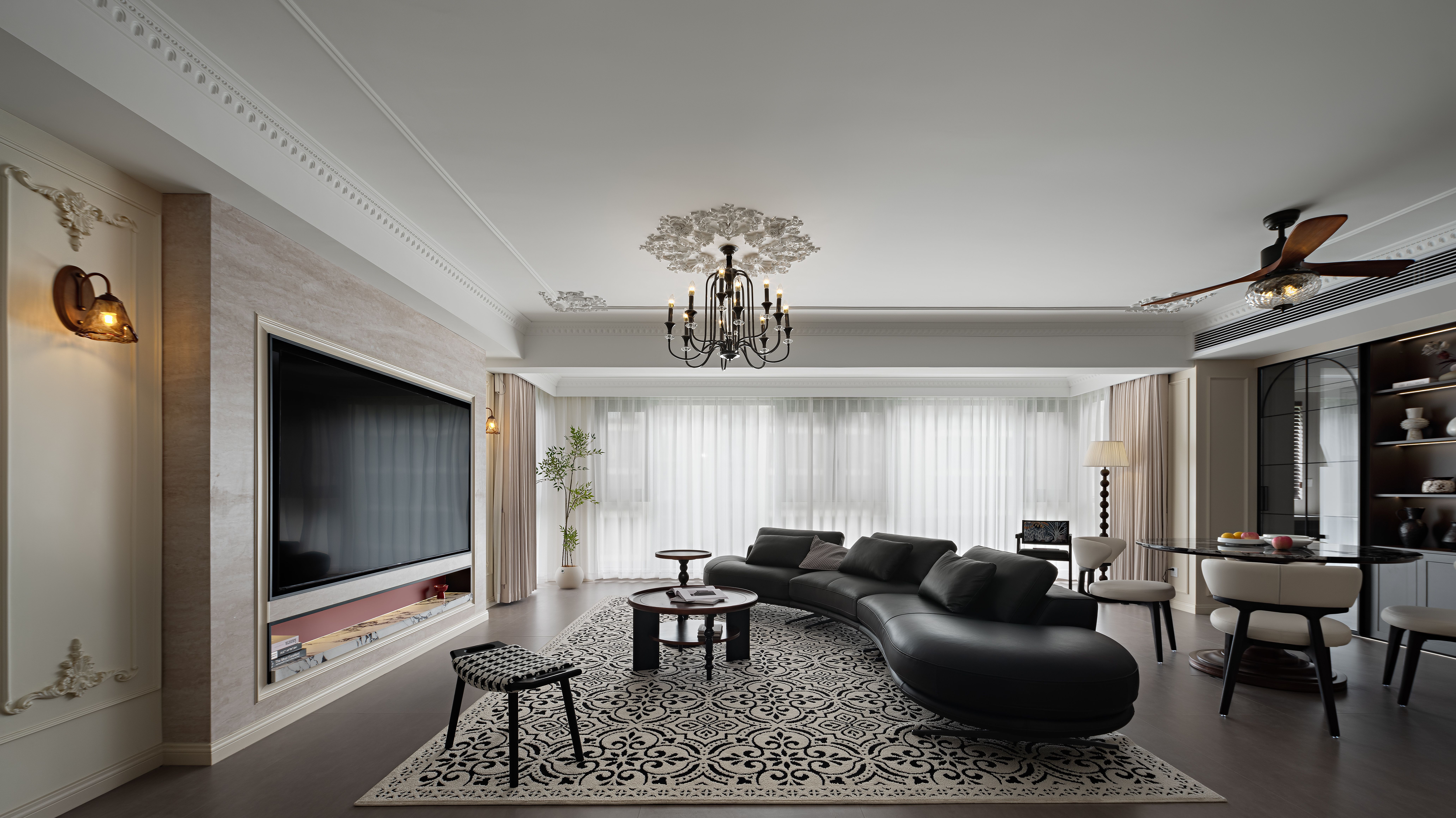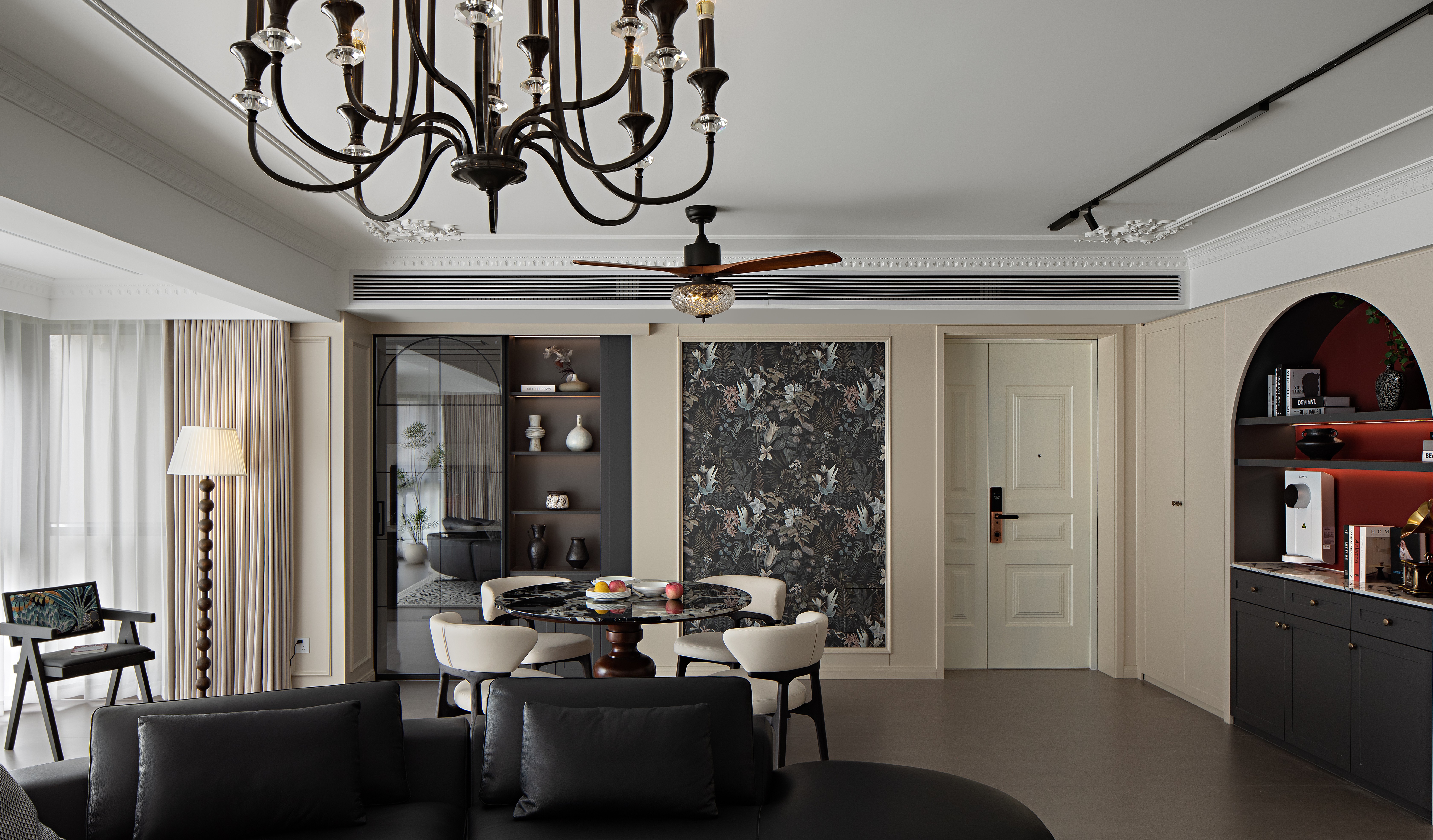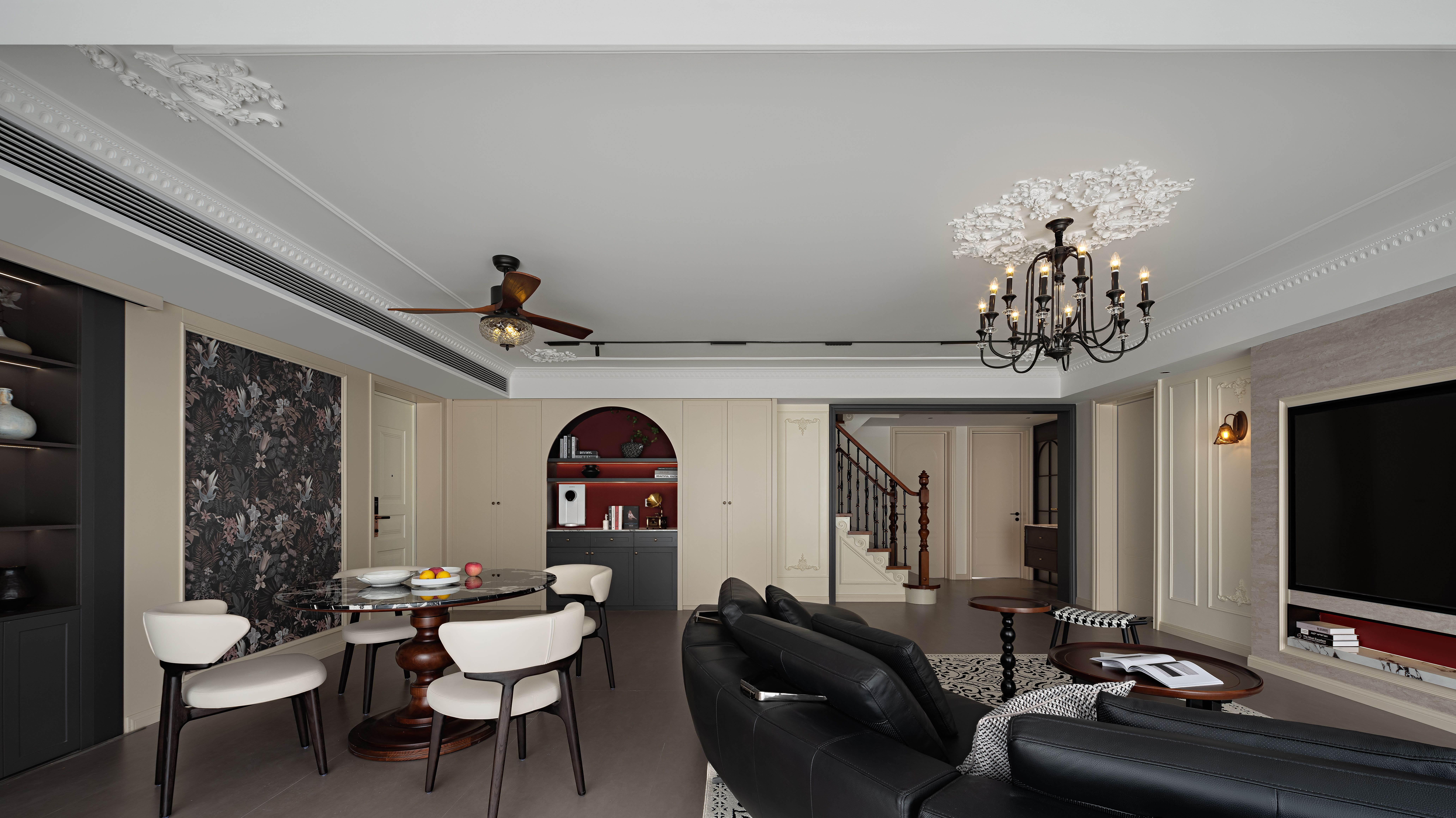空间意境:以轻复古 + 软质感的氛围平衡打破传统复古风的厚重感:用简化的法式雕花线条(吊顶、墙面装饰)替代繁复的复古造型,保留优雅质感却不压抑;以柔色调基底 + 局部深色点缀调和氛围:米白墙面、浅棕木色做基底,搭配黑色皮质沙发、深色装饰柜,既显复古格调又避免沉闷;植入复古肌理的细节:比如复古造型的吊扇灯兼具装饰与实用,拱形收纳区既有复古形态又藏着饮水设备,让复古风格落地为日常可用的生活场景。