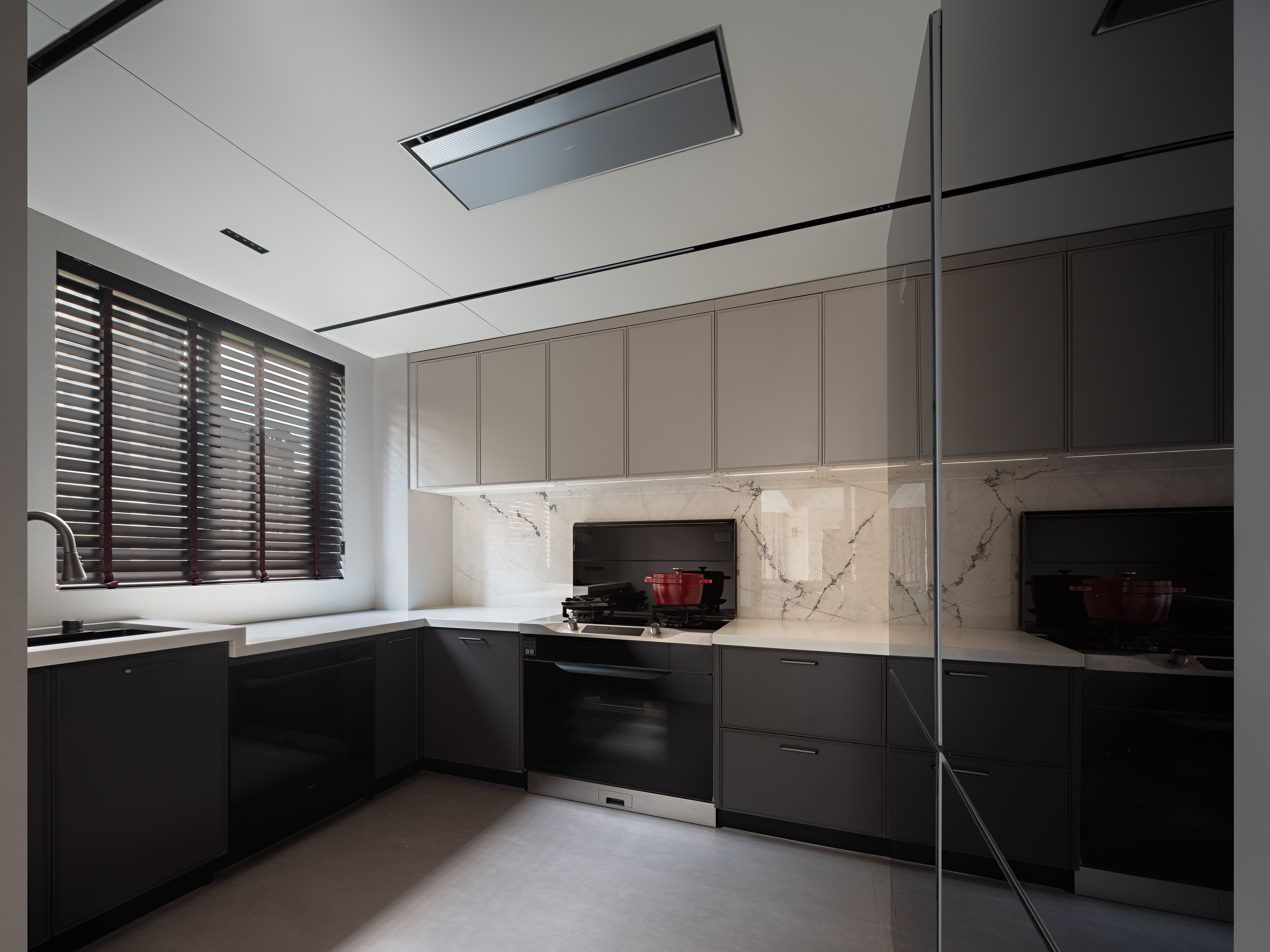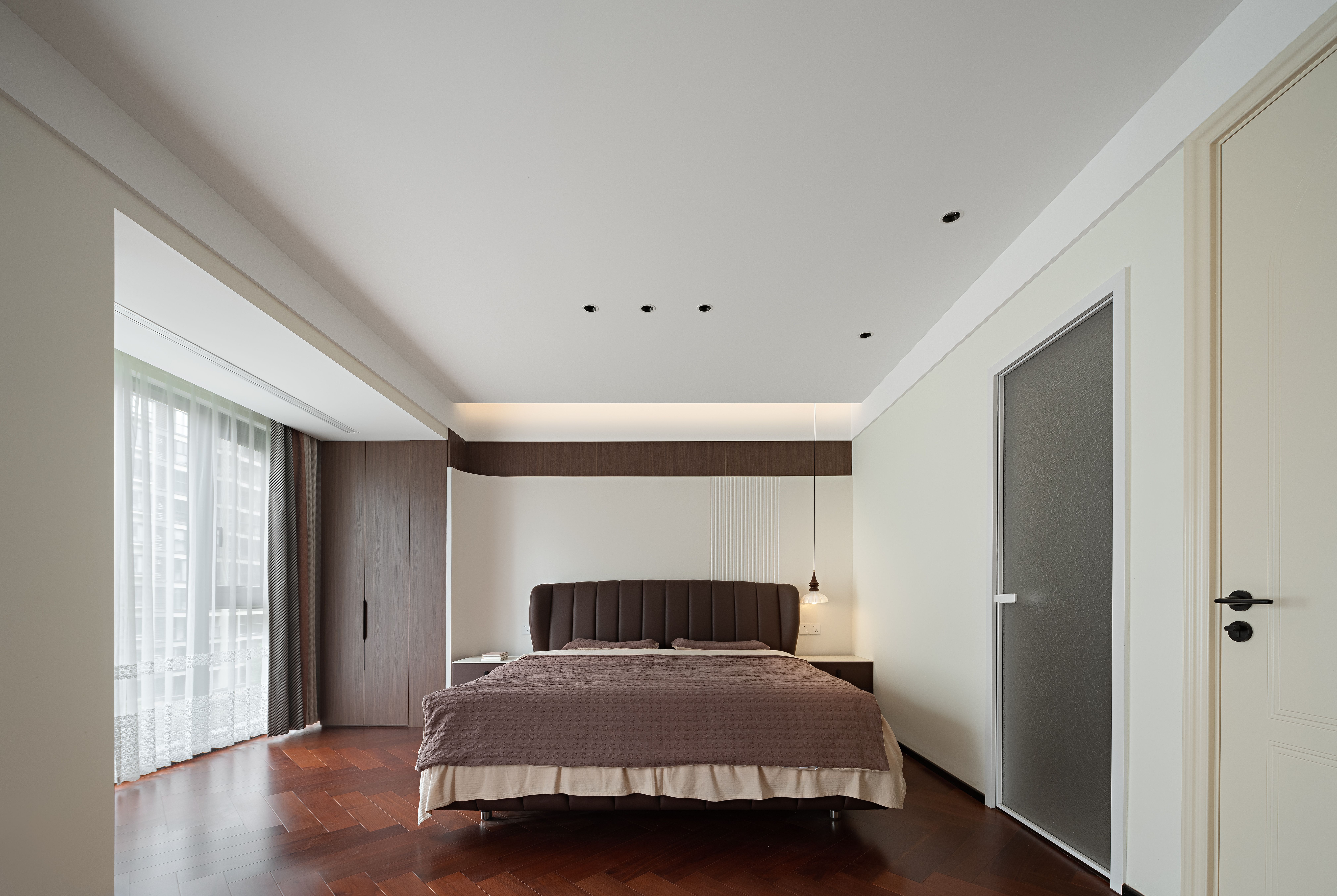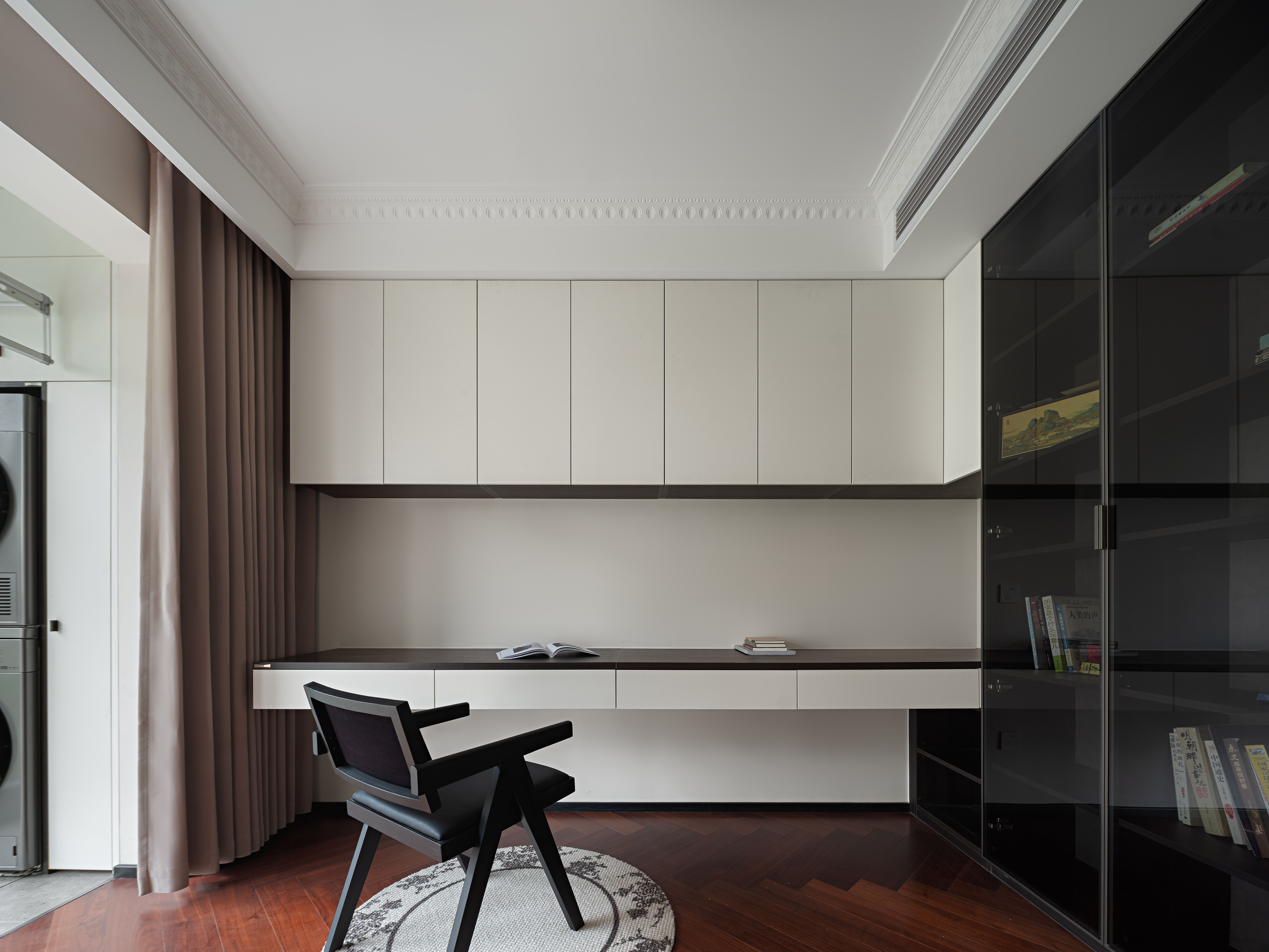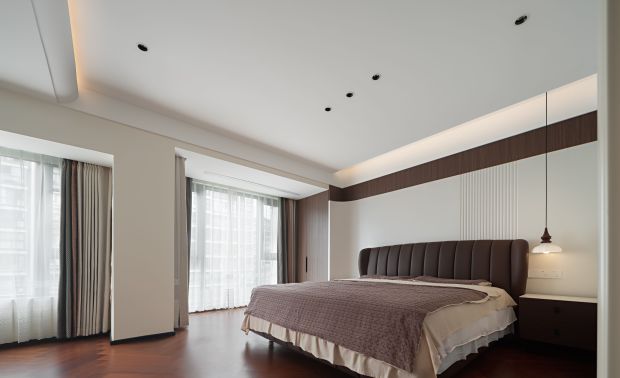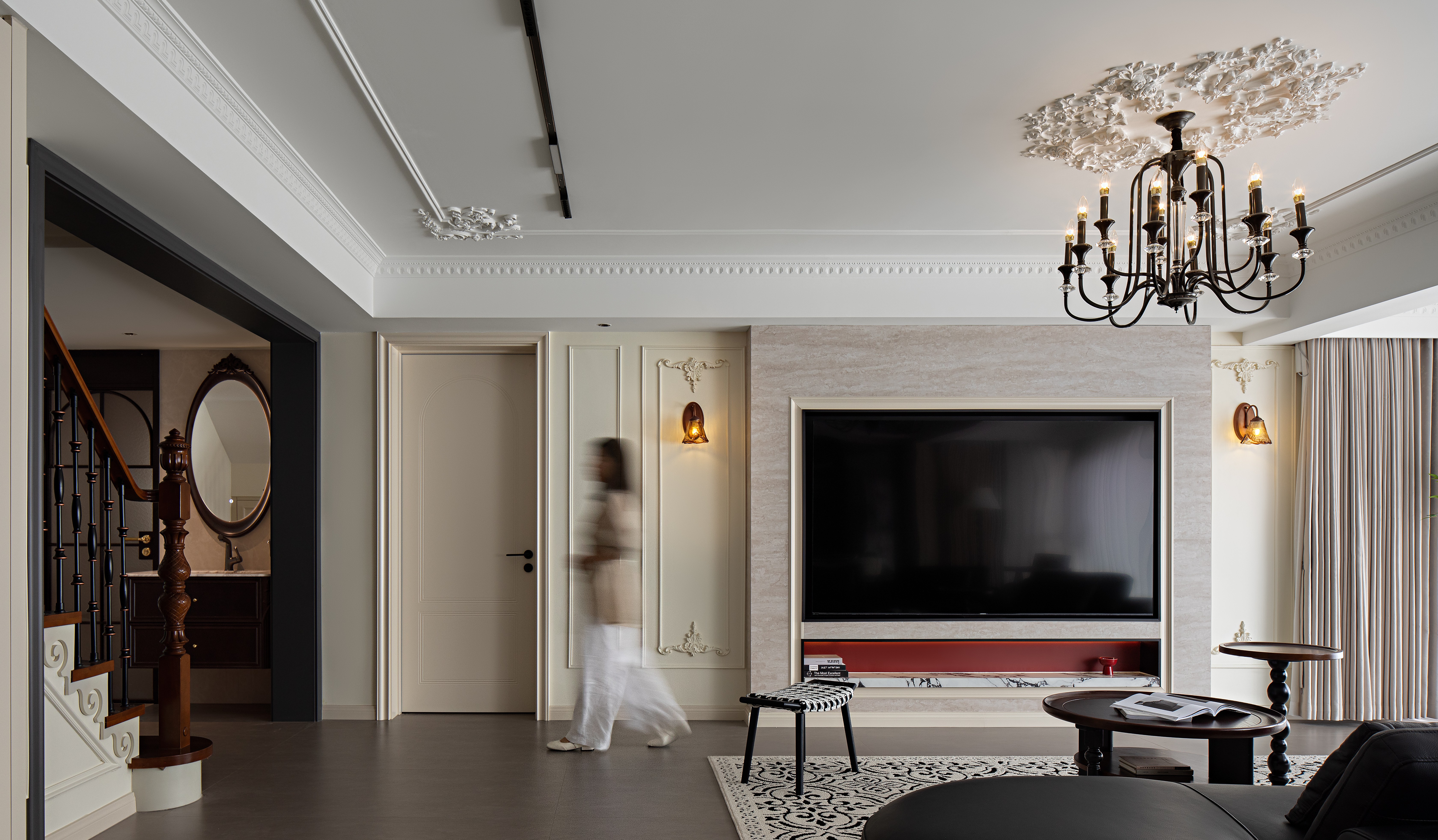 空间意境:以轻复古 + 软质感的氛围平衡打破传统复古风的厚重感:用简化的法式雕花线条(吊顶、墙面装饰)替代繁复的复古造型,保留优雅质感却不压抑;以柔色调基底 + 局部深色点缀调和氛围:米白墙面、浅棕木色做基底,搭配黑色皮质沙发、深色装饰柜,既显复古格调又避免沉闷;植入复古肌理的细节:比如复古造型的吊扇灯兼具装饰与实用,拱形收纳区既有复古形态又藏着饮水设备,让复古风格落地为日常可用的生活场景。