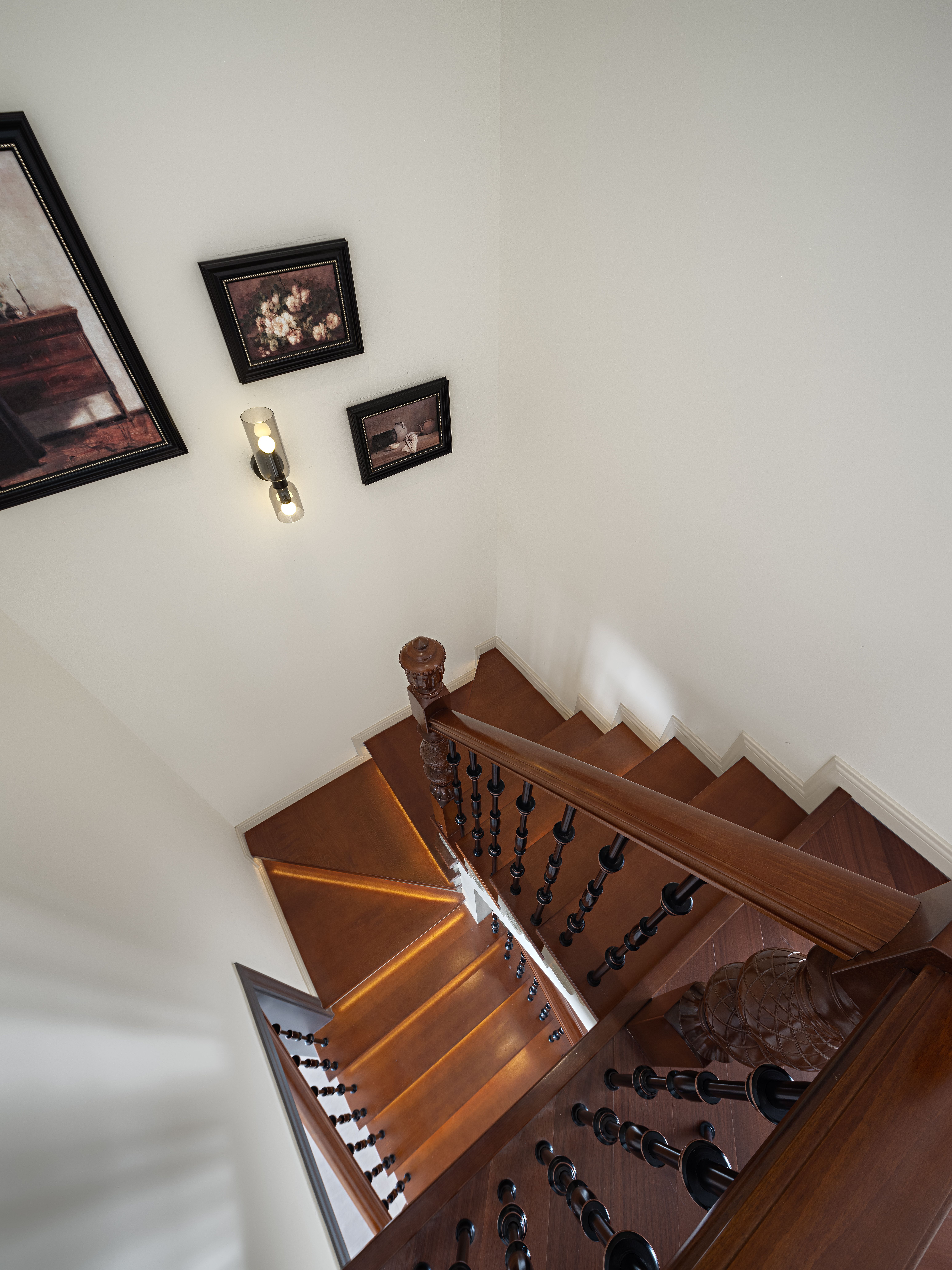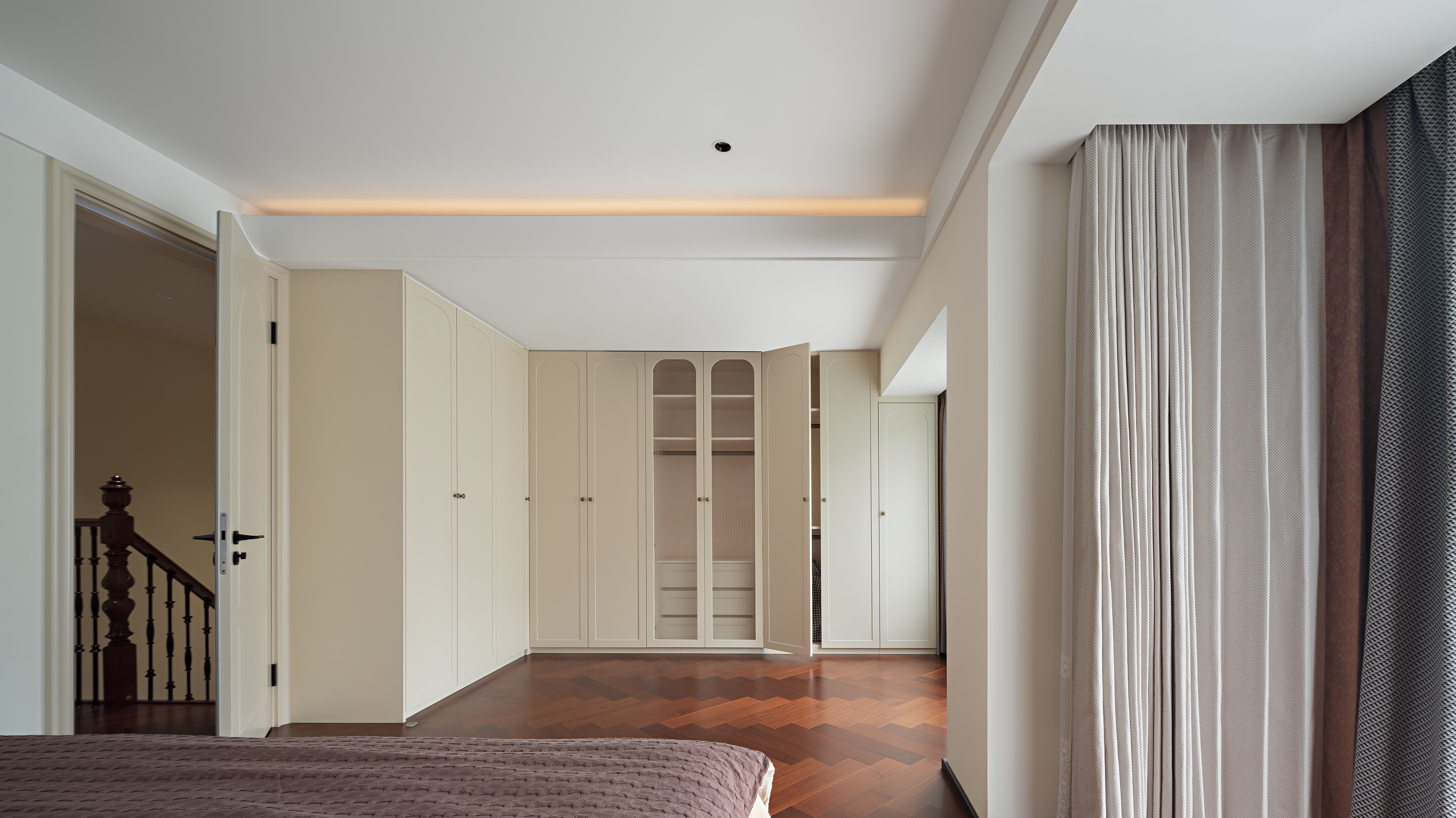空间布局:公共区域以开放洄游 + 隐形收纳为主:客餐厅连通形成开阔社交场,同时将整面墙做成复古造型的隐形柜(比如玄关旁的米色柜门),藏起杂物却不破坏风格;功能区借复古造型隐身:比如餐厅旁的拱形区域,以复古拱门形态包裹饮水、储物功能,既做场景装饰又承担实用功能;动线柔化转折,楼梯、门洞以弧形线条过渡,既契合复古风格的柔美感,又让走动更流畅,避免空间死角。