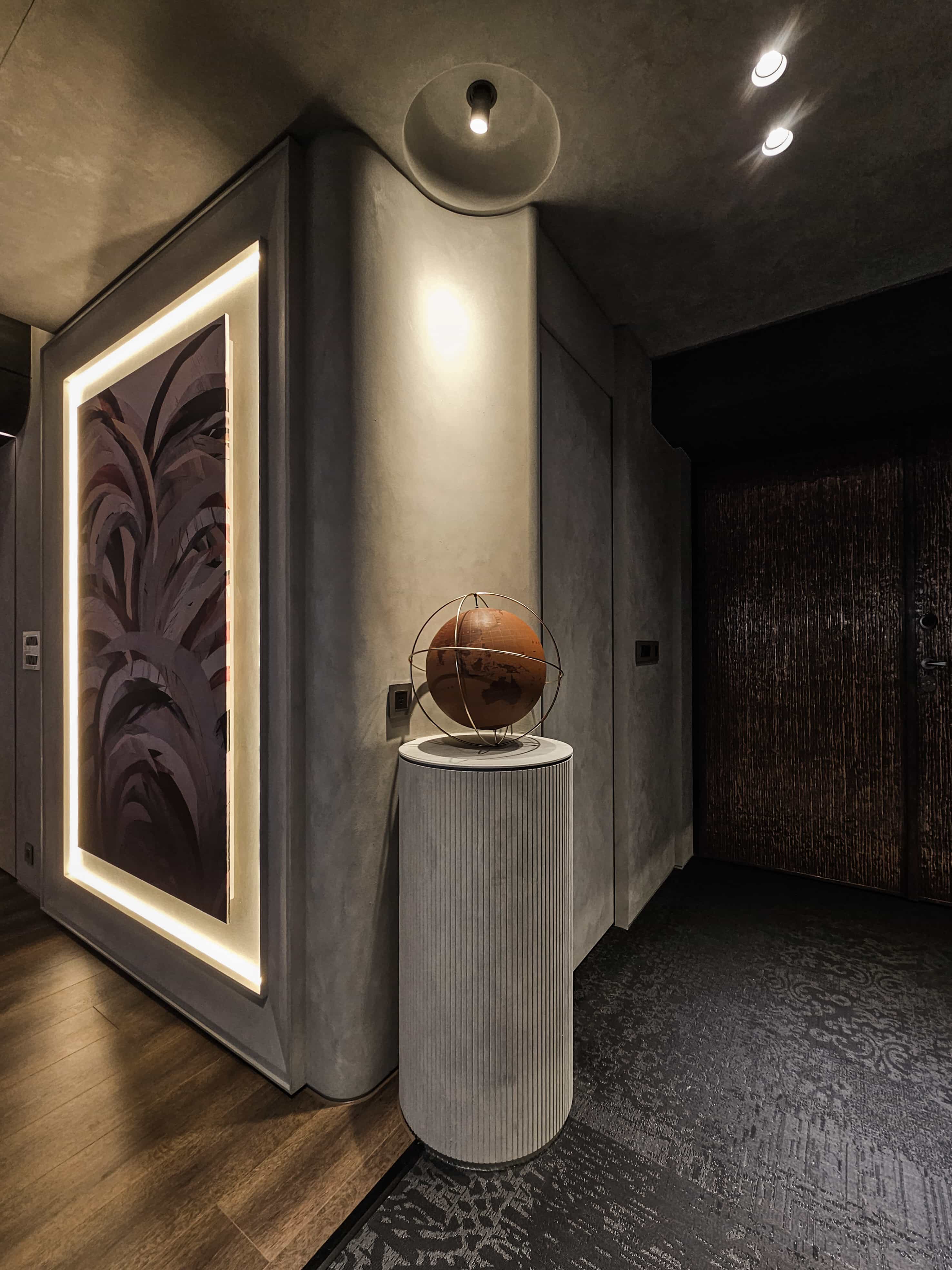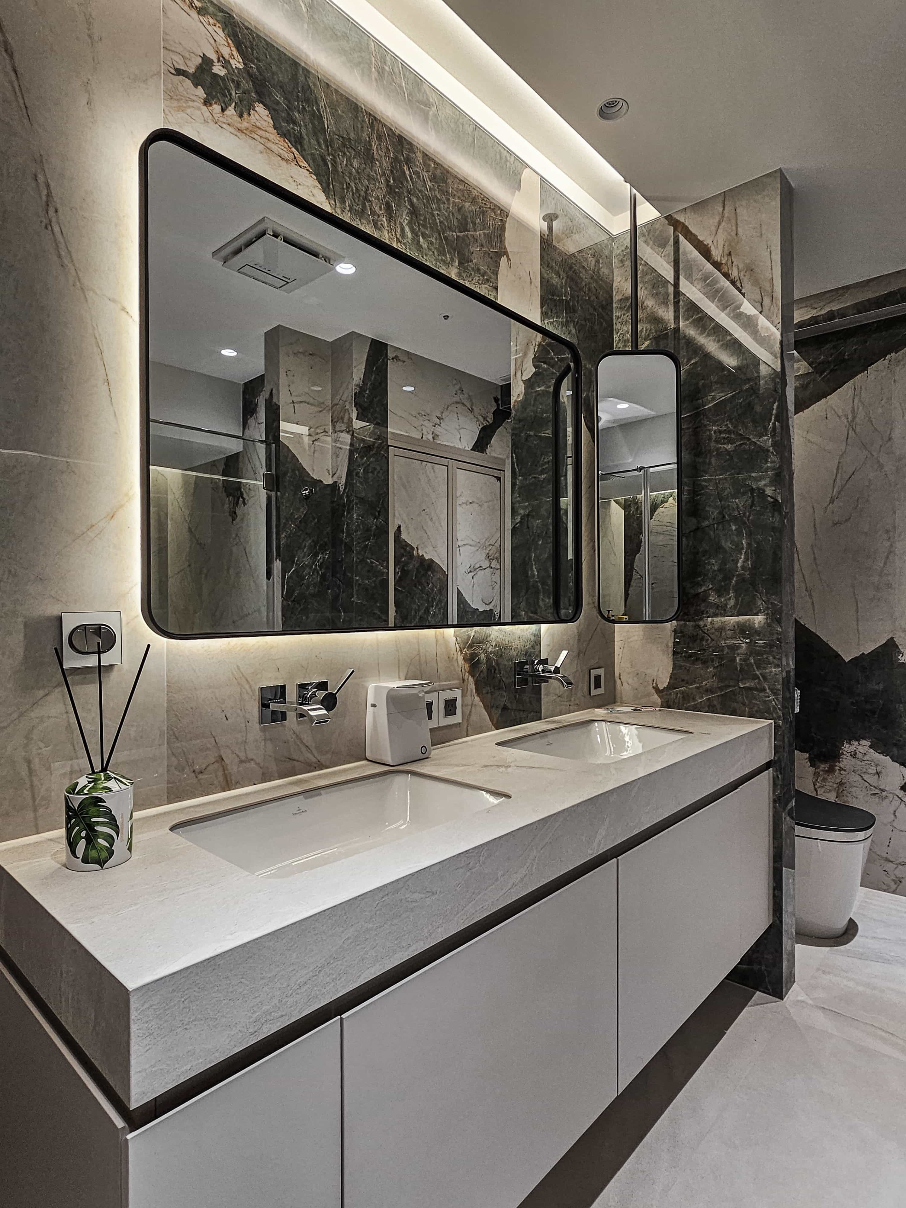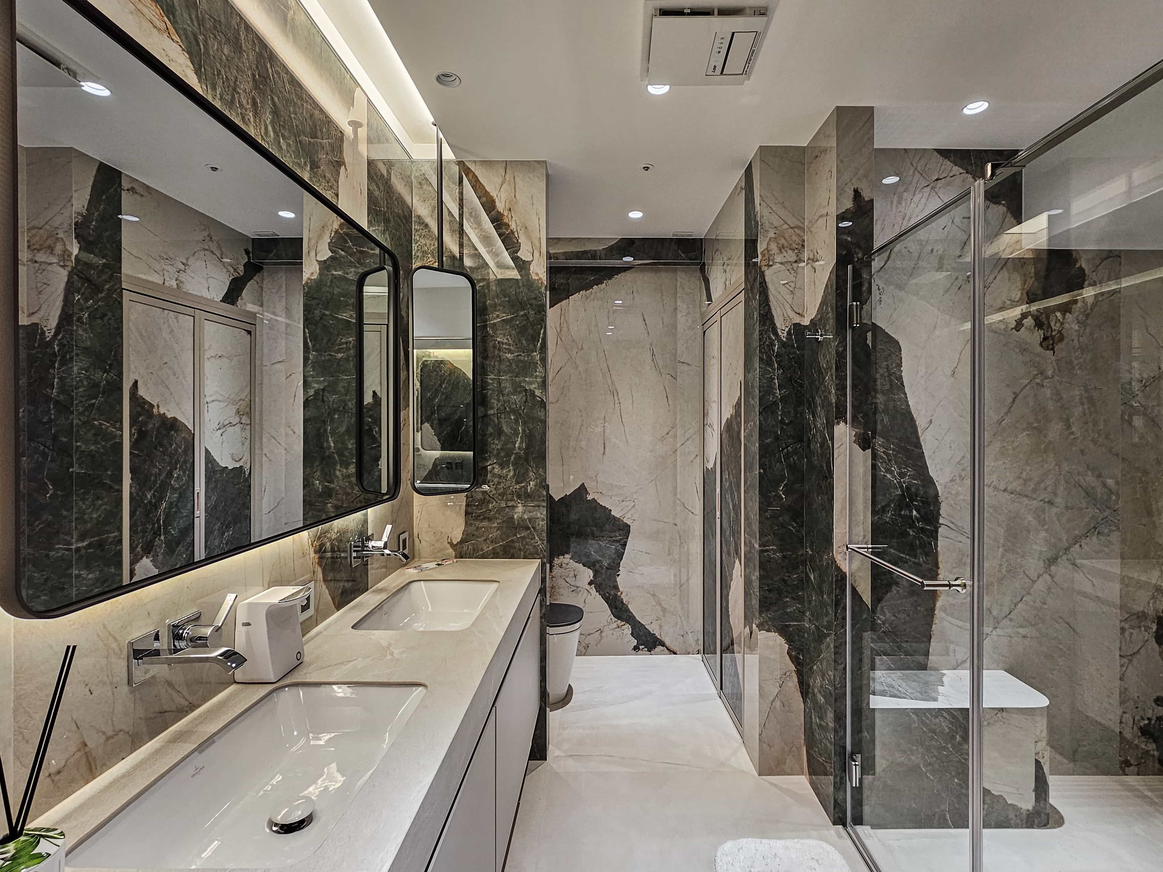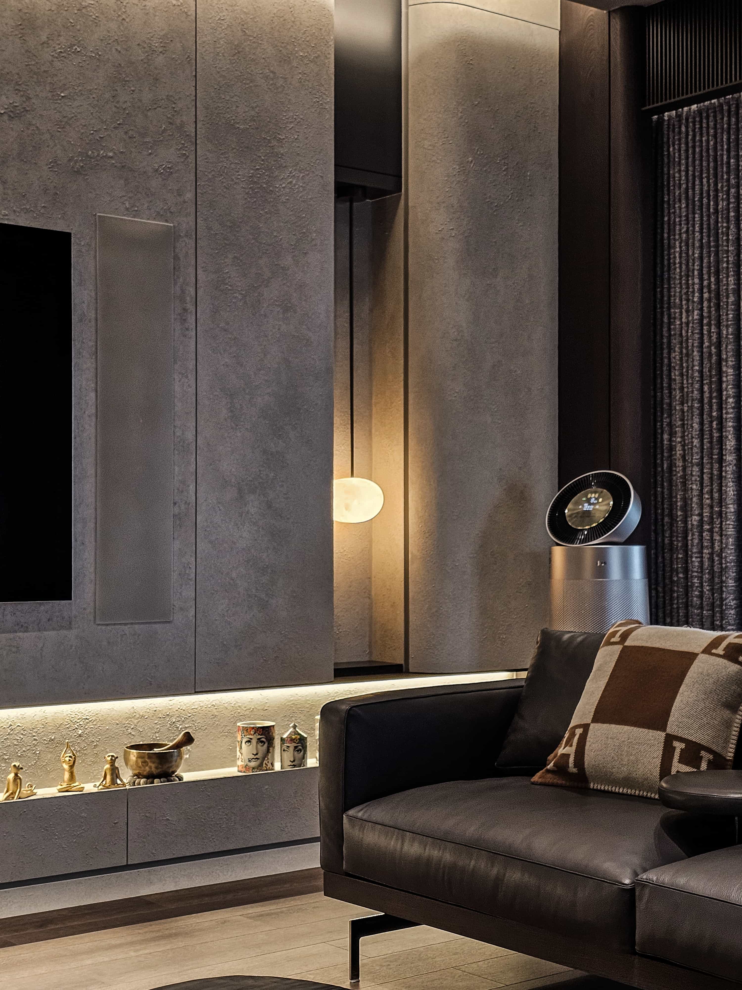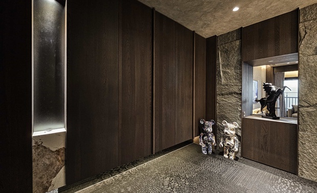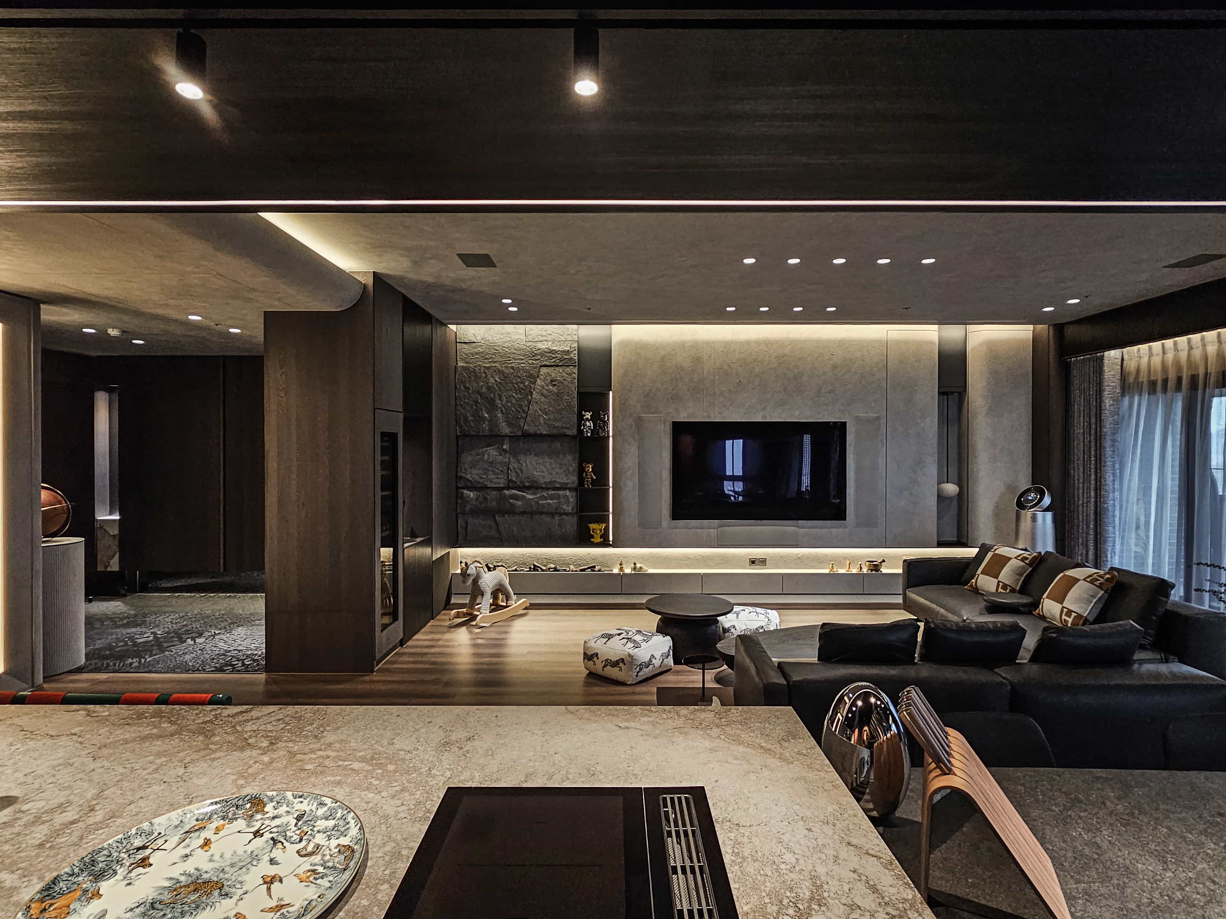 空间意境:「感官層次的藝術化」玄關以編織地毯與鏤空端景框定客廳,形成畫作般的迎賓序曲。特殊塗料從天花一路延伸至公領域,搭配電視牆粗獷石材與細膩紋理的拼接,營造出雅痞韻味十足的「流光劇場」。270 度環繞海港窗景與主臥熱帶植物紋樣相互輝映,實現了室內靜謐感與室外環境風光的動態平衡。