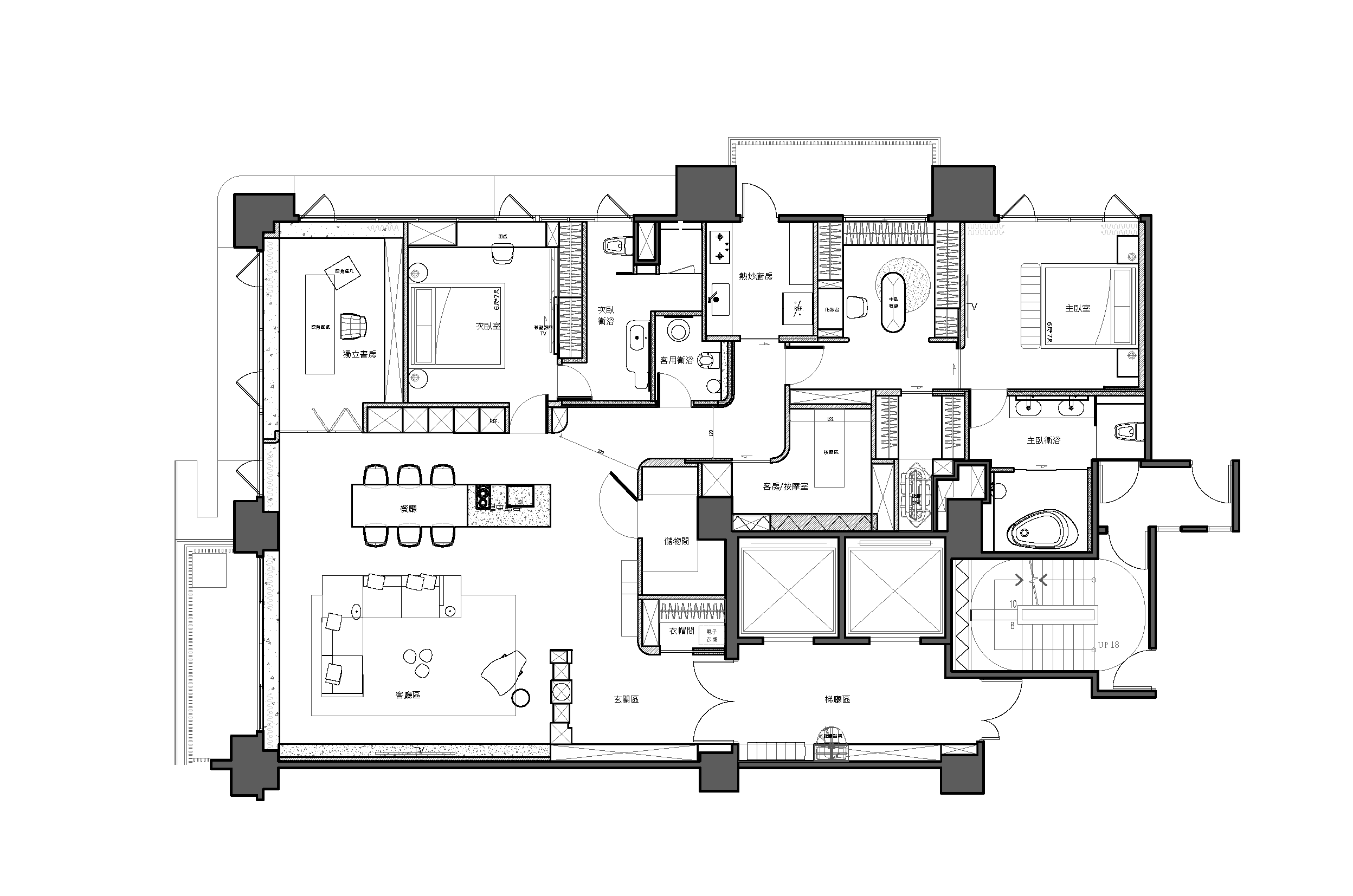 空间布局:大膽採取「去牆化」布局,將原主臥改為半開放式書房,釋放寬闊視野。開放式設計串聯客、餐、書房,極大化公區範疇,讓生活與聚會動線自然流動。主臥更衣室導入弧形拱門與精品 VIP 室概念,主衛浴則配置雙洗手台與大氣石材。整體佈局不僅提升了家庭互動的便利性,更賦予居者如頂級酒店般的從容儀式感。