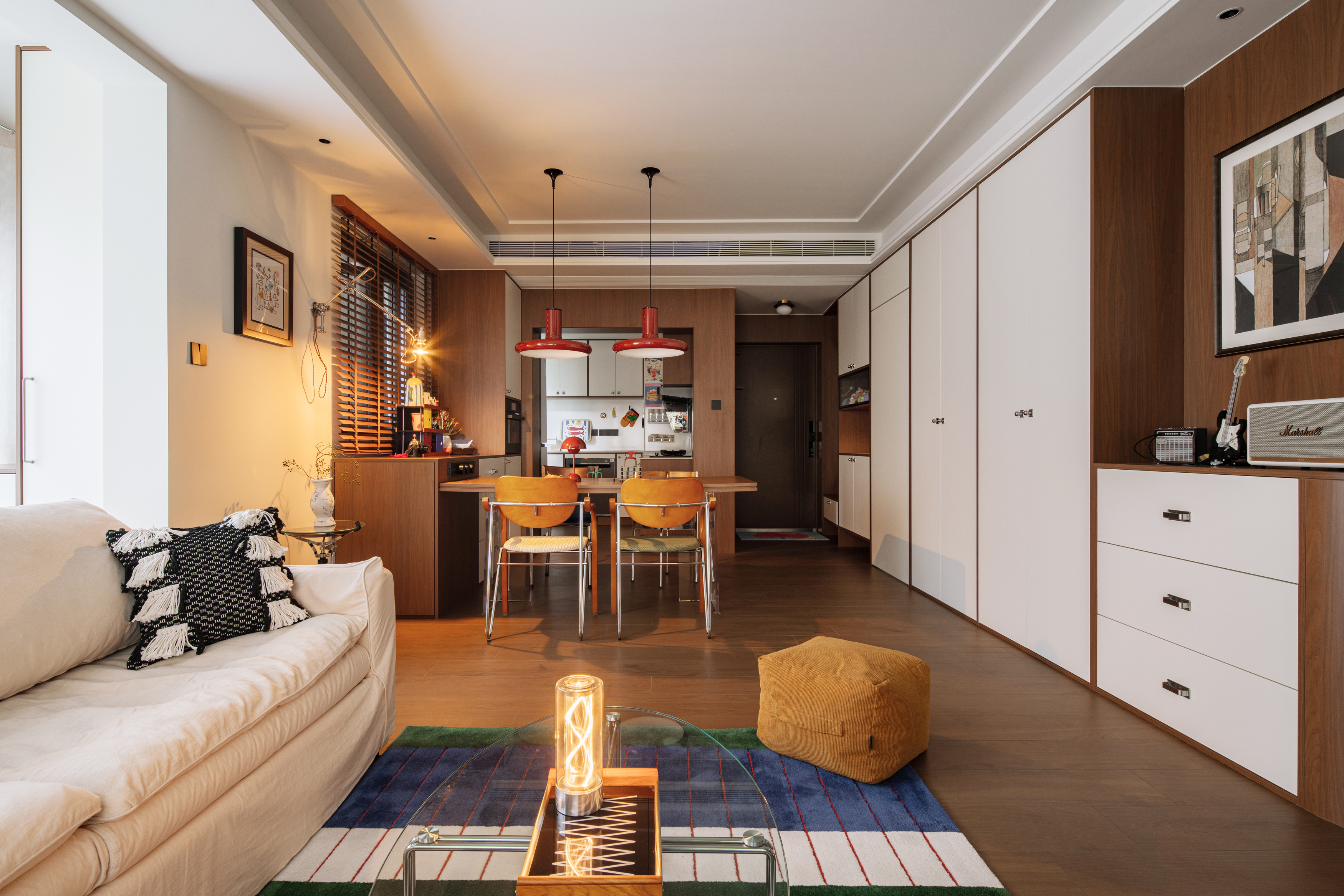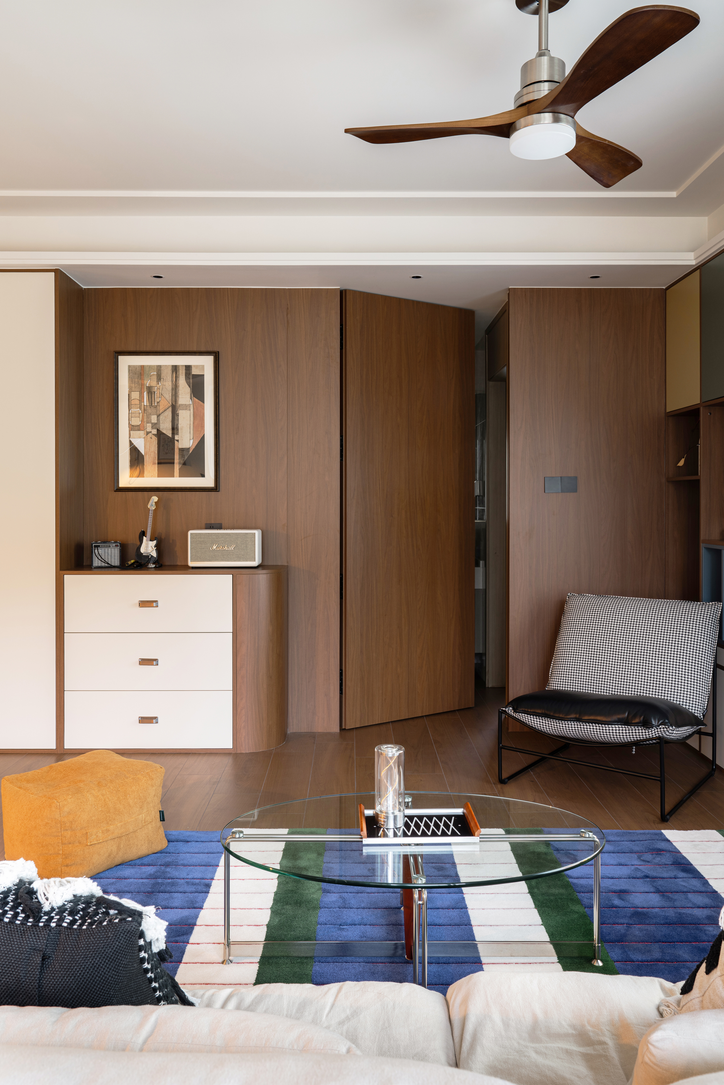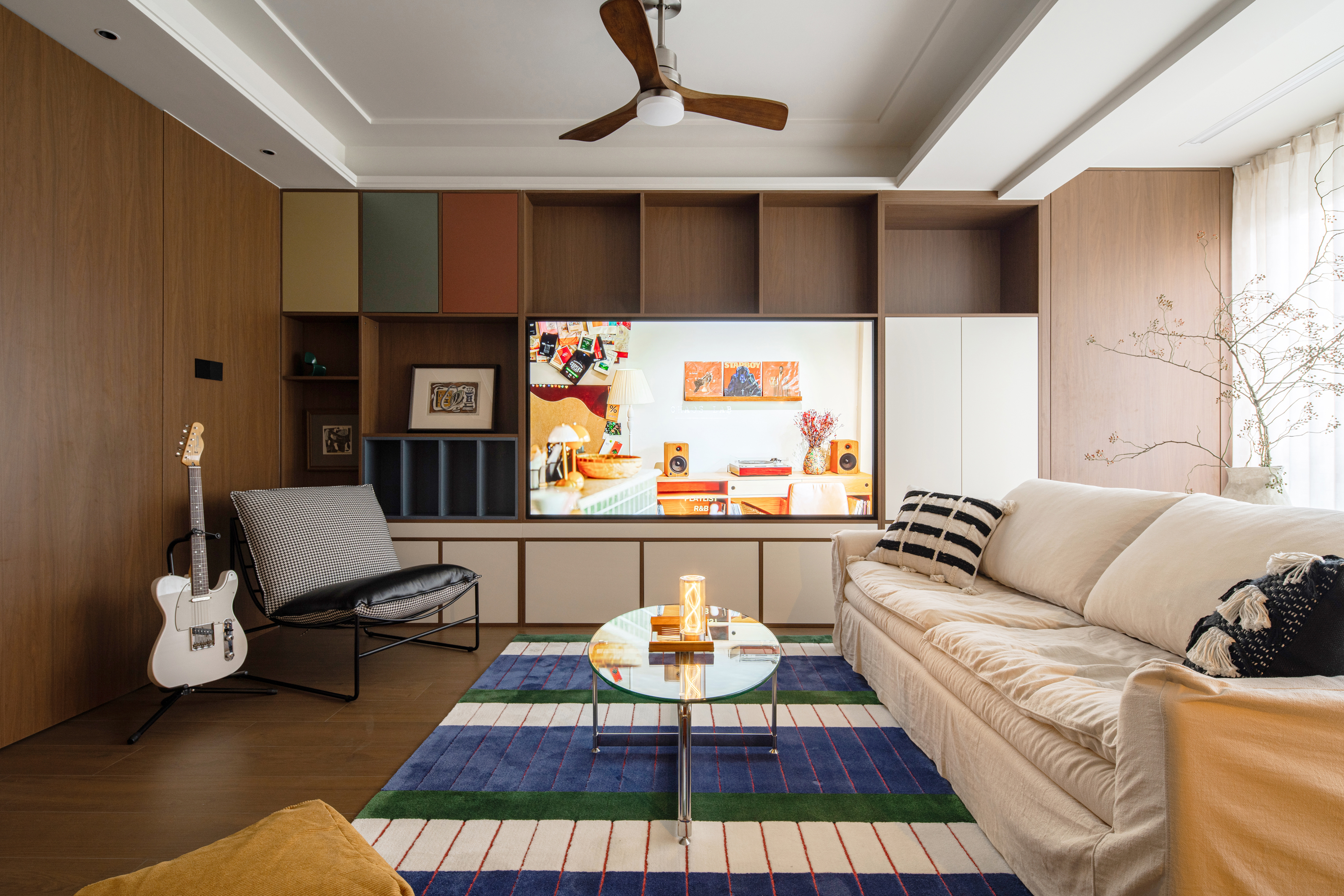 推开门,先被一片温润的柚木色拥抱。这不是那种沉重的旧木色,而是被阳光筛过一遍的、带着蜂蜜光泽的暖调。它从整墙的柜体蔓延开来,成为这个客厅沉稳而温柔的底色。在这个底色之上,一场专属于这个家的色彩游戏,才正要开始。