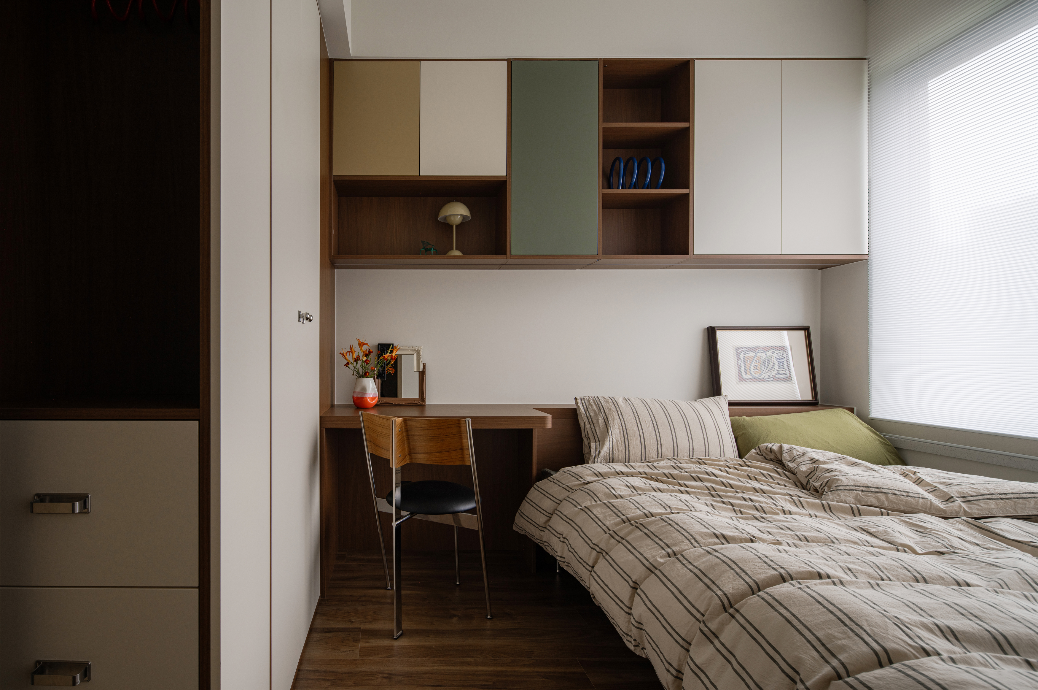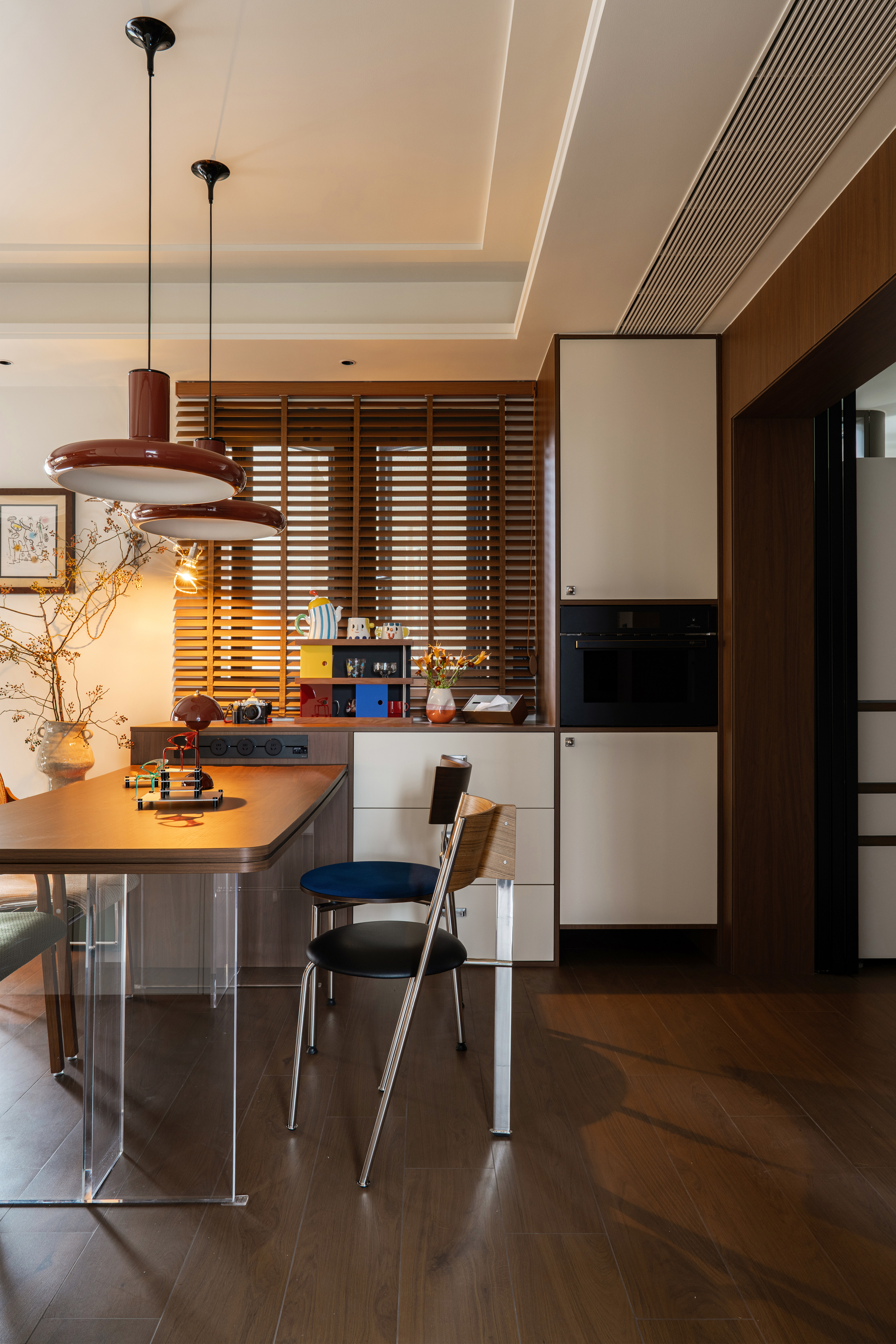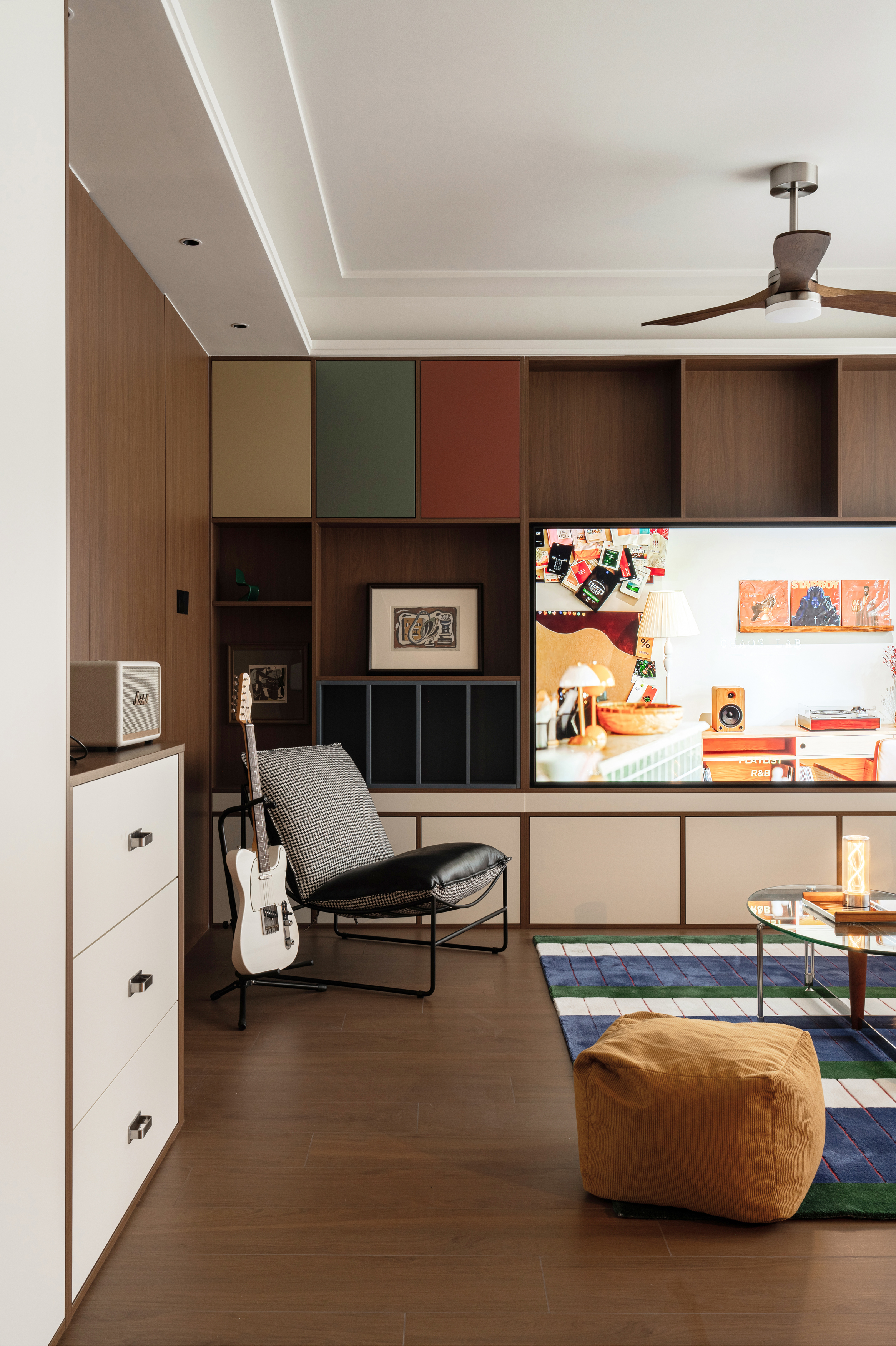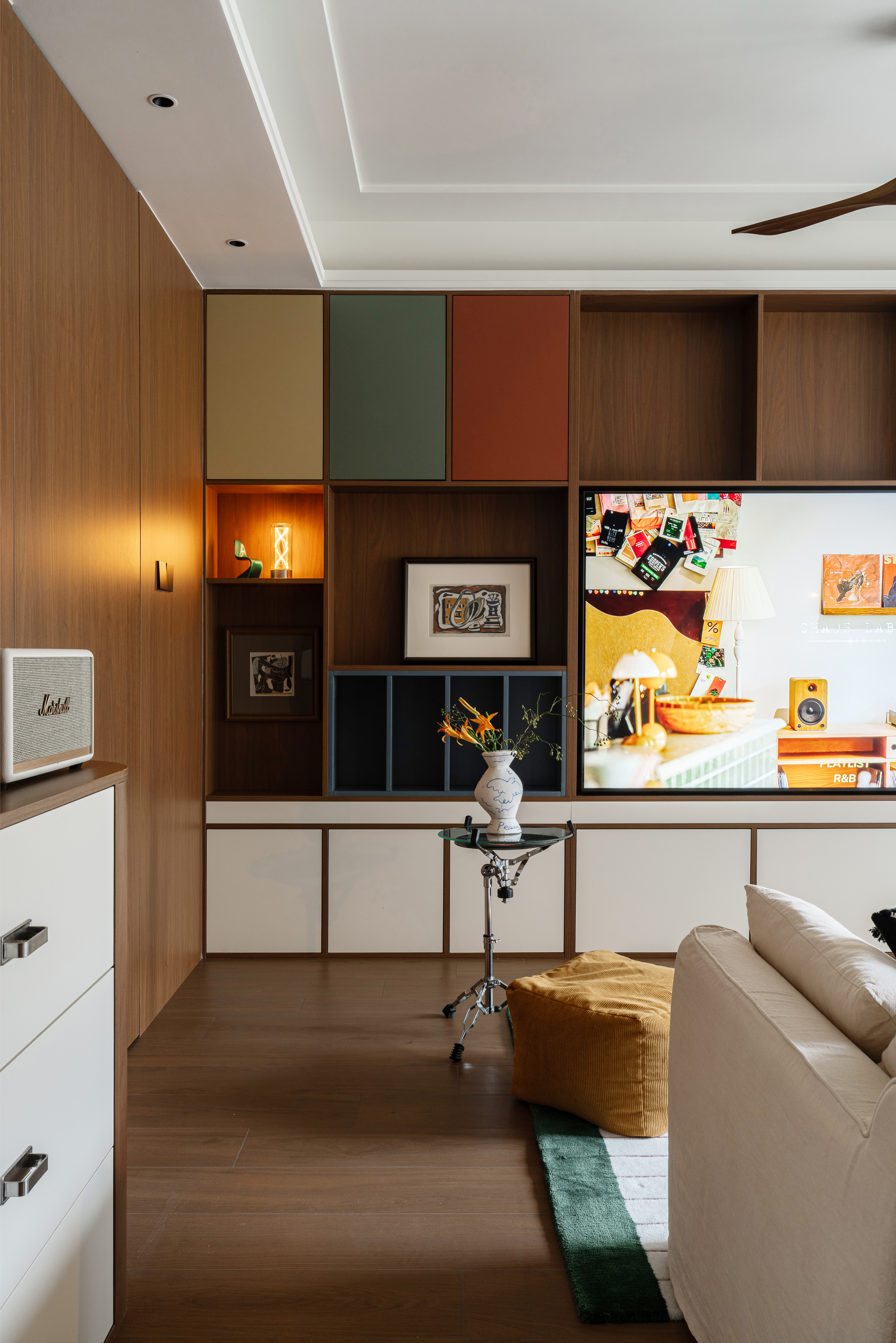 设计选材:我们为经典柚木配上了浅奶油色的门板,如同在拿铁上倾入绵密奶泡,瞬间轻盈明亮起来。而真正的点睛之笔,是那几扇悄悄跳脱出来的门板——一抹灰调的红、一扇沉静的墨绿、一角明媚的鹅黄、一方静谧的克莱因蓝。它们不是喧闹的,而是像乐章中偶尔跳出的重音,让整面电视柜墙拥有了呼吸的节奏。