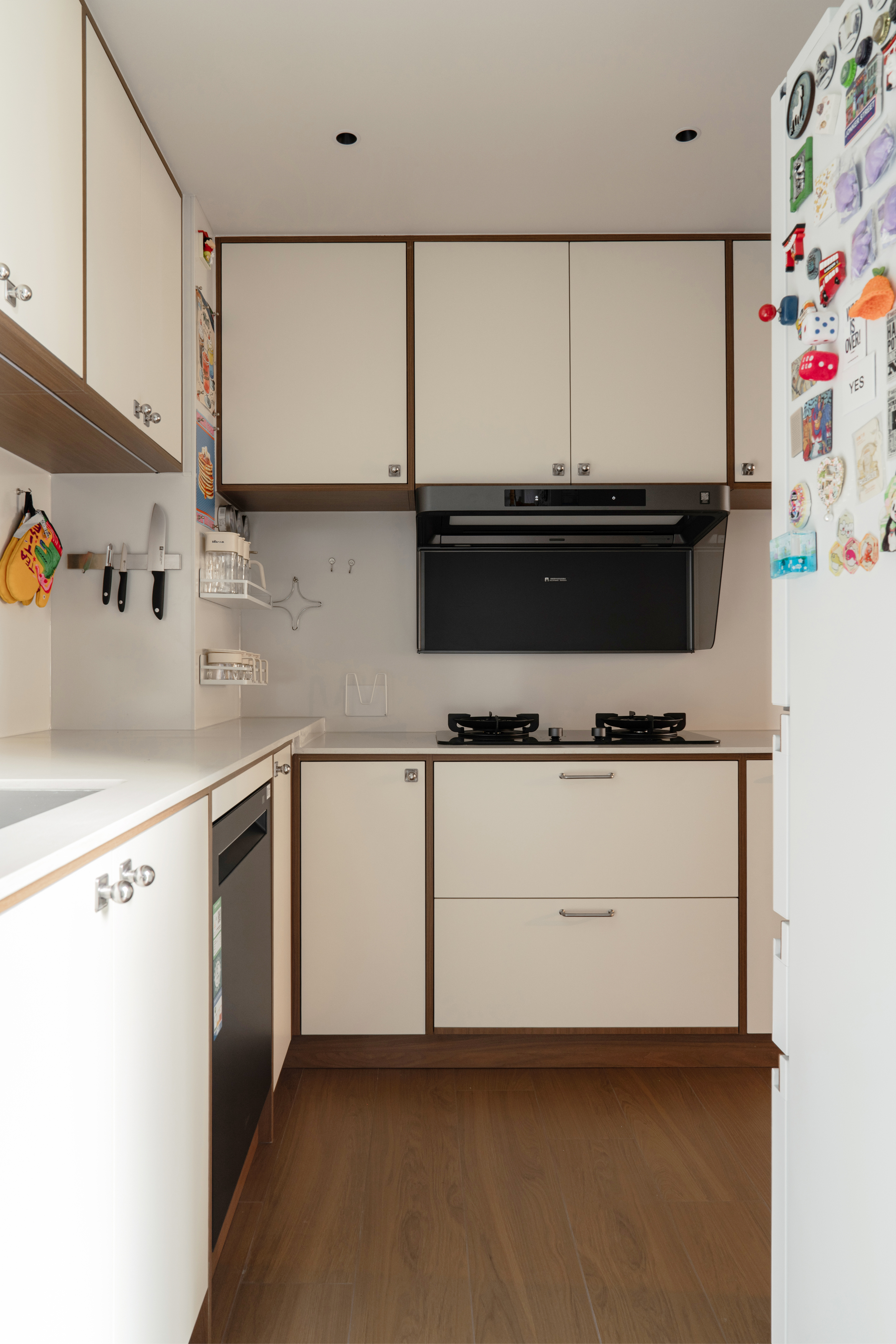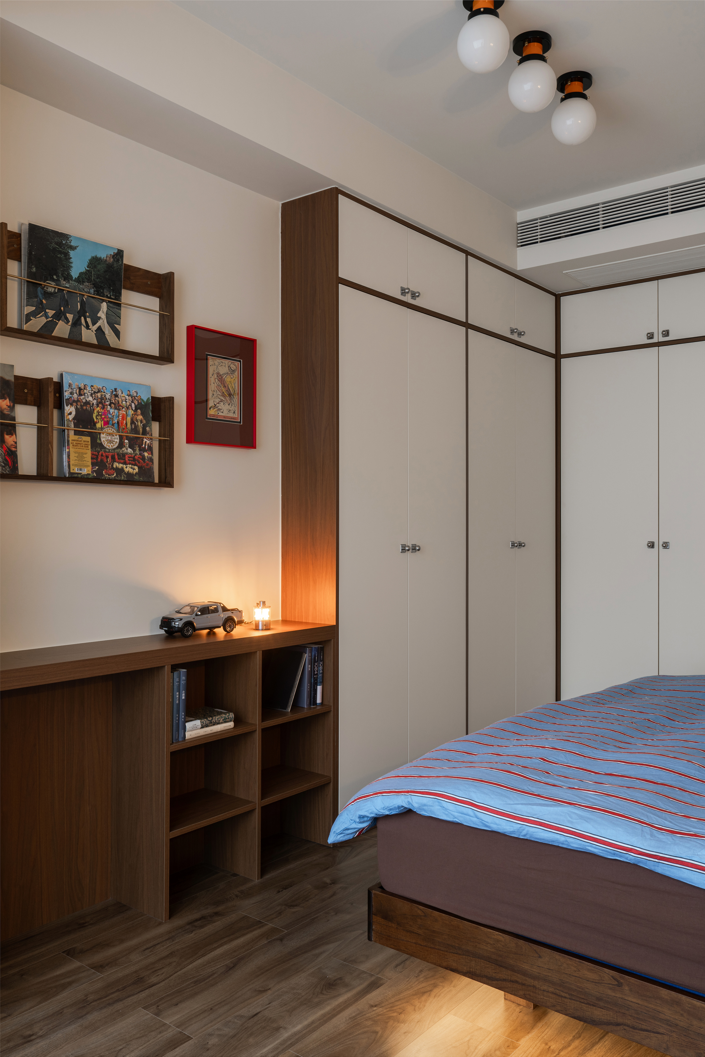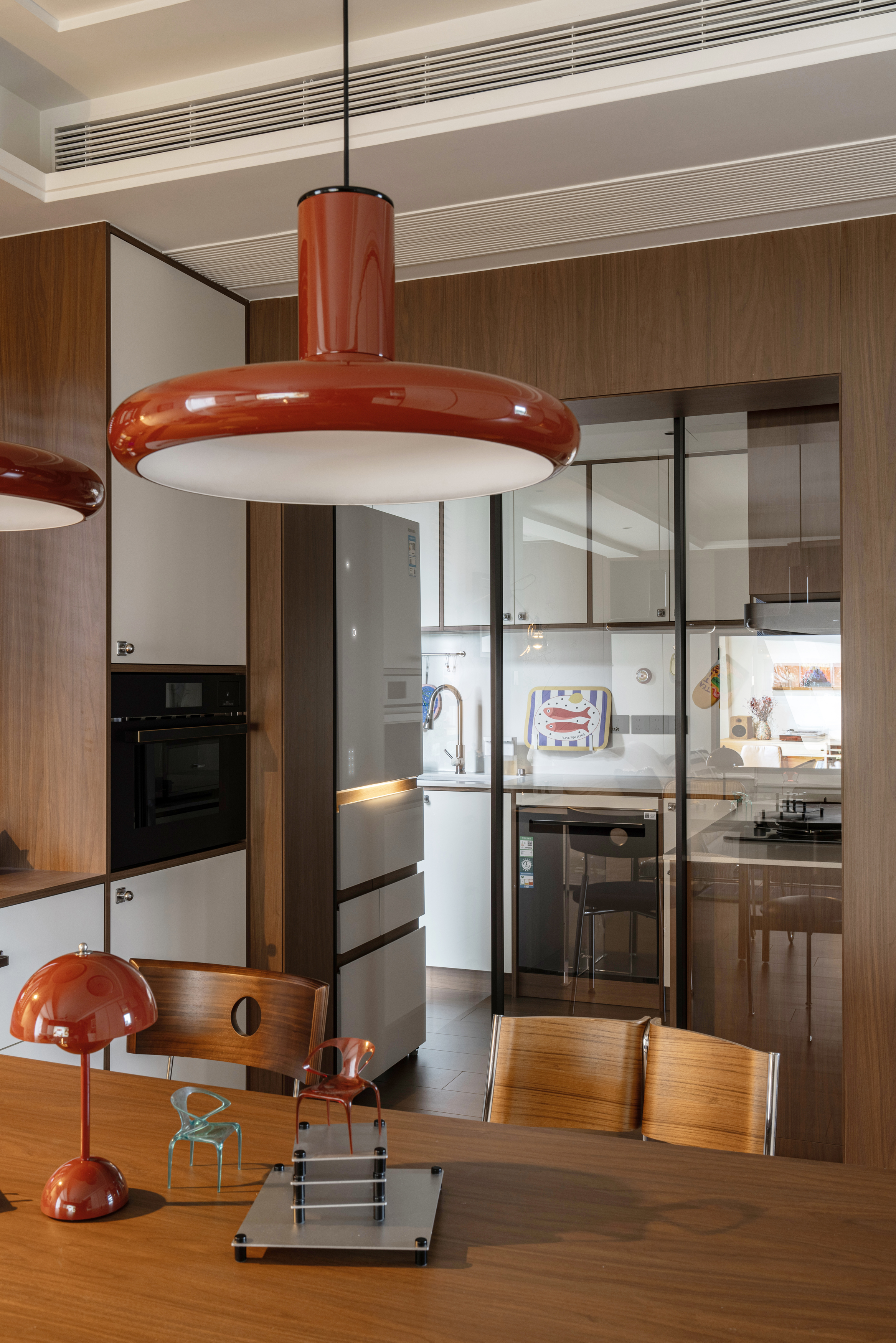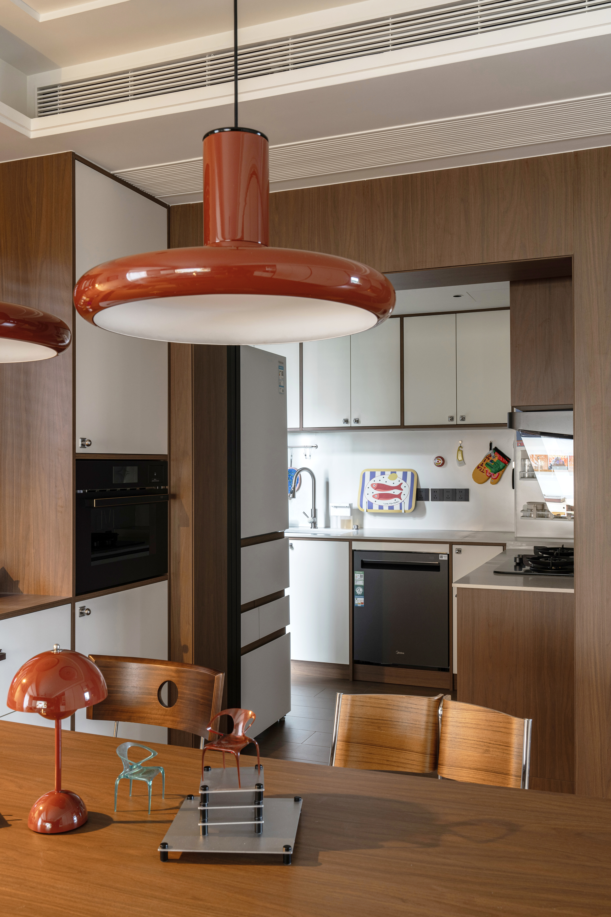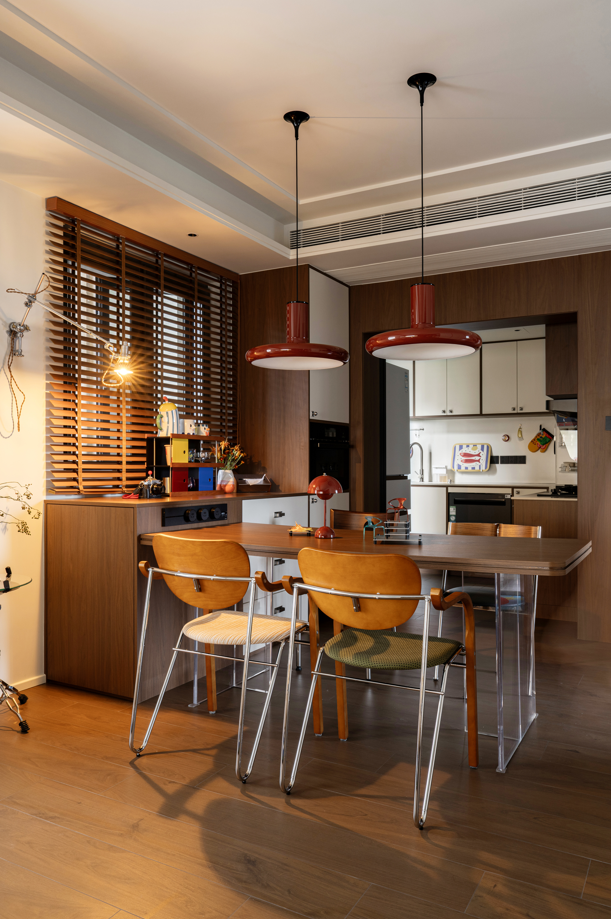 设计选材:我们为经典柚木配上了浅奶油色的门板,如同在拿铁上倾入绵密奶泡,瞬间轻盈明亮起来。而真正的点睛之笔,是那几扇悄悄跳脱出来的门板——一抹灰调的红、一扇沉静的墨绿、一角明媚的鹅黄、一方静谧的克莱因蓝。它们不是喧闹的,而是像乐章中偶尔跳出的重音,让整面电视柜墙拥有了呼吸的节奏。