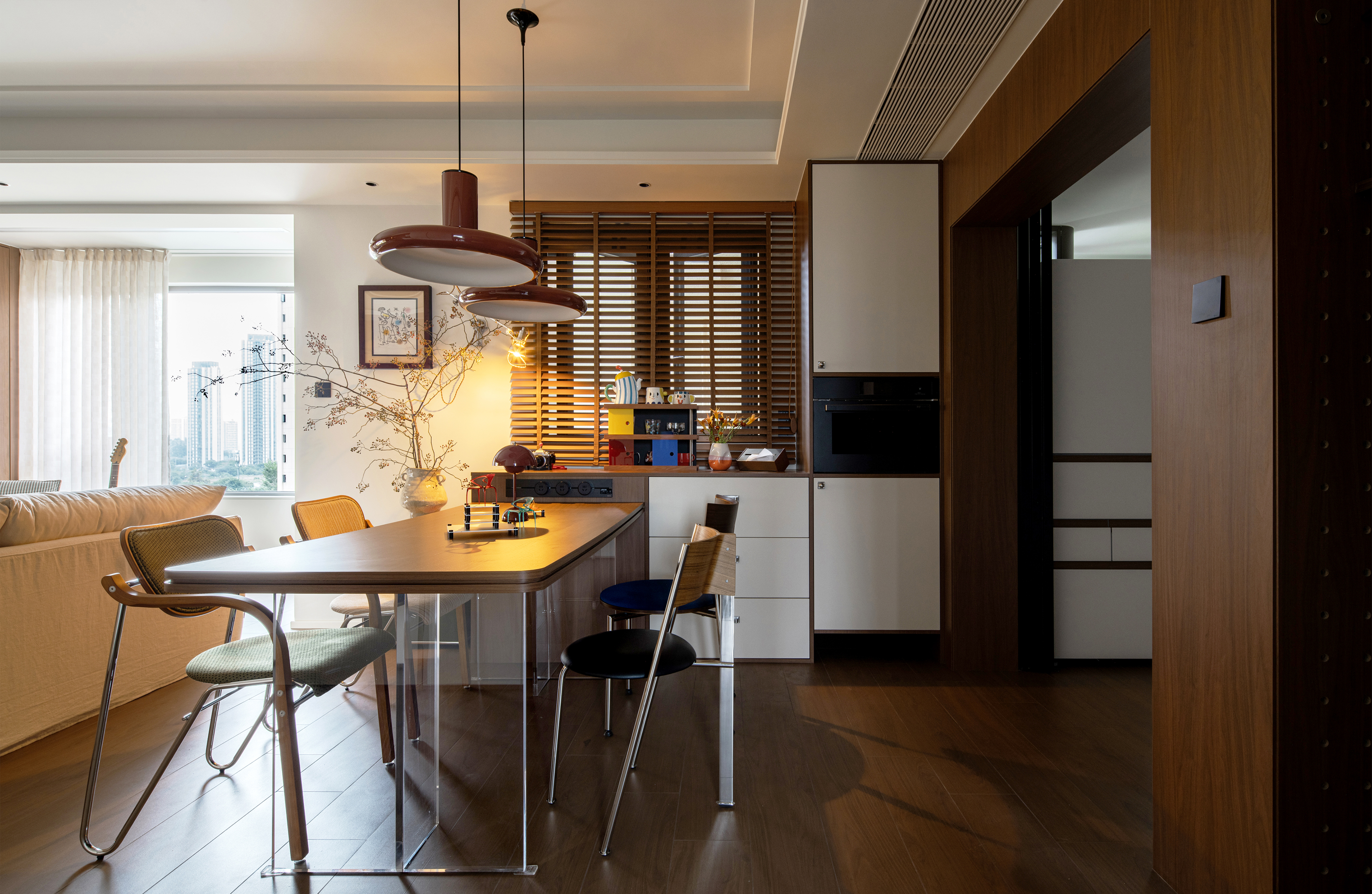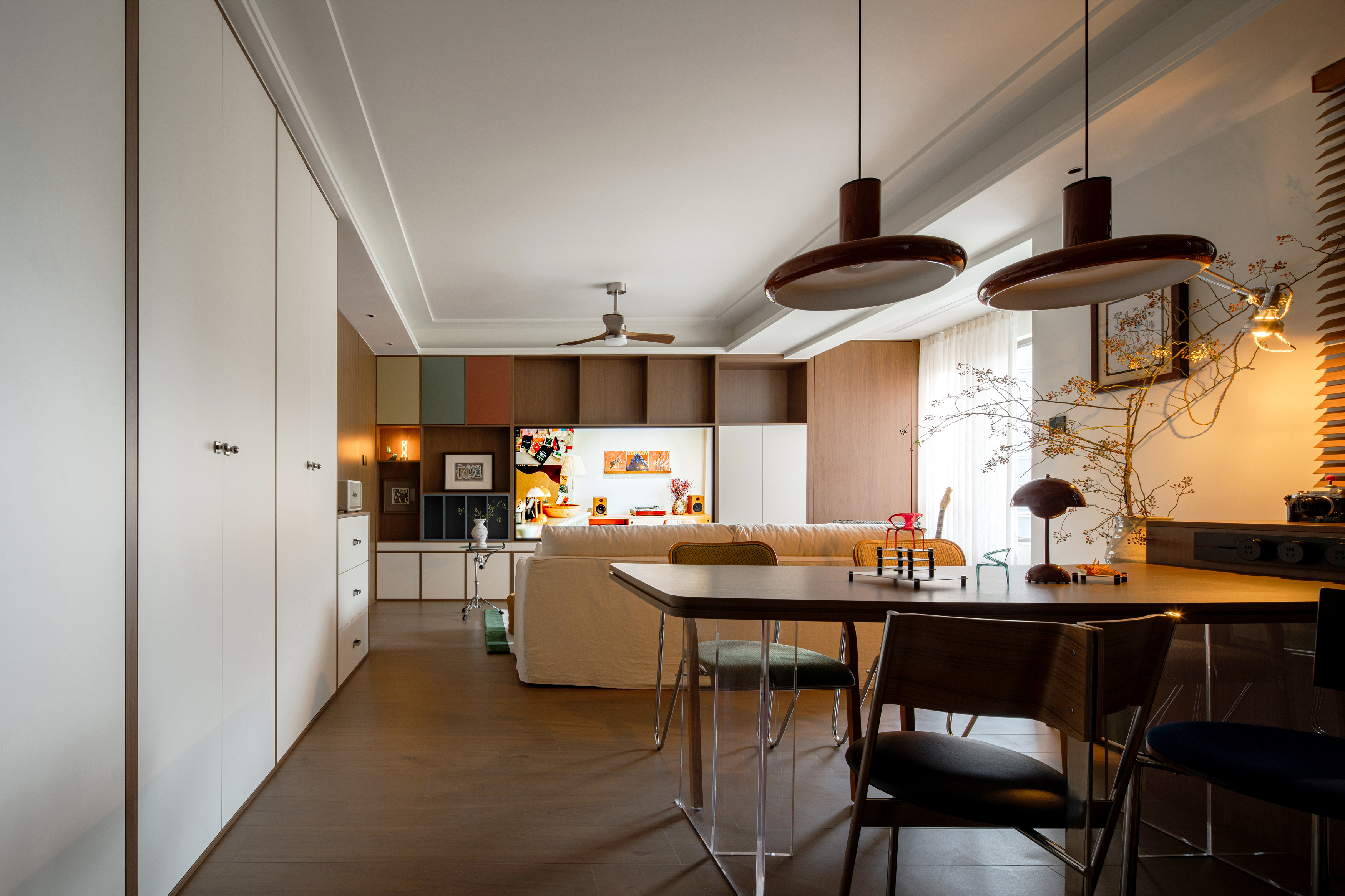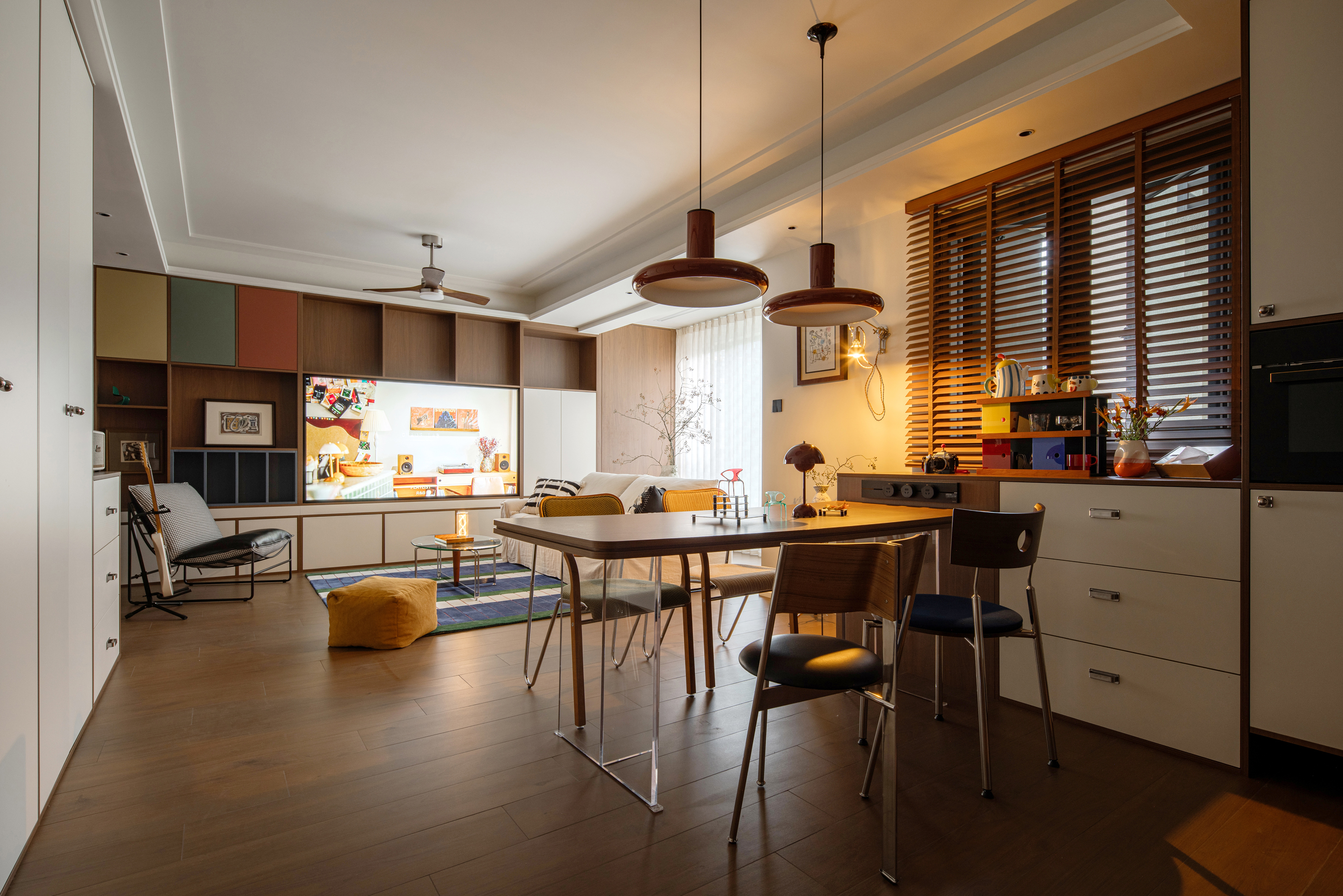 所有的色彩与材质,都在纱帘引入的柔光中达到了和谐巅峰。阳光被过滤成一片朦胧的光雾,抚过柚木的纹理、跃上彩色的门板、最后轻柔地躺在沙发与地毯上。