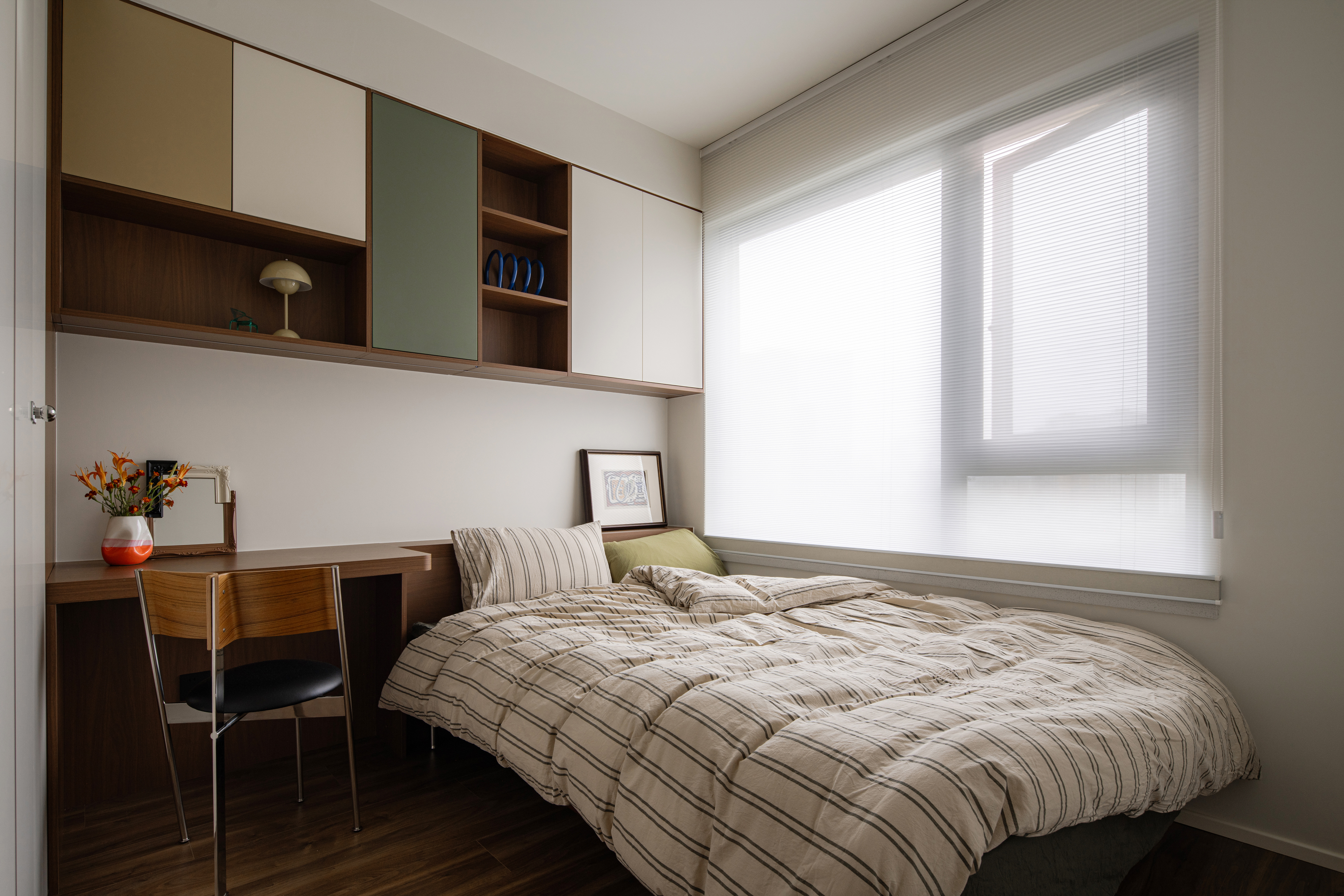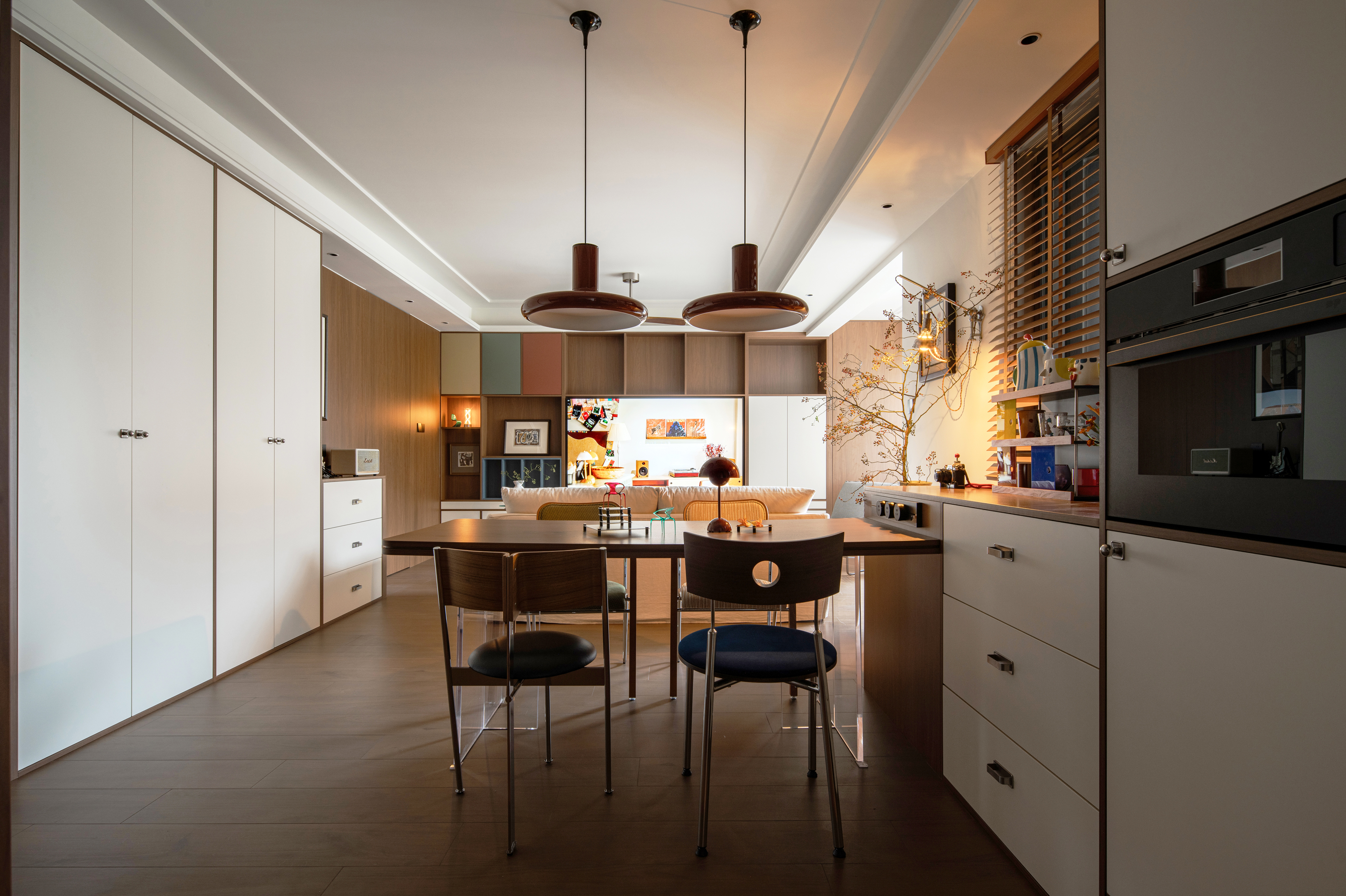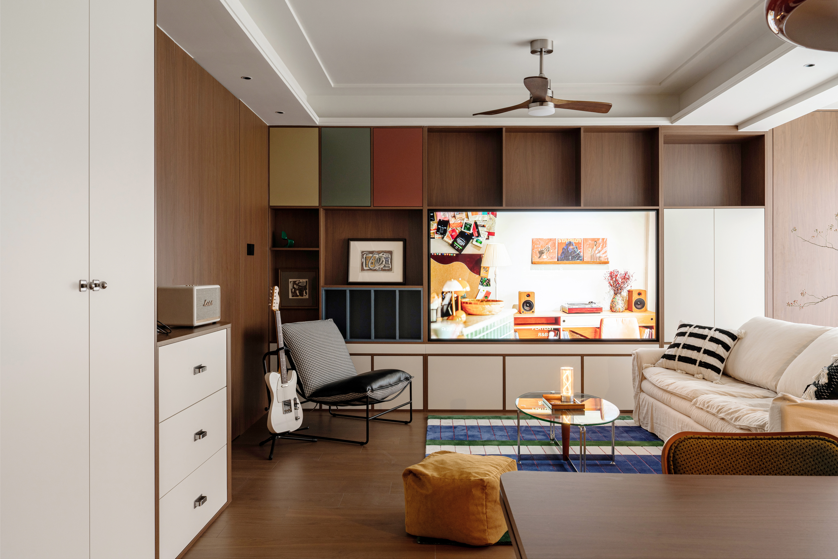 所有的色彩与材质,都在纱帘引入的柔光中达到了和谐巅峰。阳光被过滤成一片朦胧的光雾,抚过柚木的纹理、跃上彩色的门板、最后轻柔地躺在沙发与地毯上。