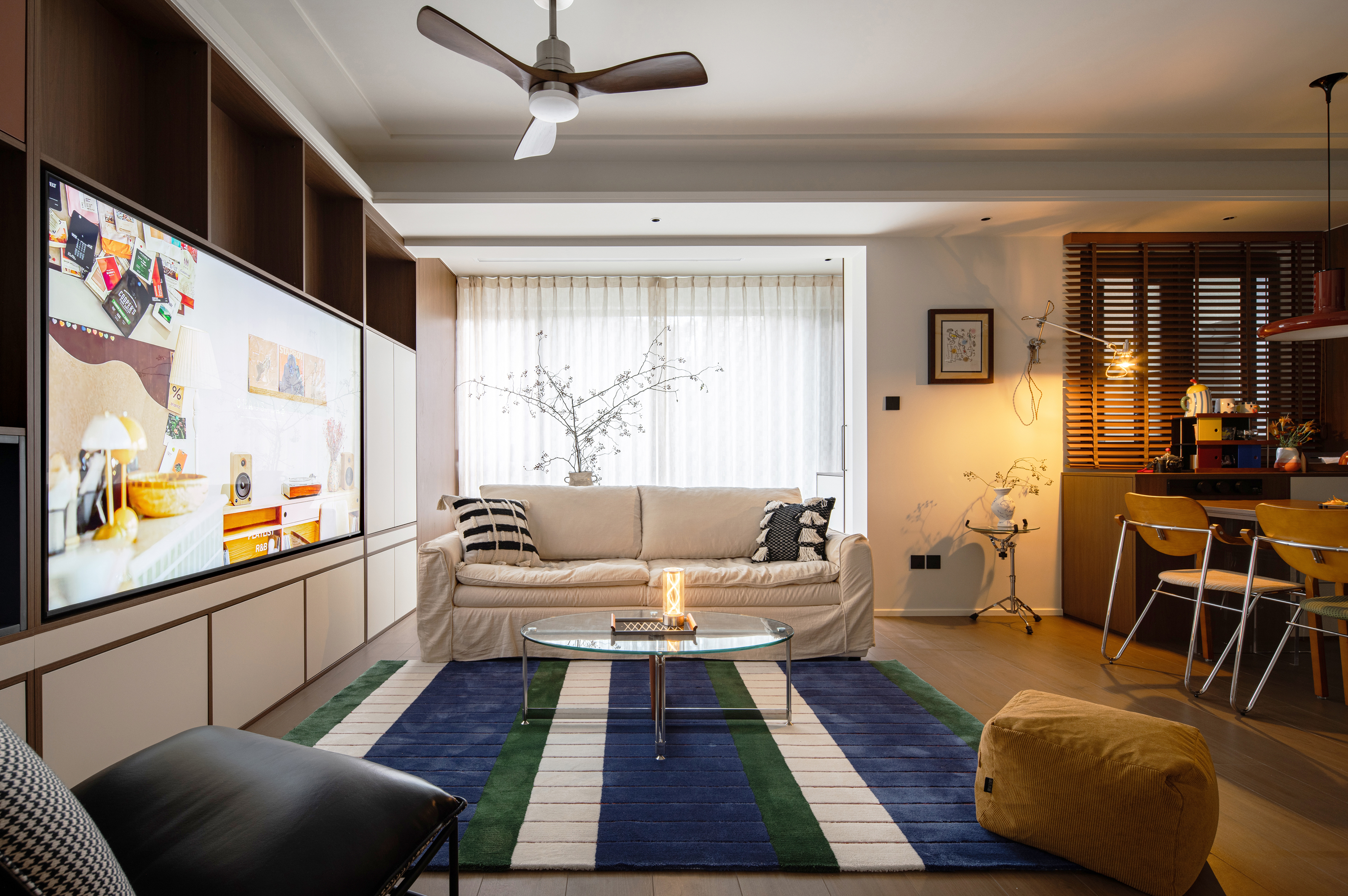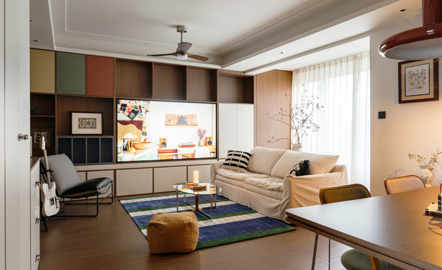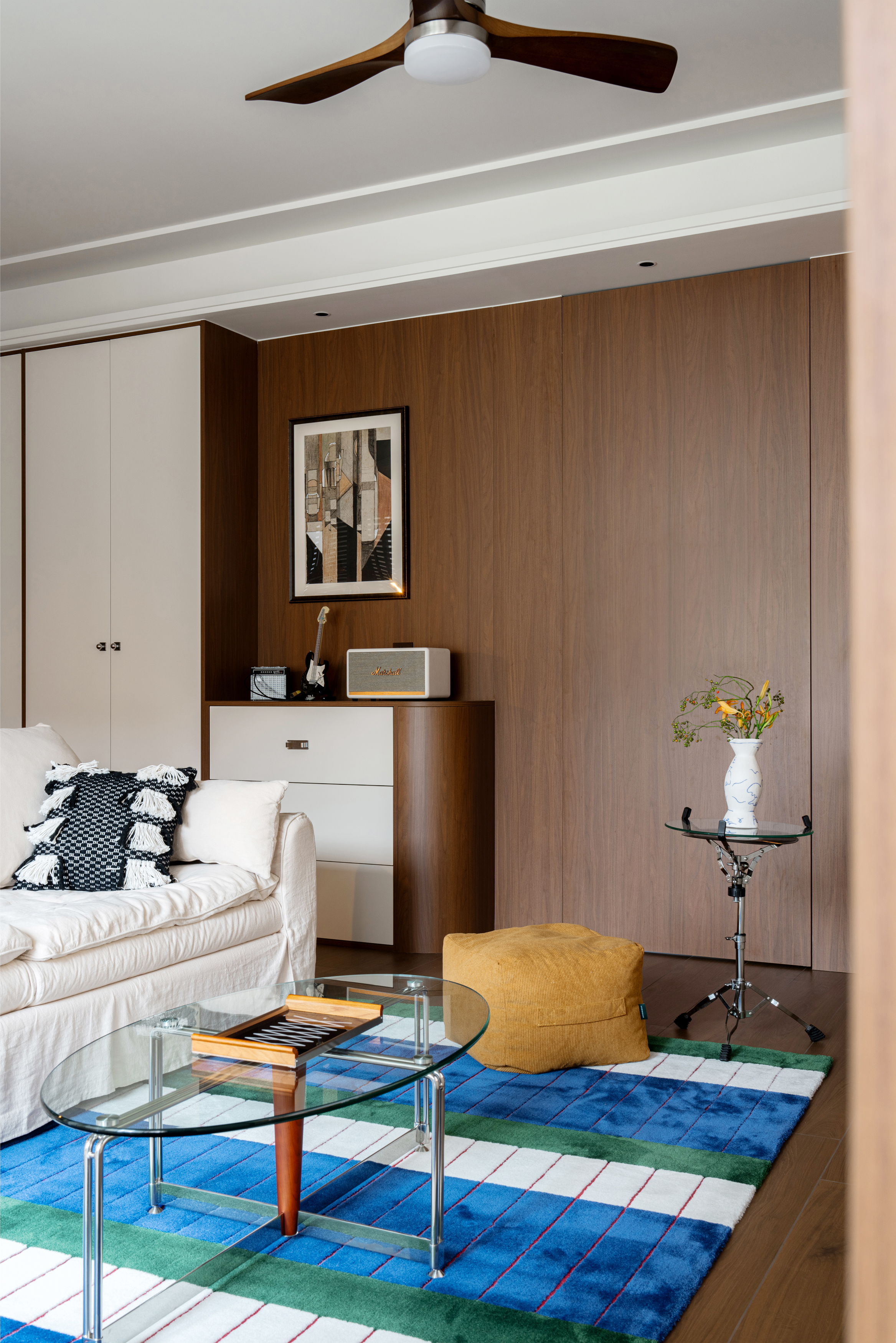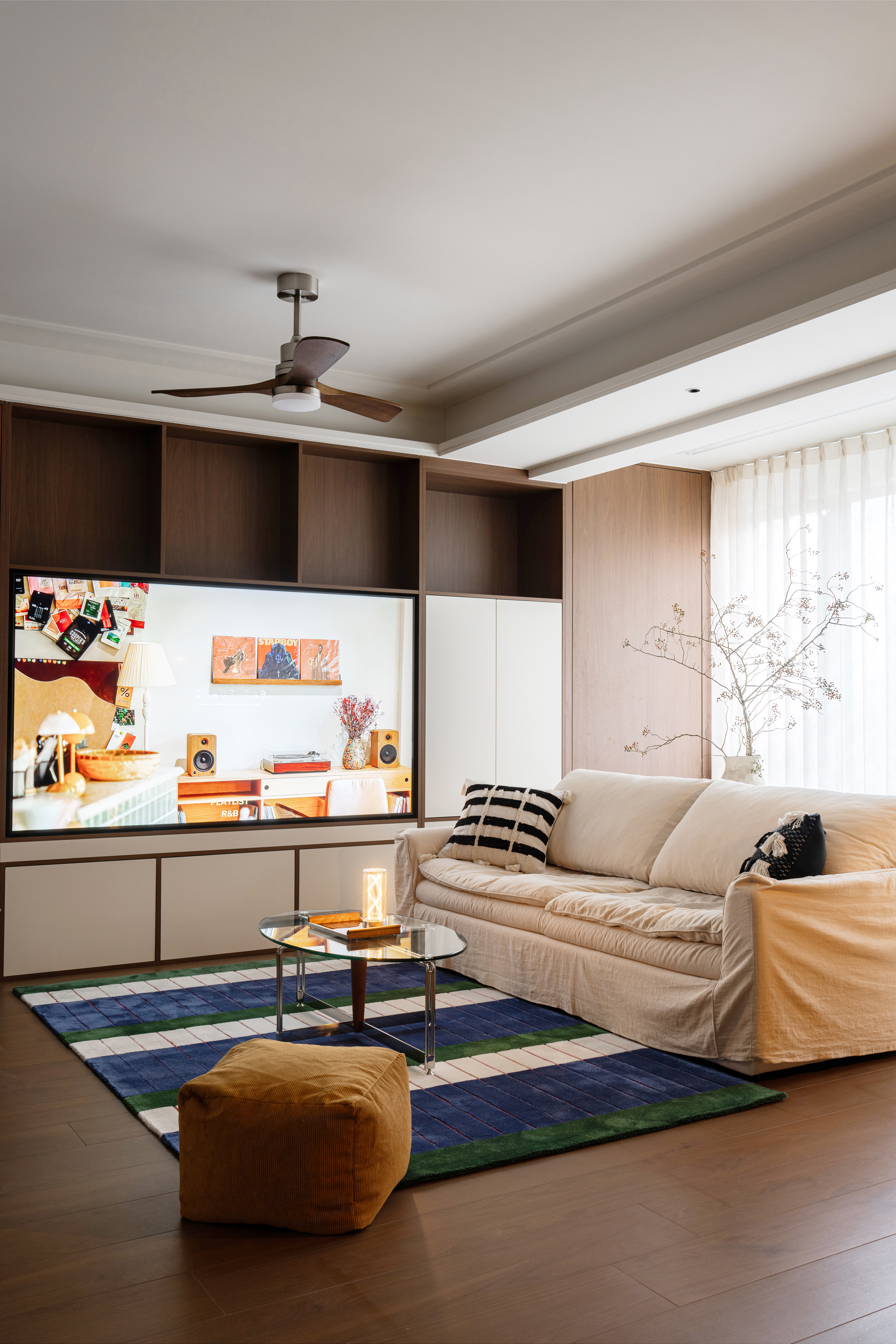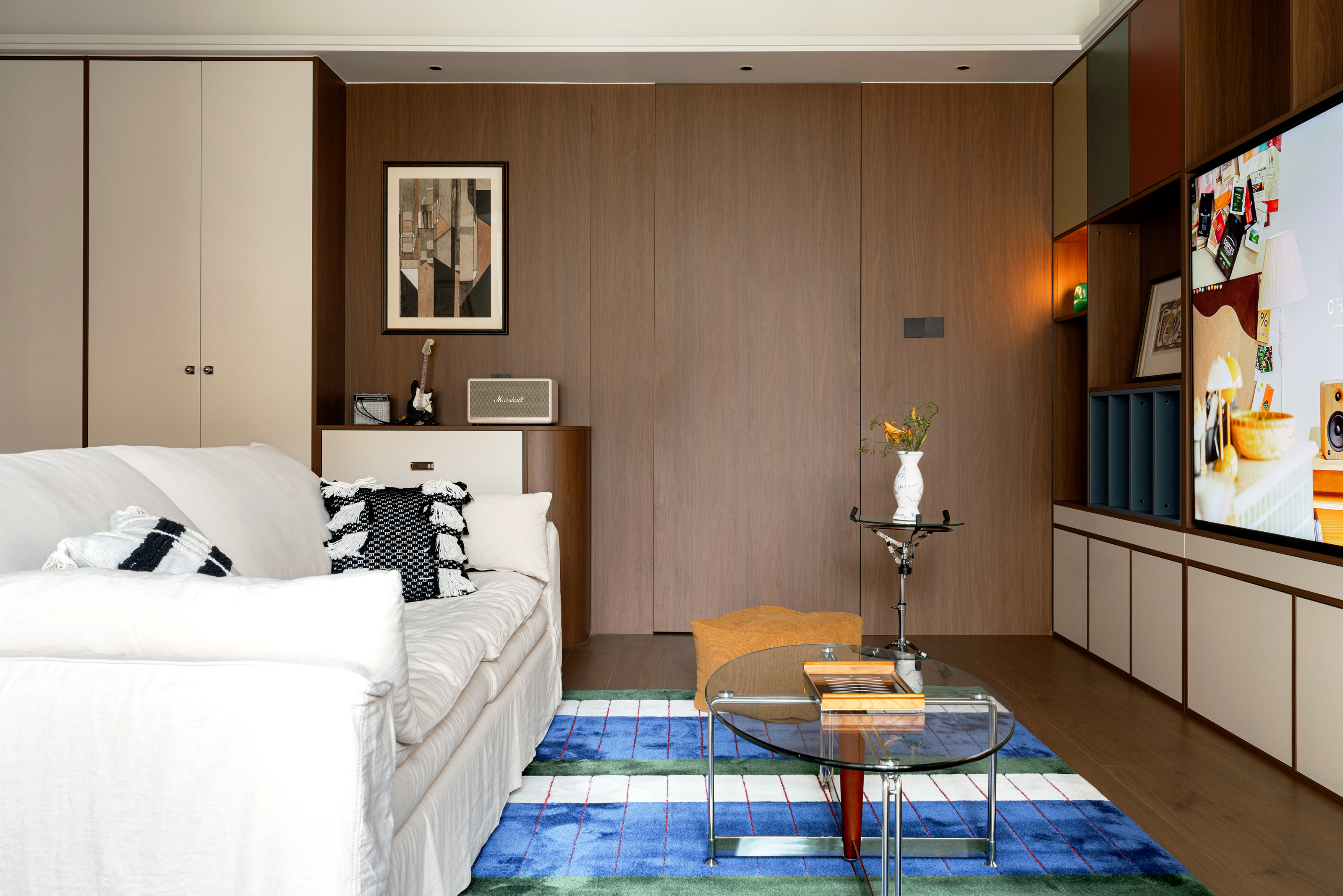我们为经典柚木配上了浅奶油色的门板,如同在拿铁上倾入绵密奶泡,瞬间轻盈明亮起来。而真正的点睛之笔,是那几扇悄悄跳脱出来的门板——一抹灰调的红、一扇沉静的墨绿、一角明媚的鹅黄、一方静谧的克莱因蓝。它们不是喧闹的,而是像乐章中偶尔跳出的重音,让整面电视柜墙拥有了呼吸的节奏。 这份色彩的欢愉,从柜体蔓延至脚下。长方条拼色的羊毛地毯,用的正是这四种跳色,仿佛将墙上的音符拾起,编织成了可以赤脚踩踏的温柔诗篇。